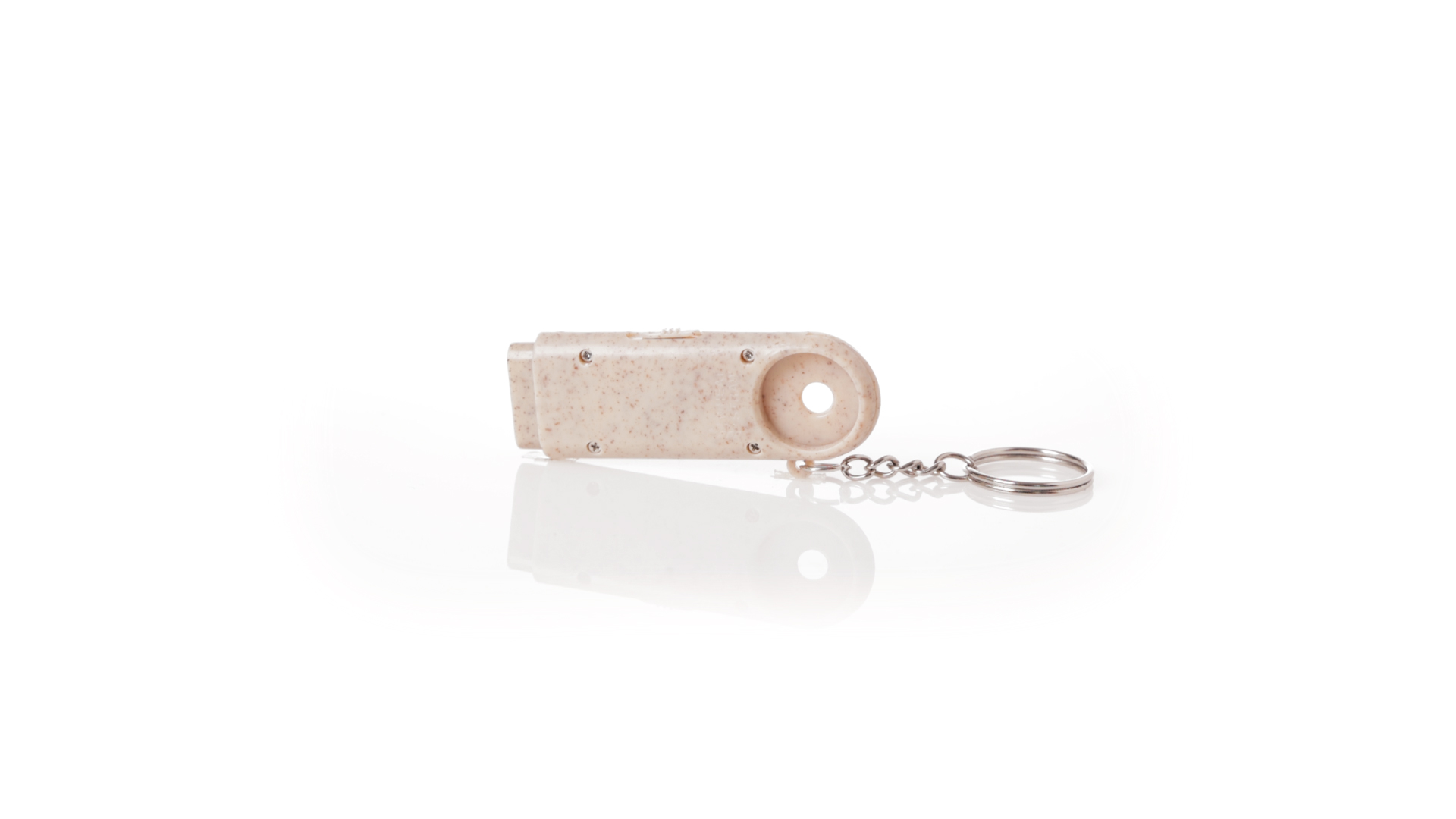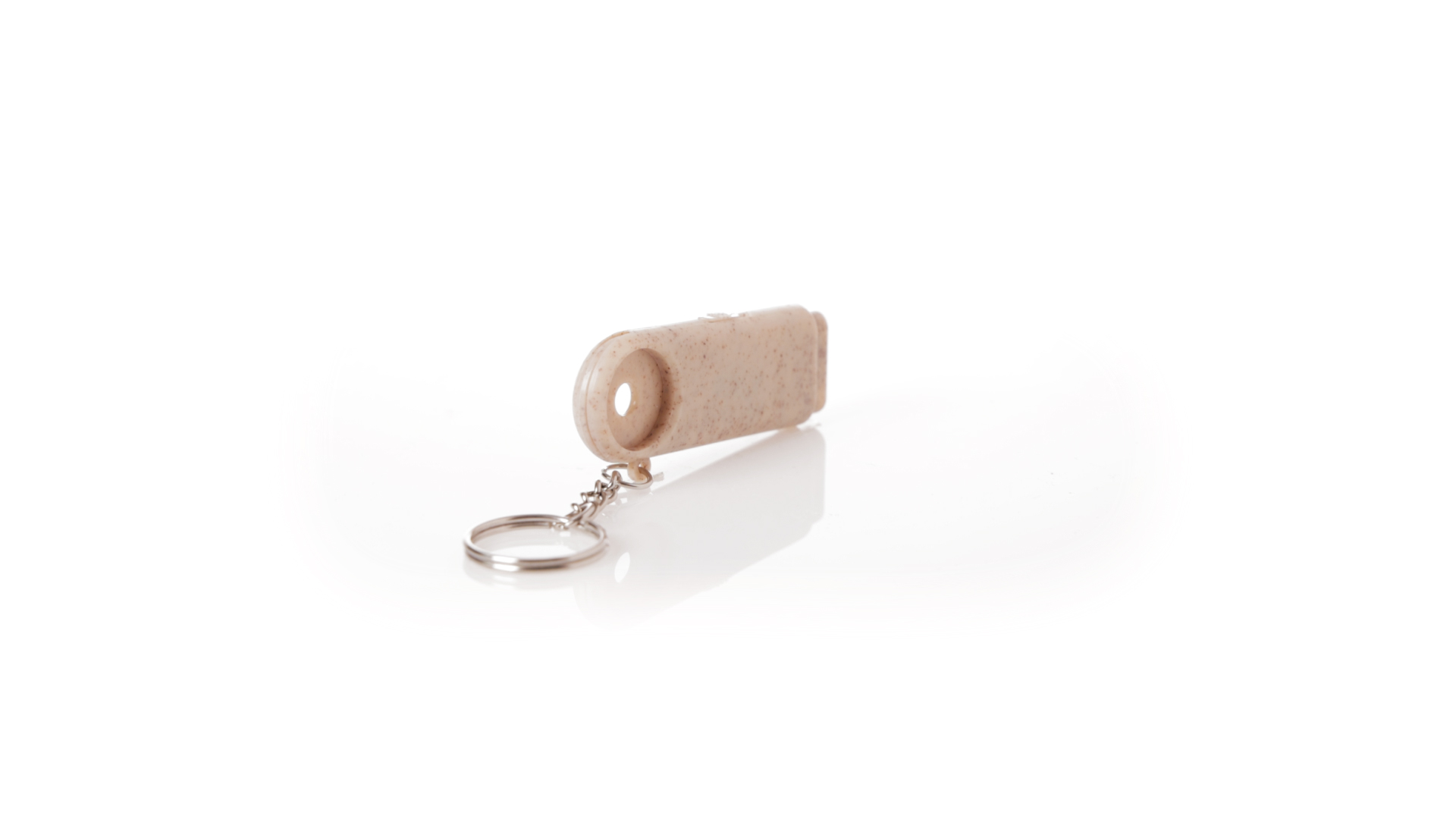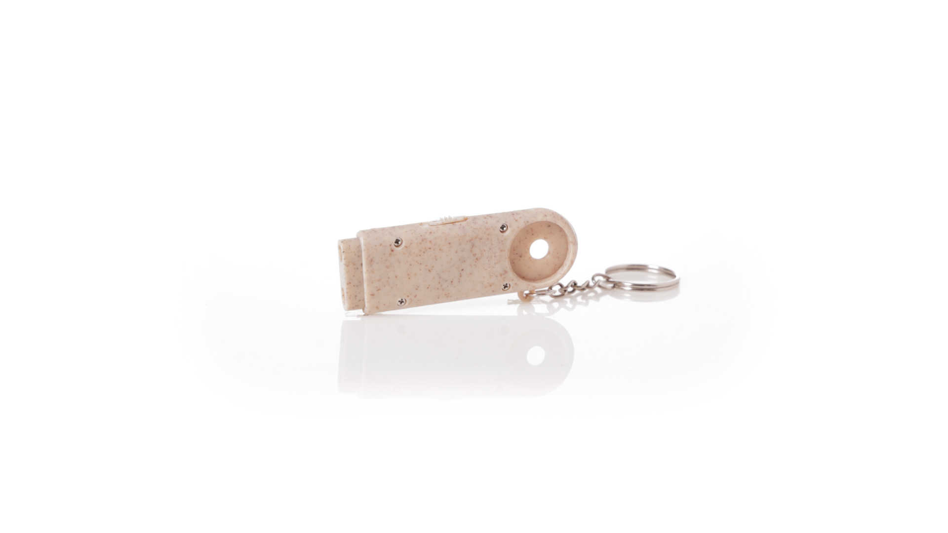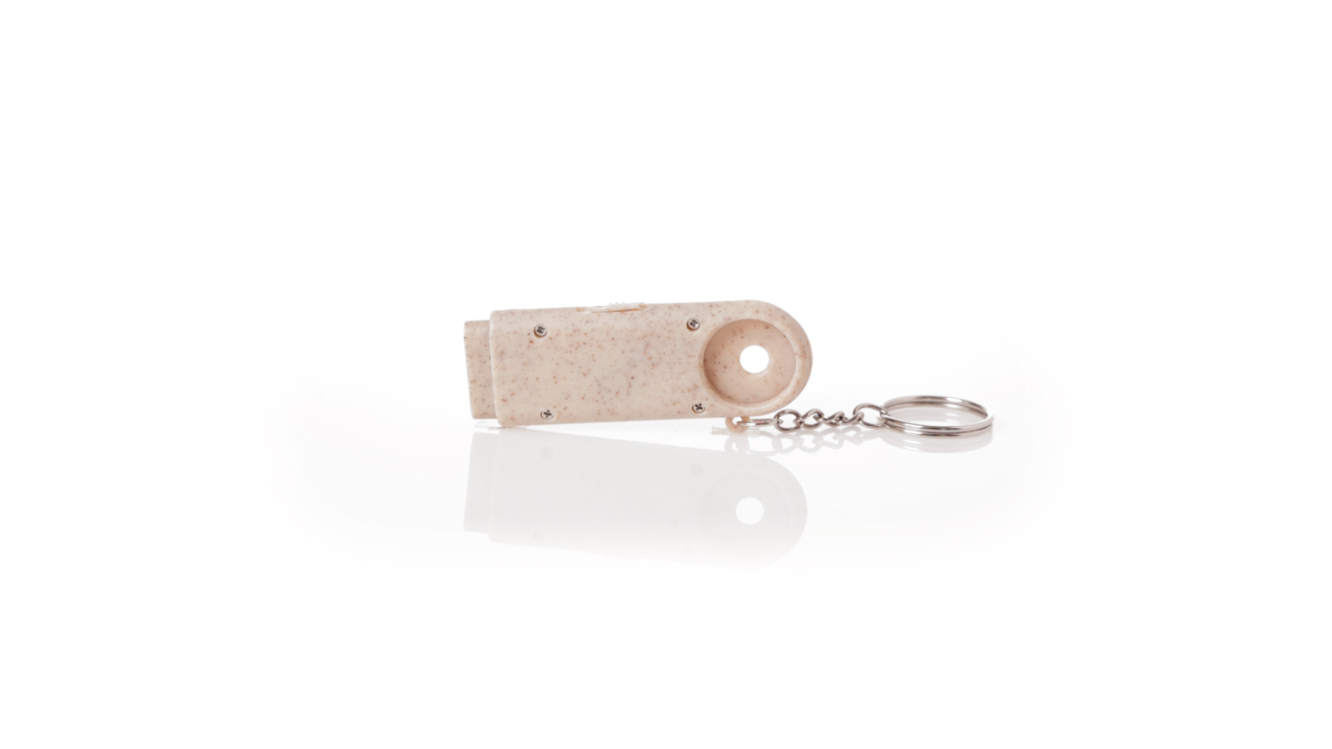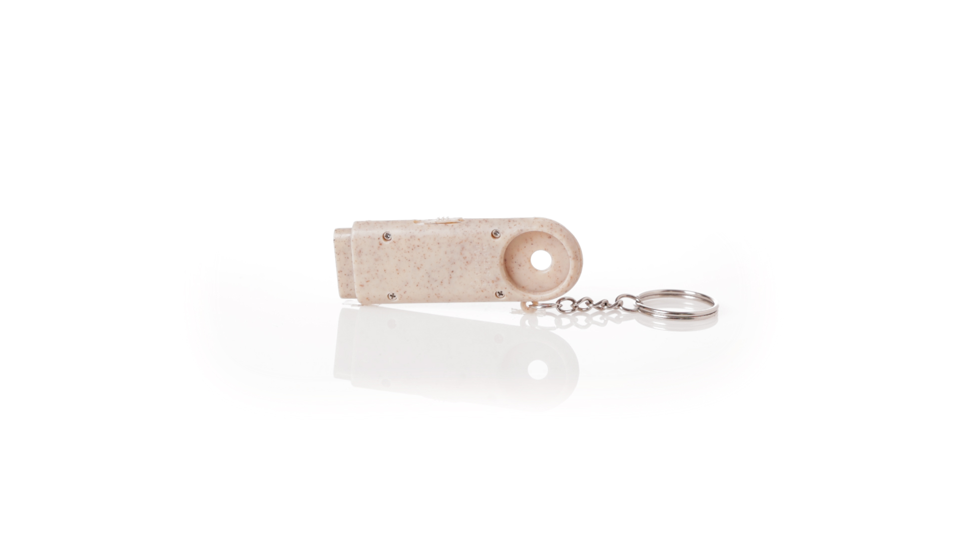 Münz-Schlüsselanhänger mit integrierter Taschenlampe, aus Weizenrohr und ABS. Mit praktischer Münze, 2 LEDs und Batteriebetrieb (Knopfbatterien enthalten). Mit Weizenstroh-Logo und in einer individuellen, recycelten Tasche.Hergestellt aus pflanzlichen Elementen, um die Verwendung natürlicher Rohstoffe zu fördern und die Schadstoffemissionen zu reduzieren.