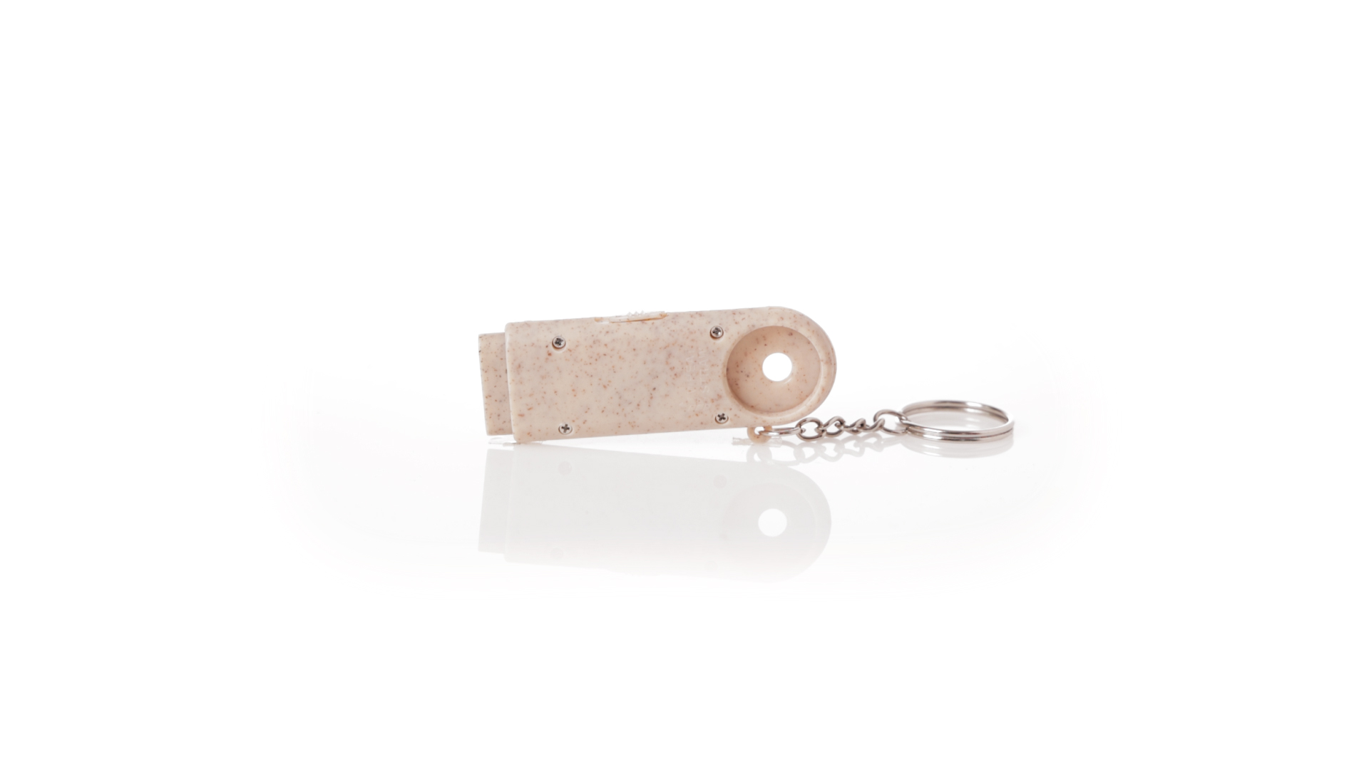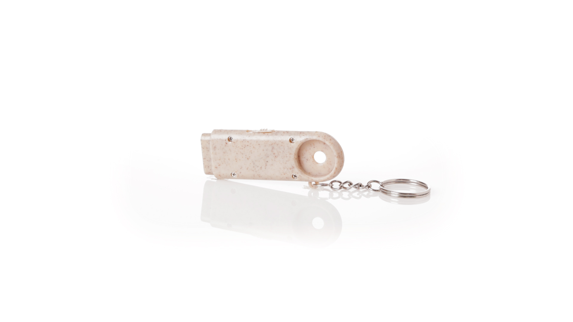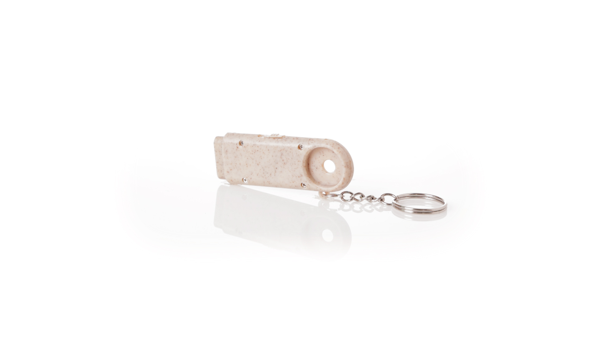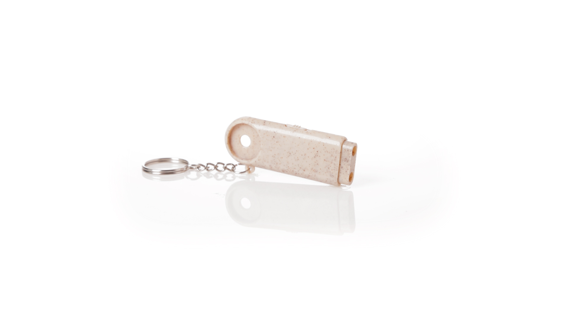 Münz-Schlüsselanhänger mit integrierter Taschenlampe, aus Weizenrohr und ABS. Mit praktischer Münze, 2 LEDs und Batteriebetrieb (Knopfbatterien enthalten). Mit Weizenstroh-Logo und in einer individuellen, recycelten Tasche.Hergestellt aus pflanzlichen Elementen, um die Verwendung natürlicher Rohstoffe zu fördern und die Schadstoffemissionen zu reduzieren.