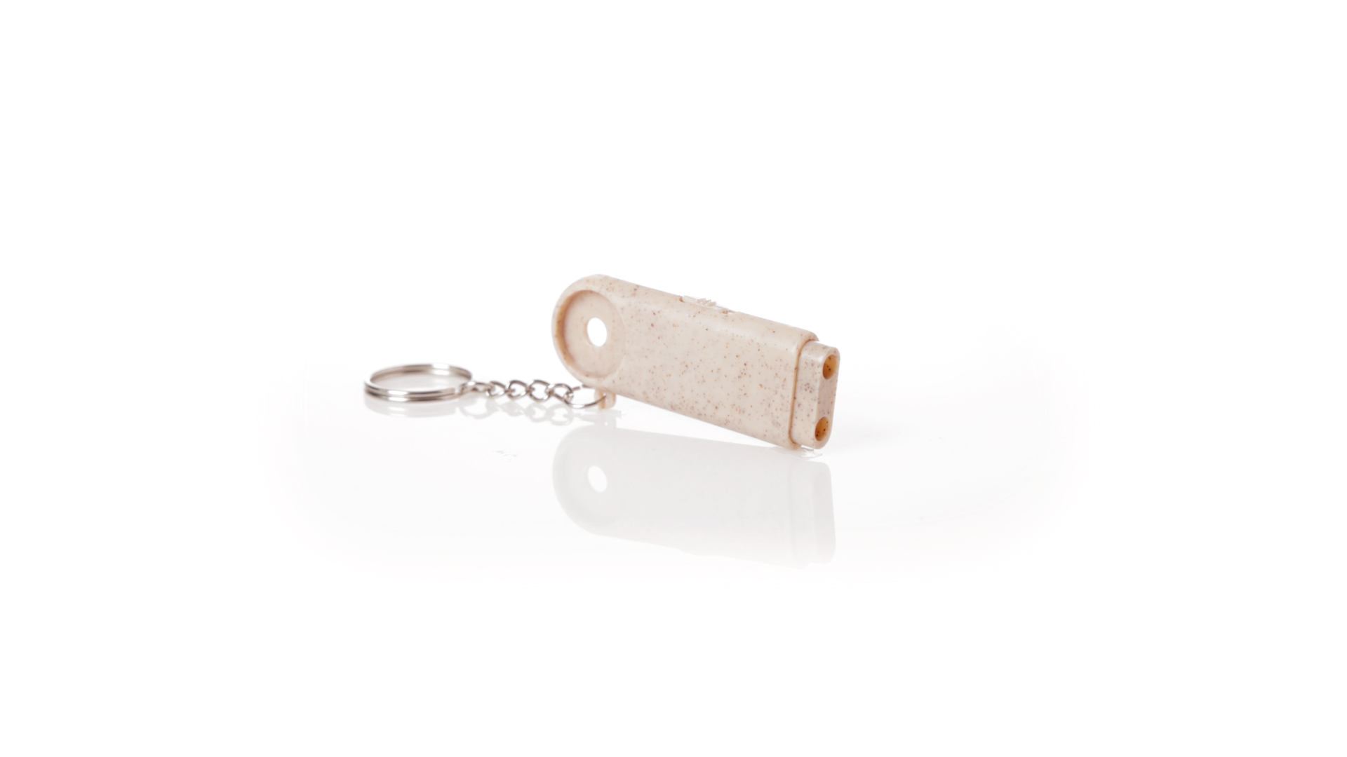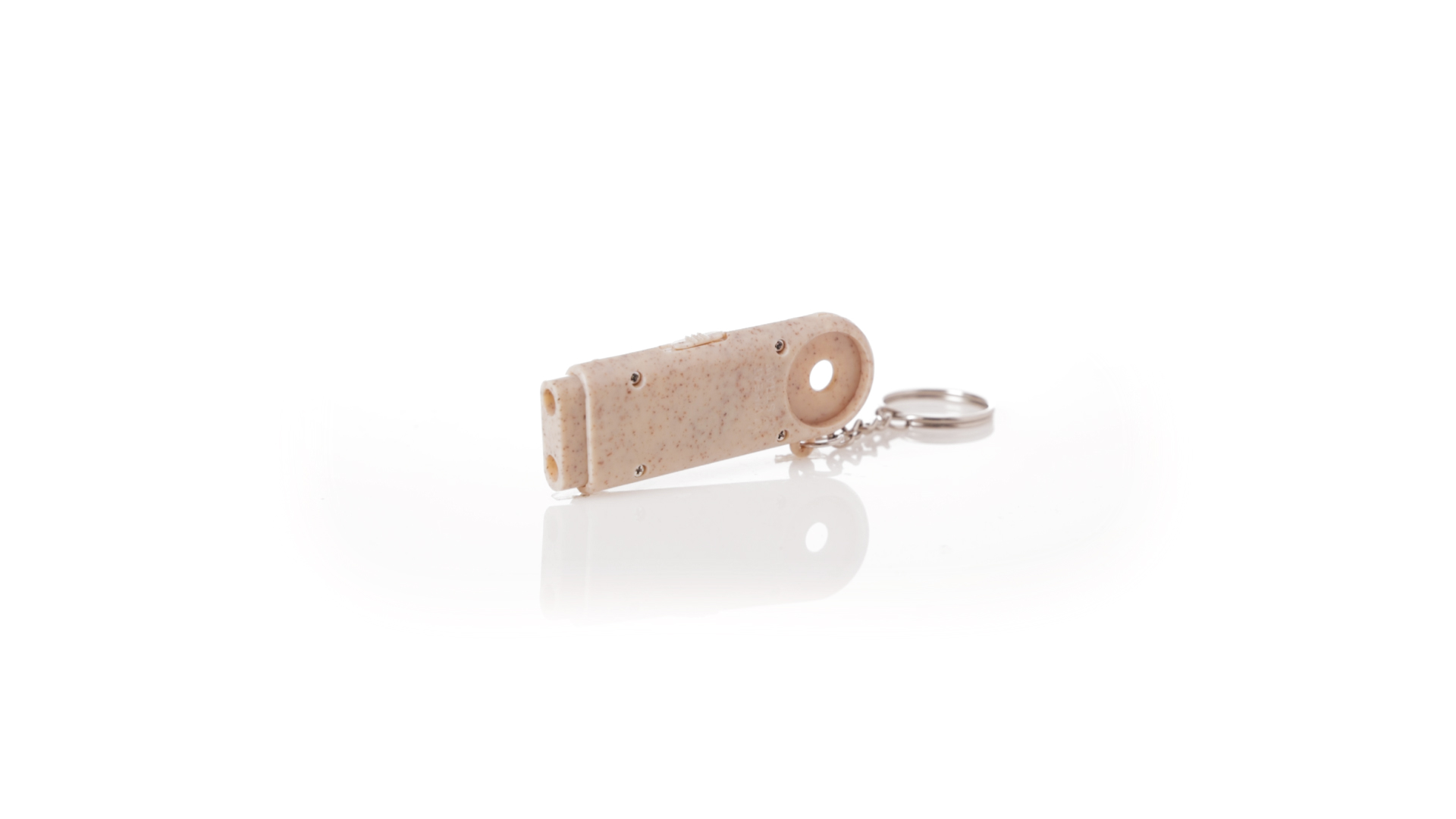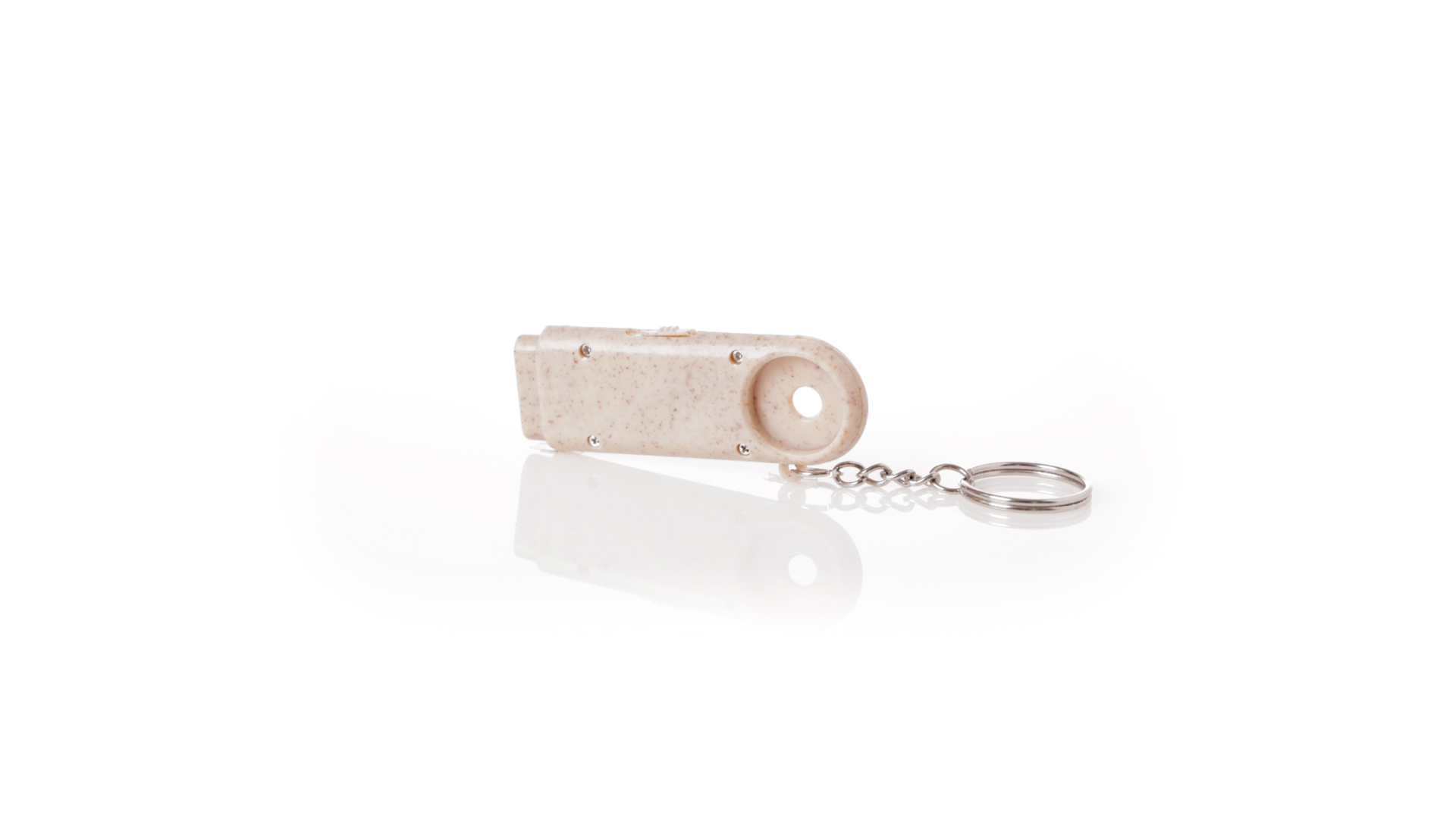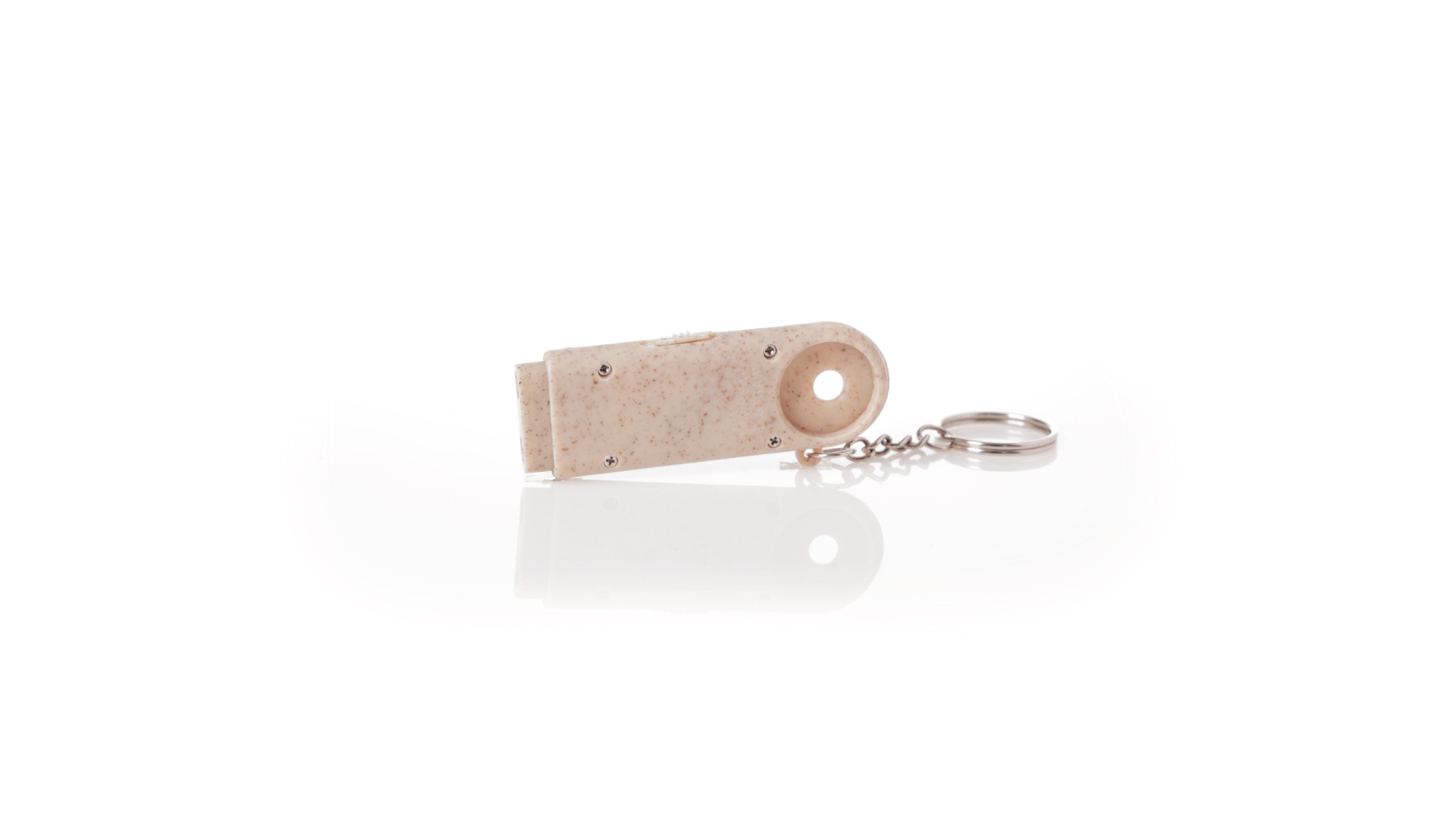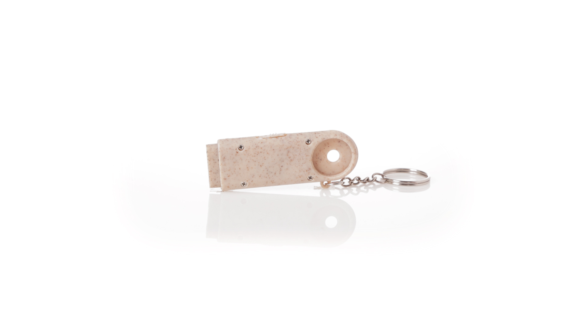 Münz-Schlüsselanhänger mit integrierter Taschenlampe, aus Weizenrohr und ABS. Mit praktischer Münze, 2 LEDs und Batteriebetrieb (Knopfbatterien enthalten). Mit Weizenstroh-Logo und in einer individuellen, recycelten Tasche.Hergestellt aus pflanzlichen Elementen, um die Verwendung natürlicher Rohstoffe zu fördern und die Schadstoffemissionen zu reduzieren.