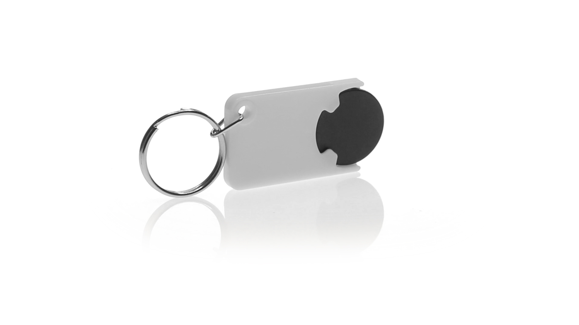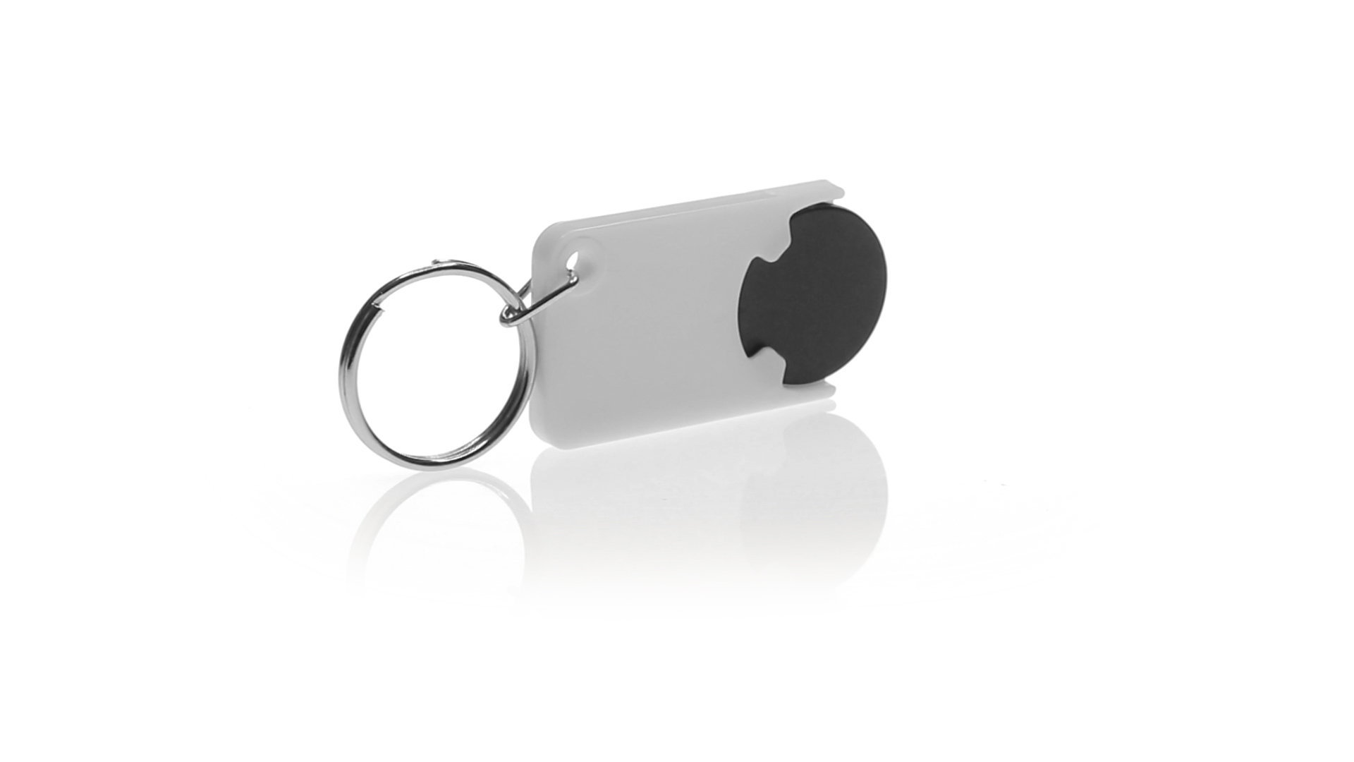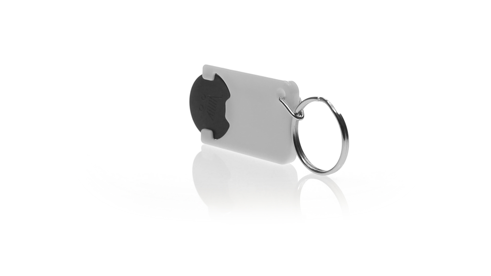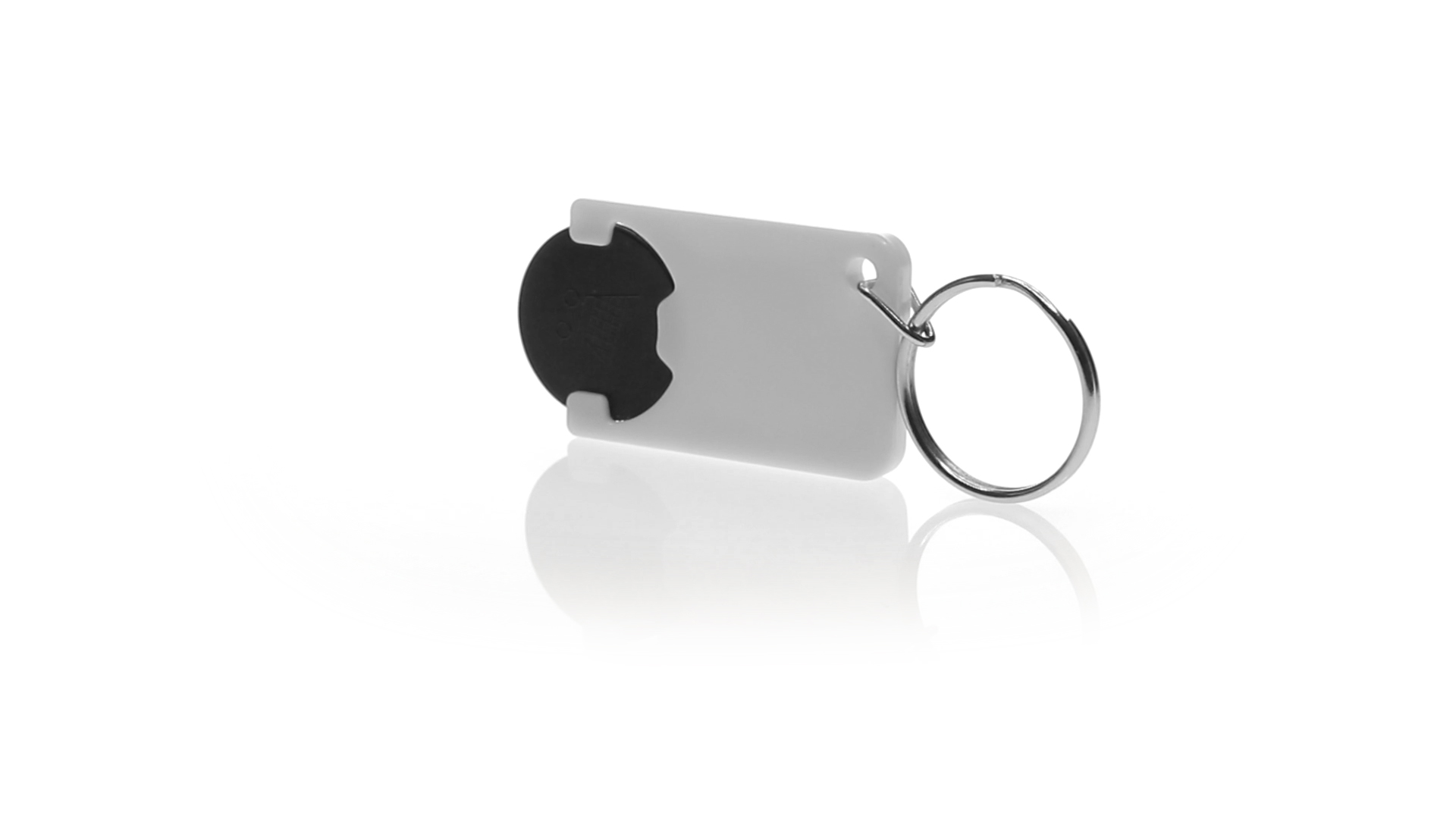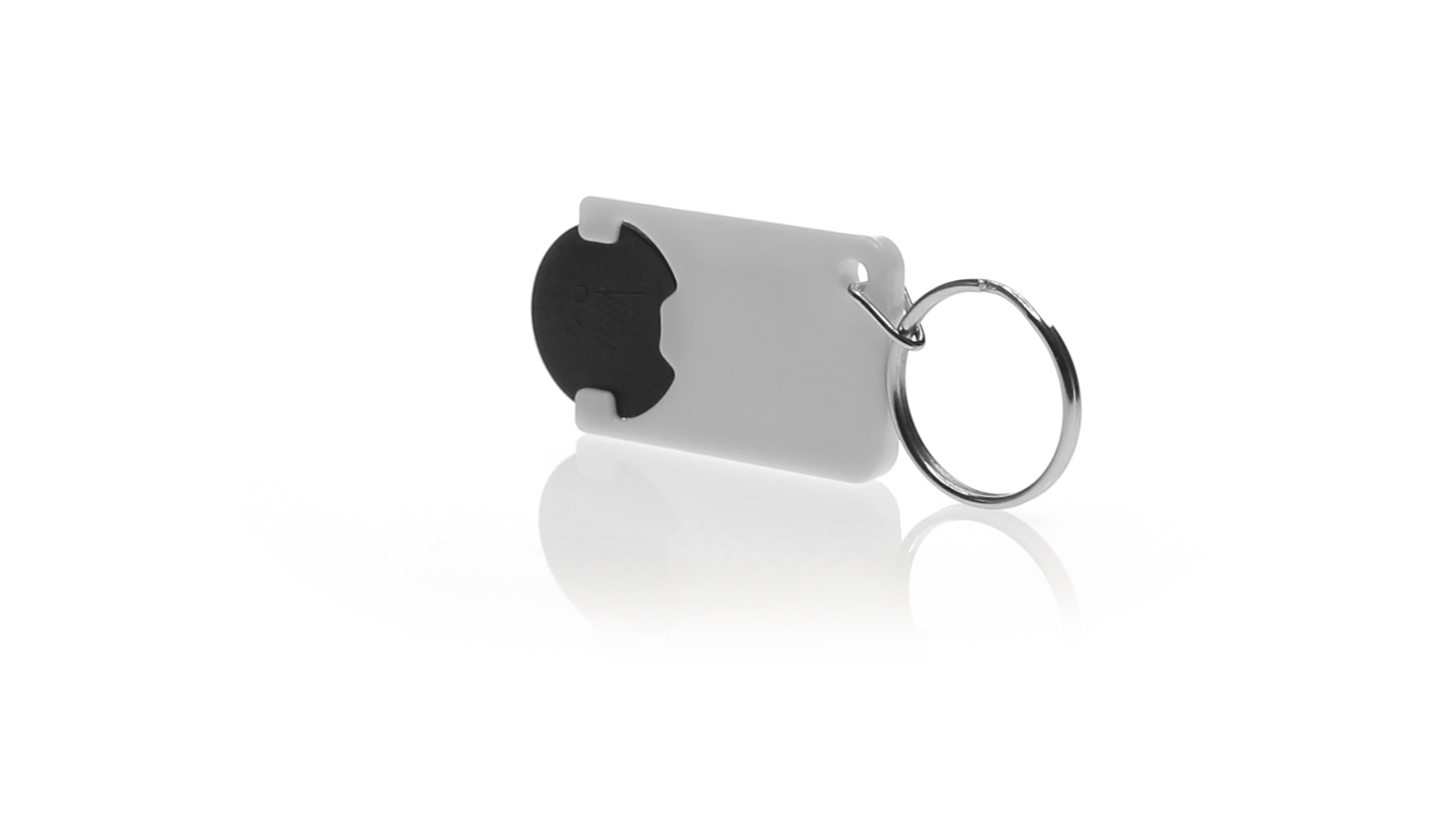 Münz-Schlüsselanhänger mit fröhlichem zweifarbigem Design in verschiedenen Farben und herausnehmbarer Münze.