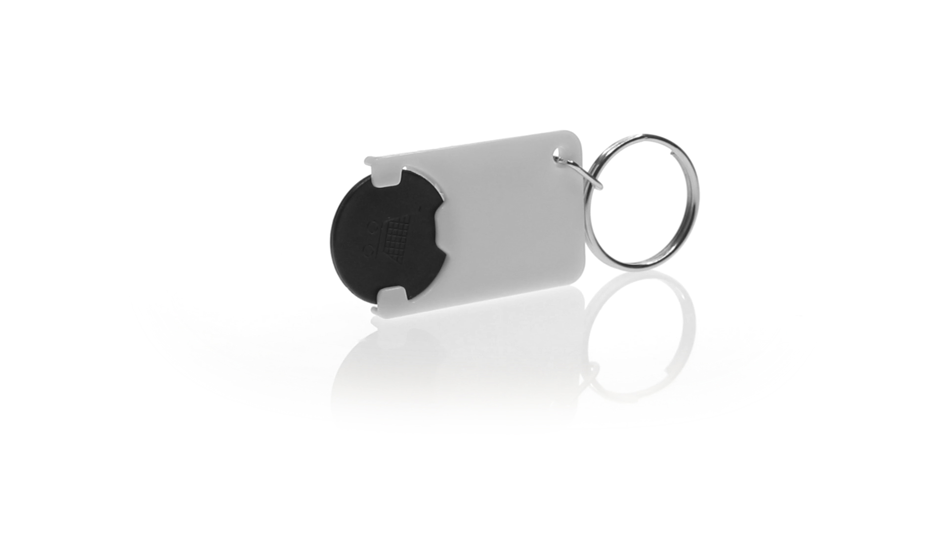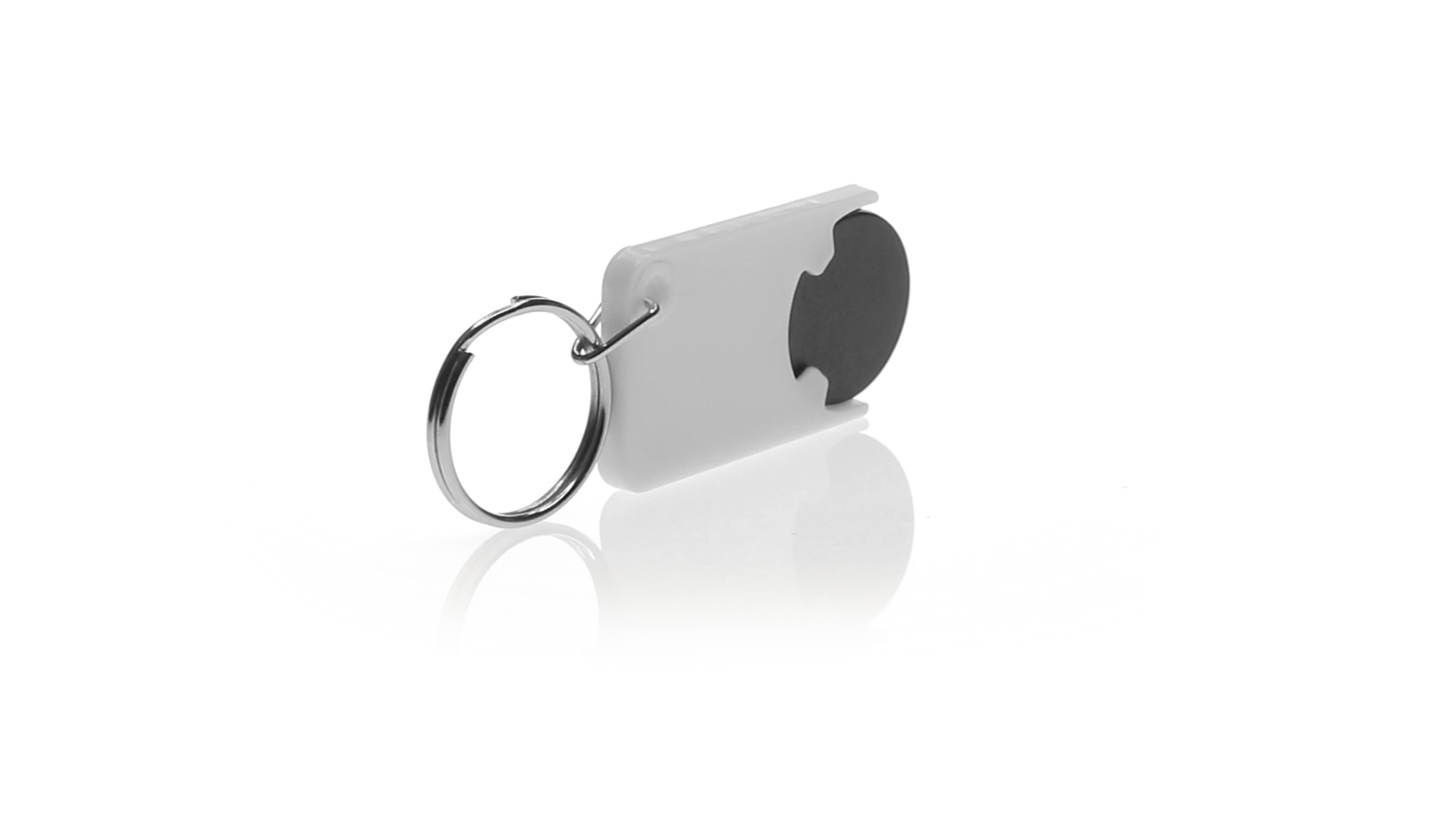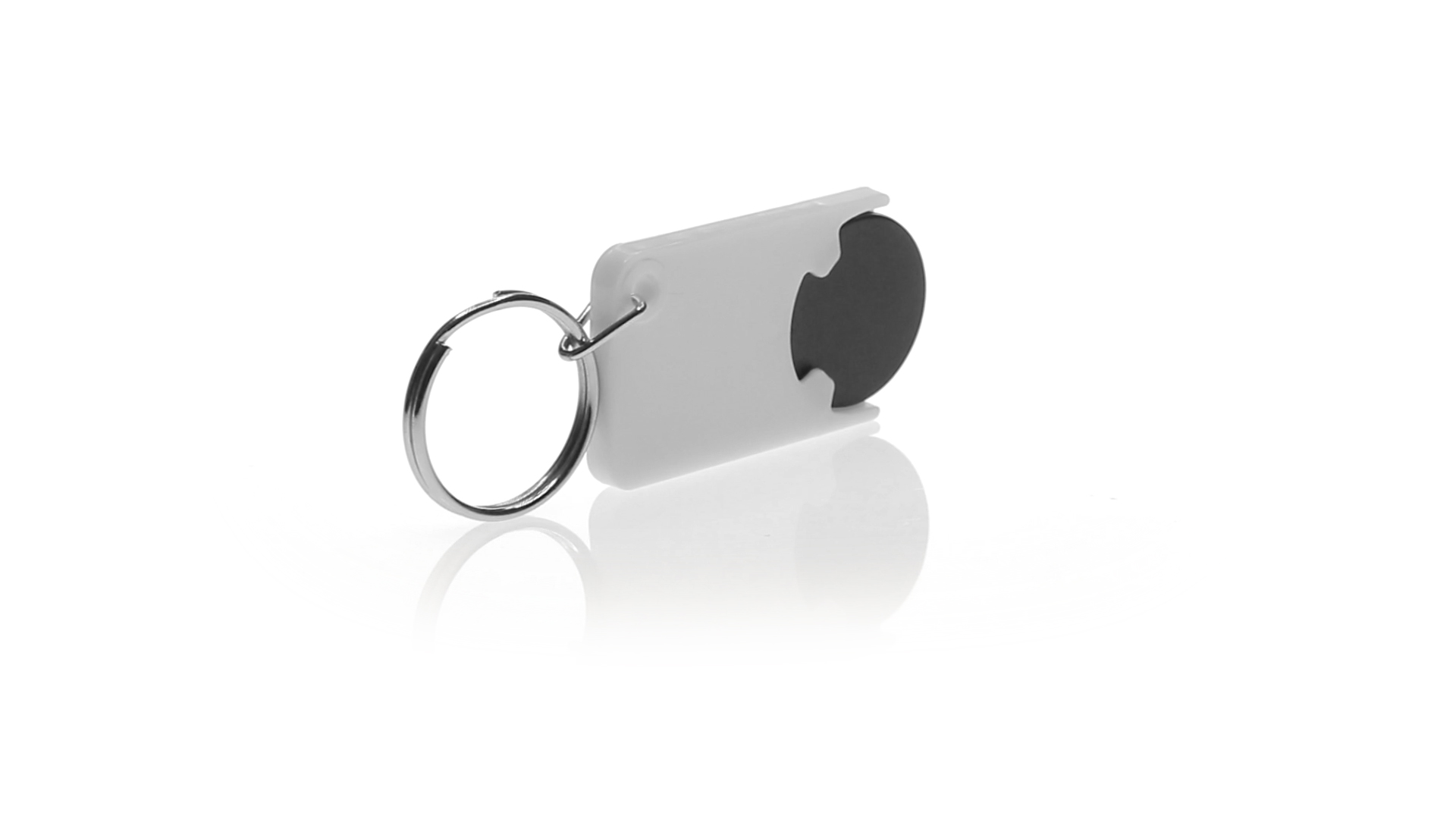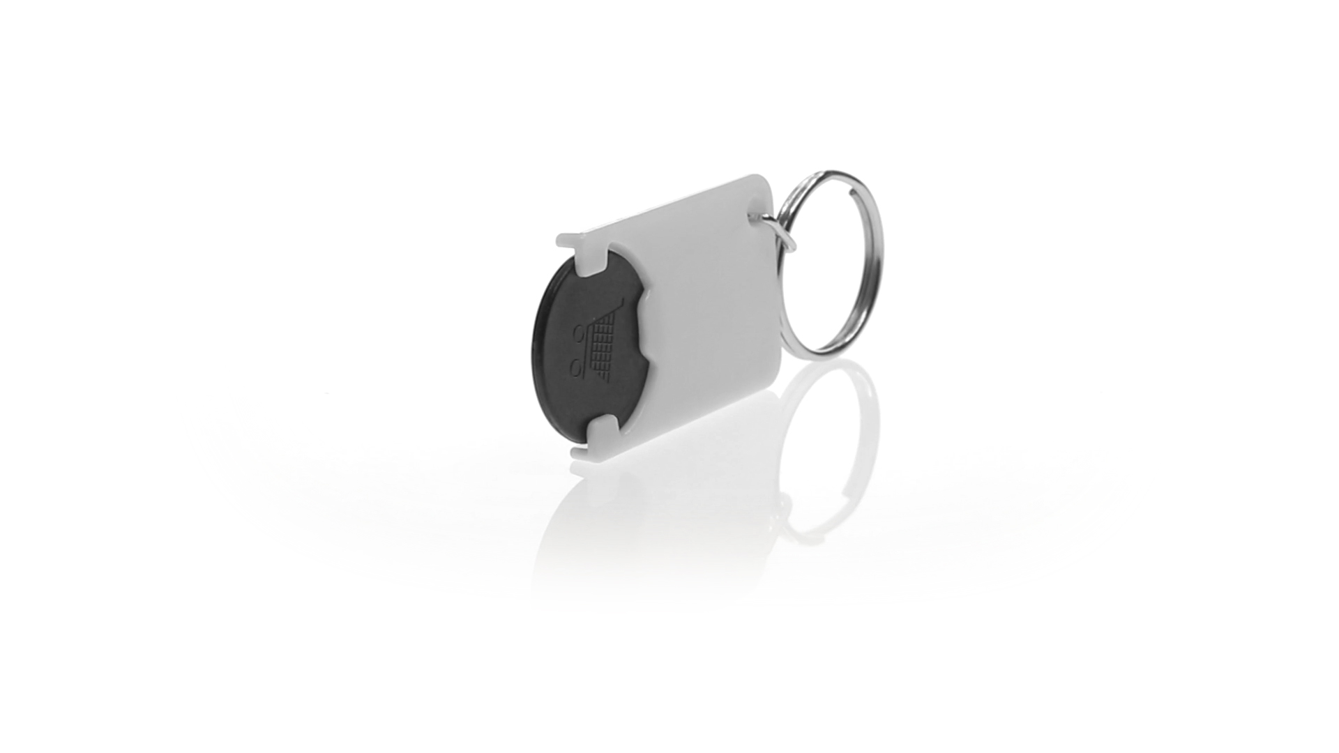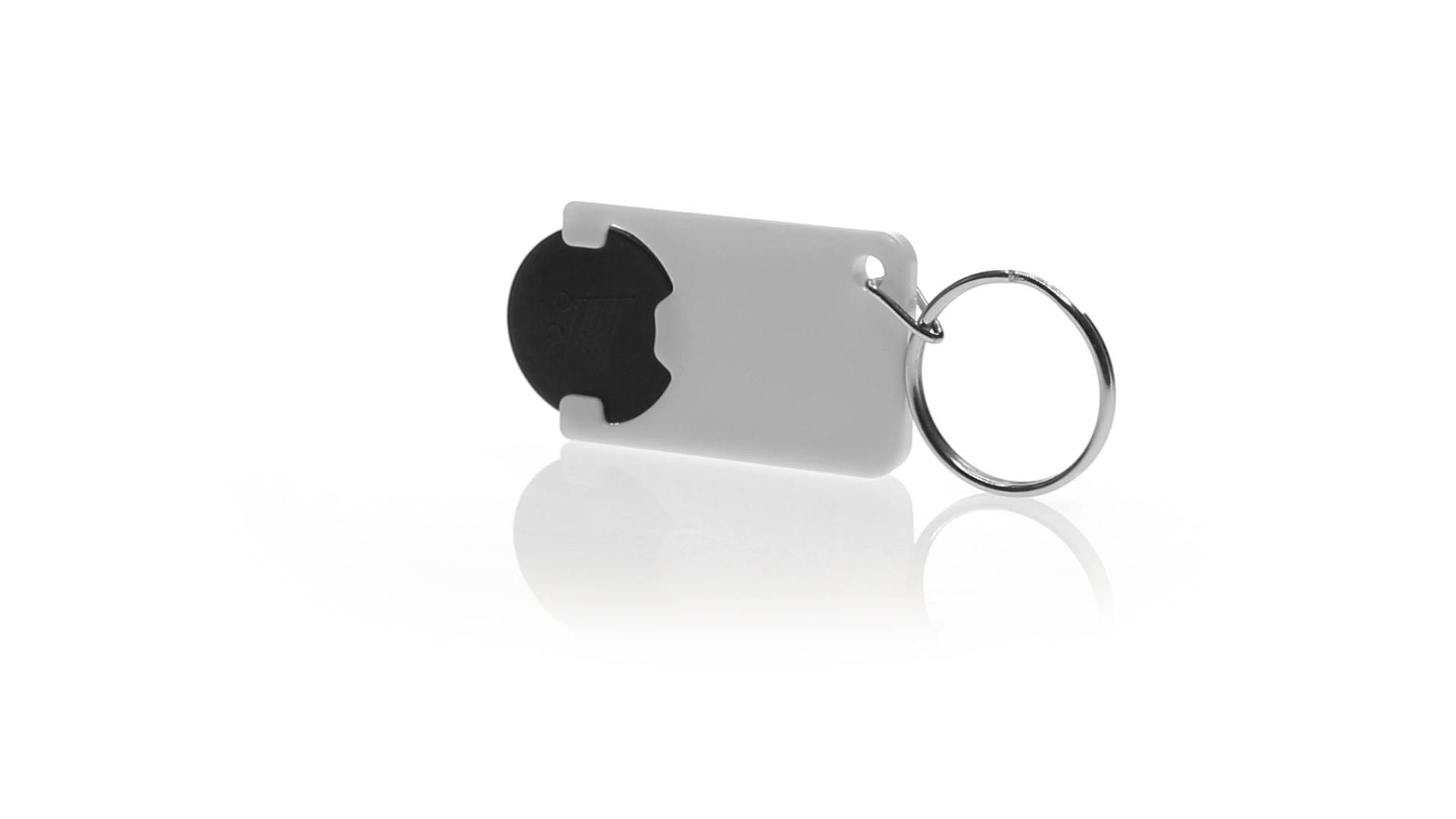 Münz-Schlüsselanhänger mit fröhlichem zweifarbigem Design in verschiedenen Farben und herausnehmbarer Münze.