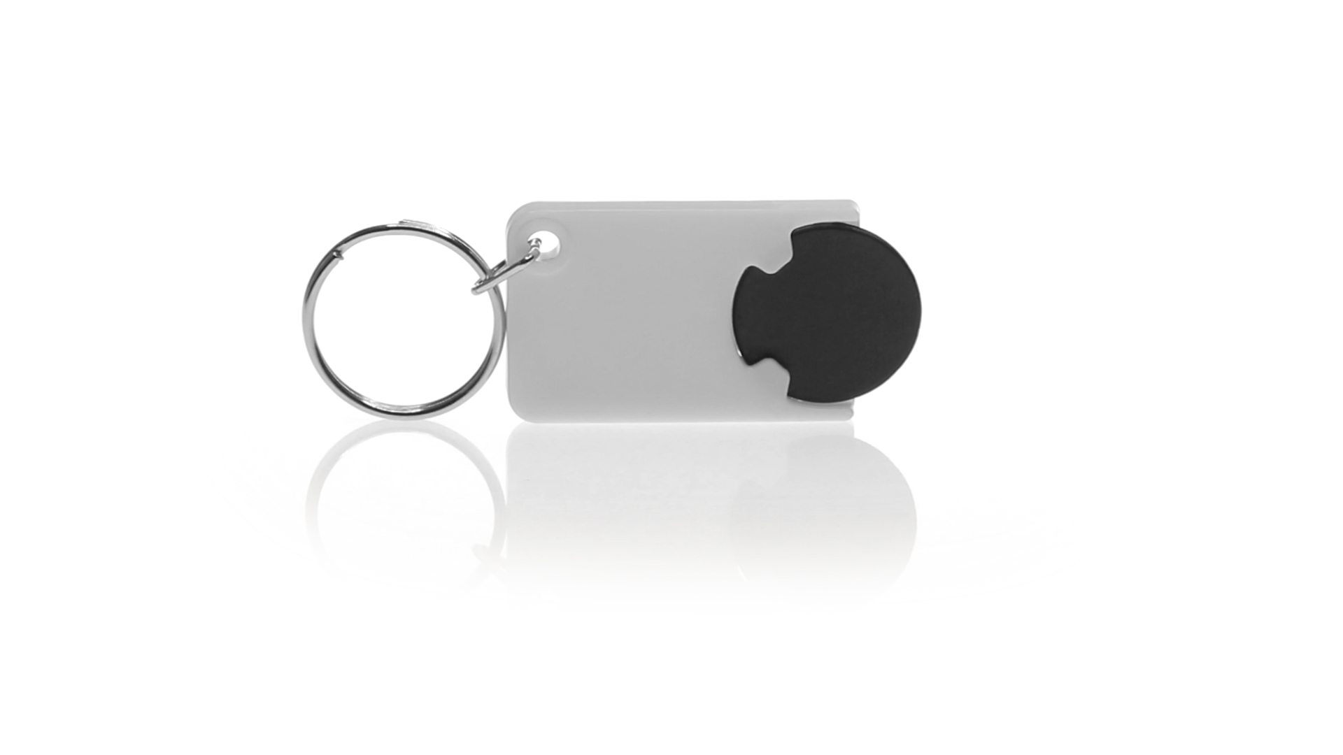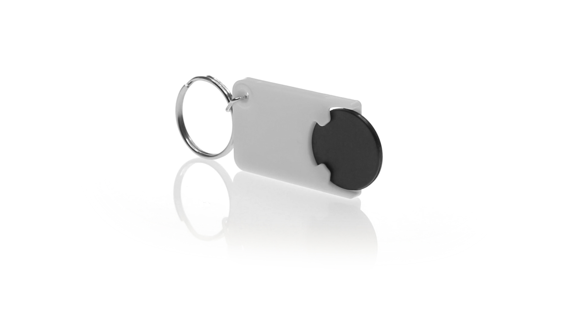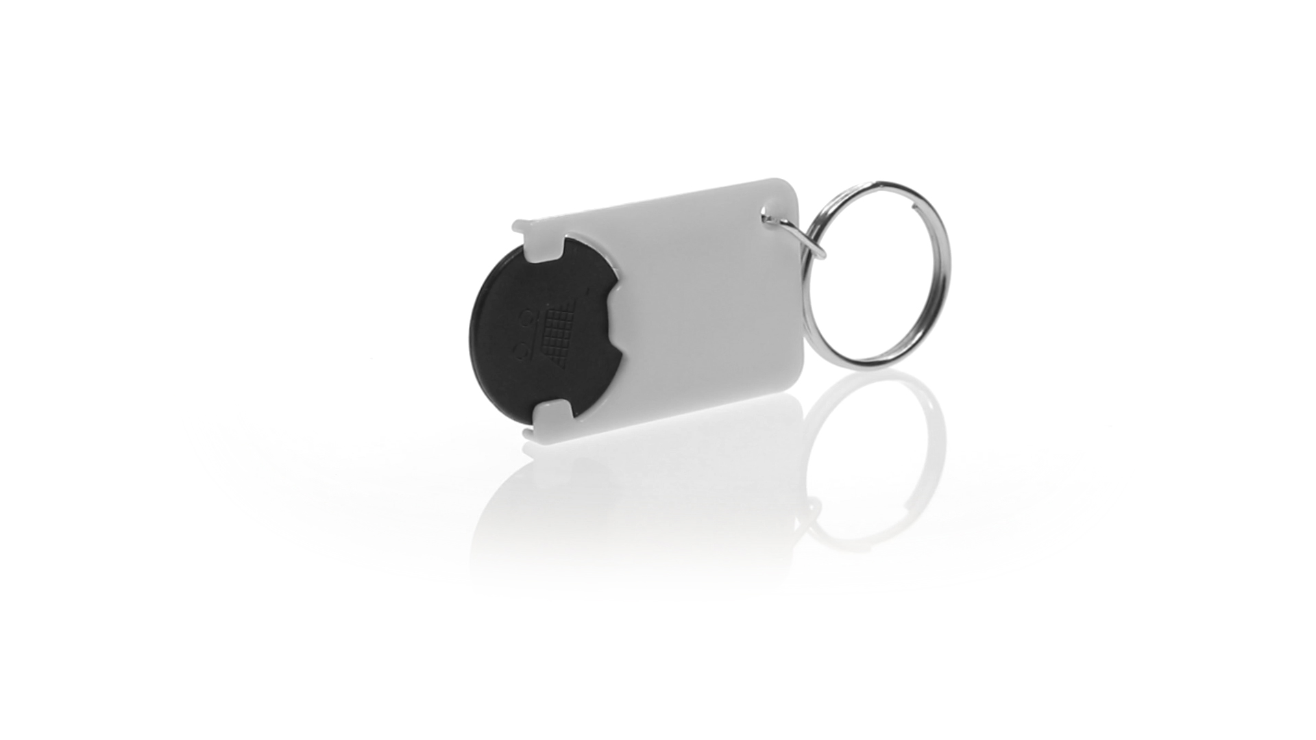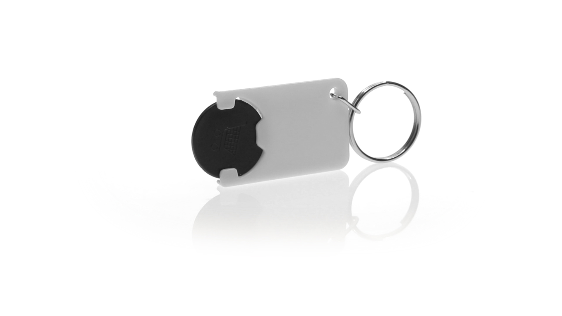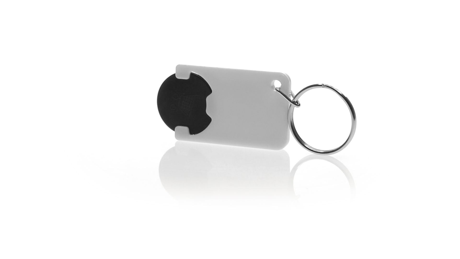 Münz-Schlüsselanhänger mit fröhlichem zweifarbigem Design in verschiedenen Farben und herausnehmbarer Münze.