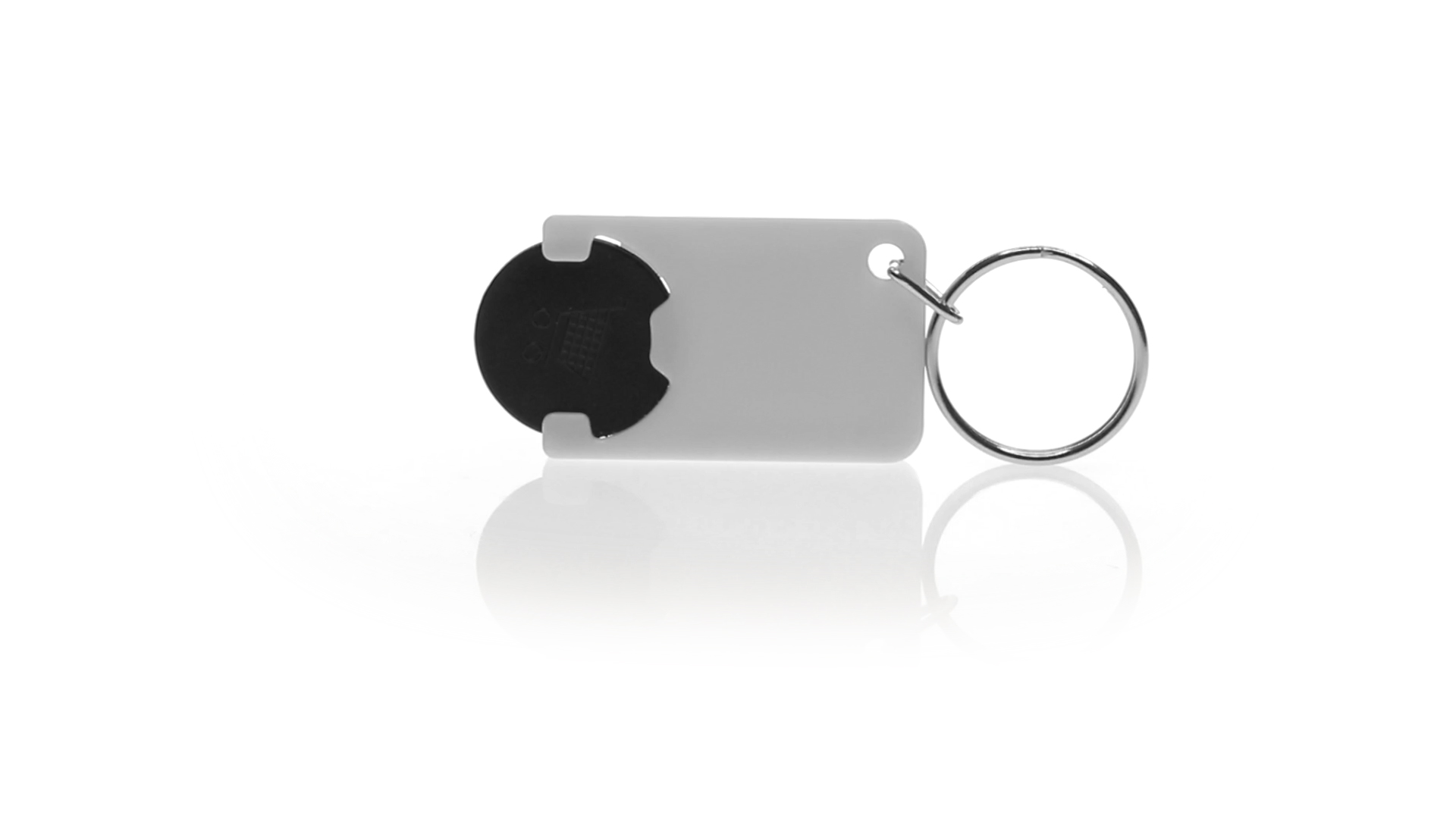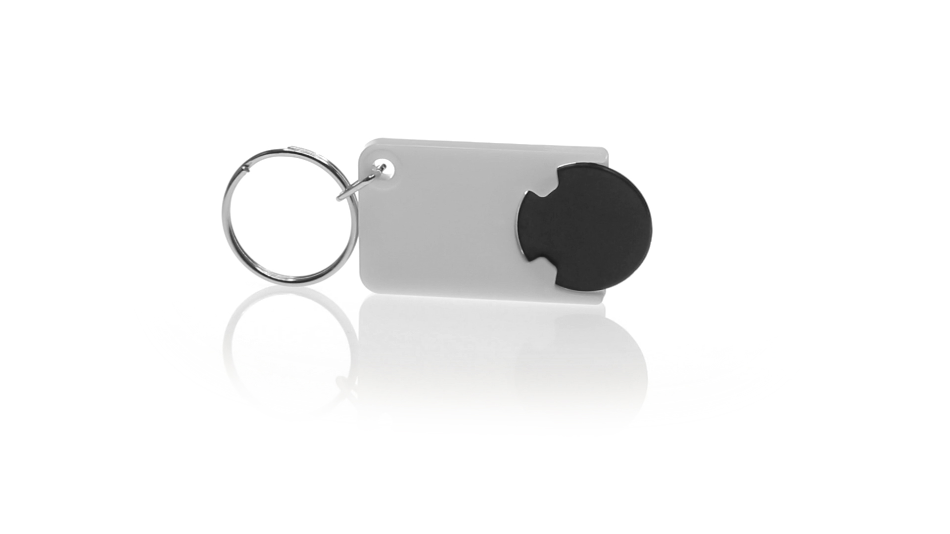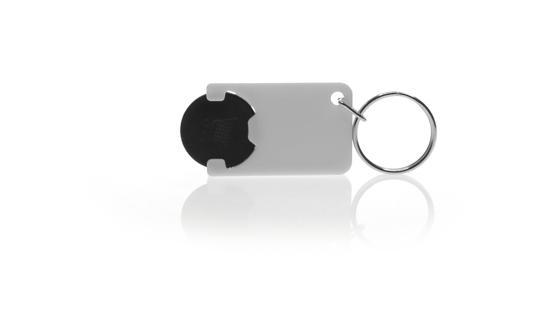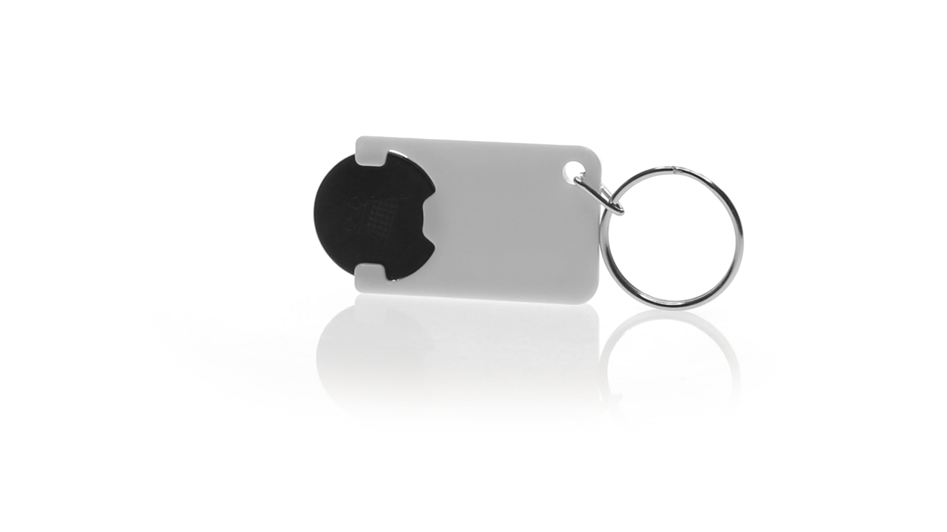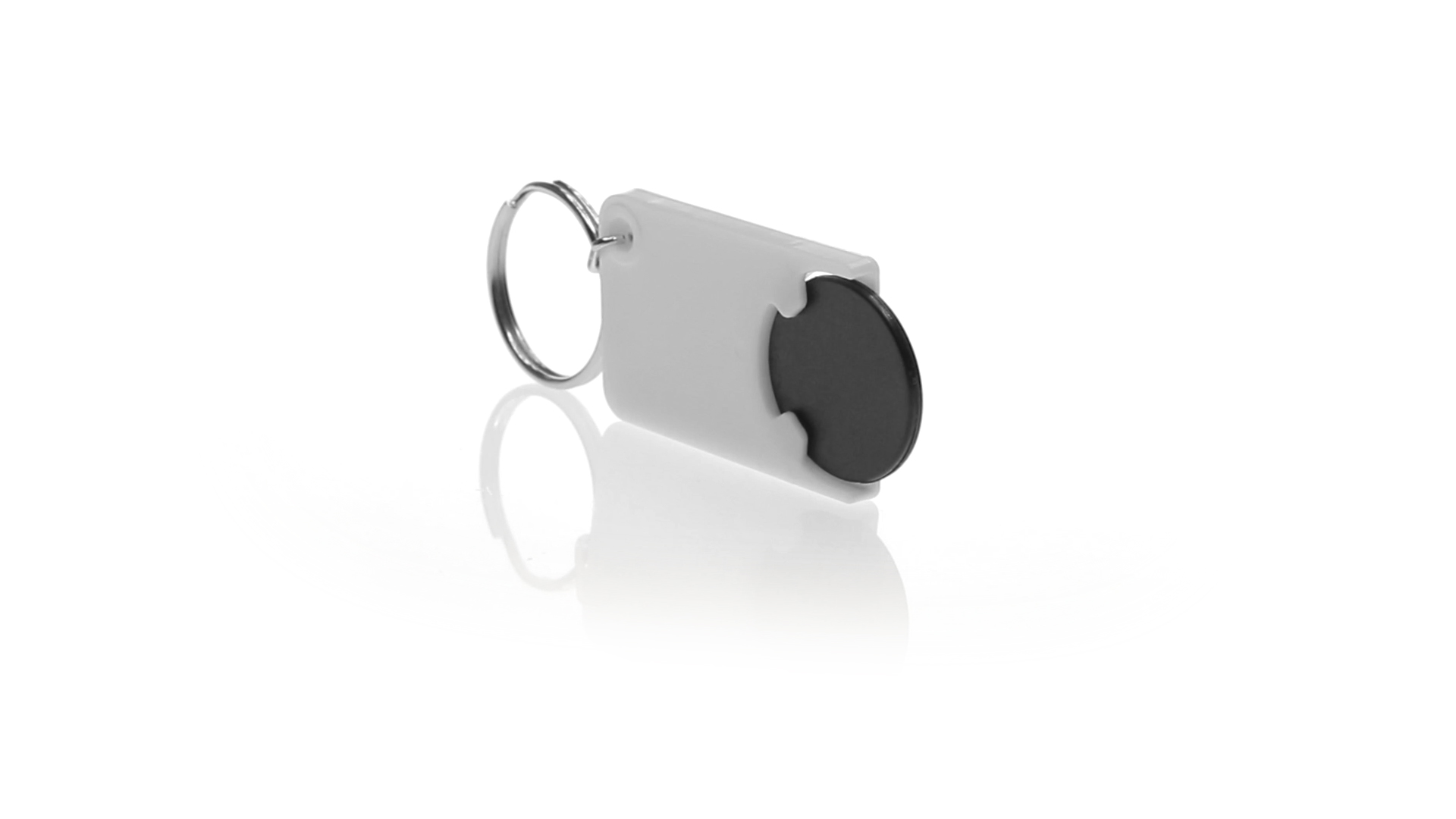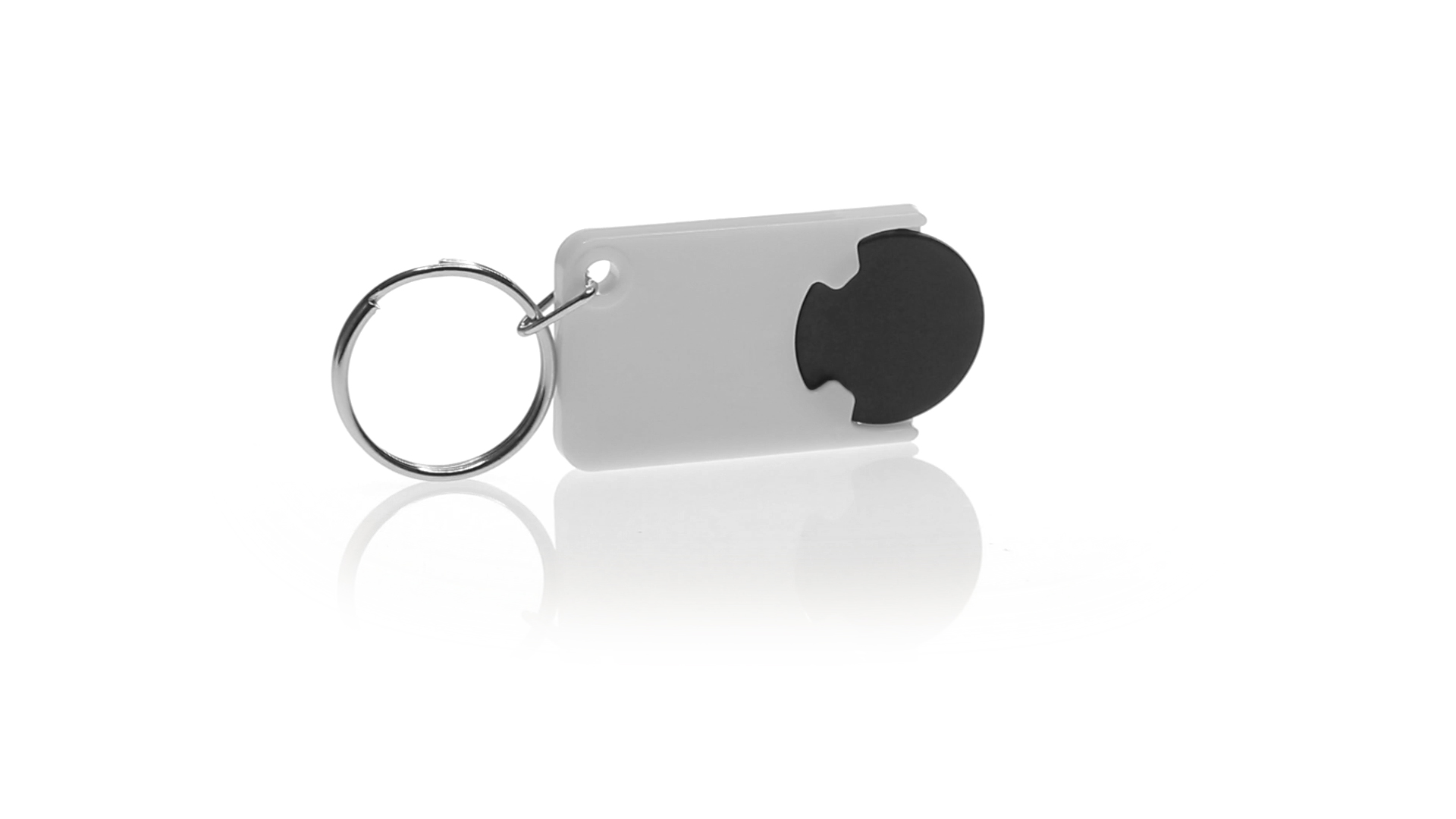 Münz-Schlüsselanhänger mit fröhlichem zweifarbigem Design in verschiedenen Farben und herausnehmbarer Münze.