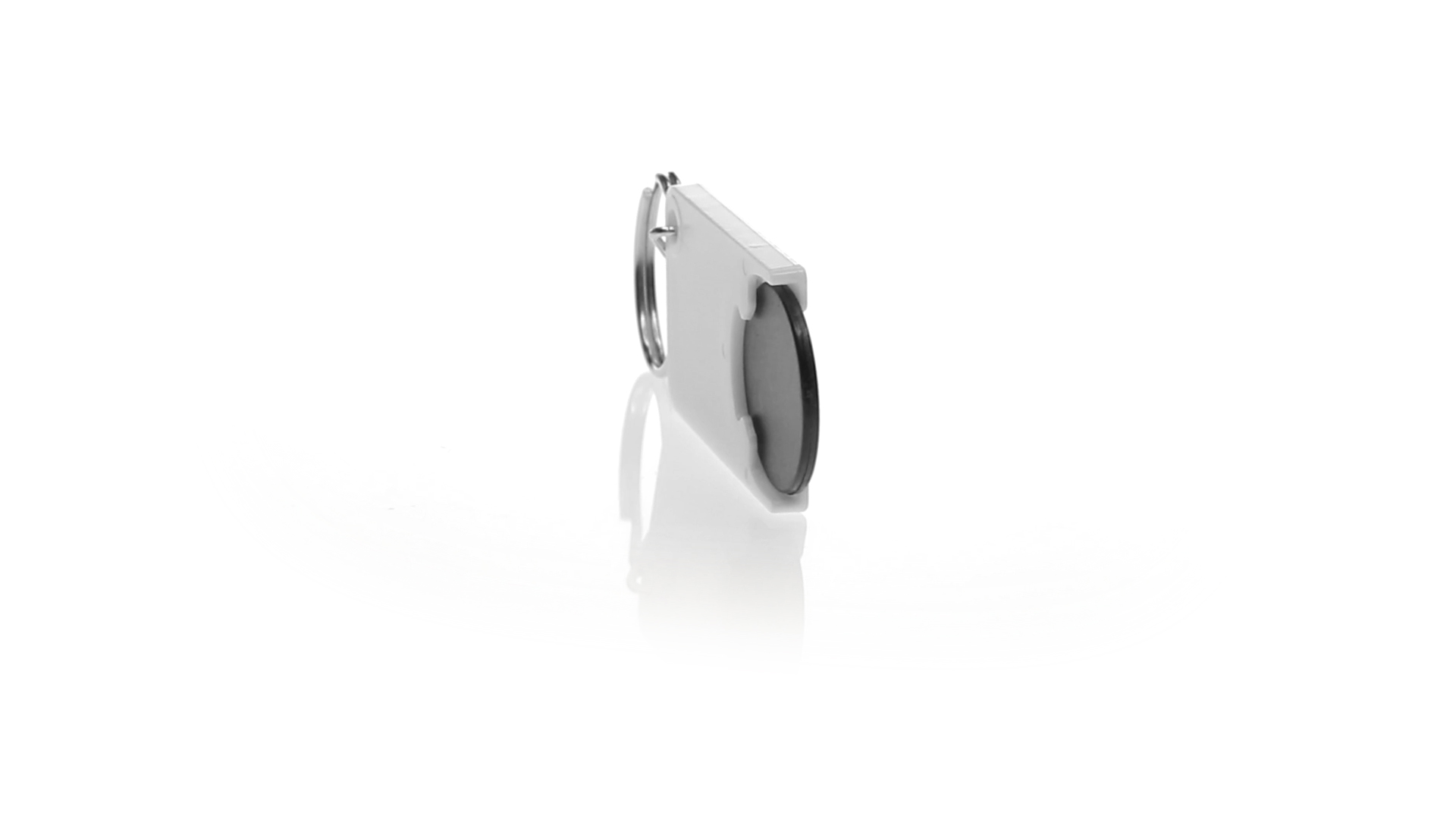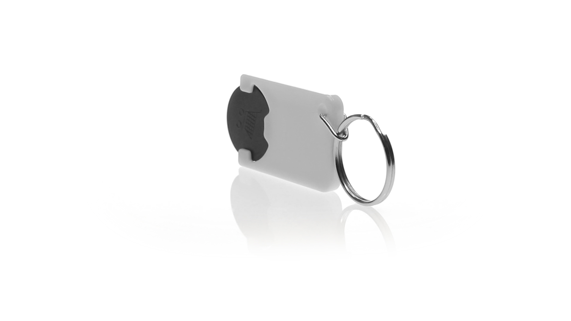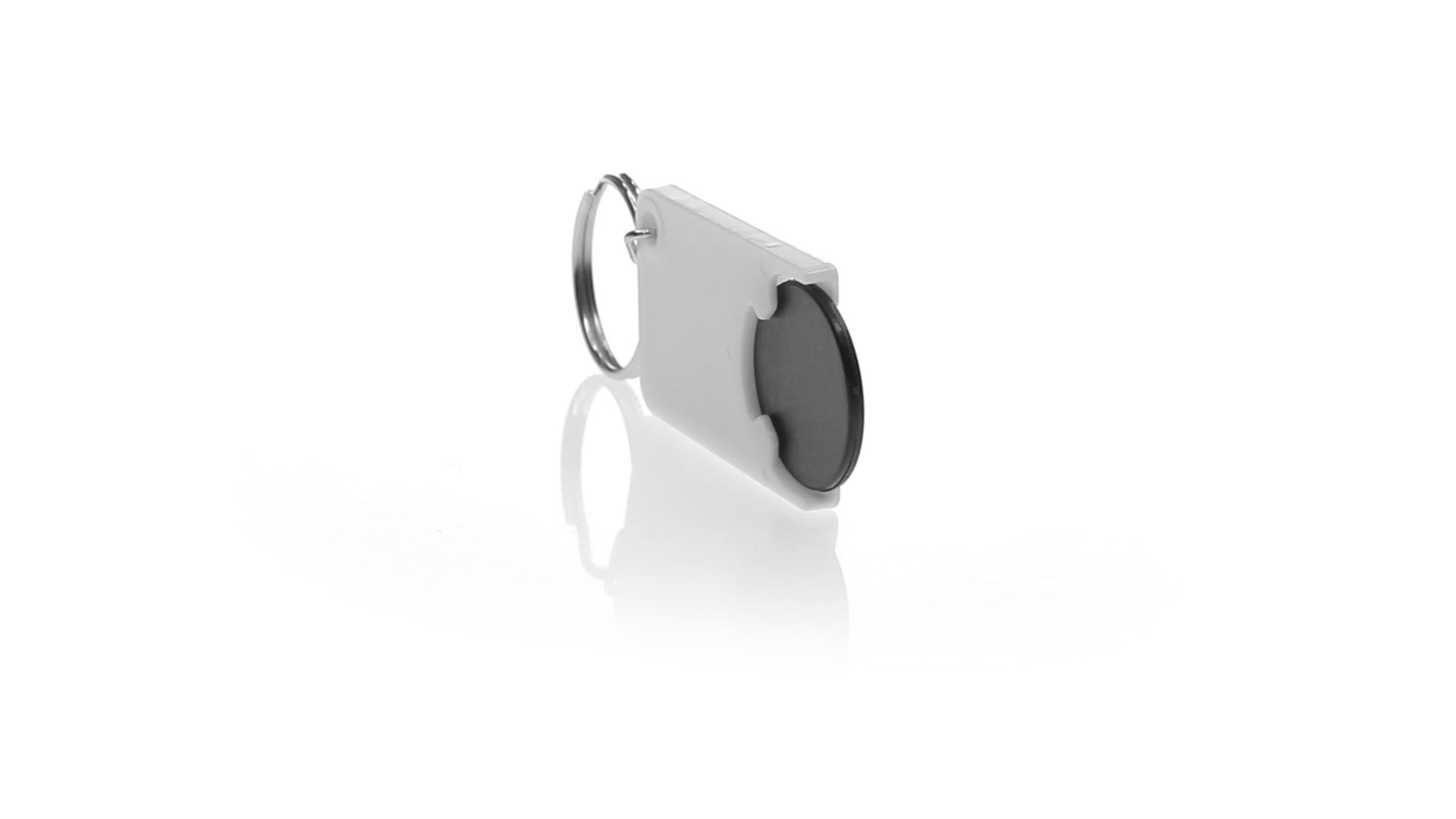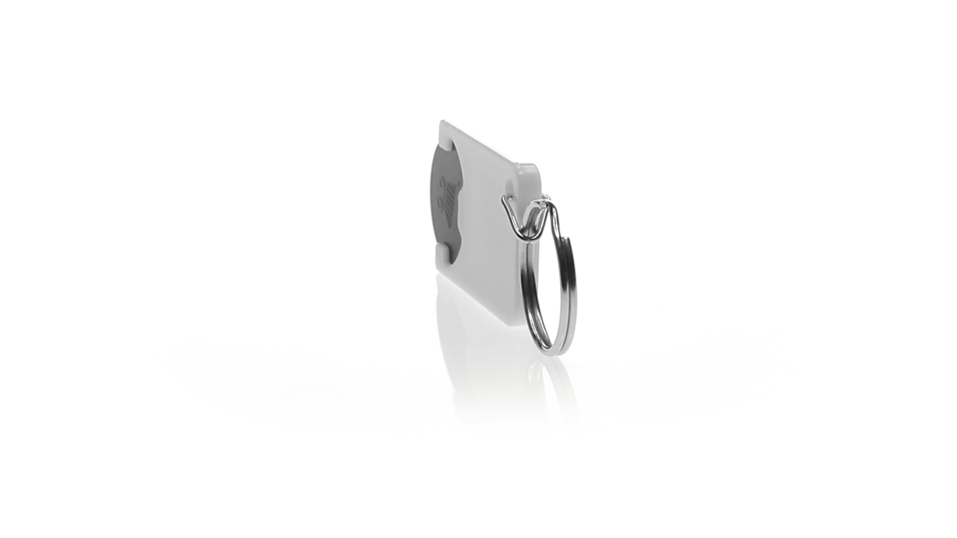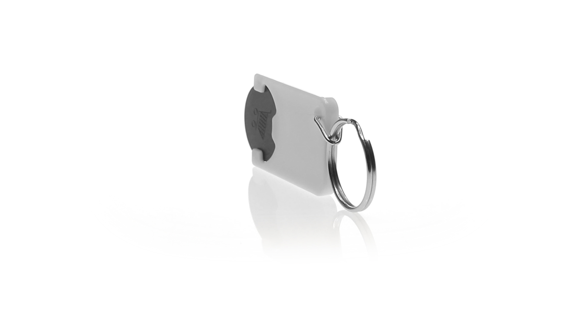 Münz-Schlüsselanhänger mit fröhlichem zweifarbigem Design in verschiedenen Farben und herausnehmbarer Münze.