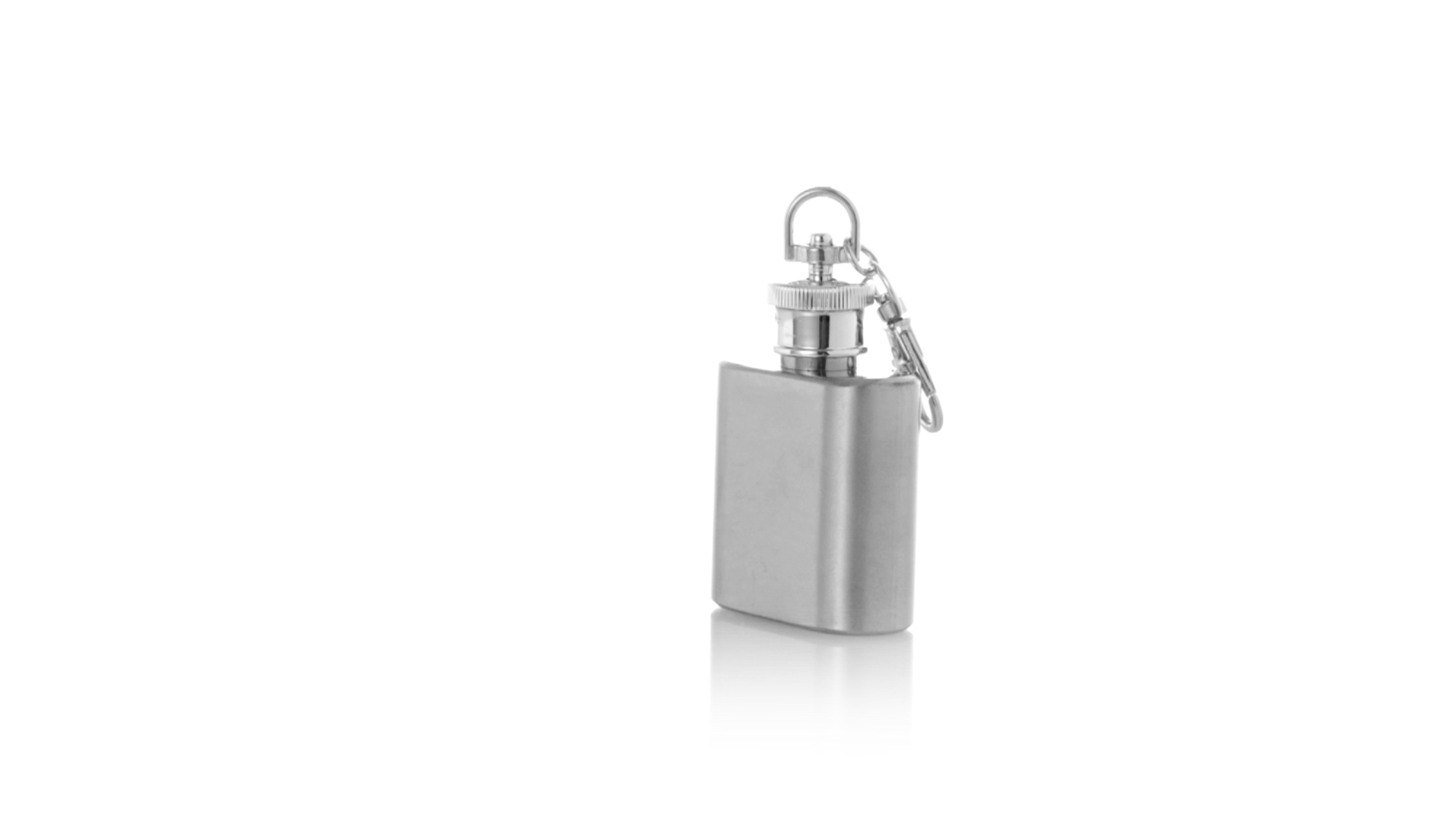 Handlicher Flaschenschlüsselanhänger aus Edelstahl mit 30 ml Fassungsvermögen. Deckel mit aufschraubbarem Sicherheitsdeckel und drehbarem Haken. Präsentiert in einer individuellen Box mit Kraftdesign.
