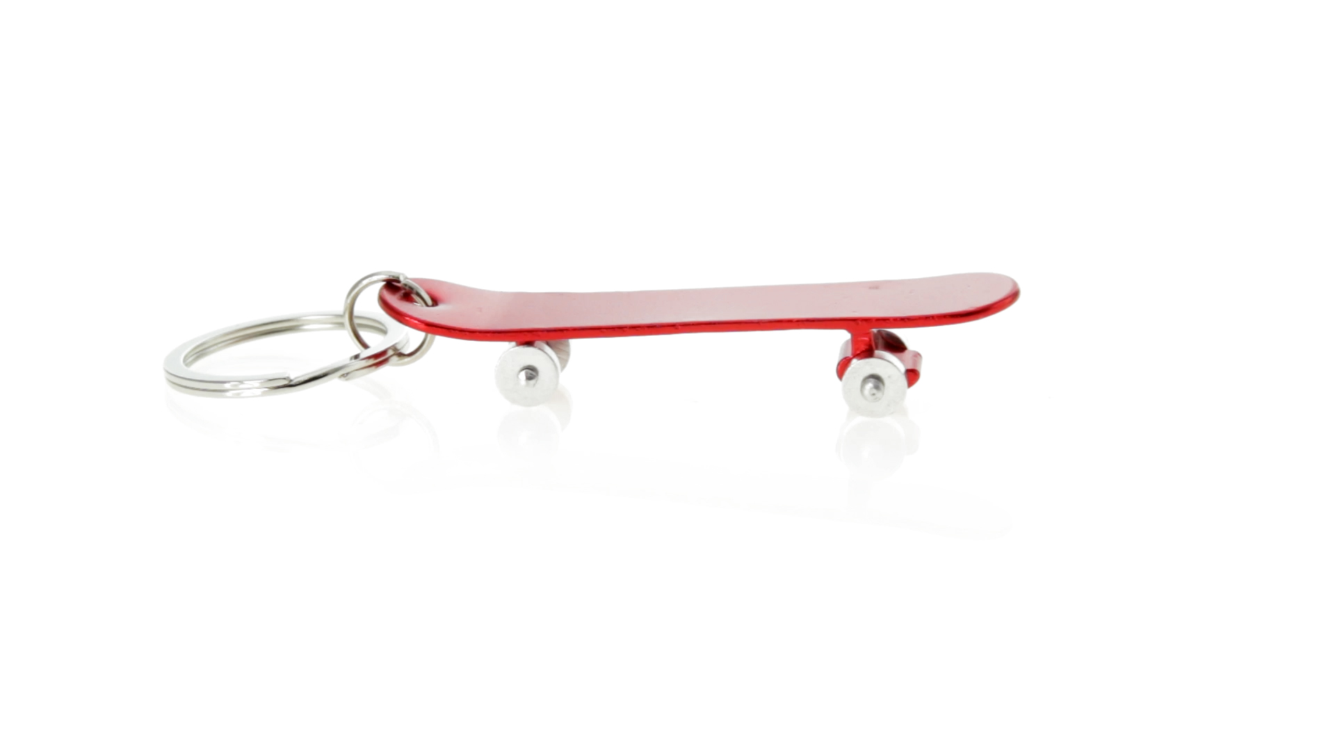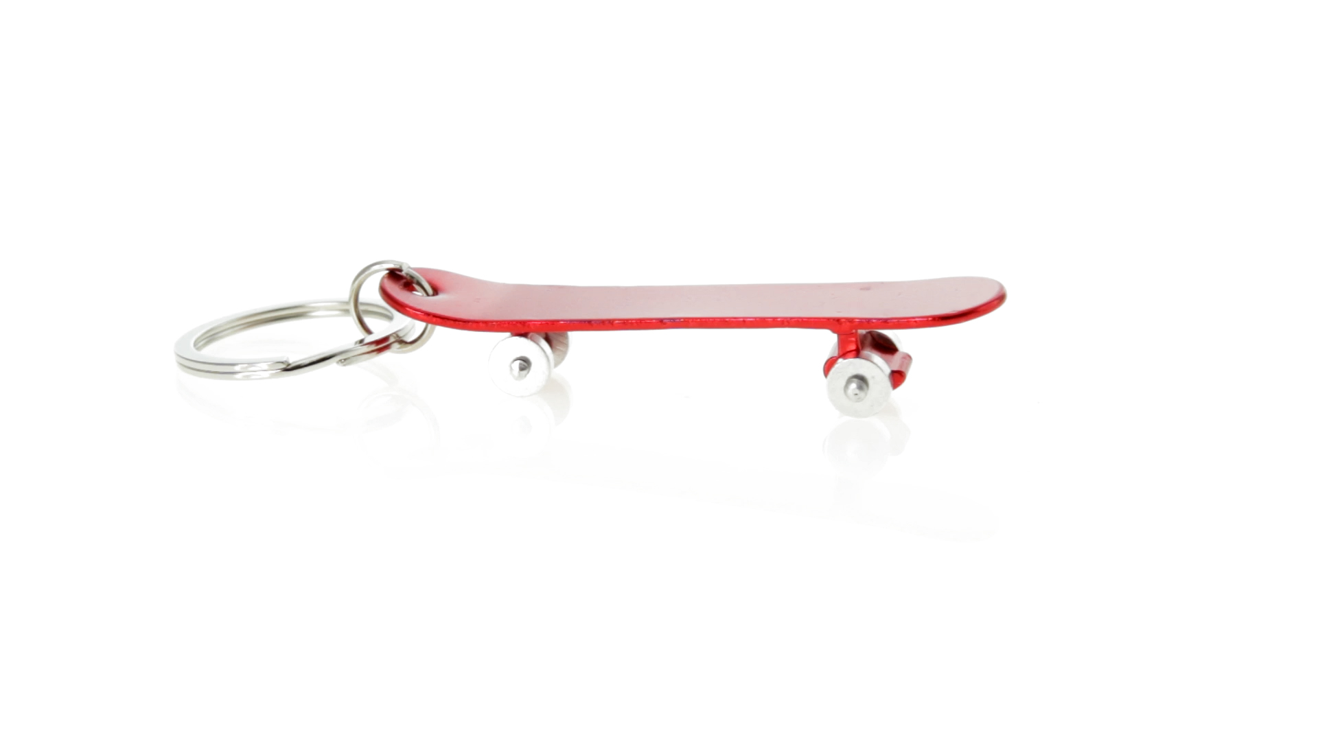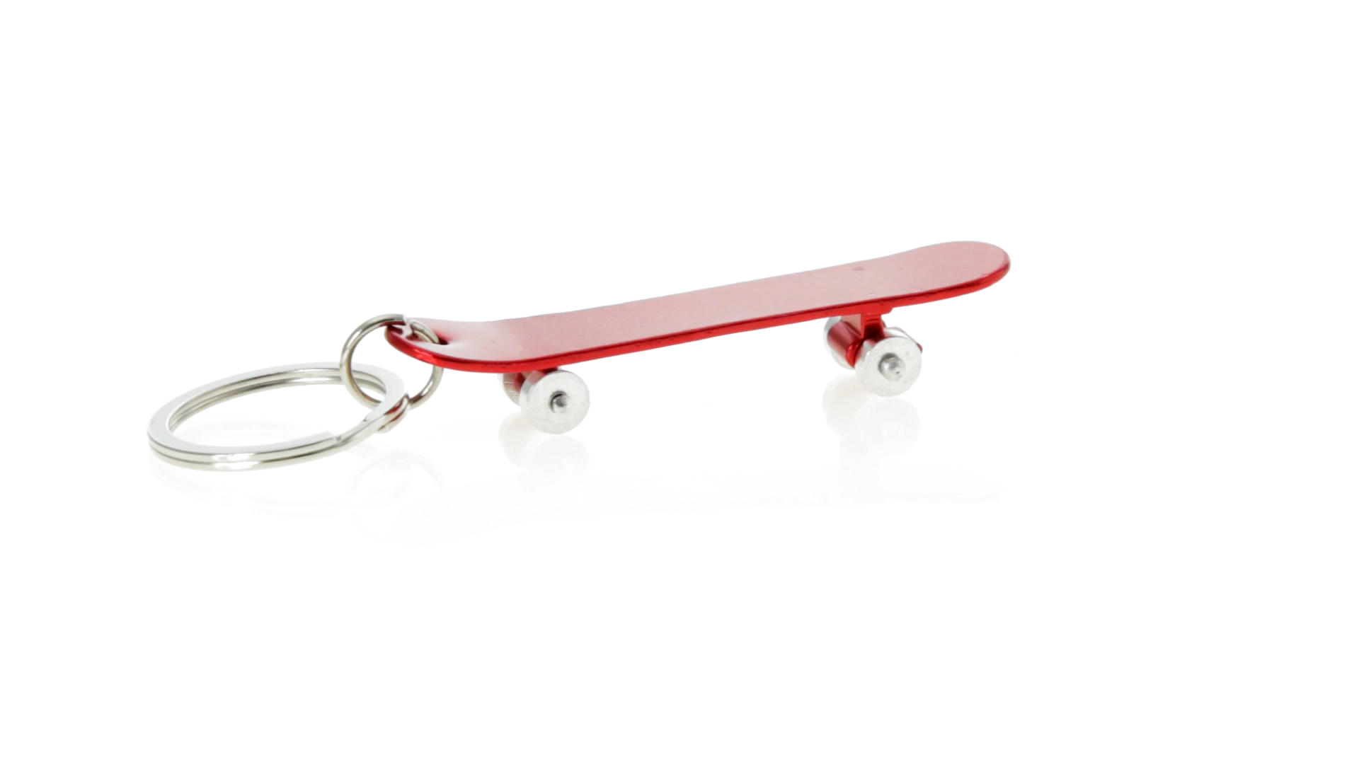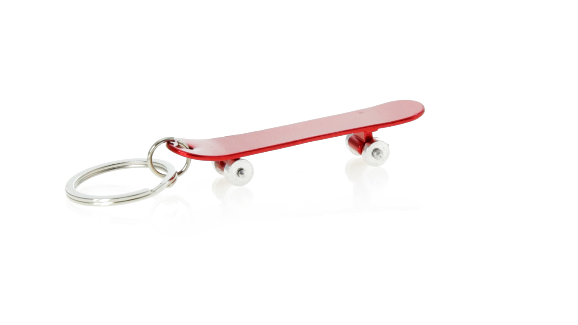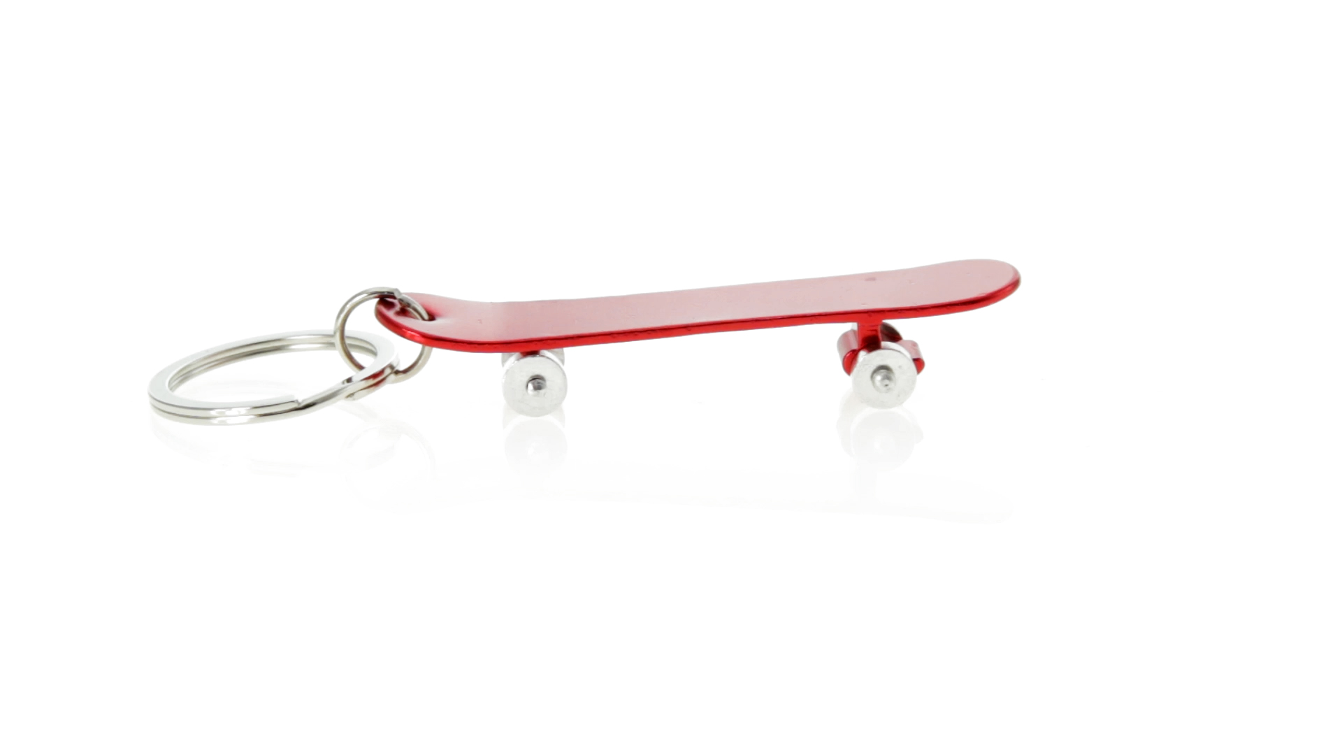 Origineller Schlüsselanhänger mit Flaschenöffner aus Aluminium in einer Vielzahl von leuchtenden Farben. Mit Skateboard-Design und sich drehenden Rädern.