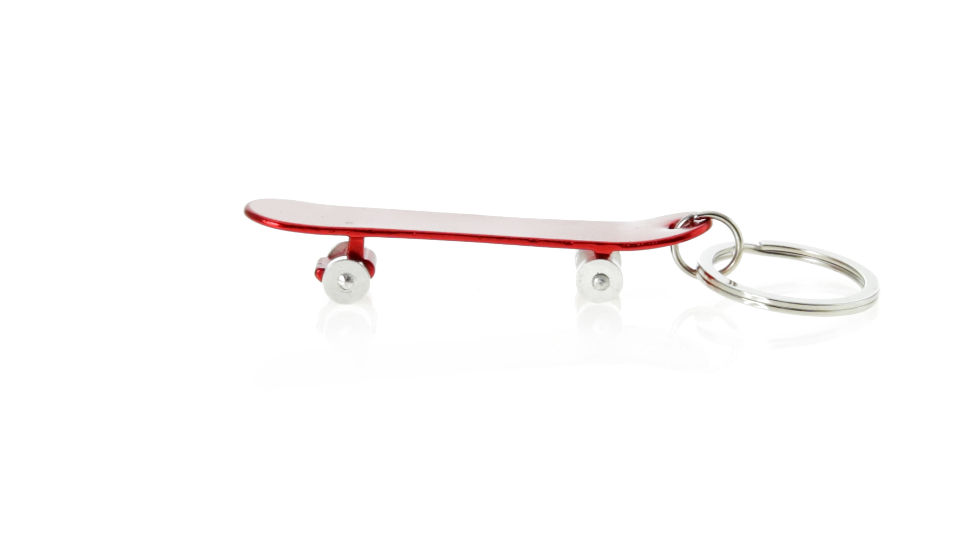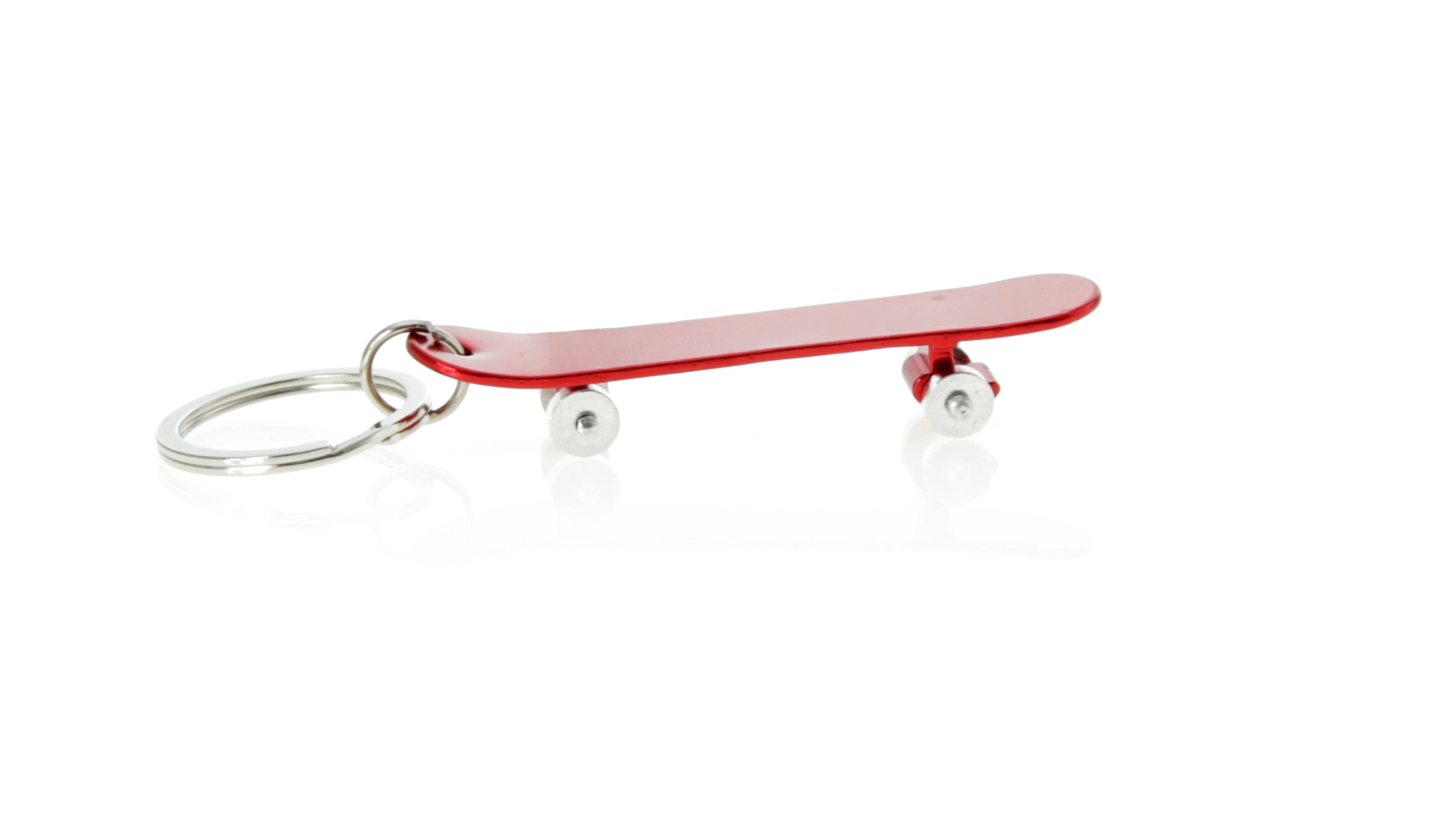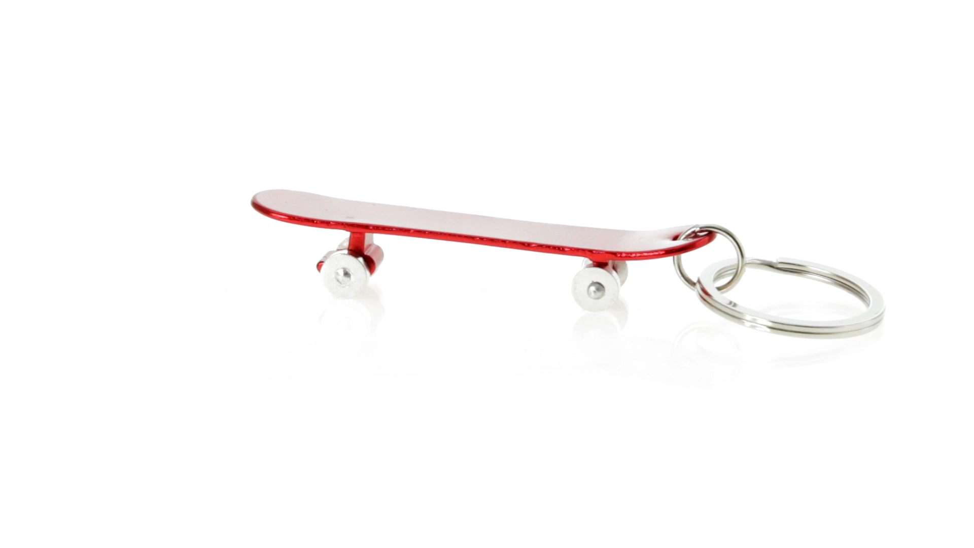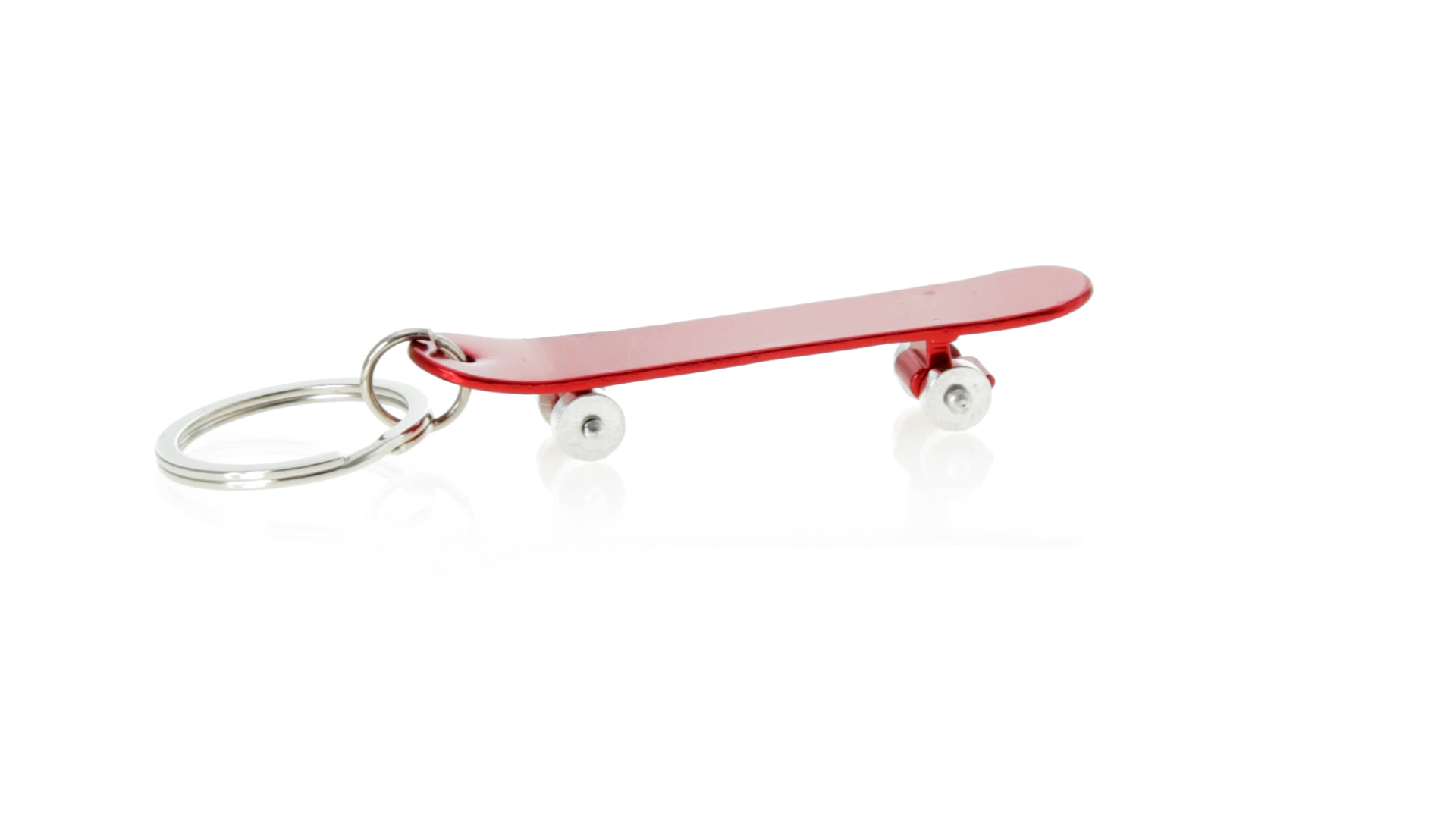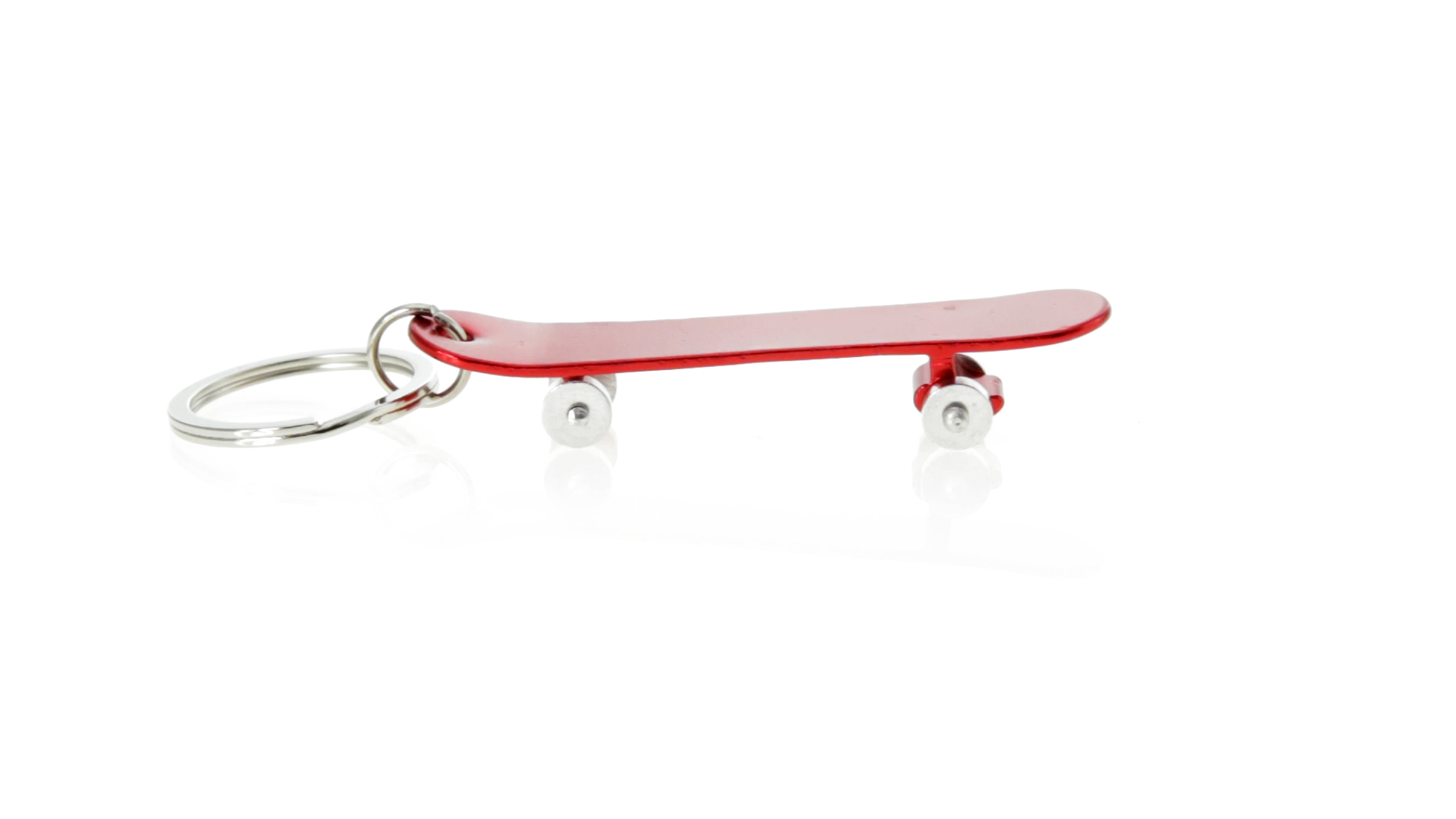 Origineller Schlüsselanhänger mit Flaschenöffner aus Aluminium in einer Vielzahl von leuchtenden Farben. Mit Skateboard-Design und sich drehenden Rädern.