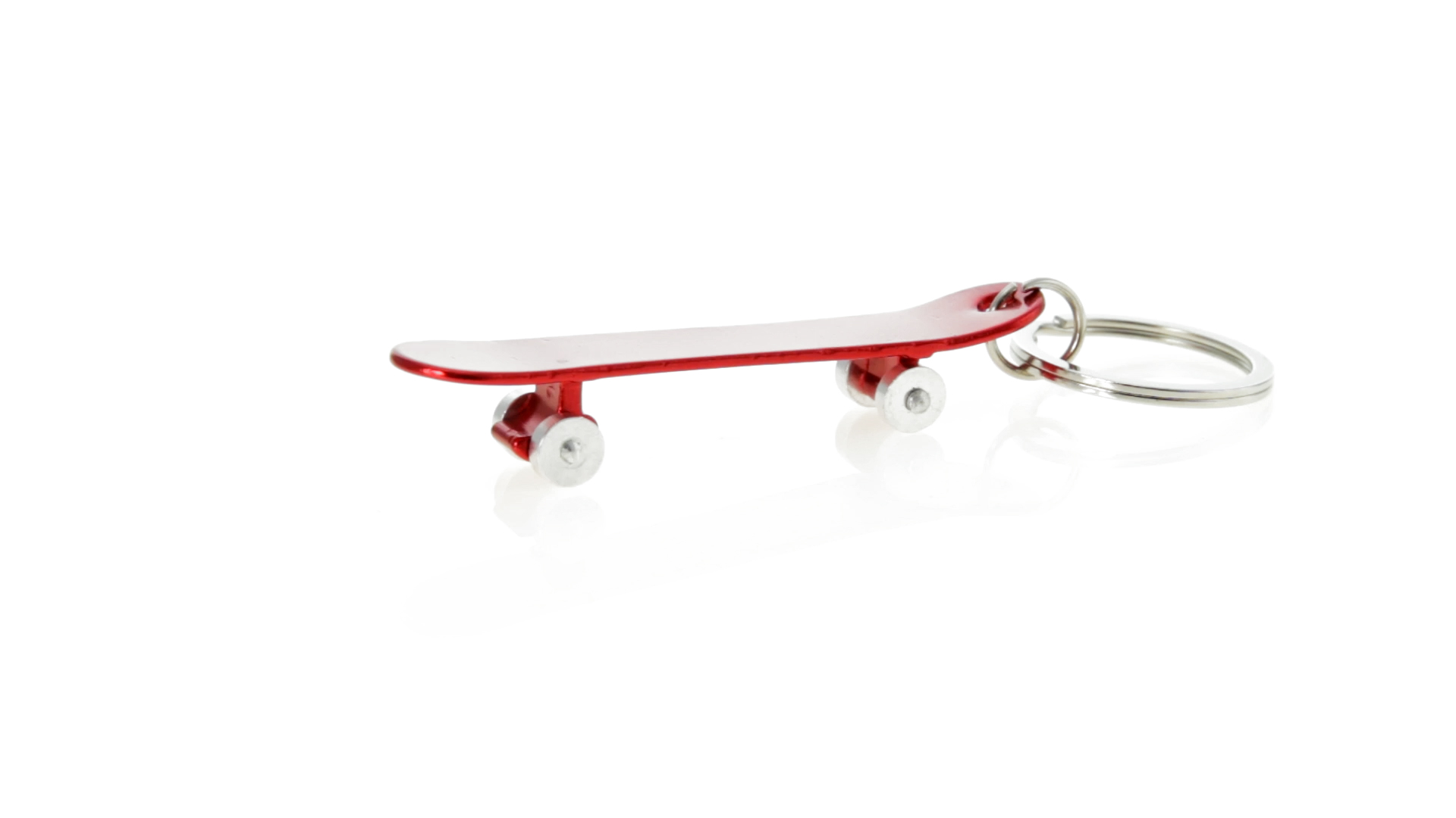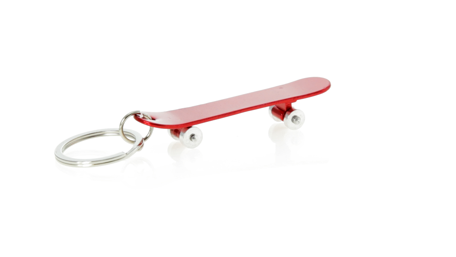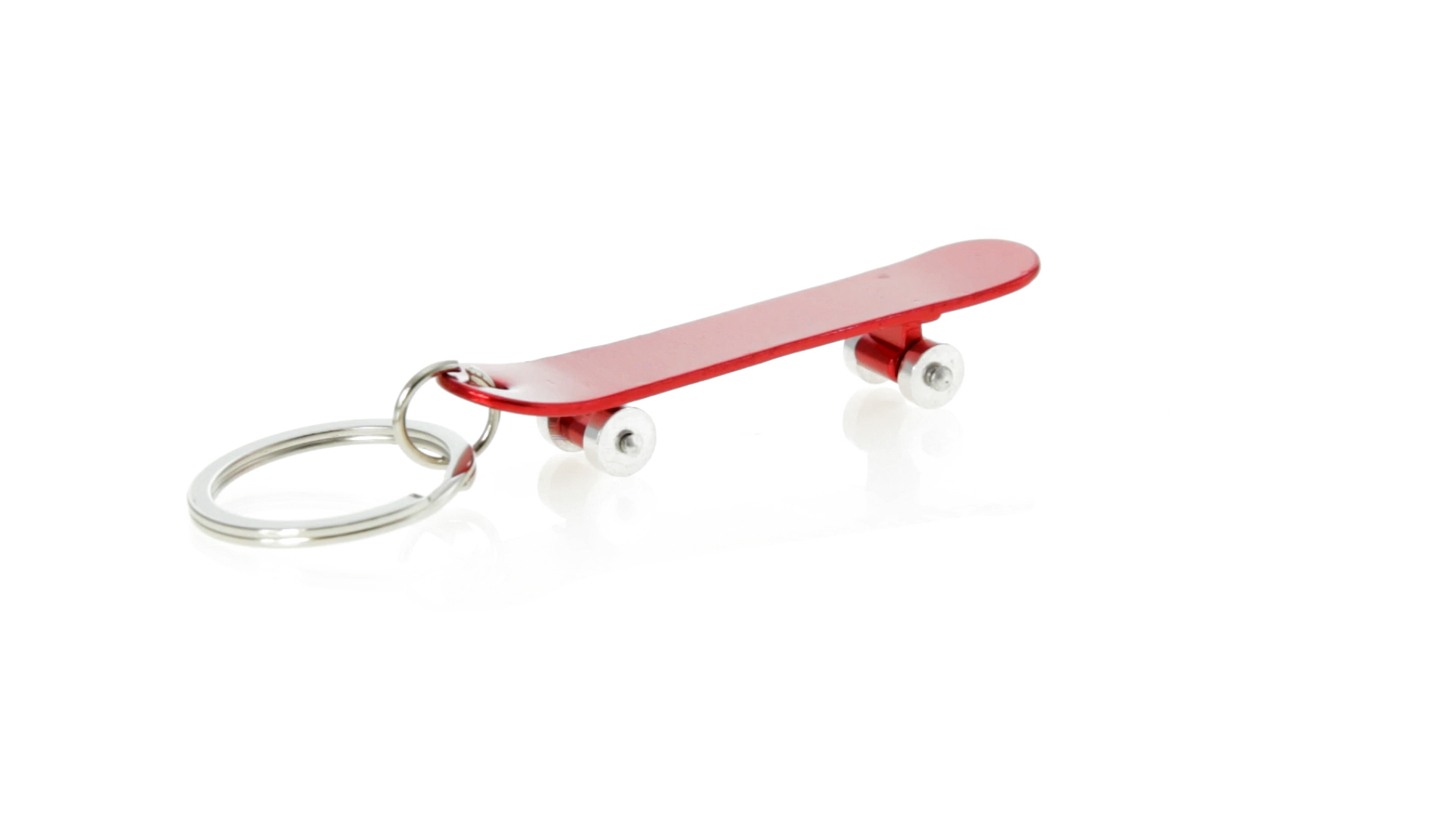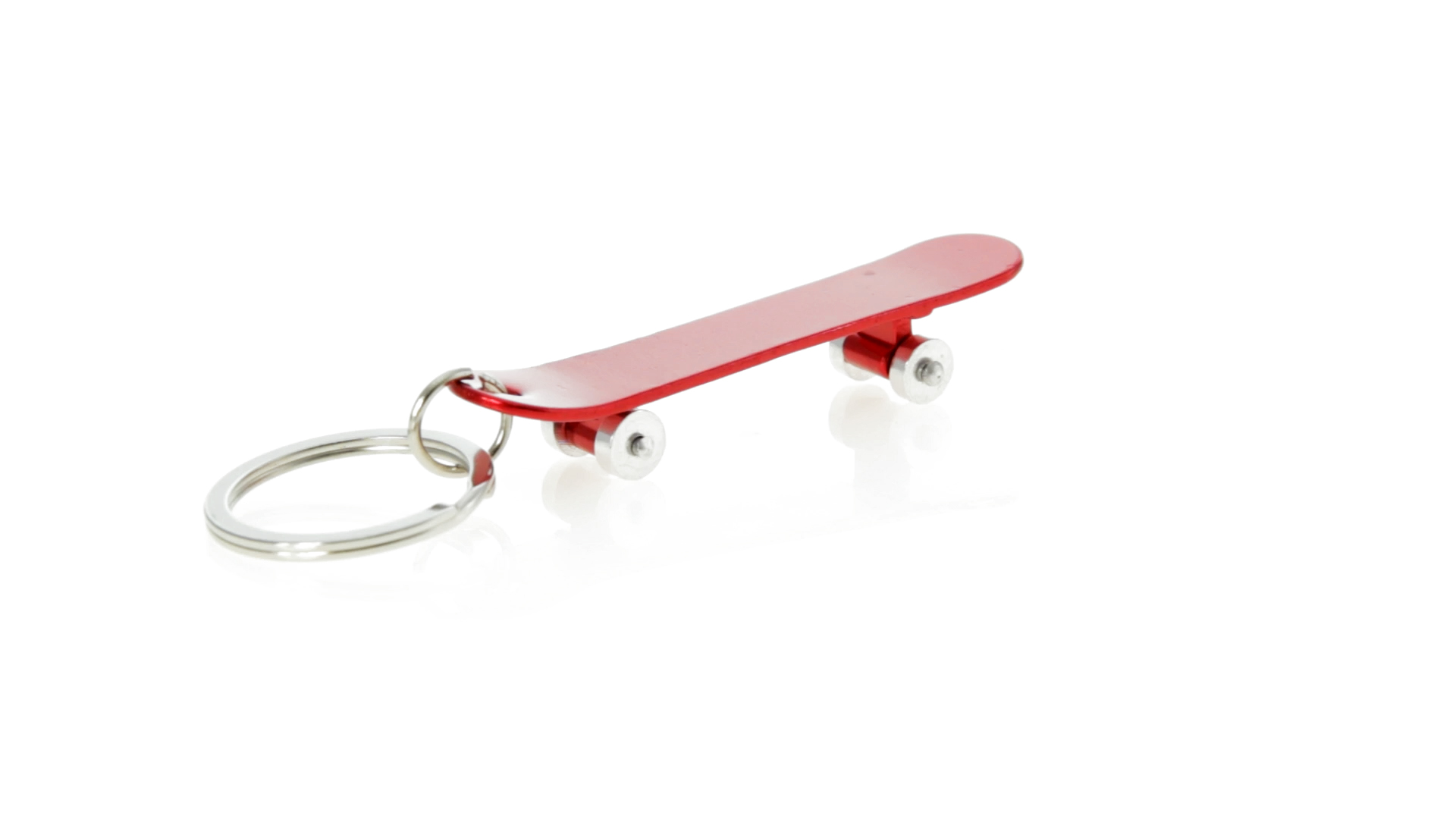 Origineller Schlüsselanhänger mit Flaschenöffner aus Aluminium in einer Vielzahl von leuchtenden Farben. Mit Skateboard-Design und sich drehenden Rädern.