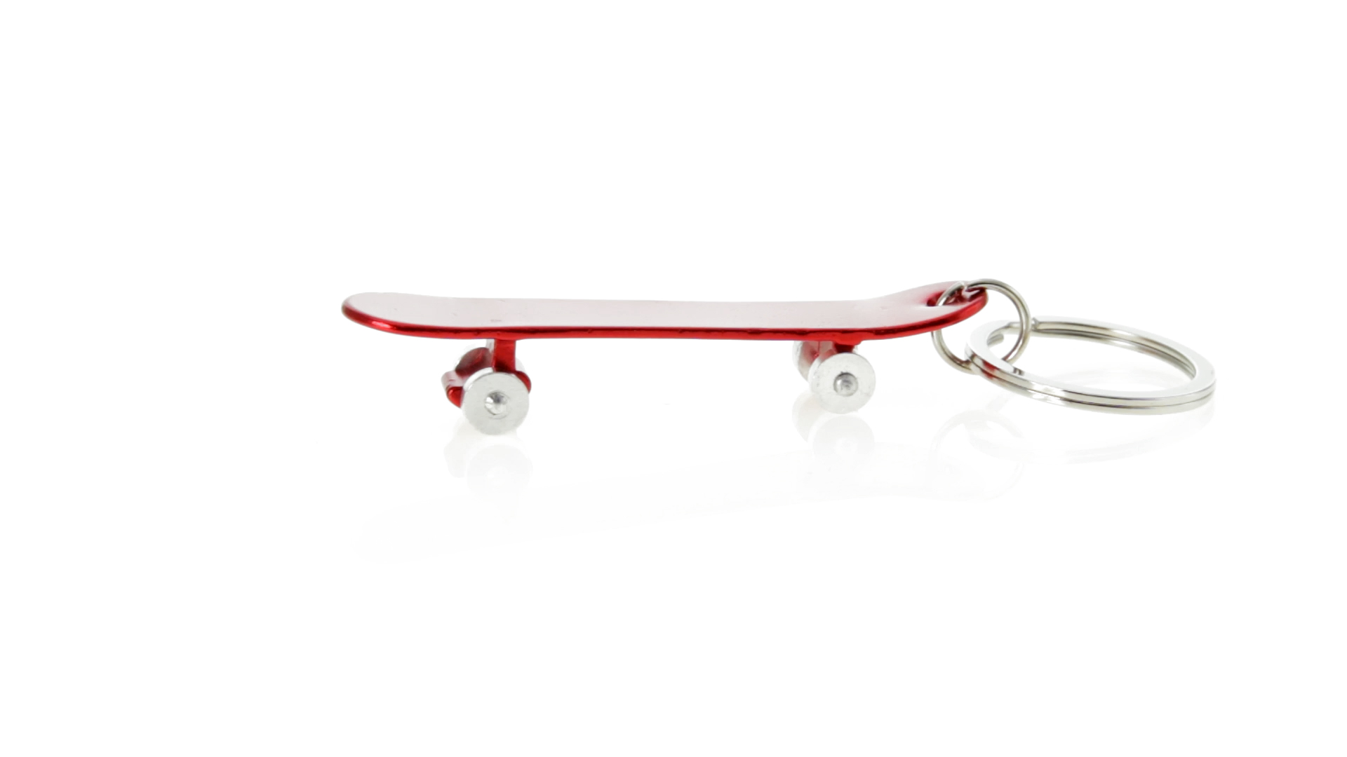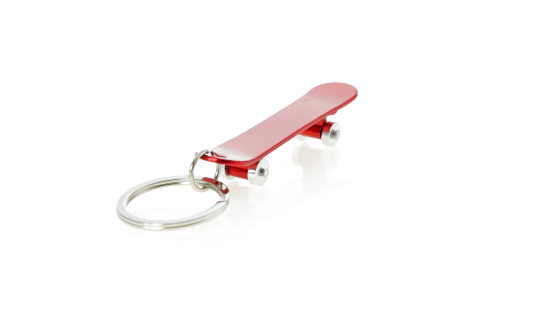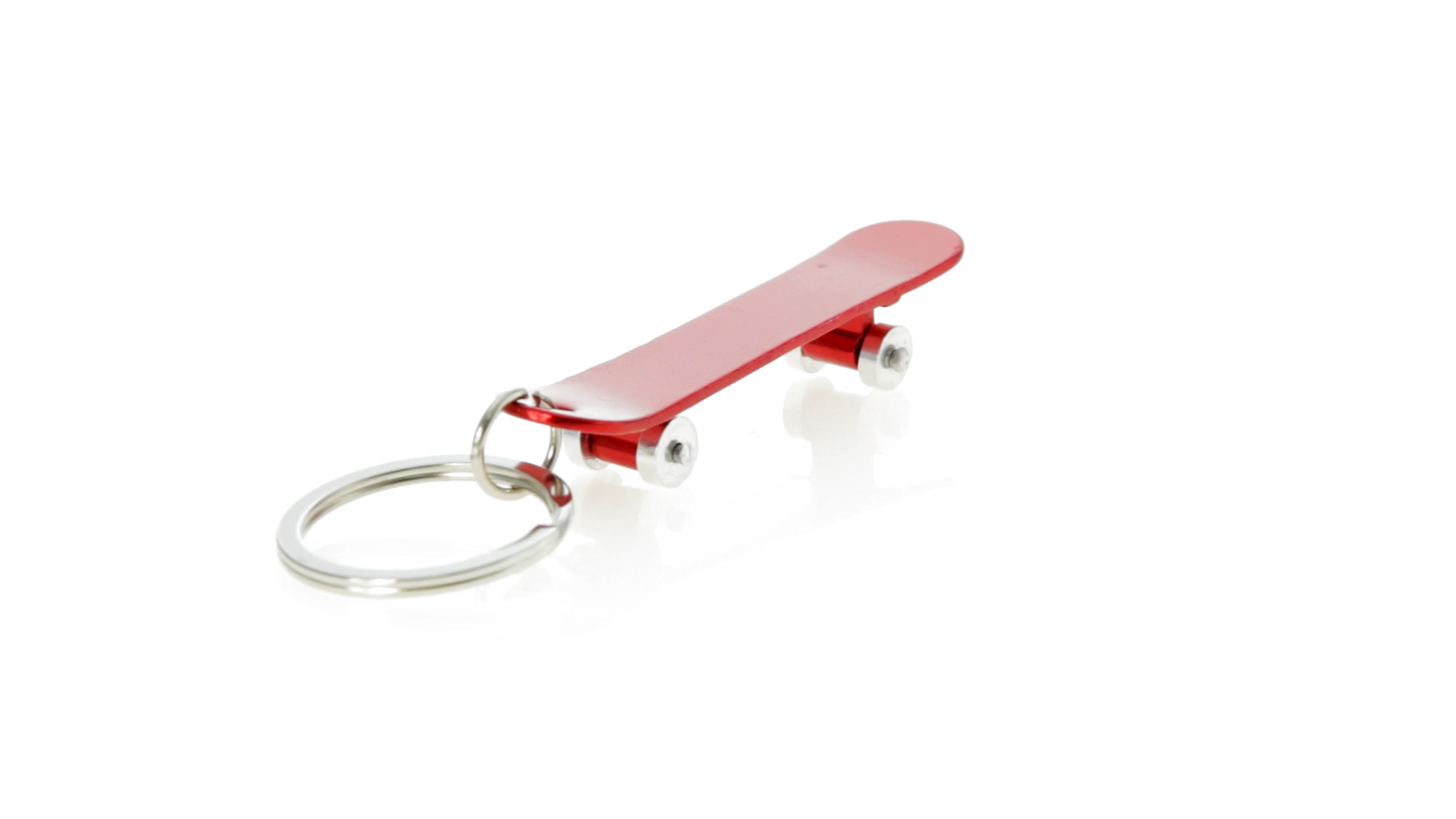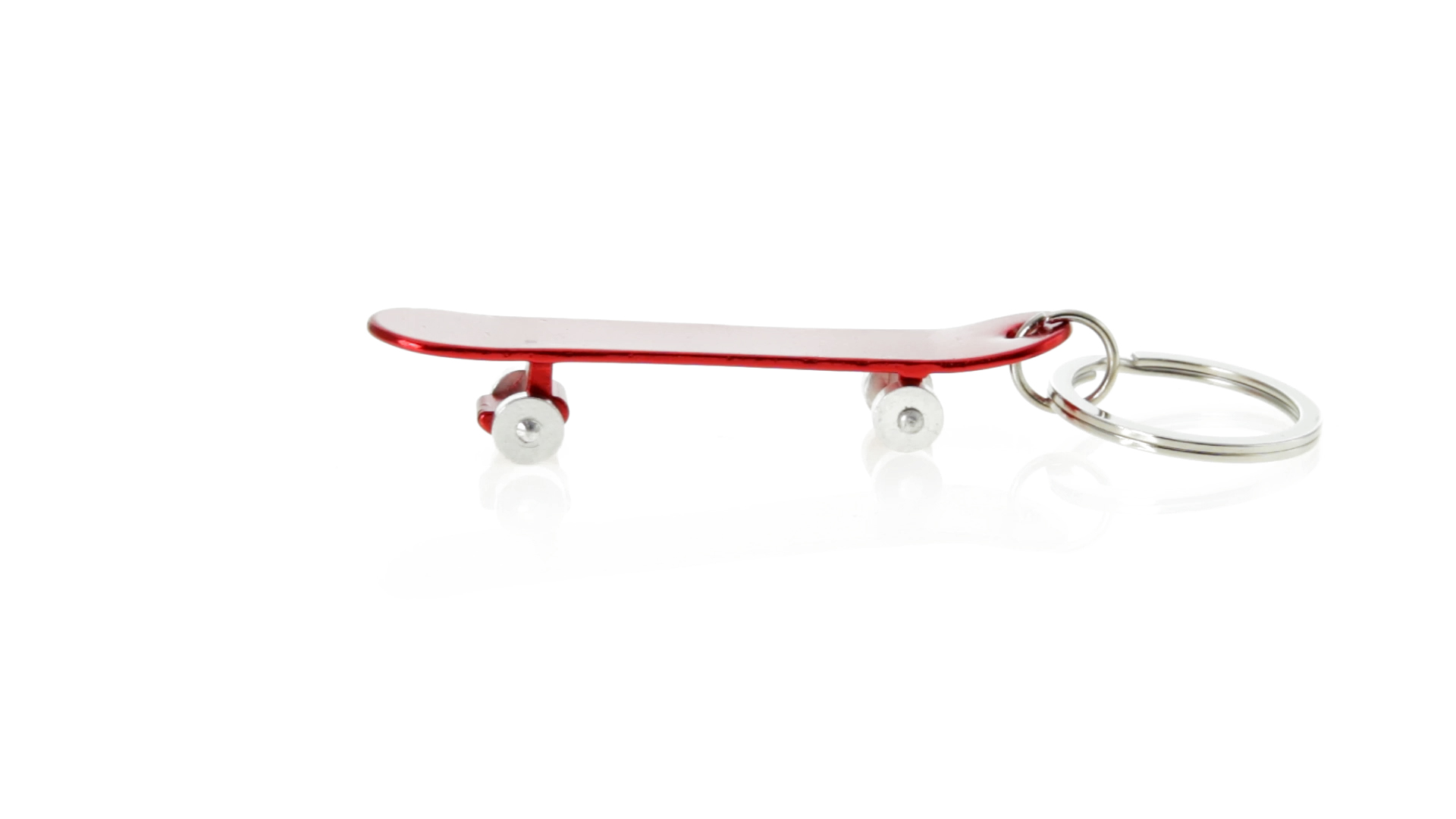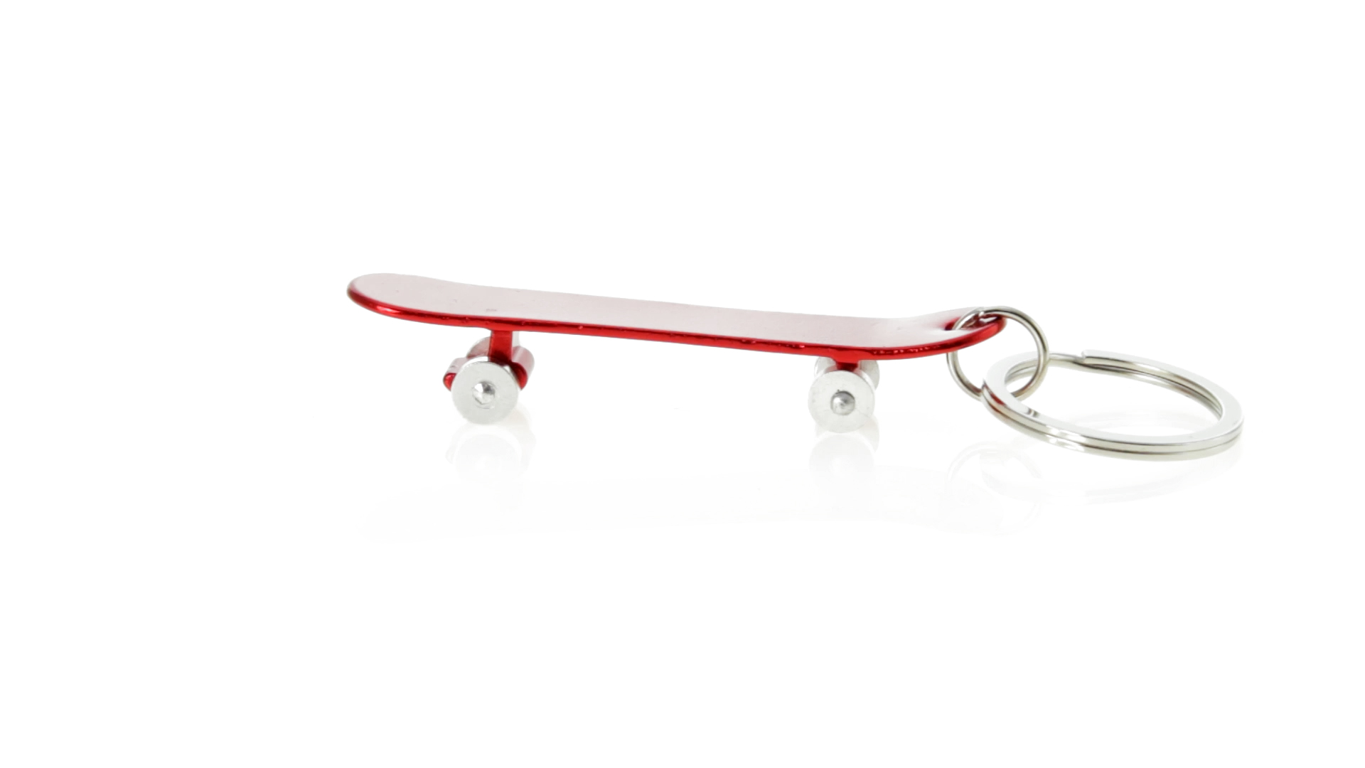 Origineller Schlüsselanhänger mit Flaschenöffner aus Aluminium in einer Vielzahl von leuchtenden Farben. Mit Skateboard-Design und sich drehenden Rädern.