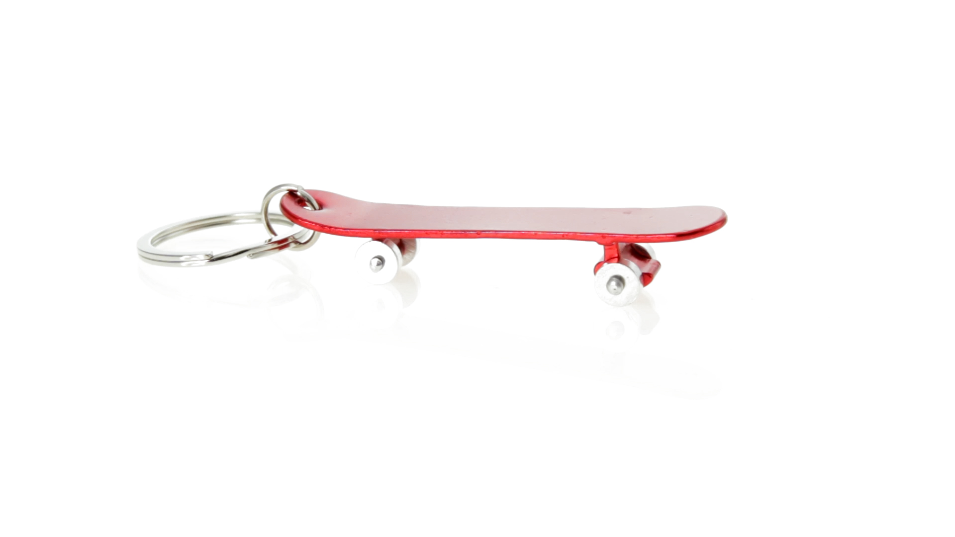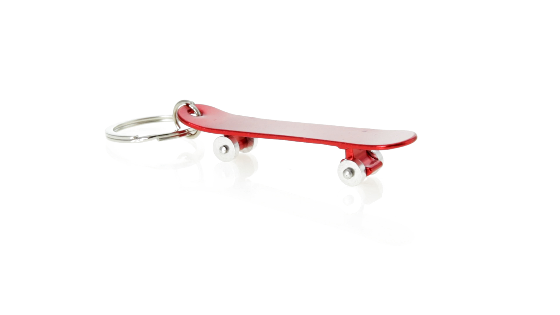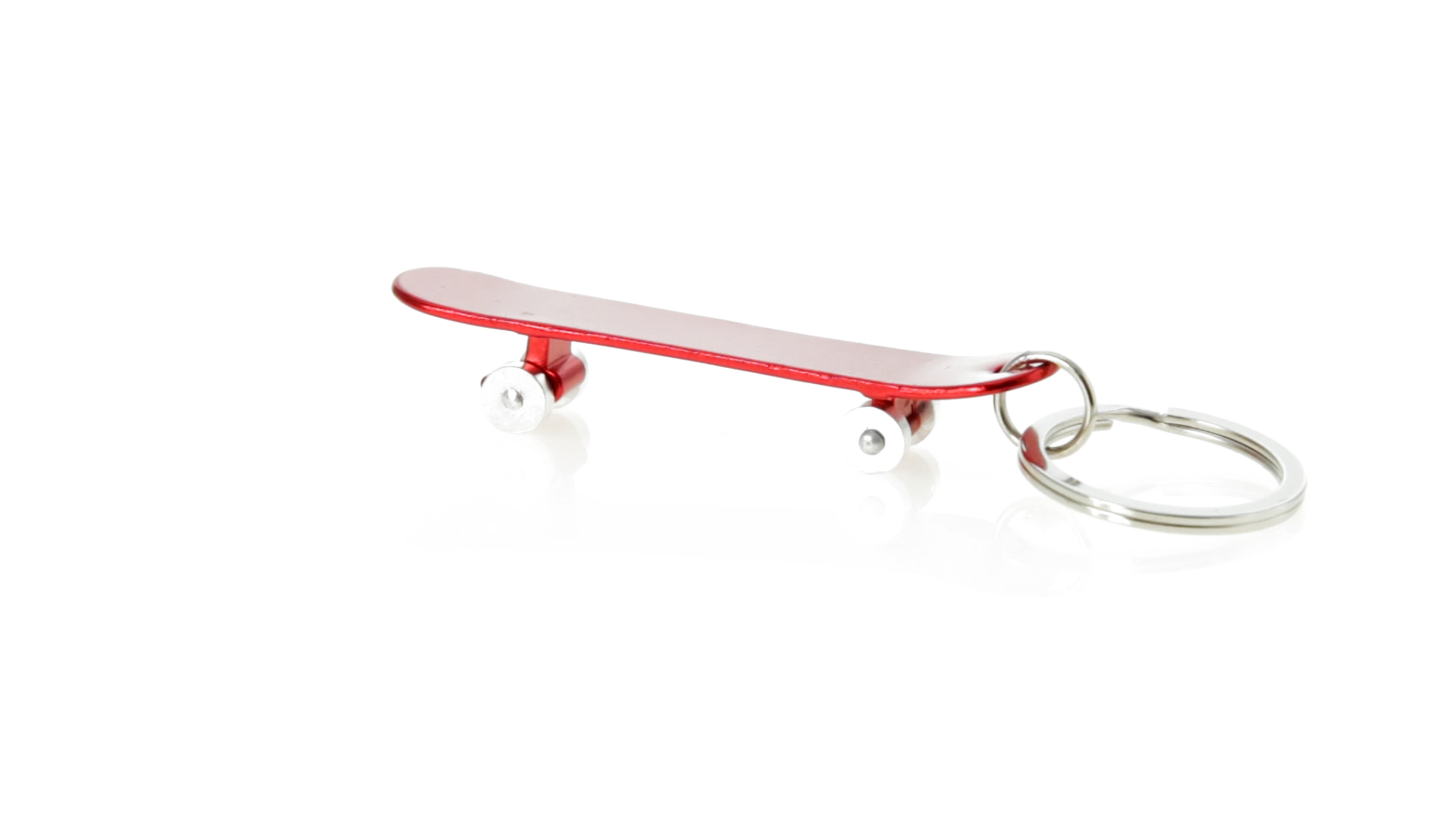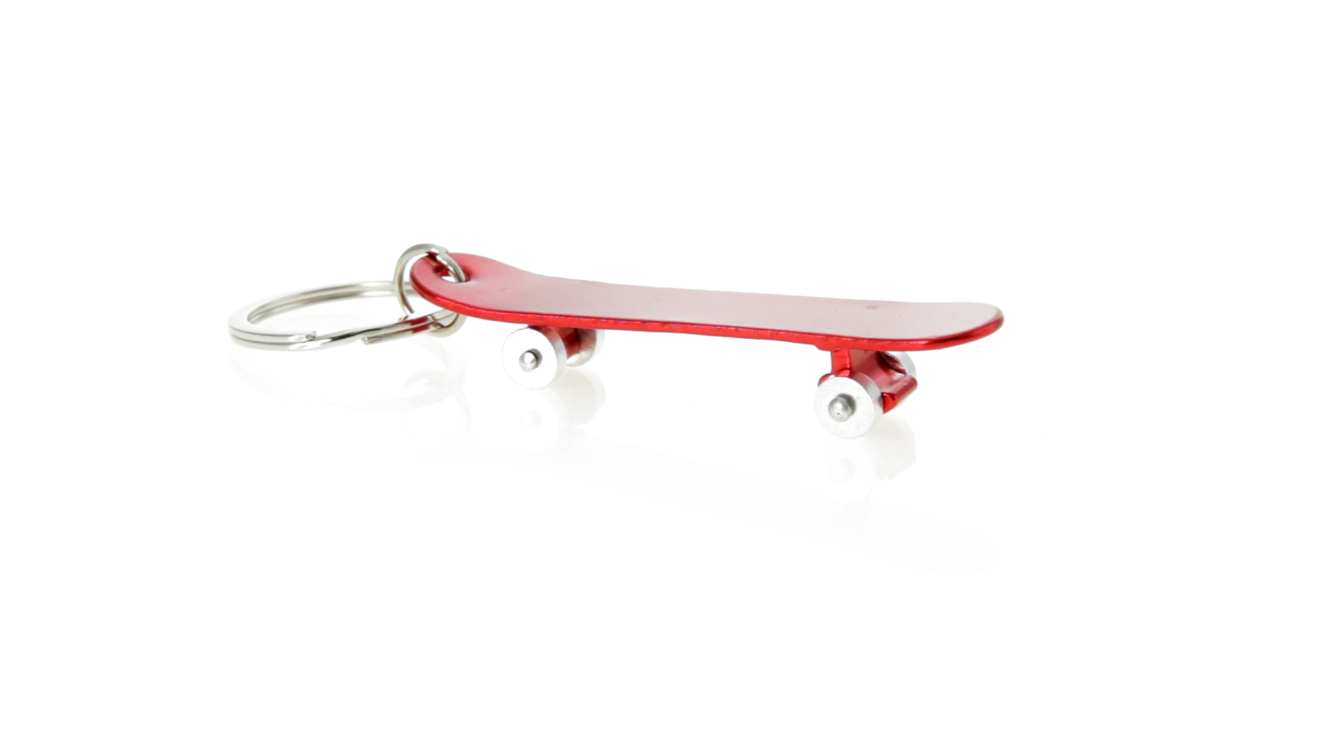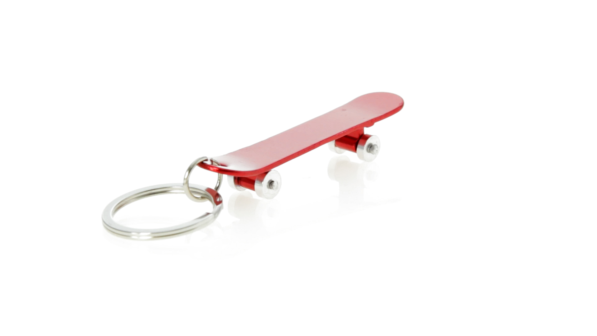 Origineller Schlüsselanhänger mit Flaschenöffner aus Aluminium in einer Vielzahl von leuchtenden Farben. Mit Skateboard-Design und sich drehenden Rädern.