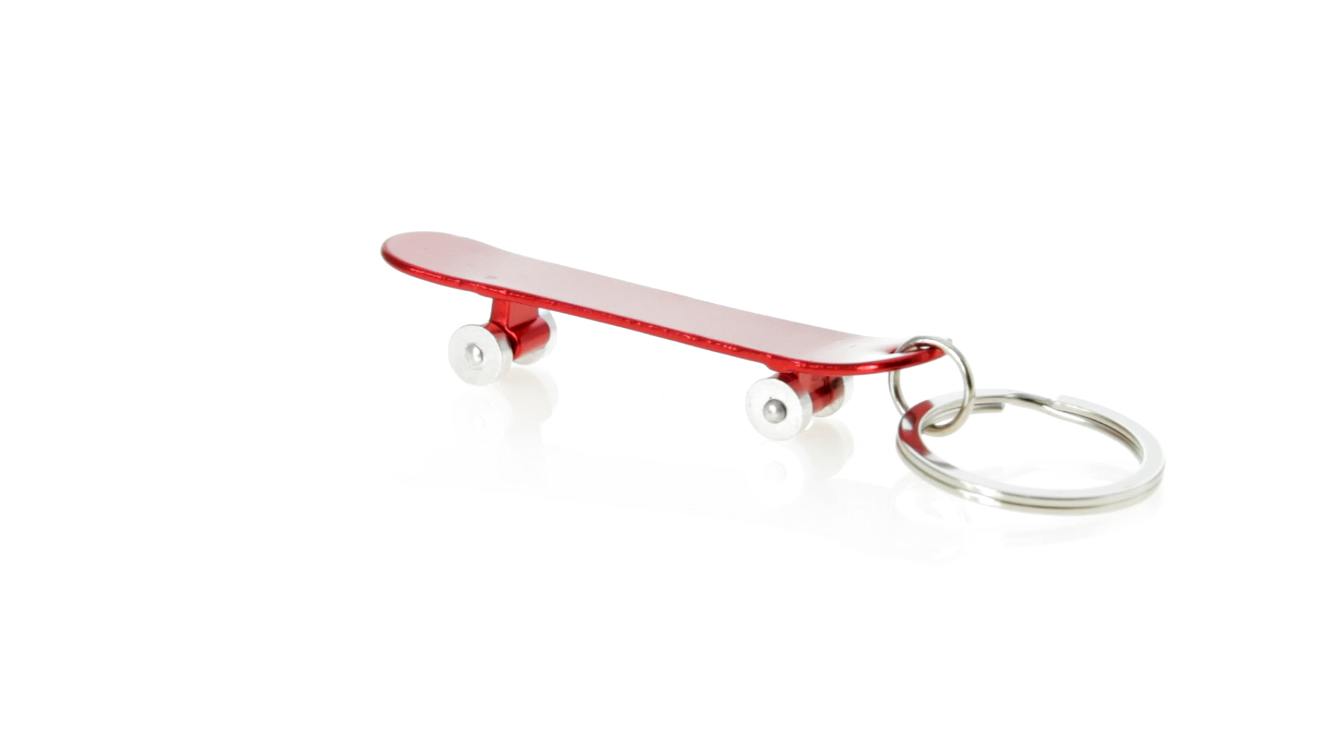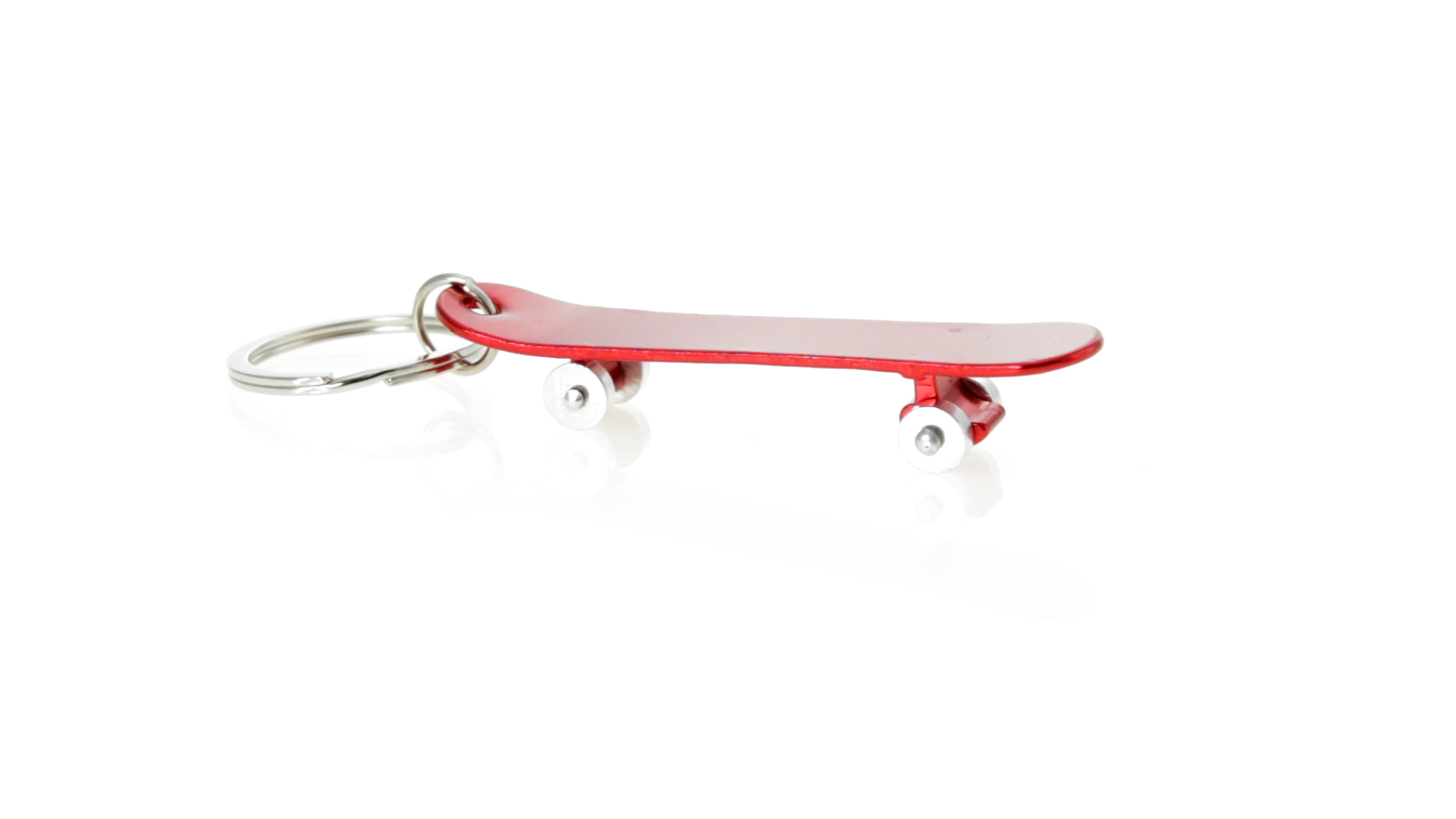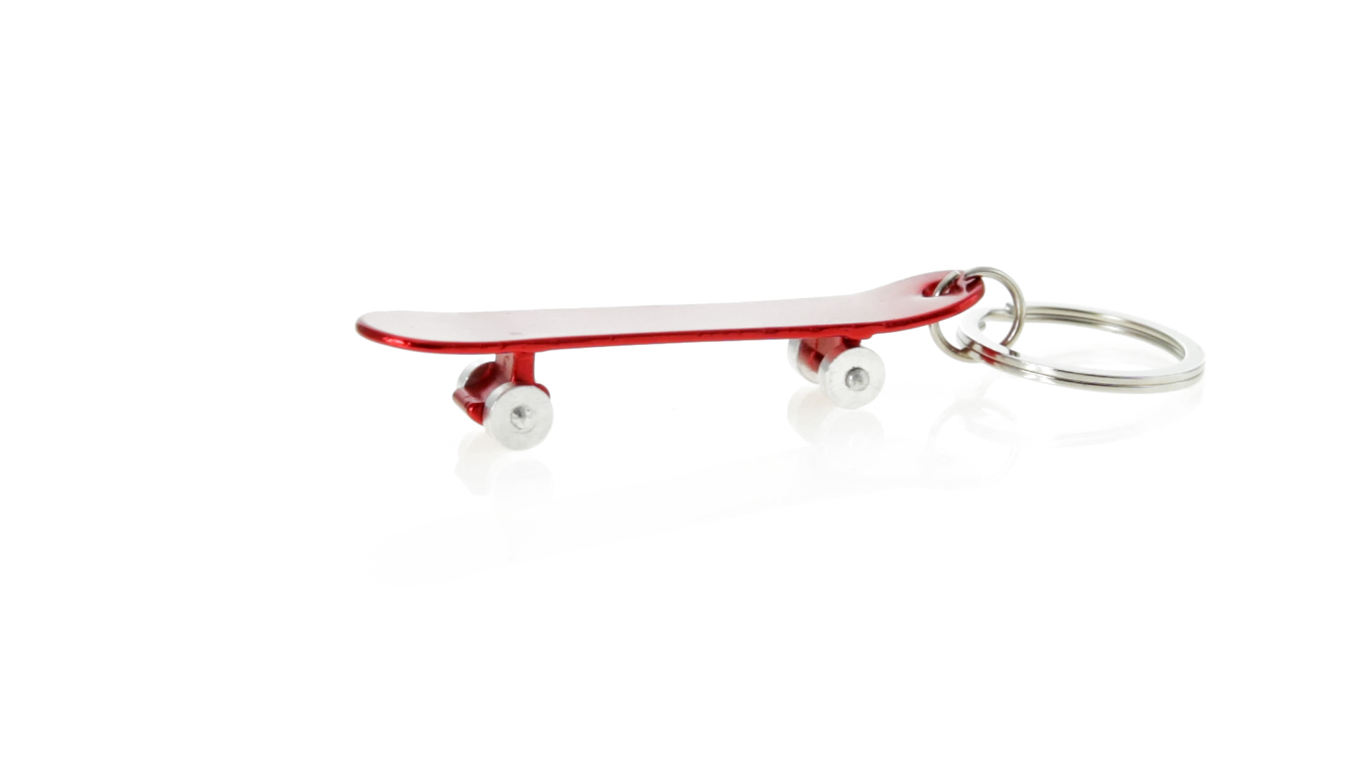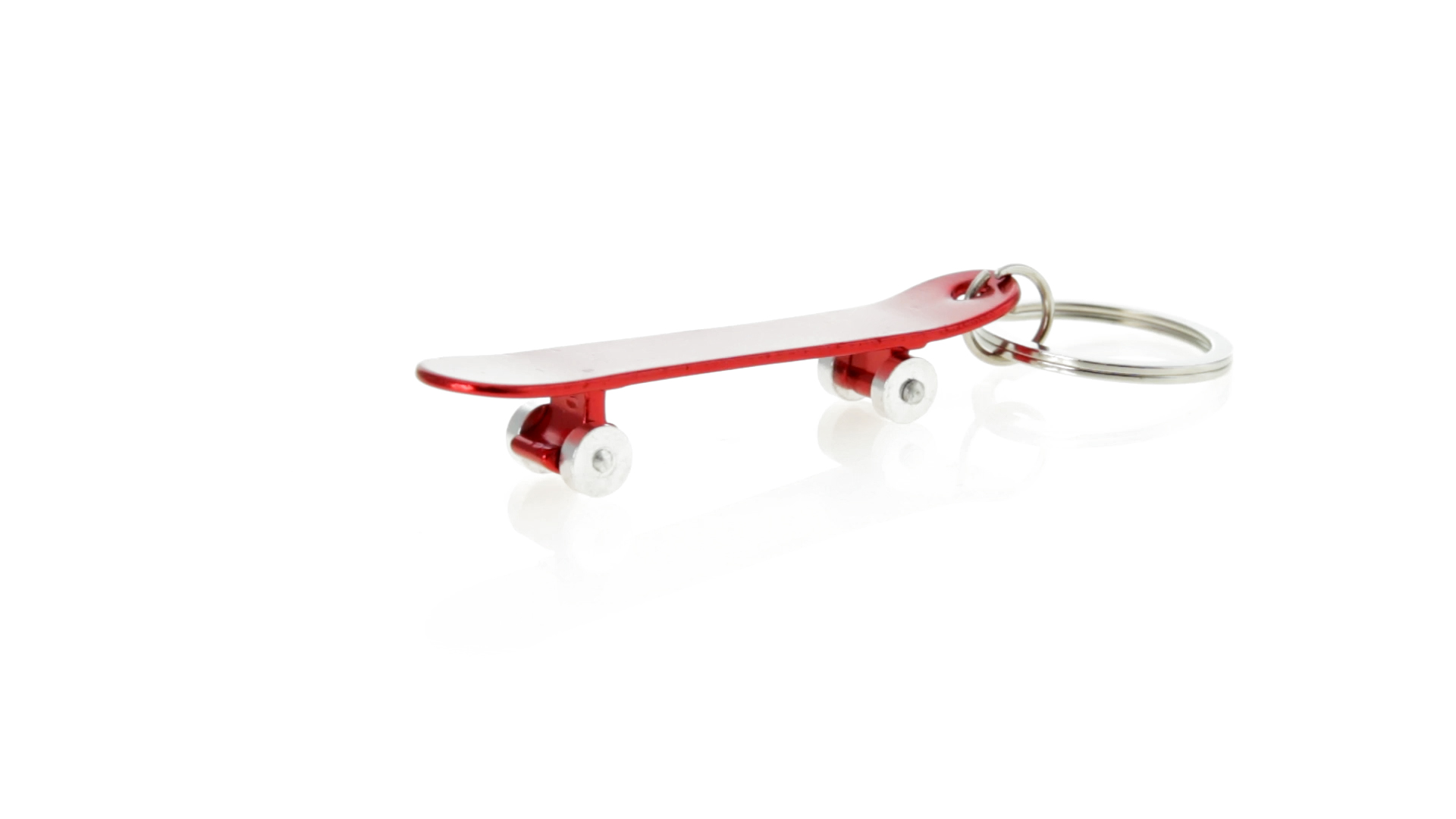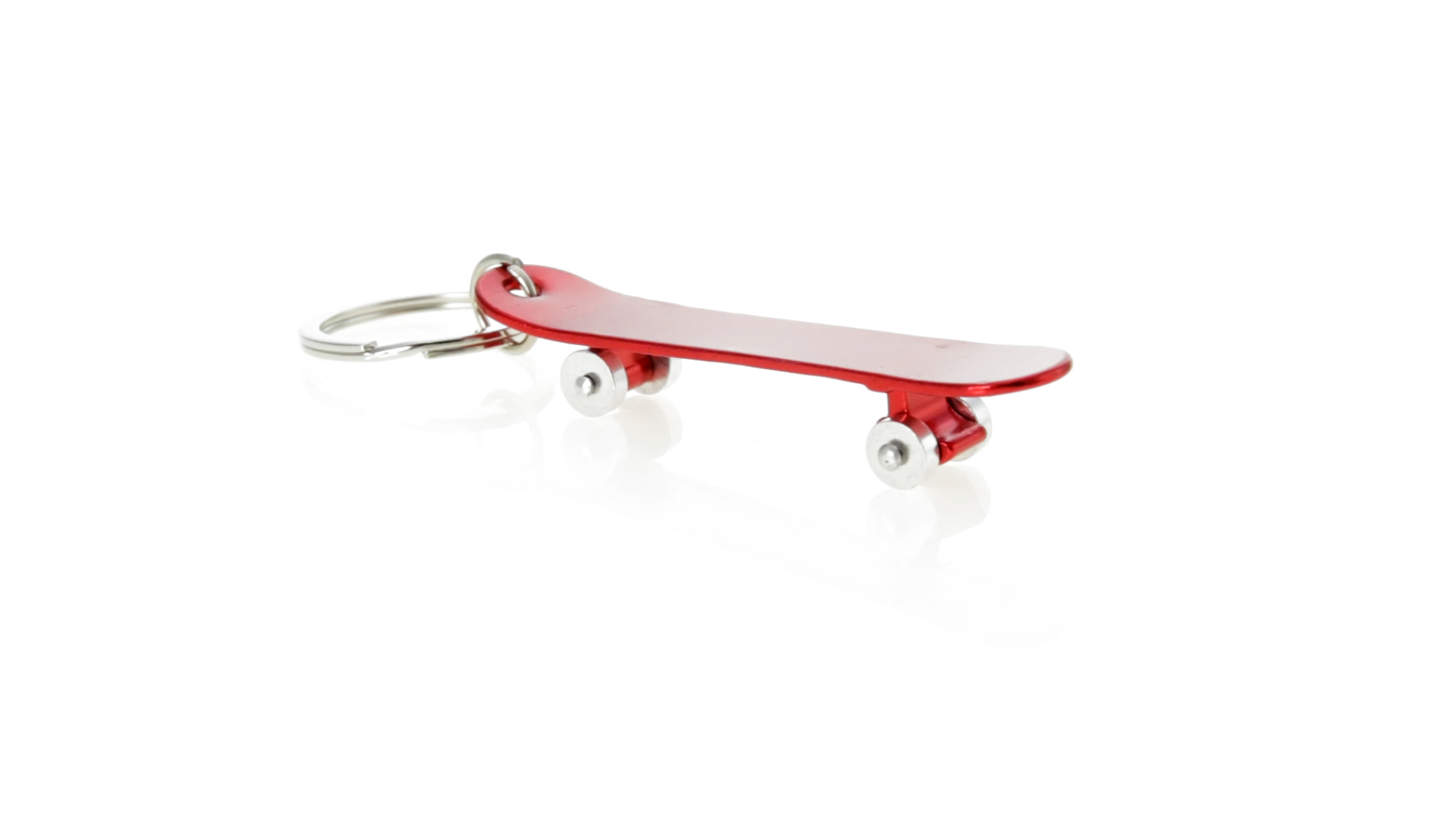 Origineller Schlüsselanhänger mit Flaschenöffner aus Aluminium in einer Vielzahl von leuchtenden Farben. Mit Skateboard-Design und sich drehenden Rädern.