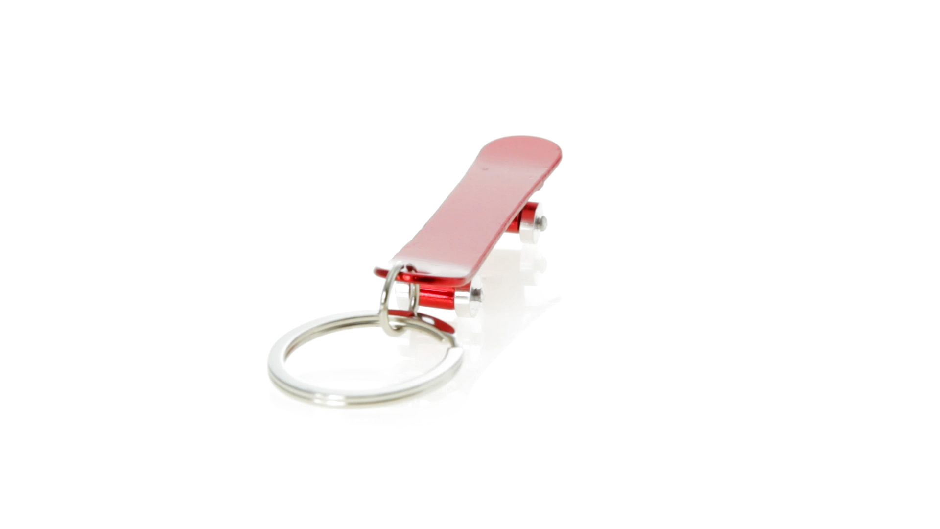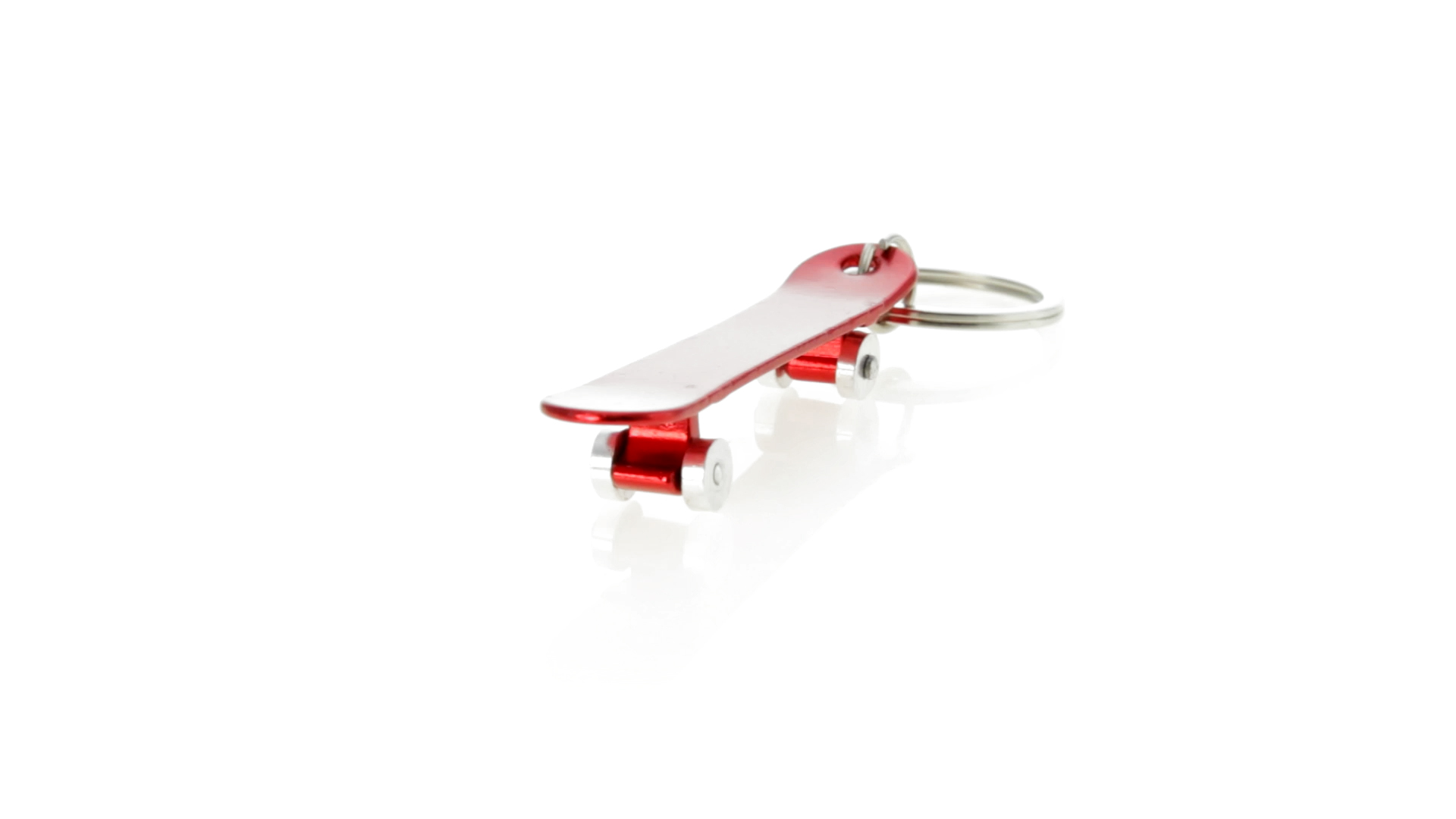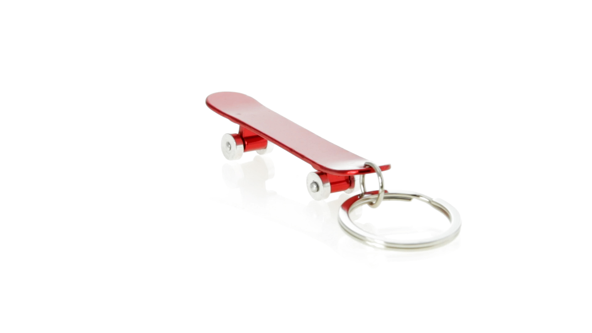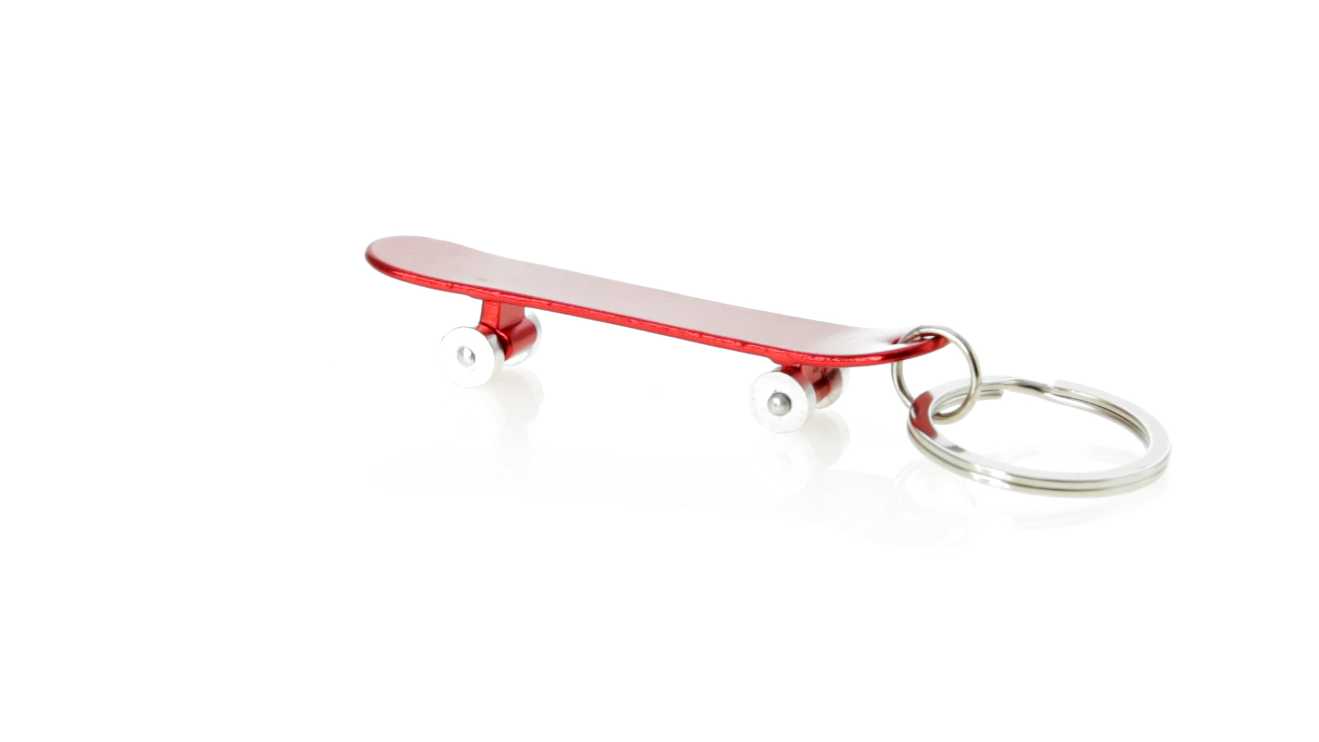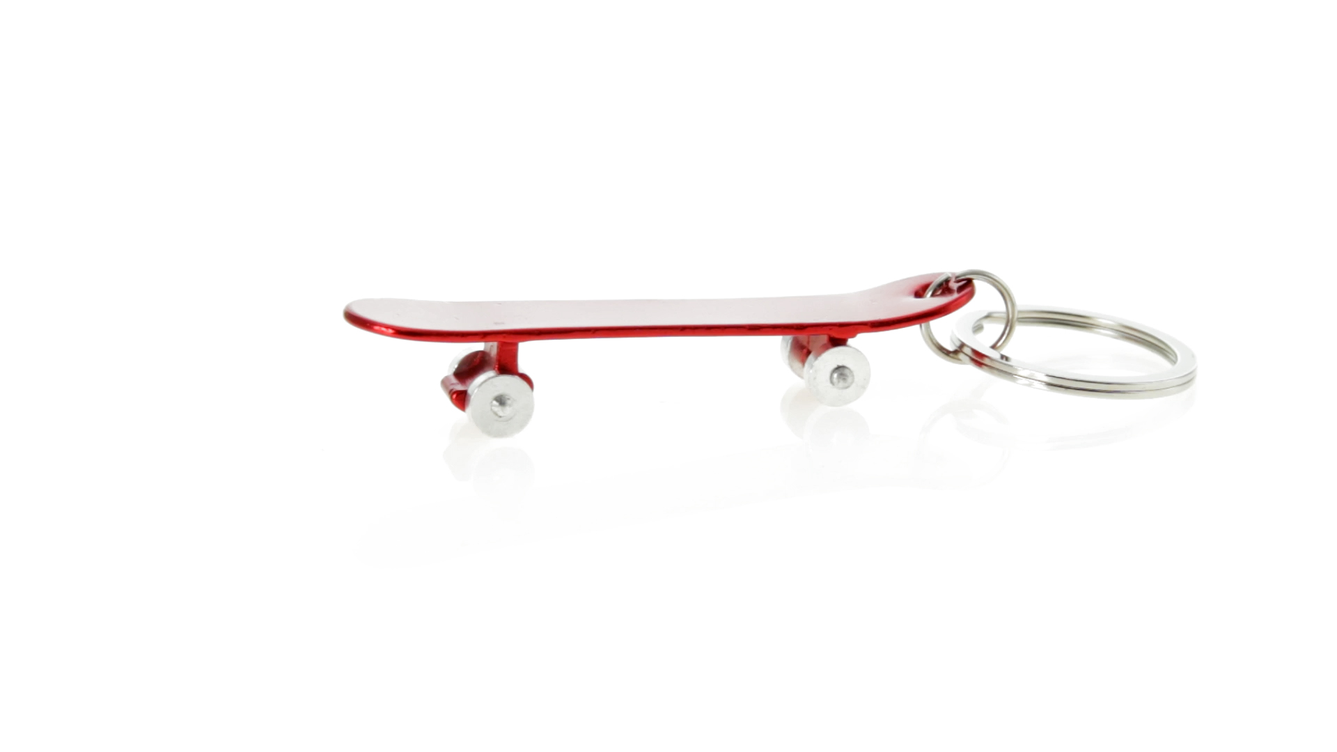 Origineller Schlüsselanhänger mit Flaschenöffner aus Aluminium in einer Vielzahl von leuchtenden Farben. Mit Skateboard-Design und sich drehenden Rädern.