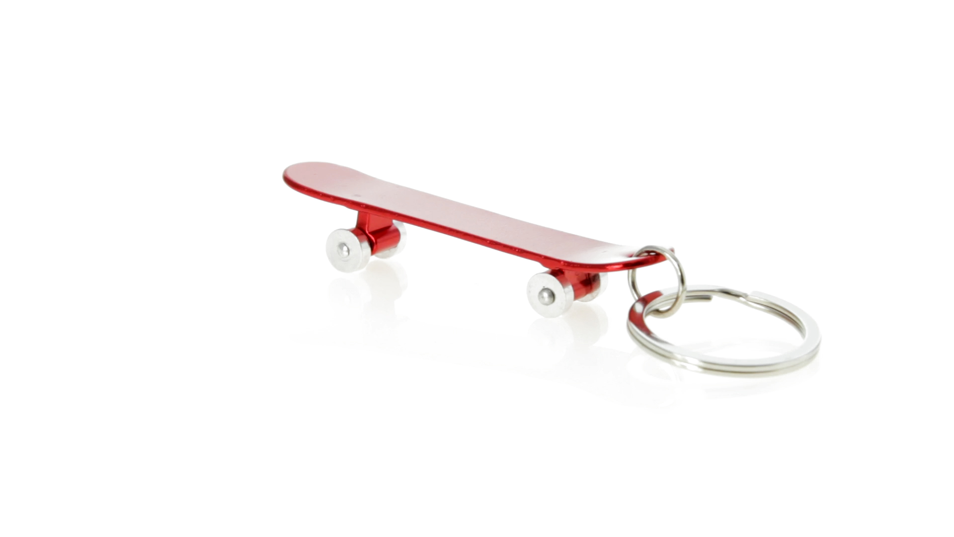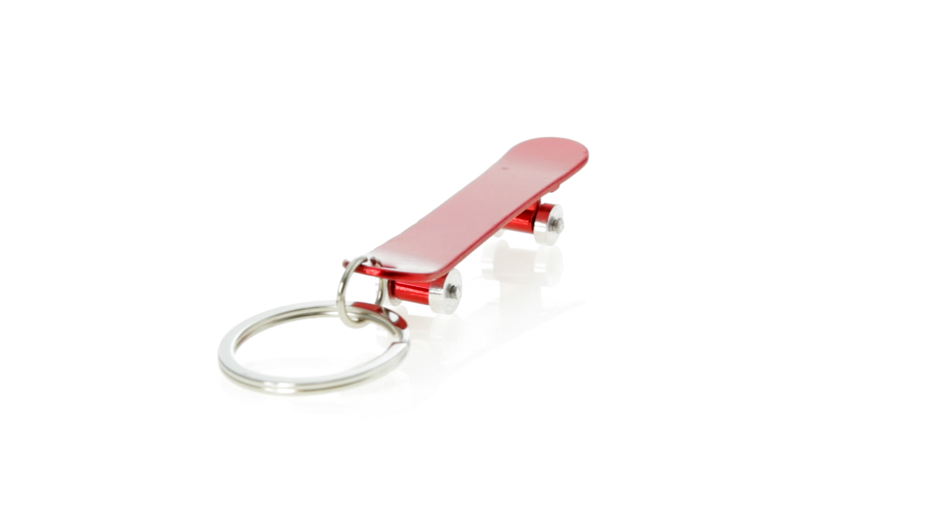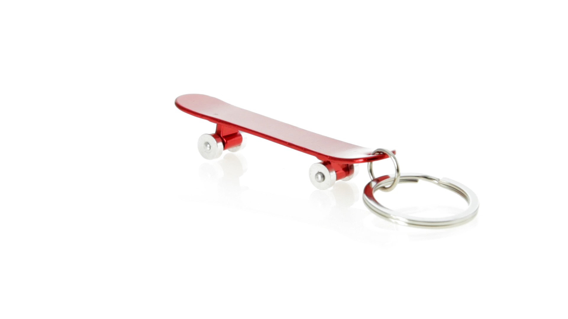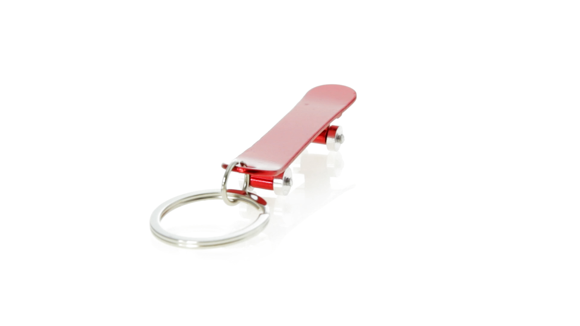Origineller Schlüsselanhänger mit Flaschenöffner aus Aluminium in einer Vielzahl von leuchtenden Farben. Mit Skateboard-Design und sich drehenden Rädern.