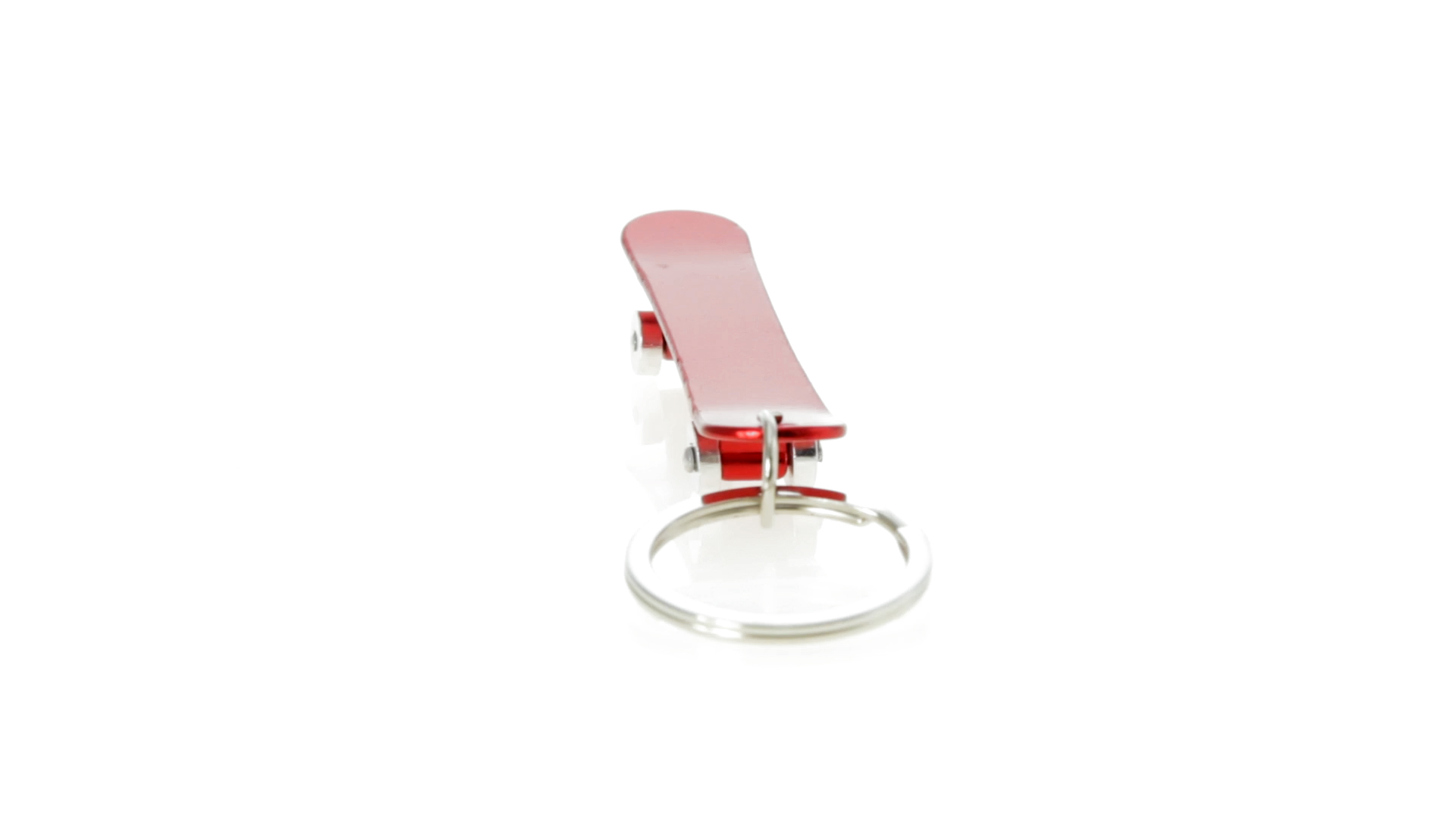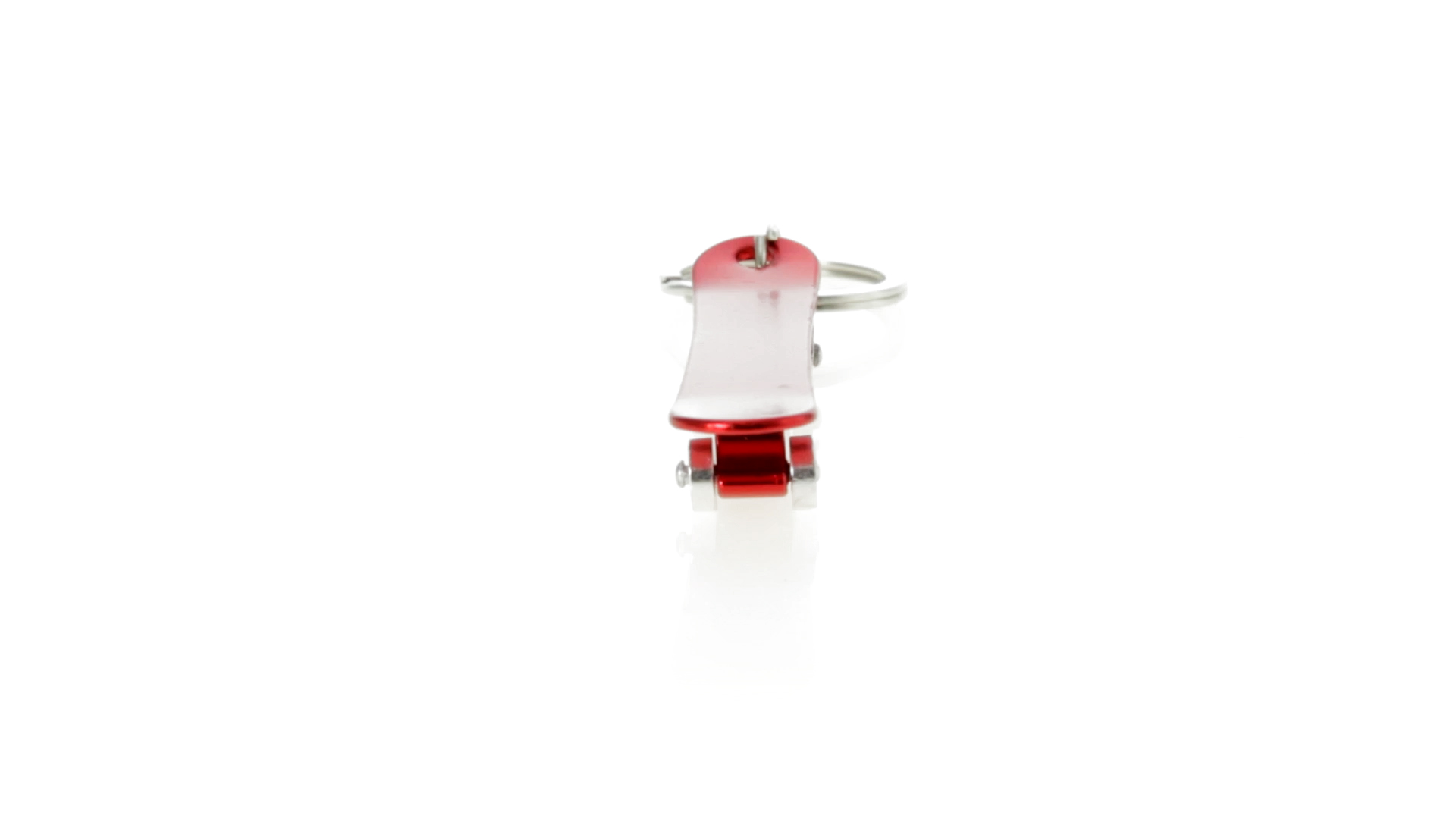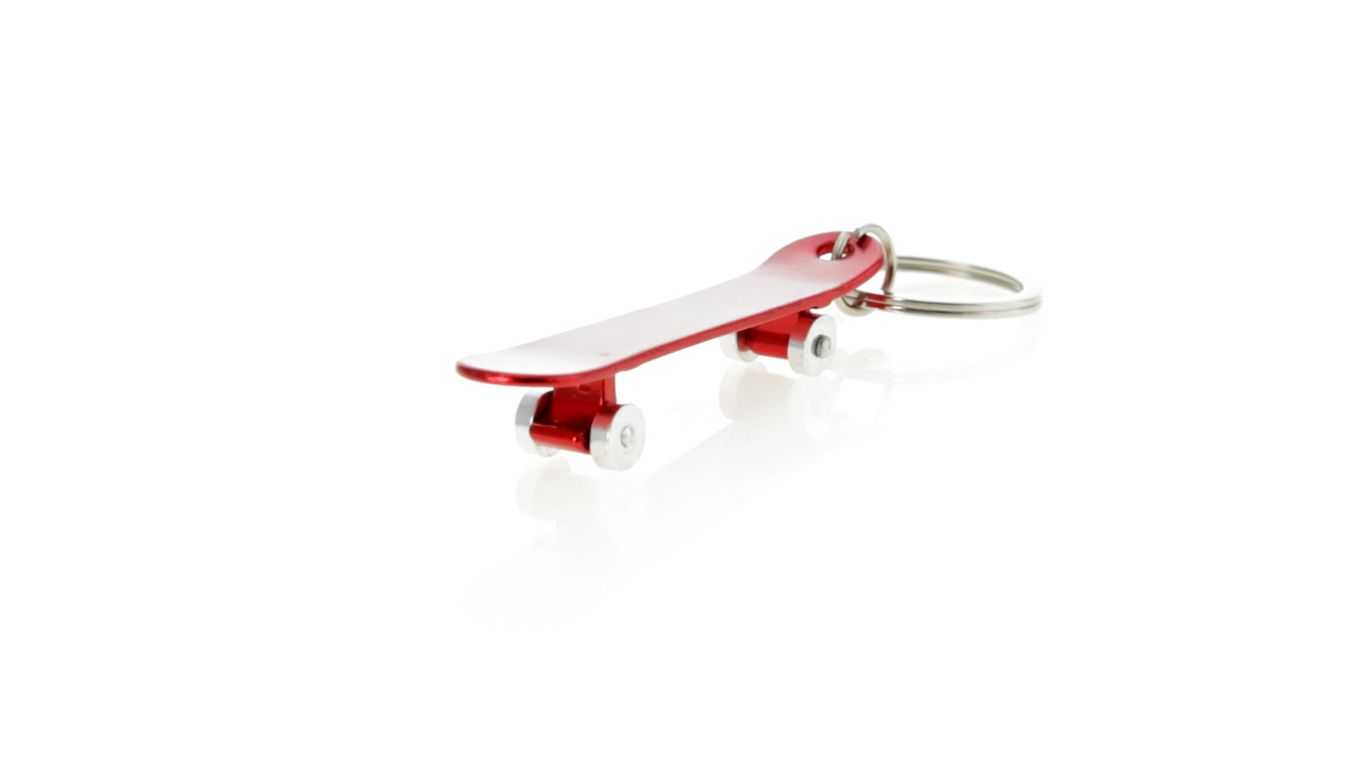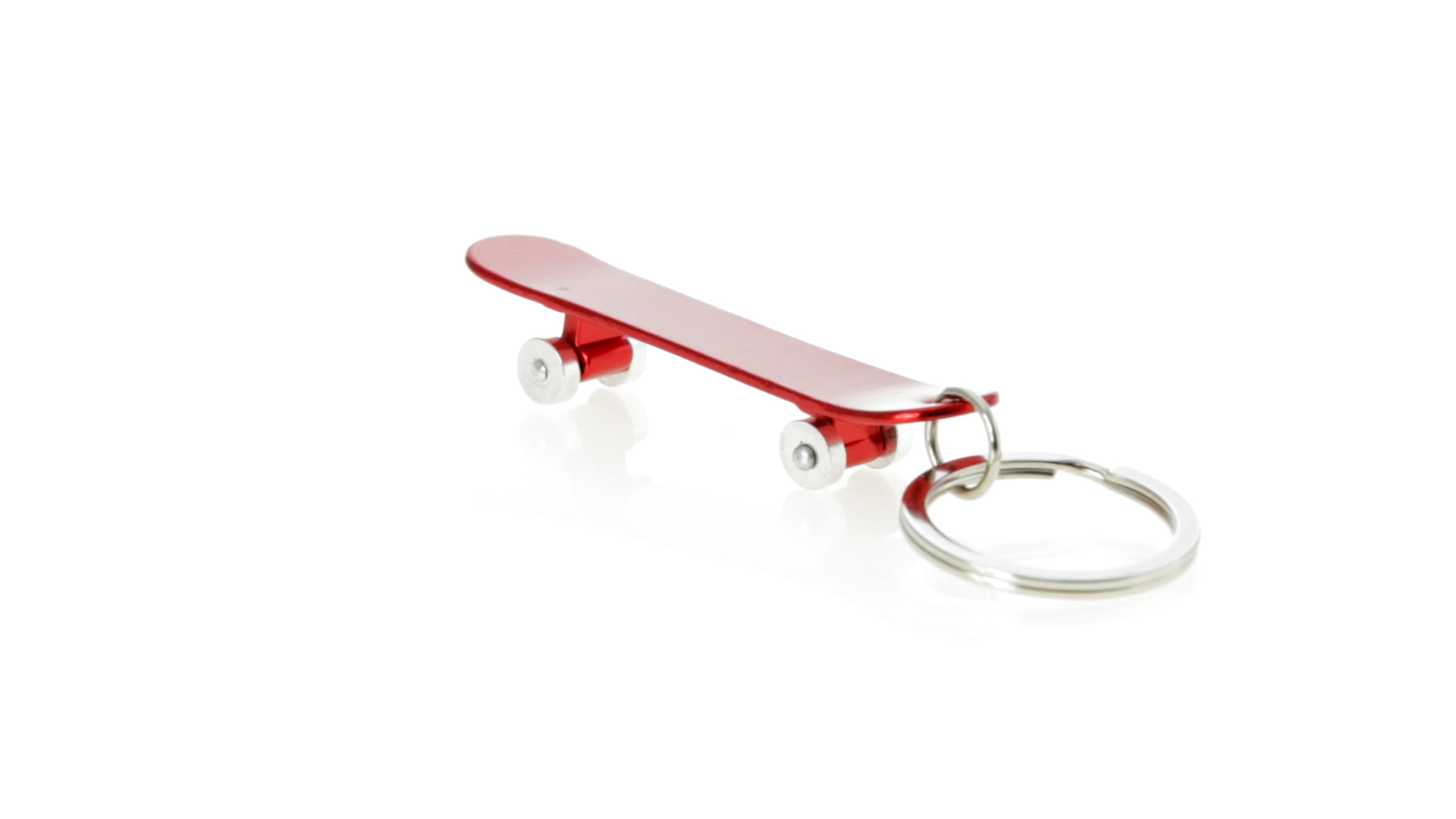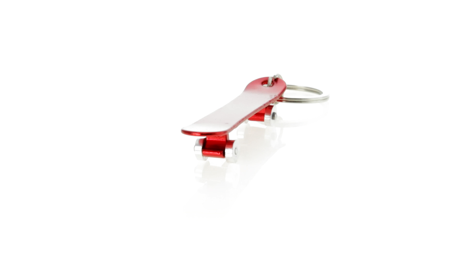Origineller Schlüsselanhänger mit Flaschenöffner aus Aluminium in einer Vielzahl von leuchtenden Farben. Mit Skateboard-Design und sich drehenden Rädern.
