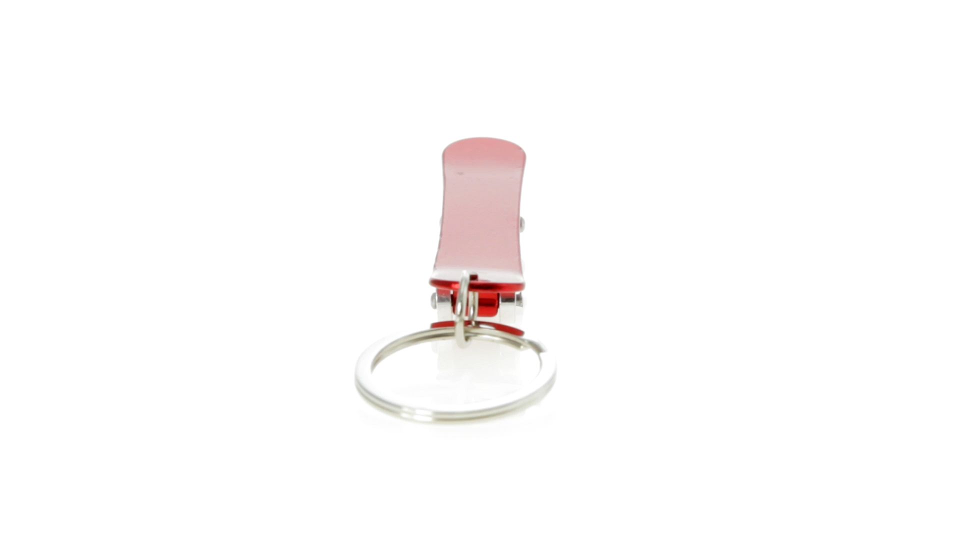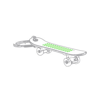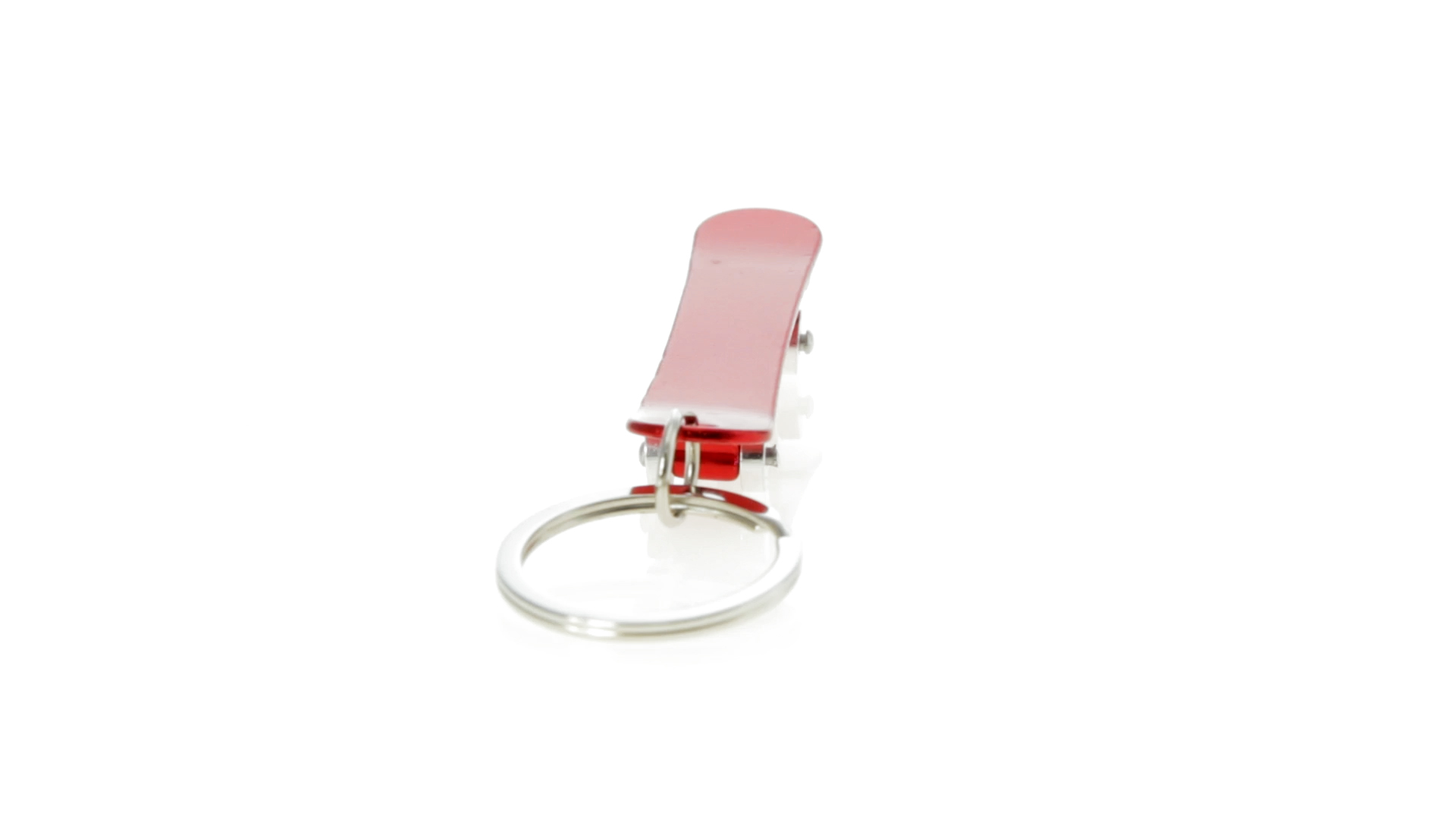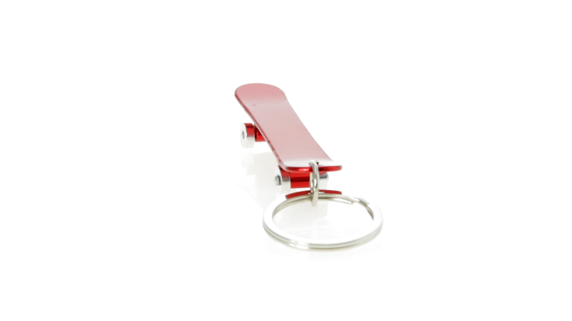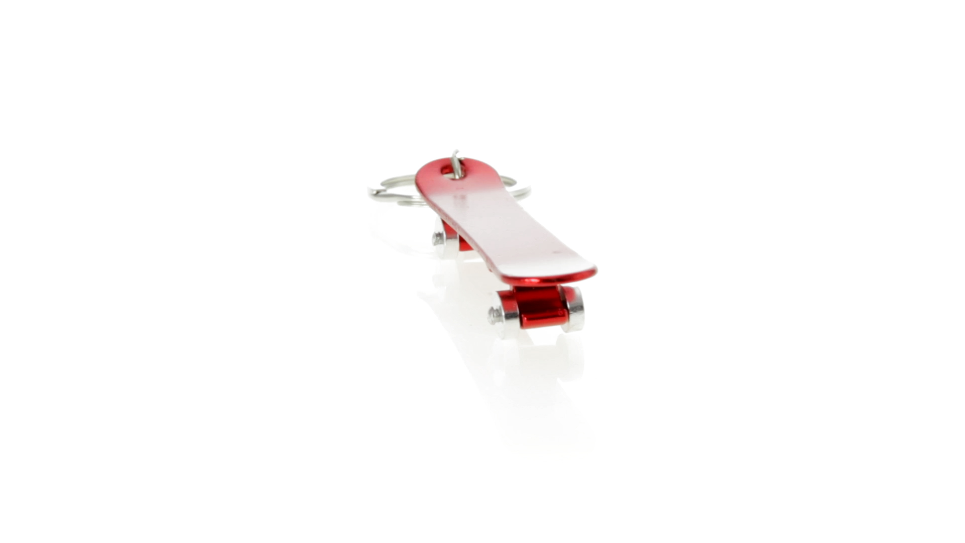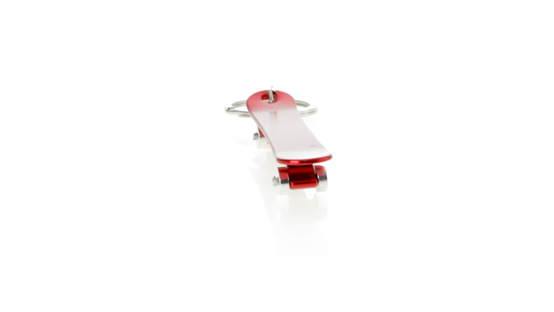 Origineller Schlüsselanhänger mit Flaschenöffner aus Aluminium in einer Vielzahl von leuchtenden Farben. Mit Skateboard-Design und sich drehenden Rädern.