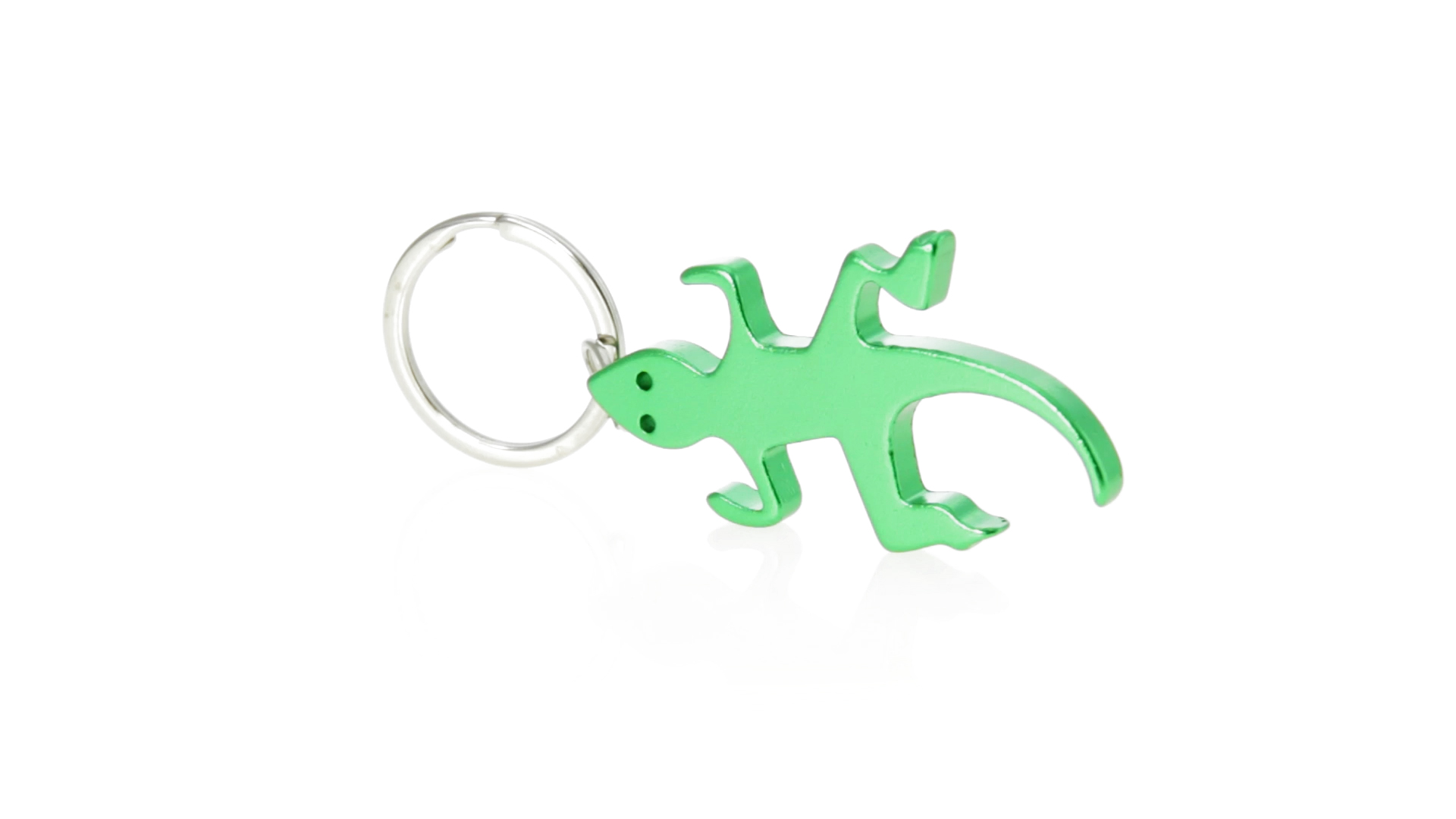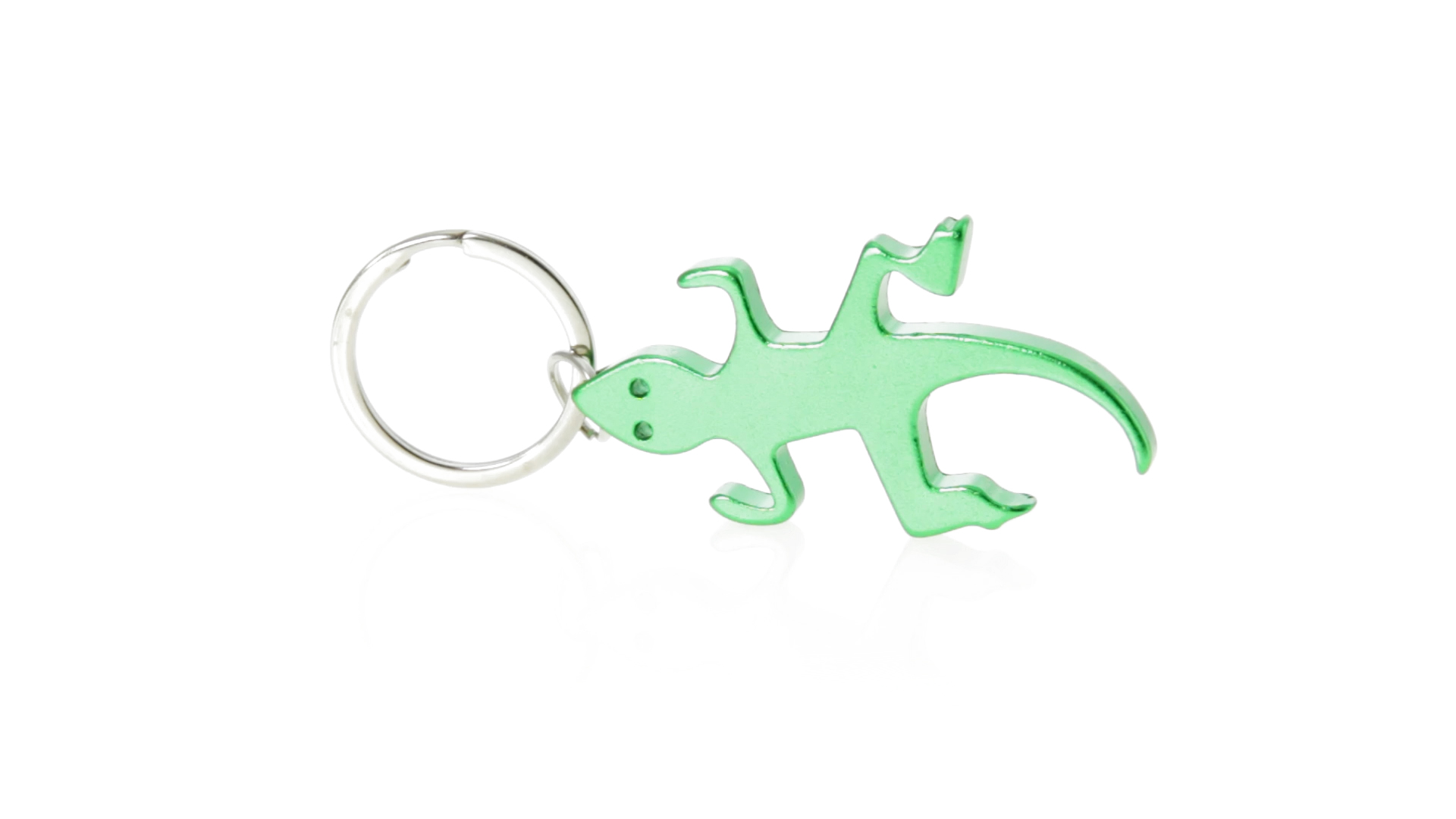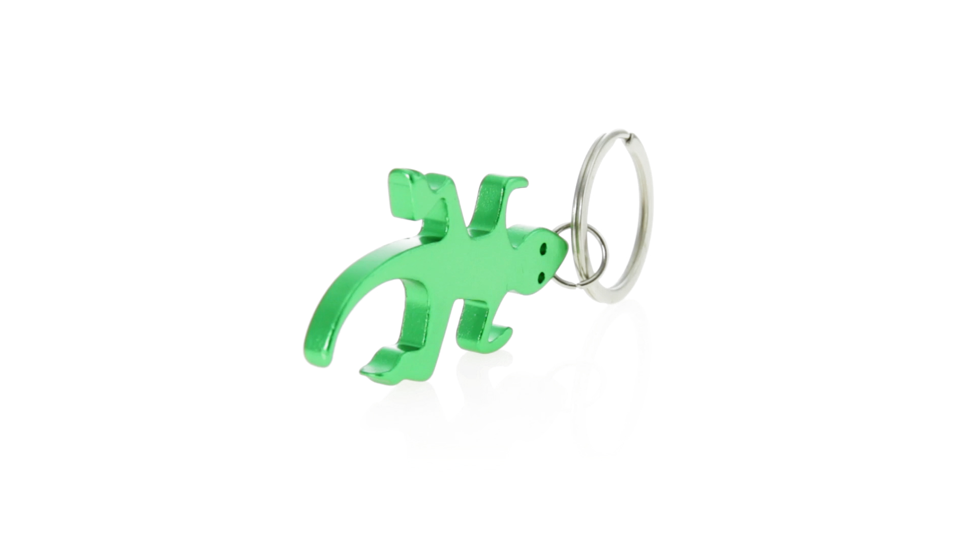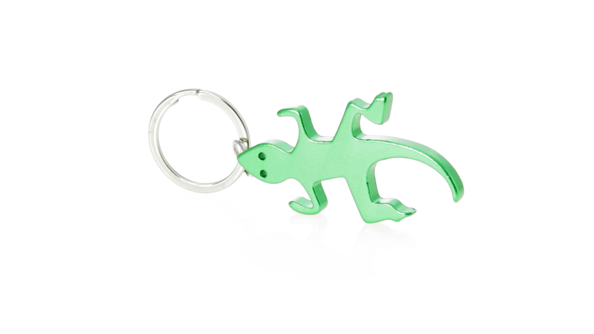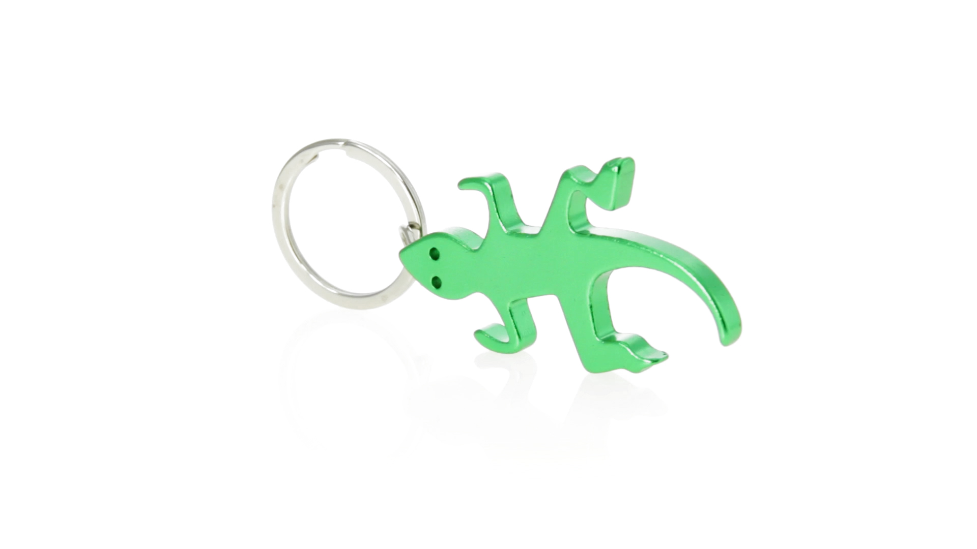 Origineller Salamander-Schlüsselanhänger mit Flaschenöffner aus Aluminium in einer Vielzahl von lebendigen Farben.