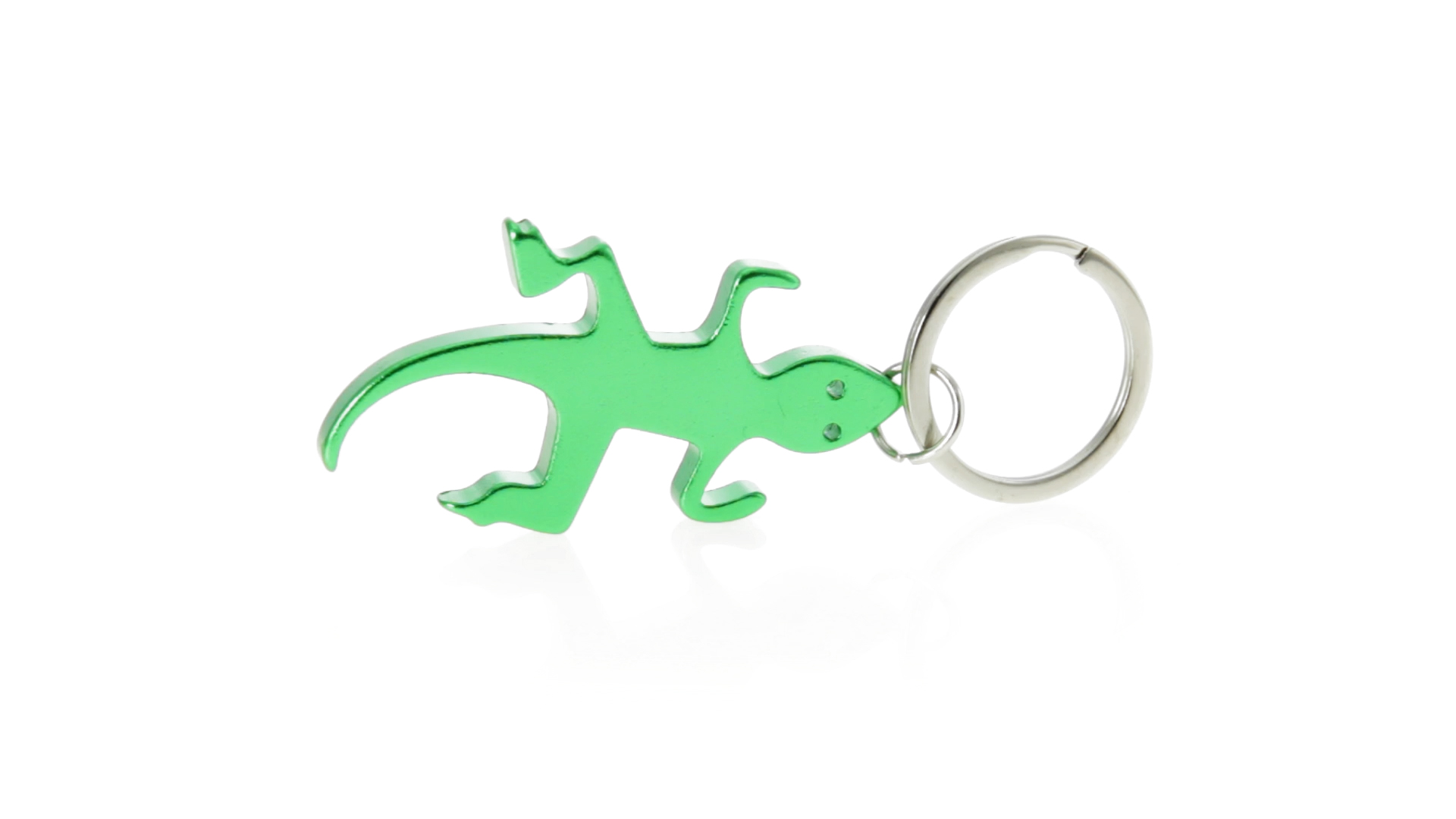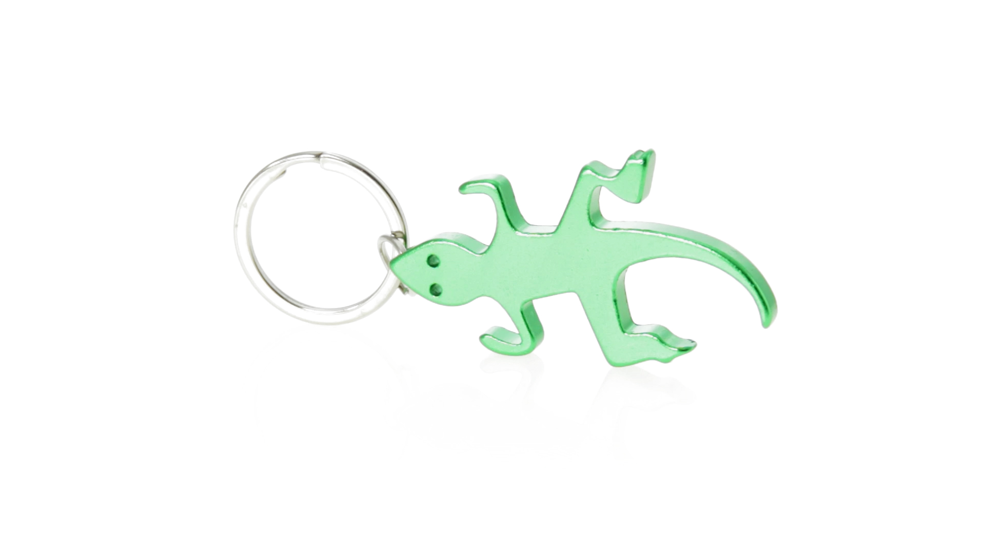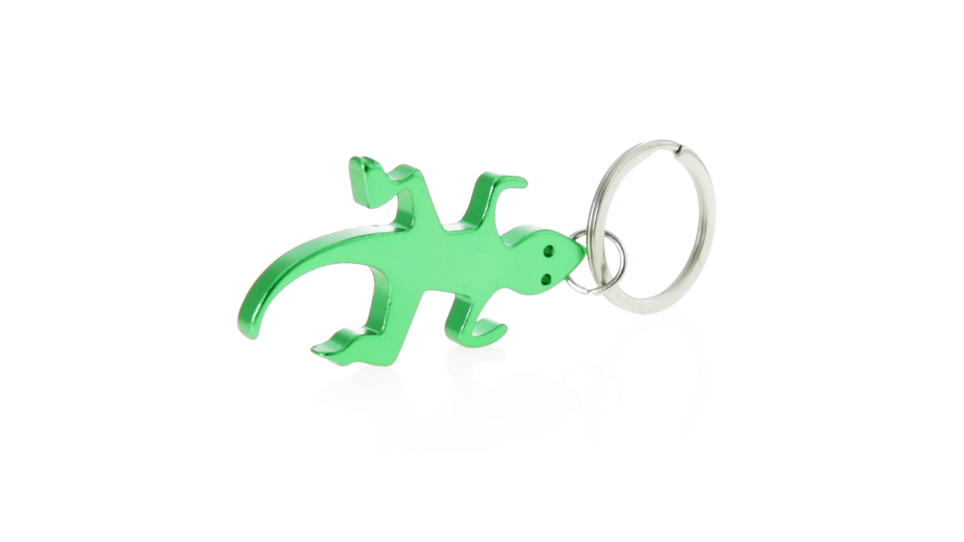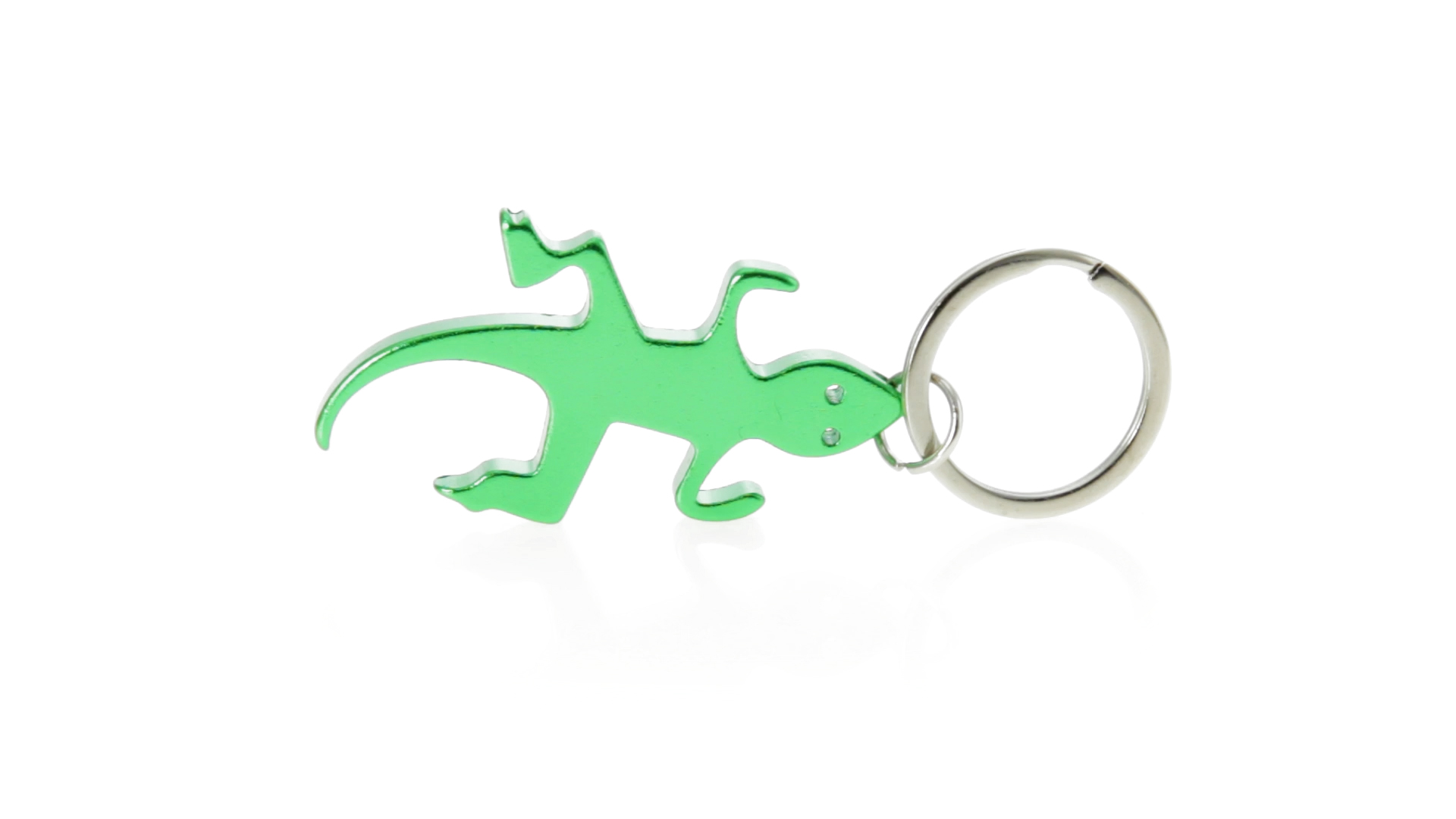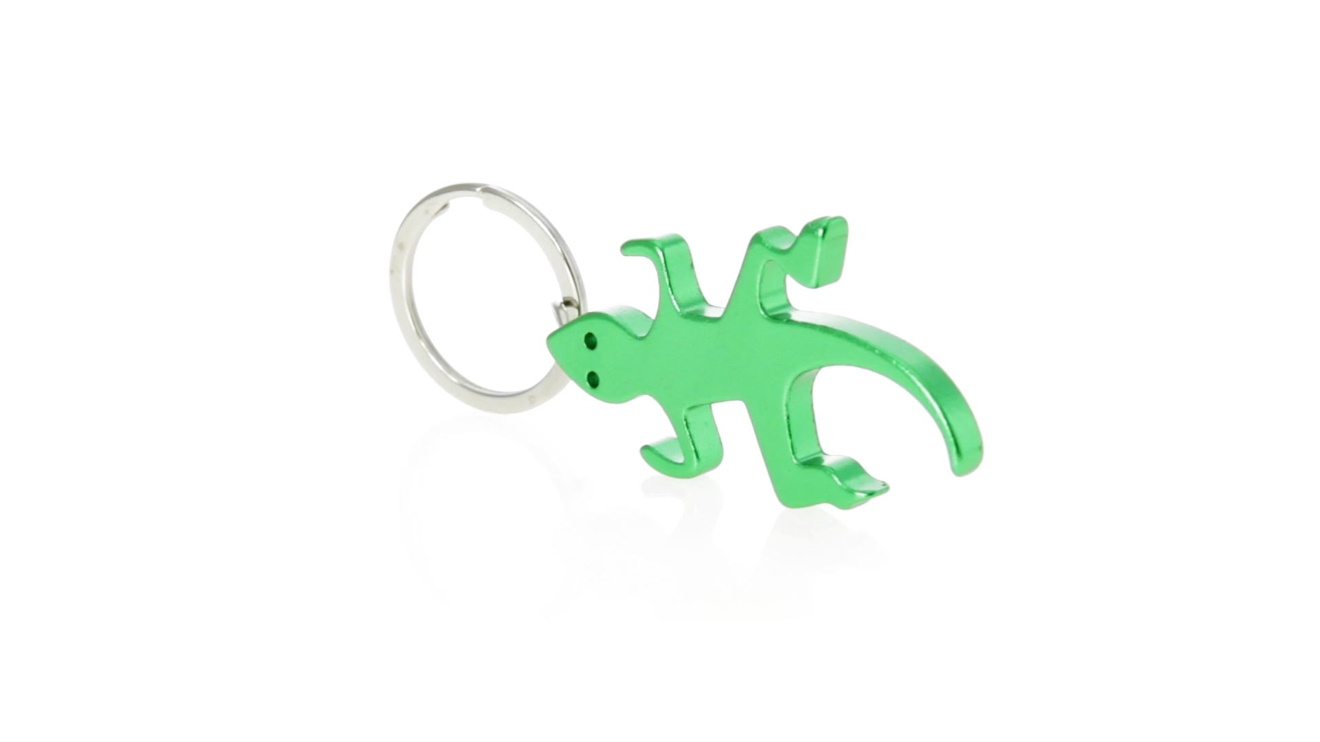 Origineller Salamander-Schlüsselanhänger mit Flaschenöffner aus Aluminium in einer Vielzahl von lebendigen Farben.