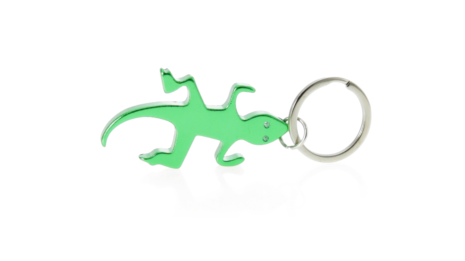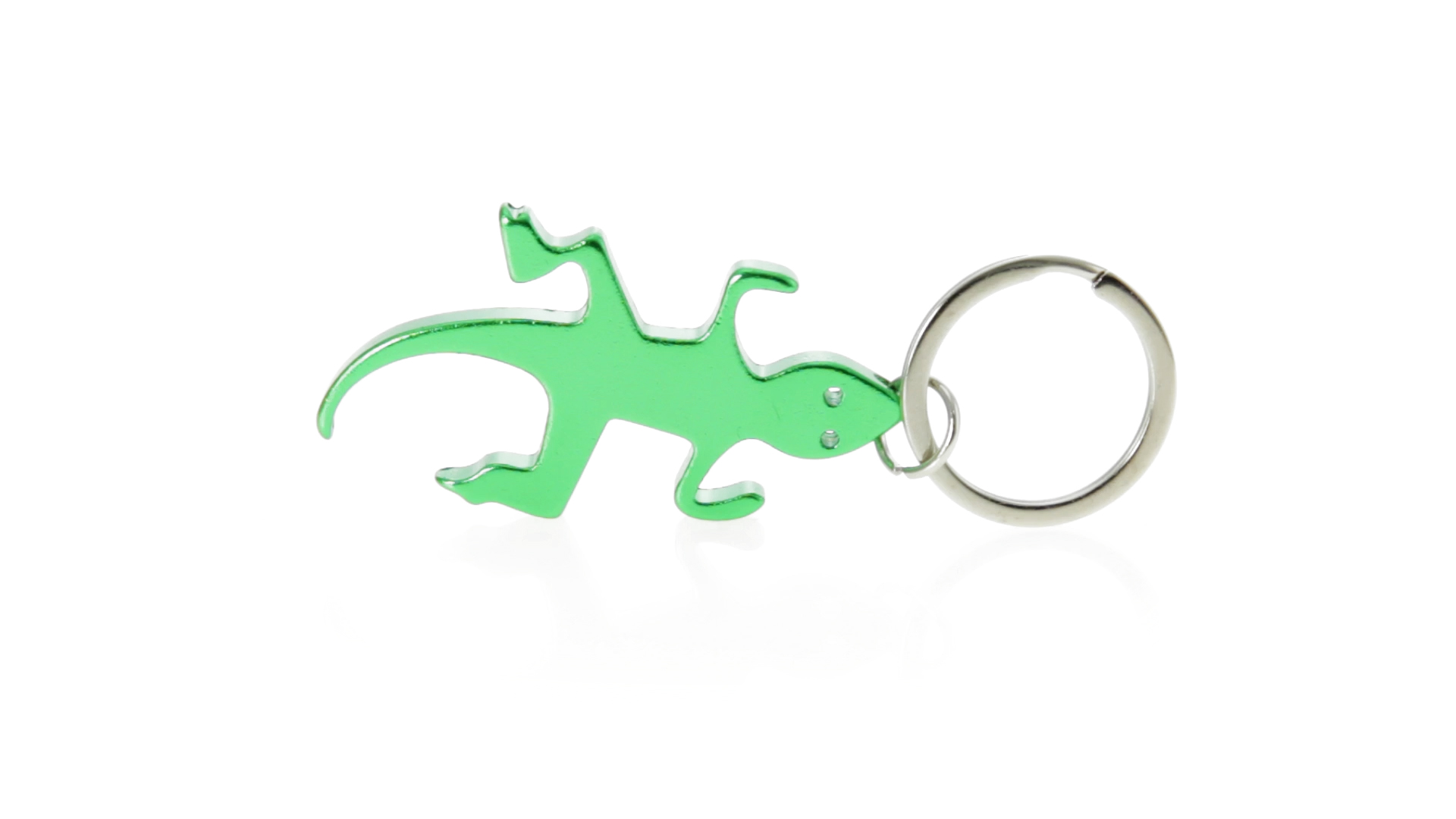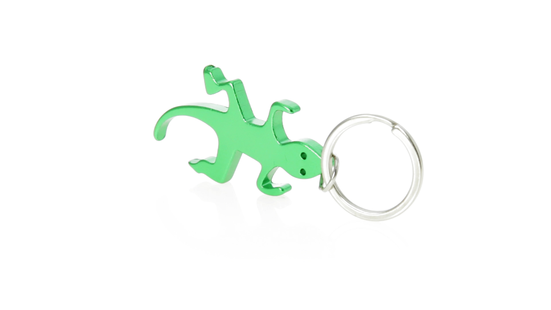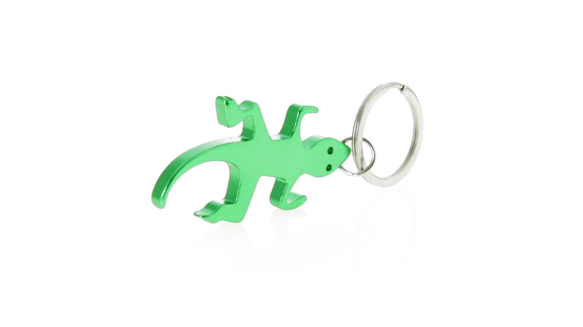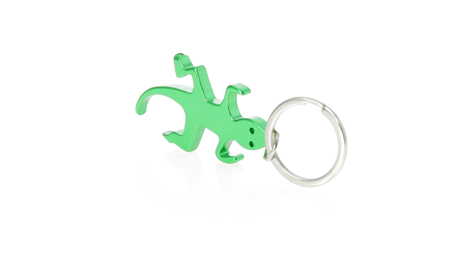 Origineller Salamander-Schlüsselanhänger mit Flaschenöffner aus Aluminium in einer Vielzahl von lebendigen Farben.