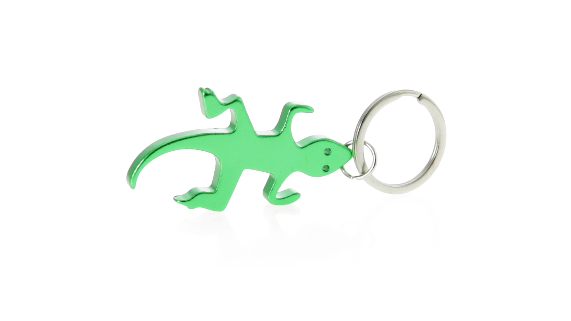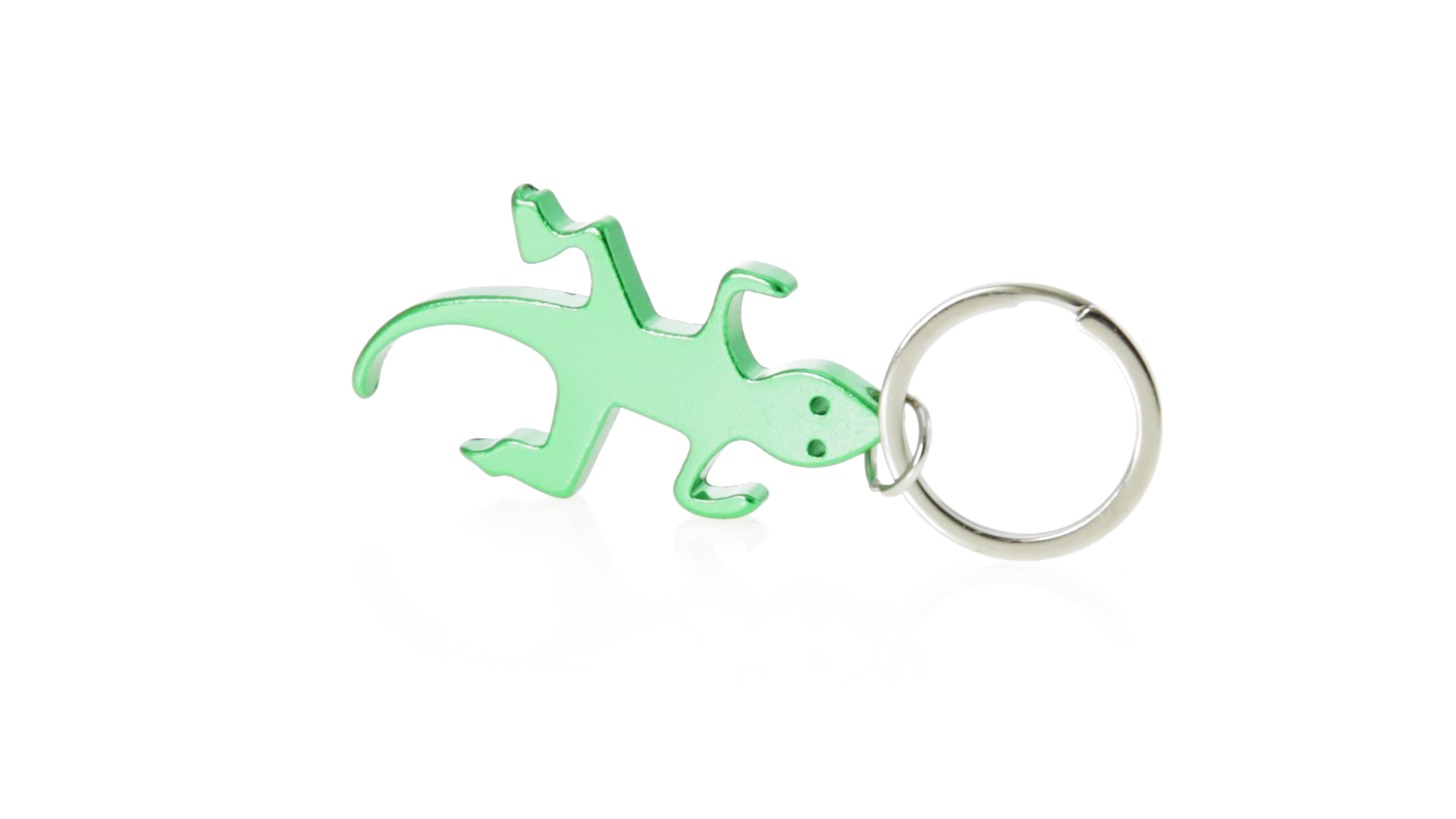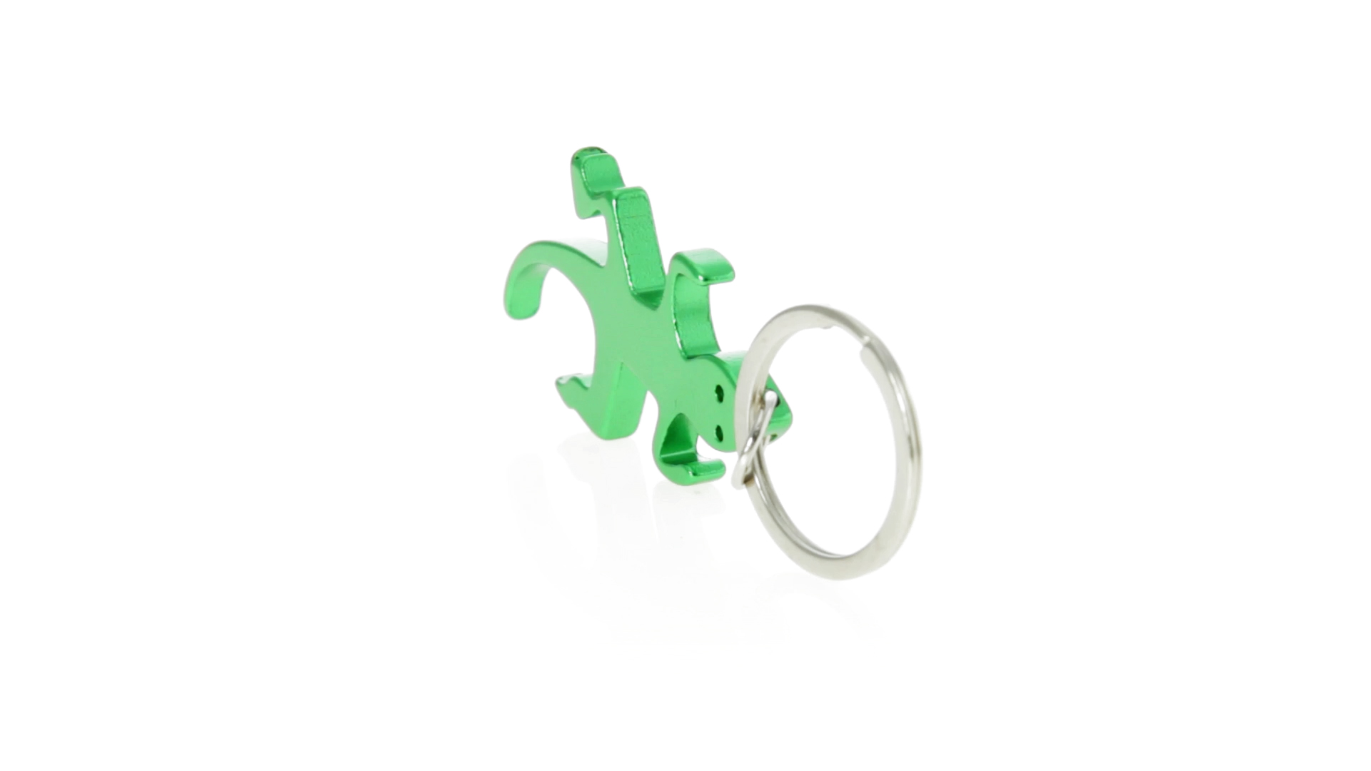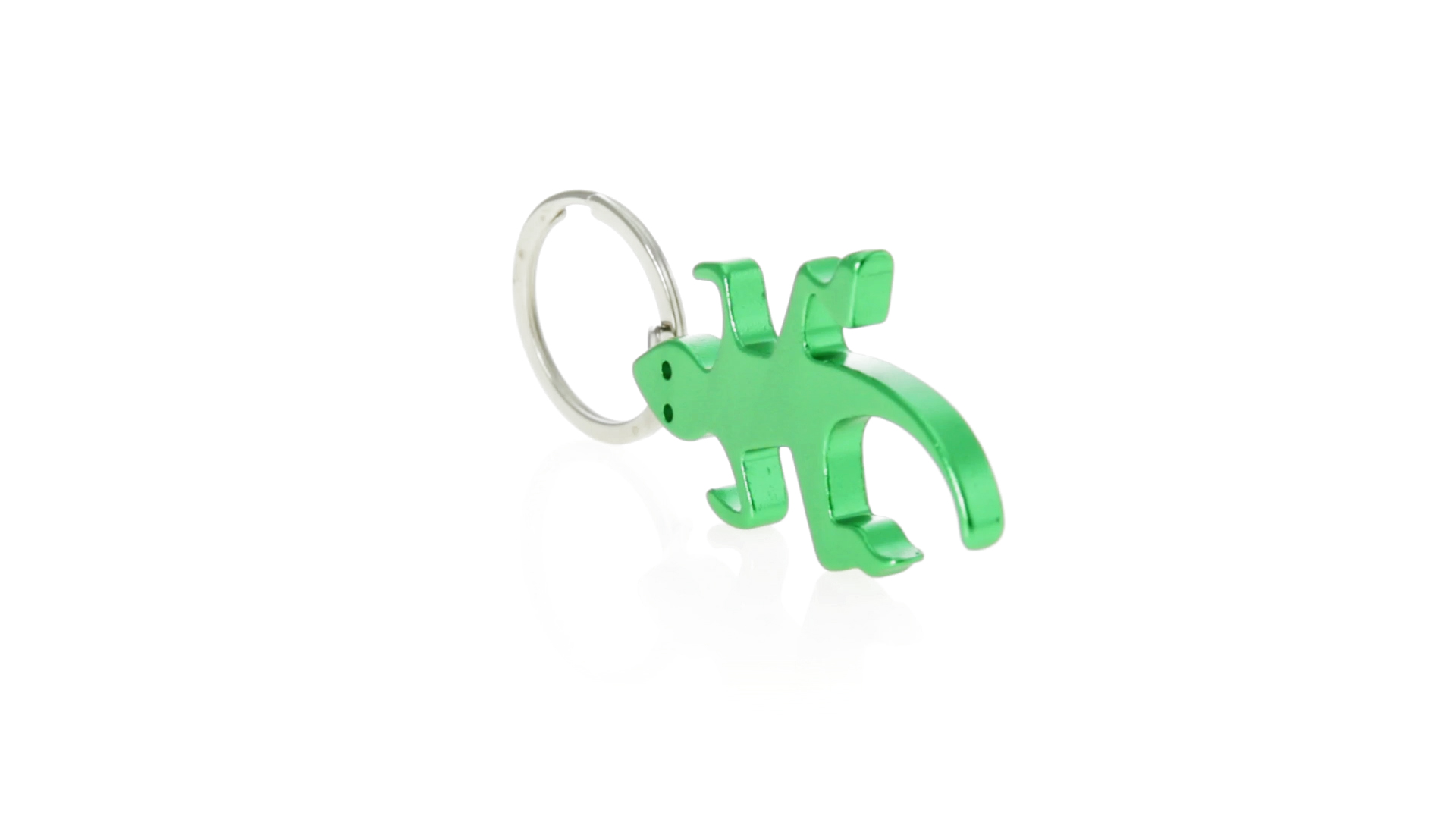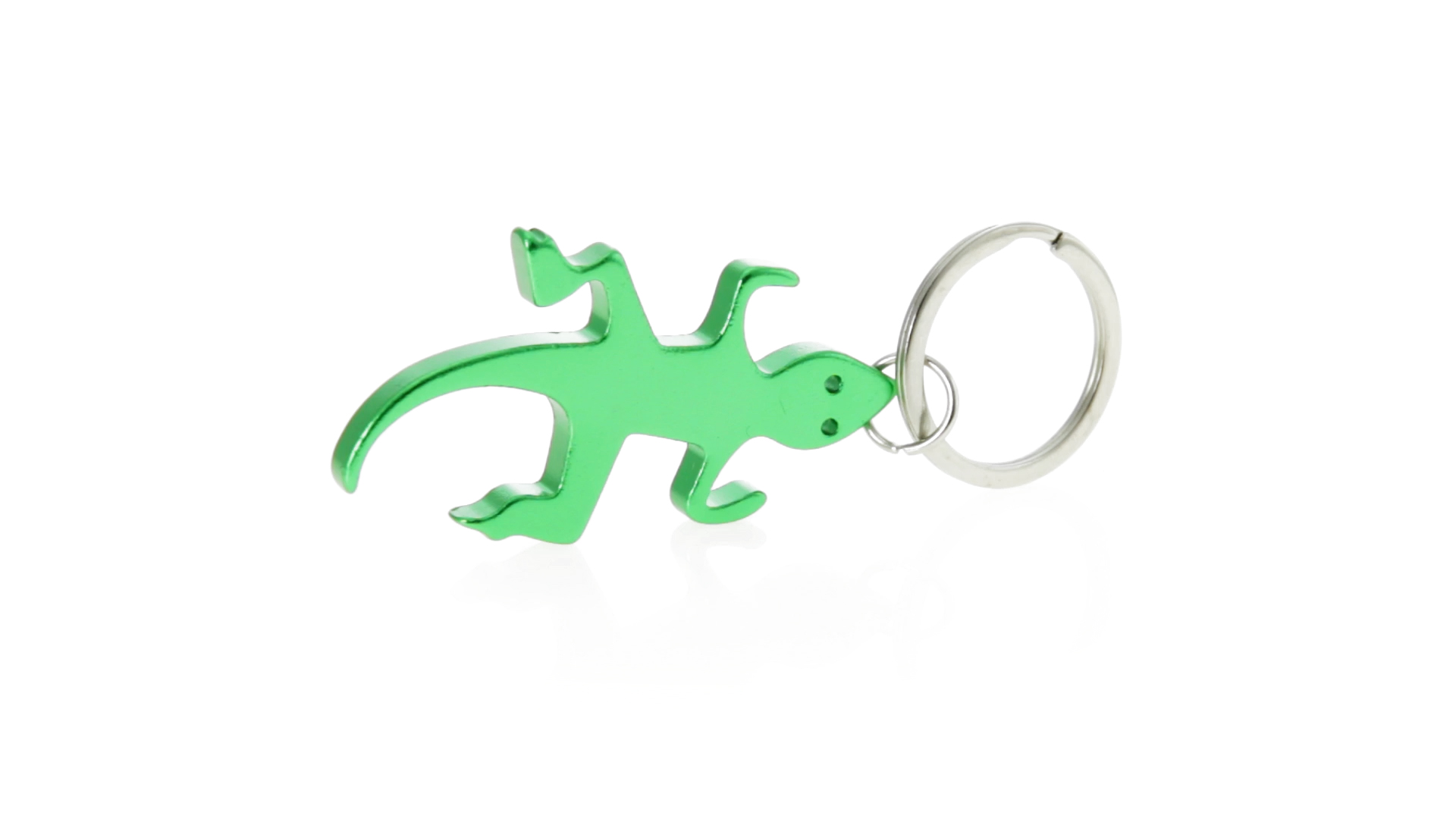 Origineller Salamander-Schlüsselanhänger mit Flaschenöffner aus Aluminium in einer Vielzahl von lebendigen Farben.