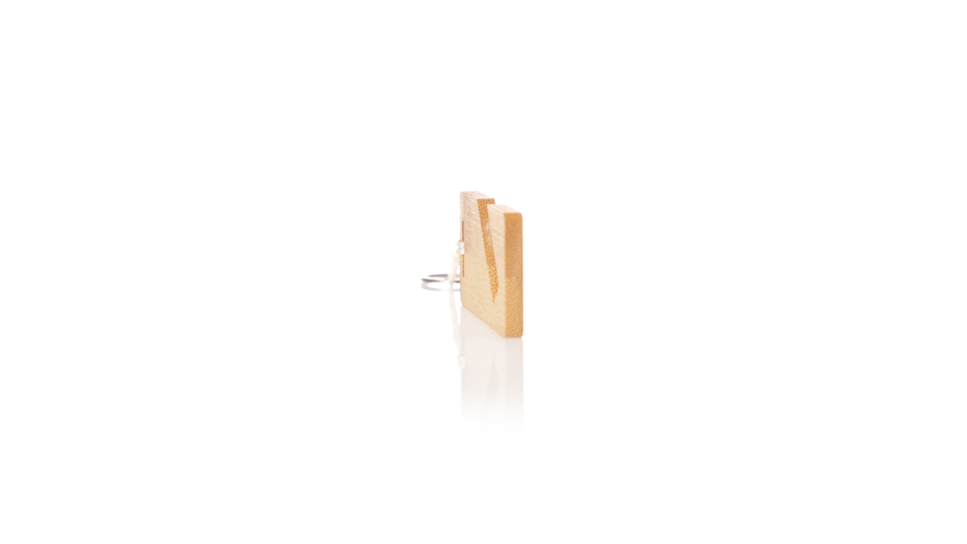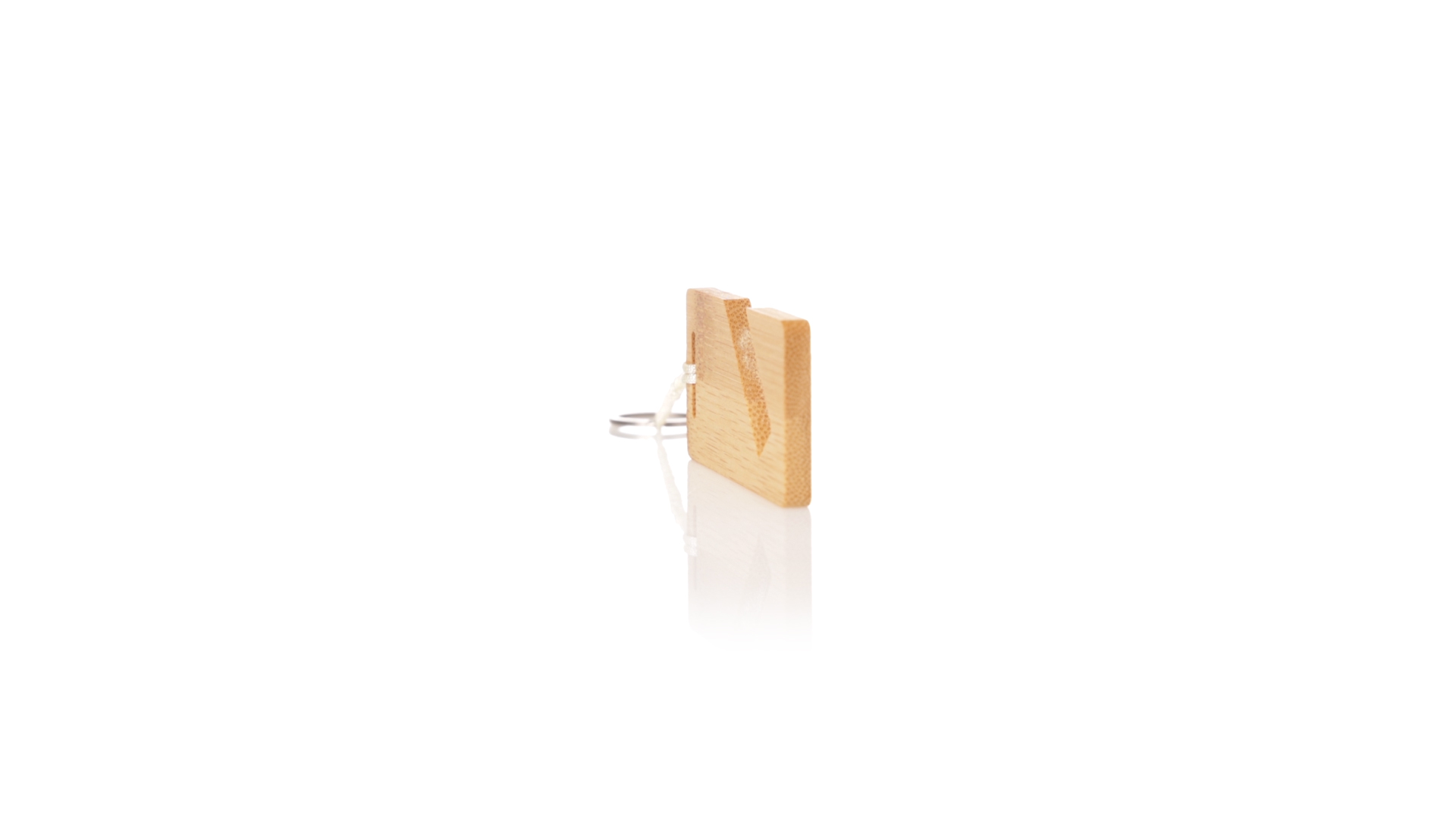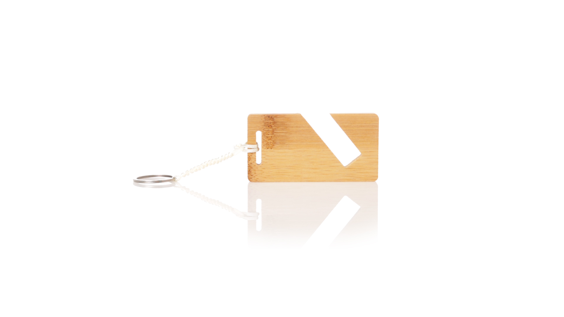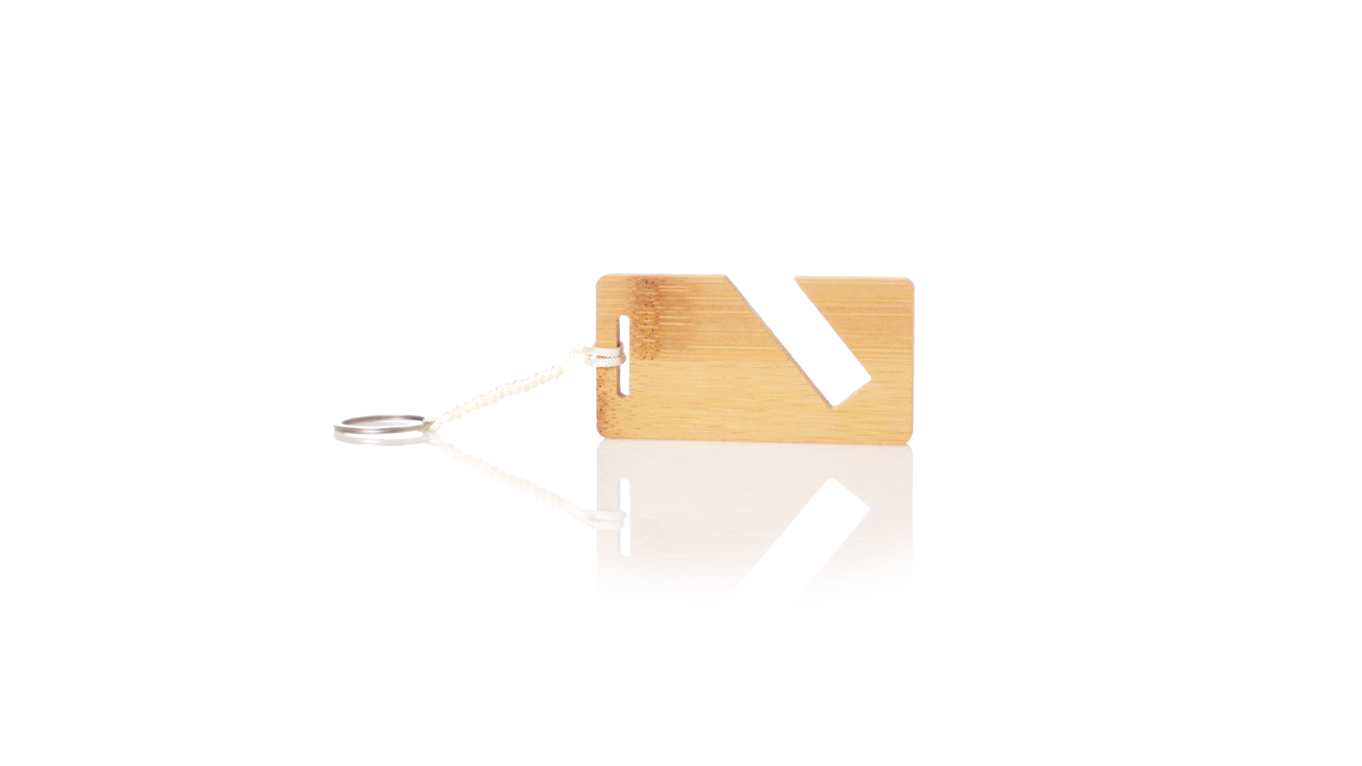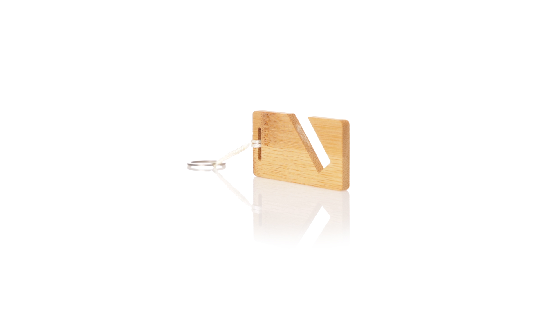 Schlüsselanhänger der Linie Natur aus Bambus, mit integriertem Smartphone-Halter und origineller Schnur. Präsentiert in individueller Tasche mit Öko-Karton innen.