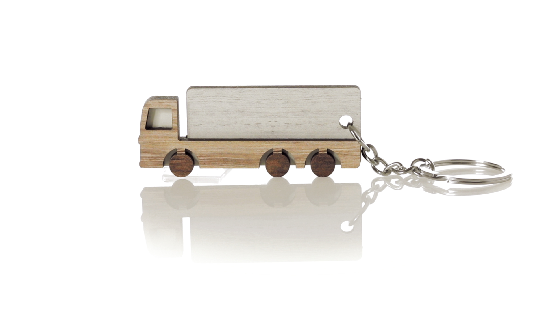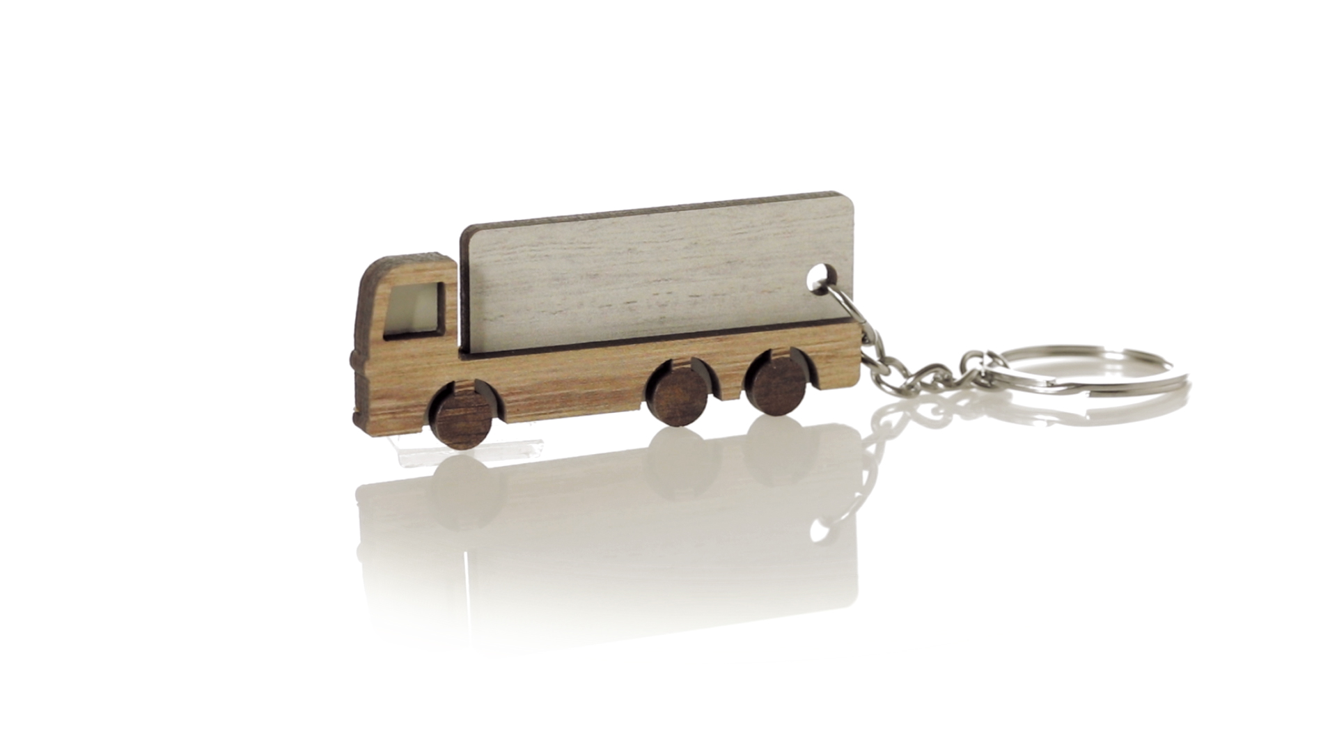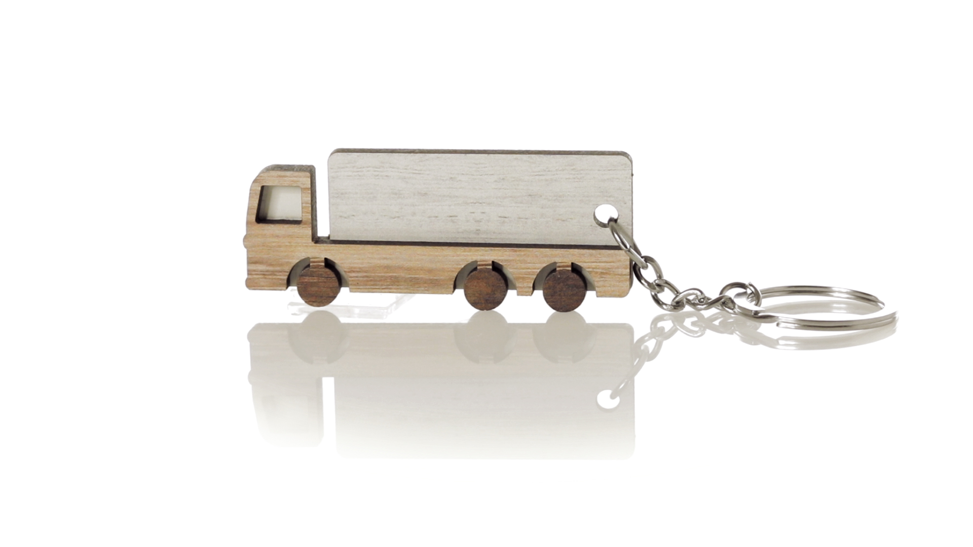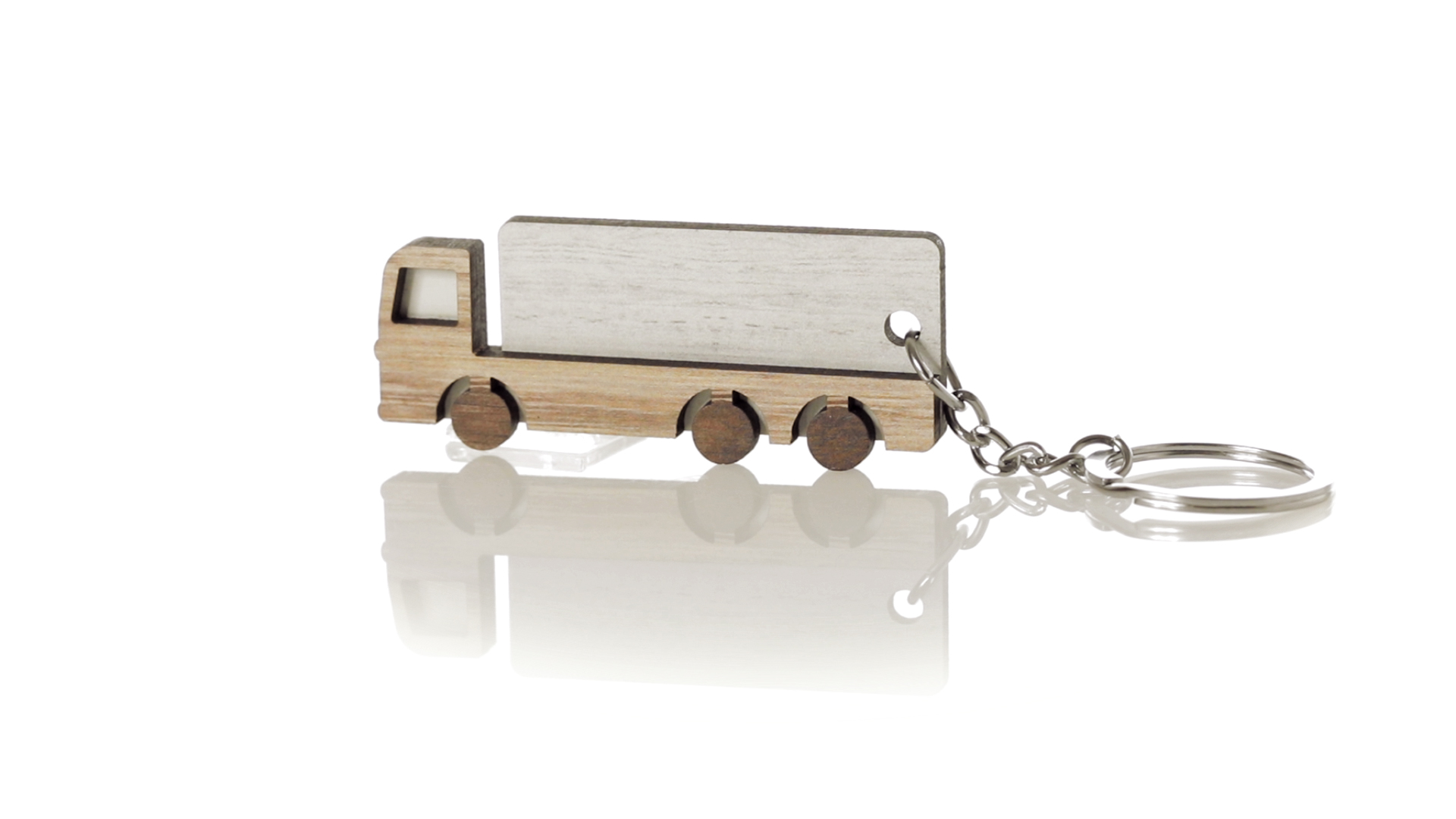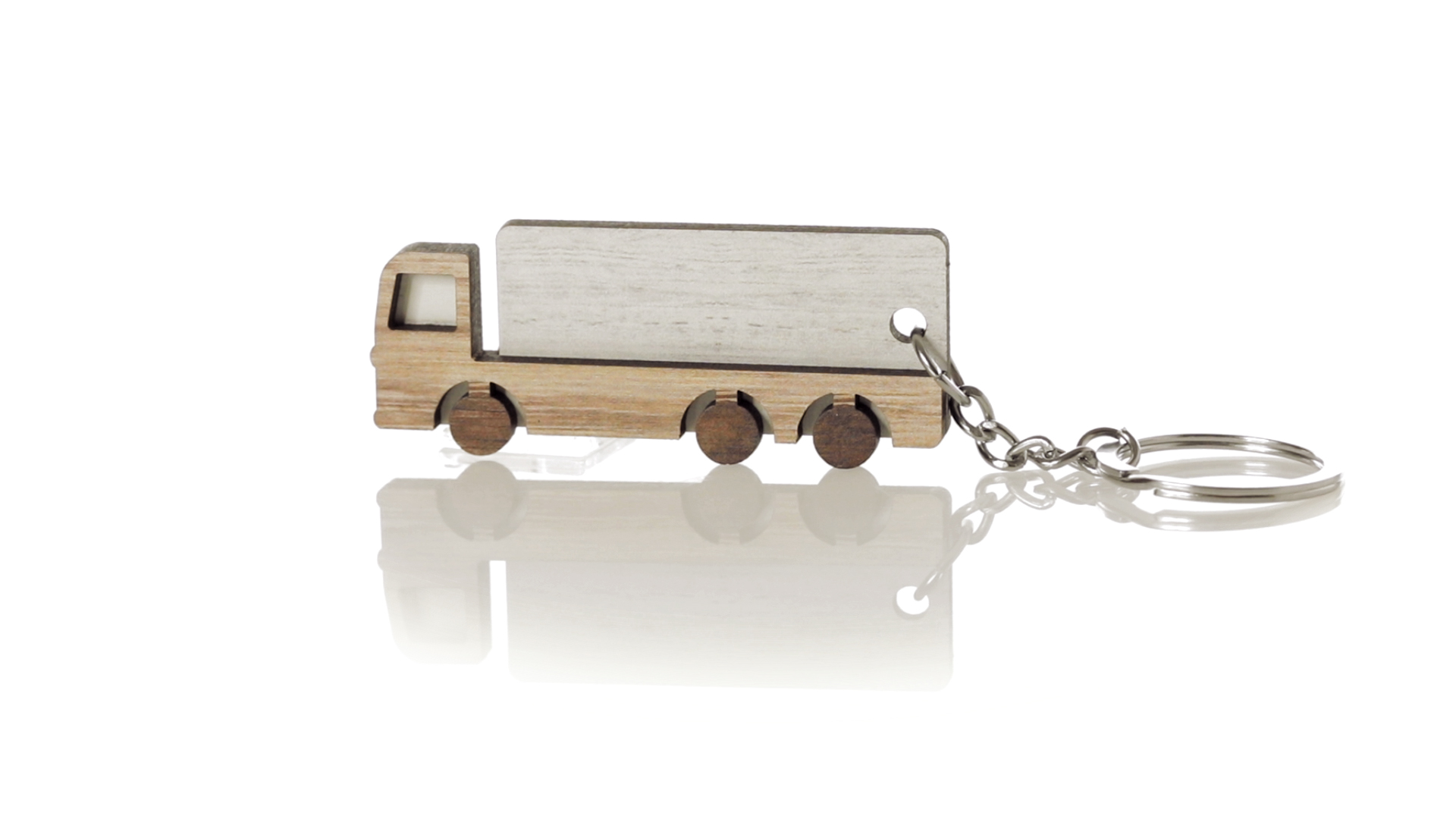 Schlüsselanhänger mit Lkw-Motiv, aus Naturholz und mit Original-Bicolor-Finish. Grosse Branding-Fläche, mit Metallring und -kette und Made in Europe-Logo.