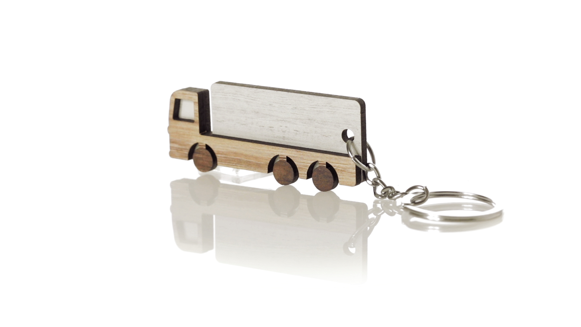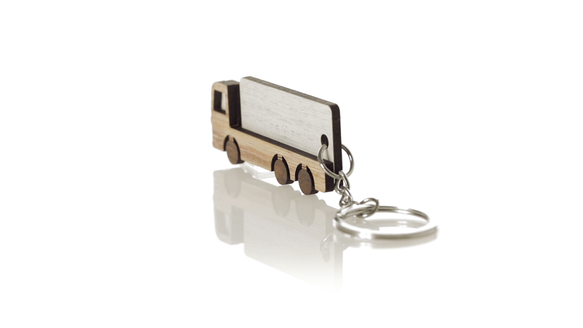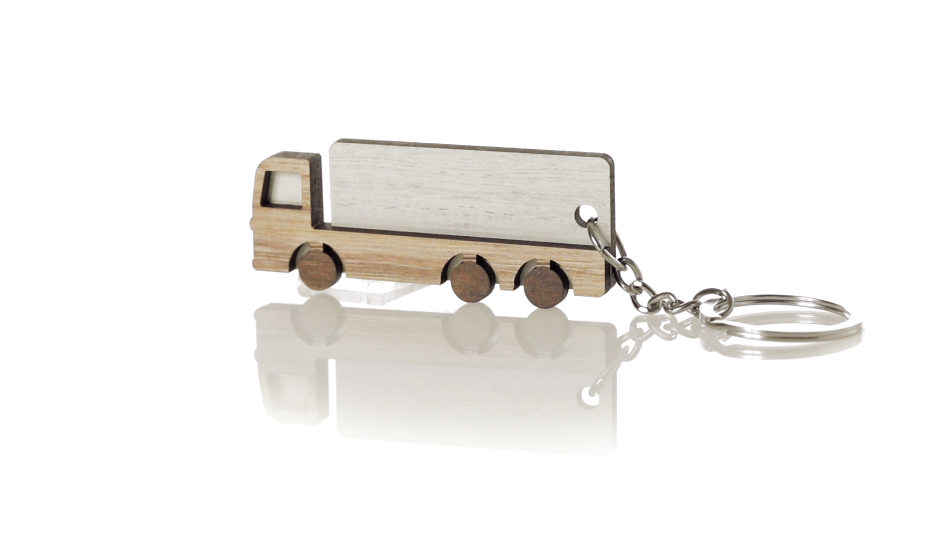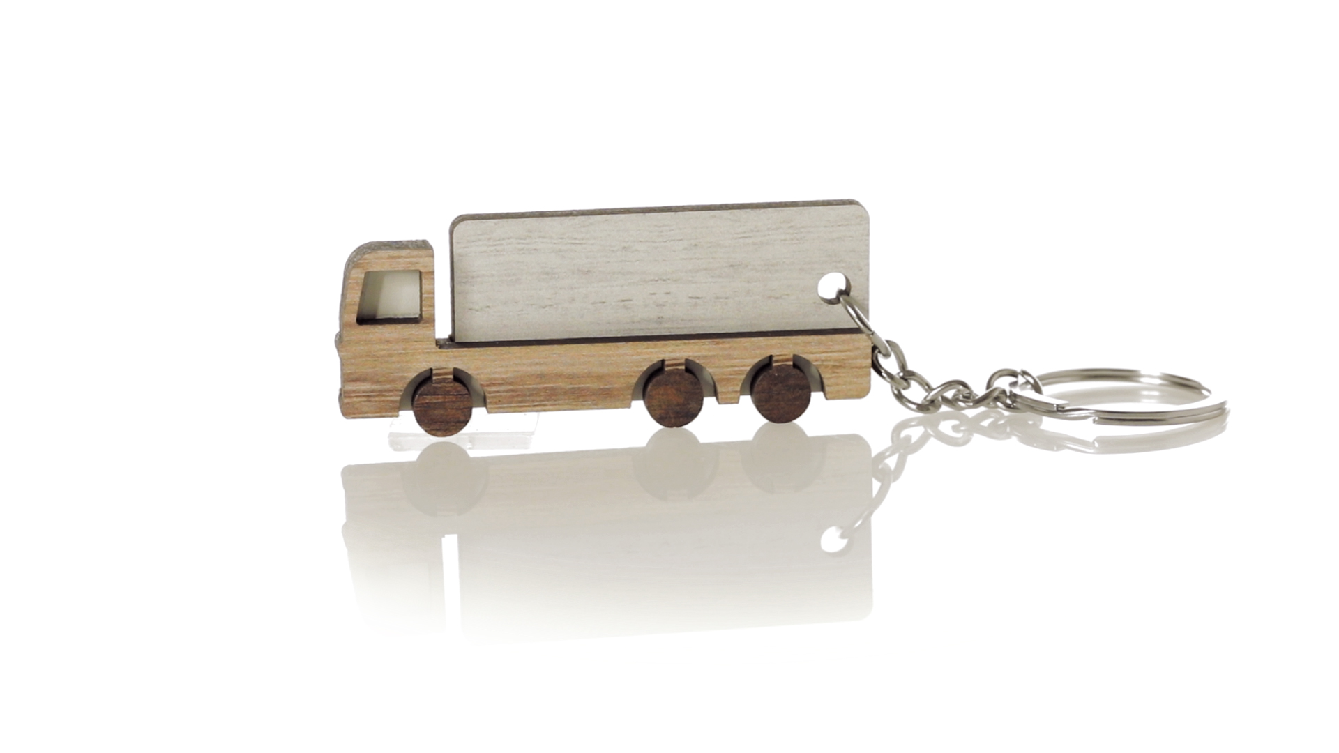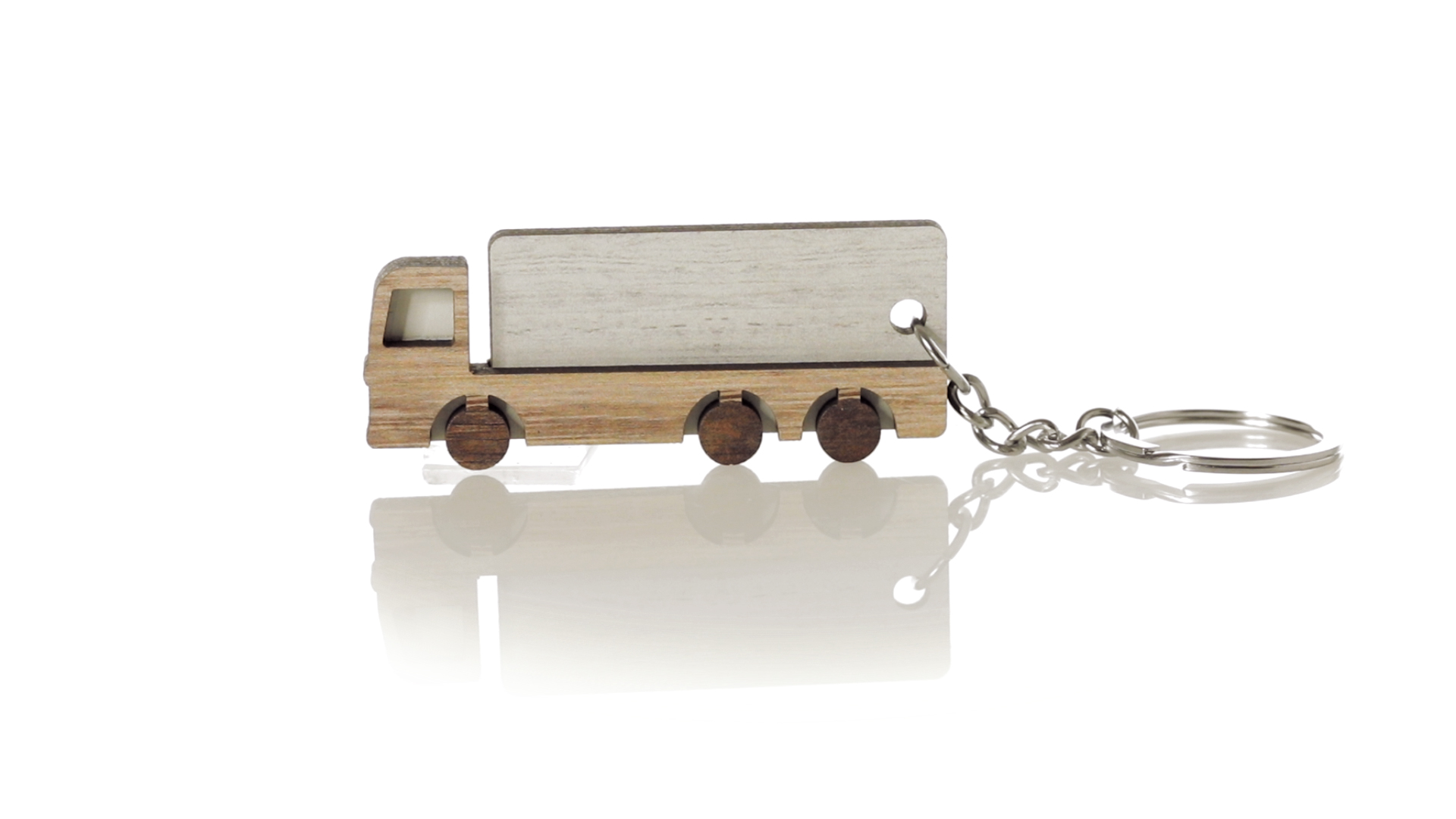 Schlüsselanhänger mit Lkw-Motiv, aus Naturholz und mit Original-Bicolor-Finish. Grosse Branding-Fläche, mit Metallring und -kette und Made in Europe-Logo.