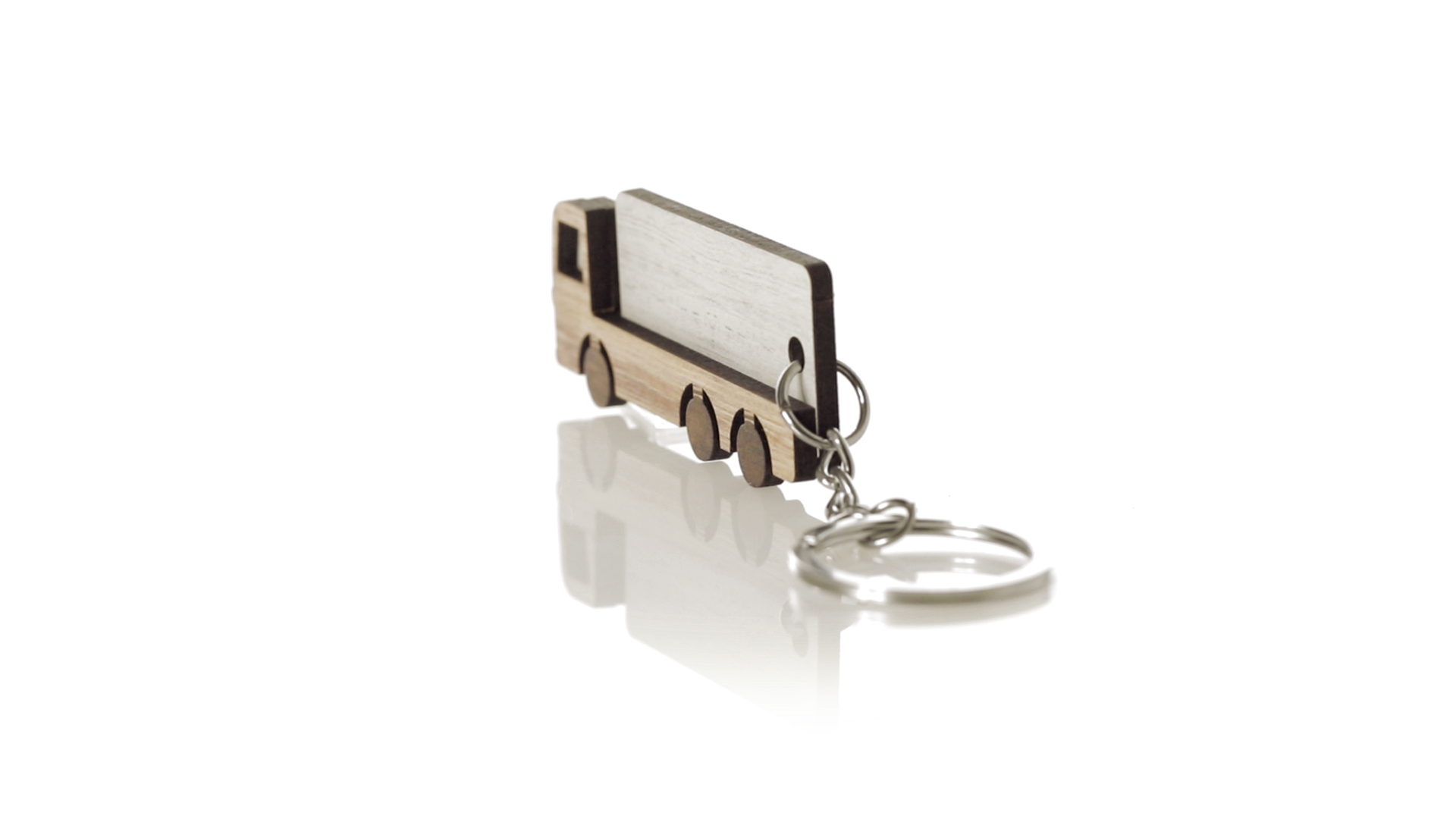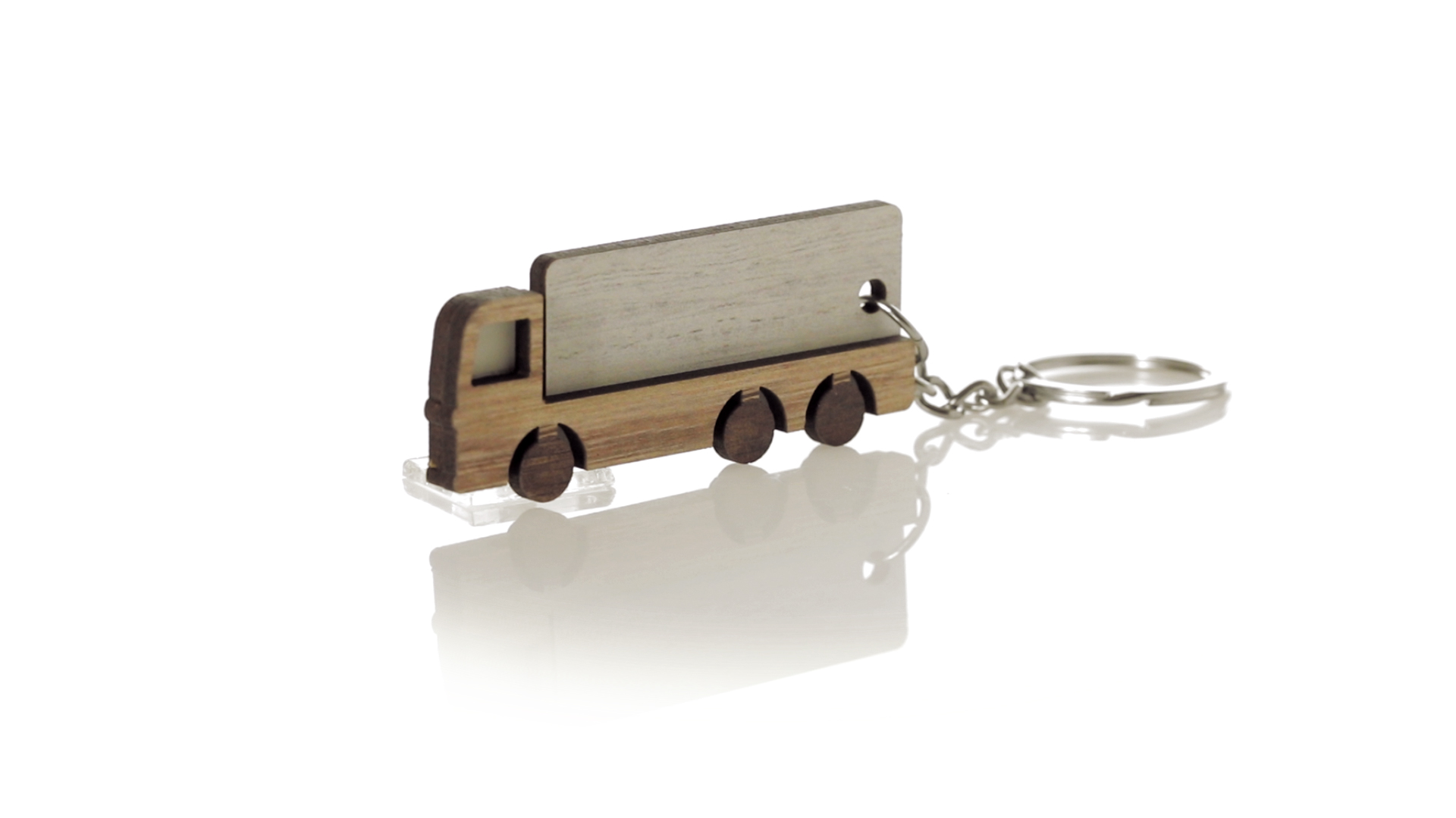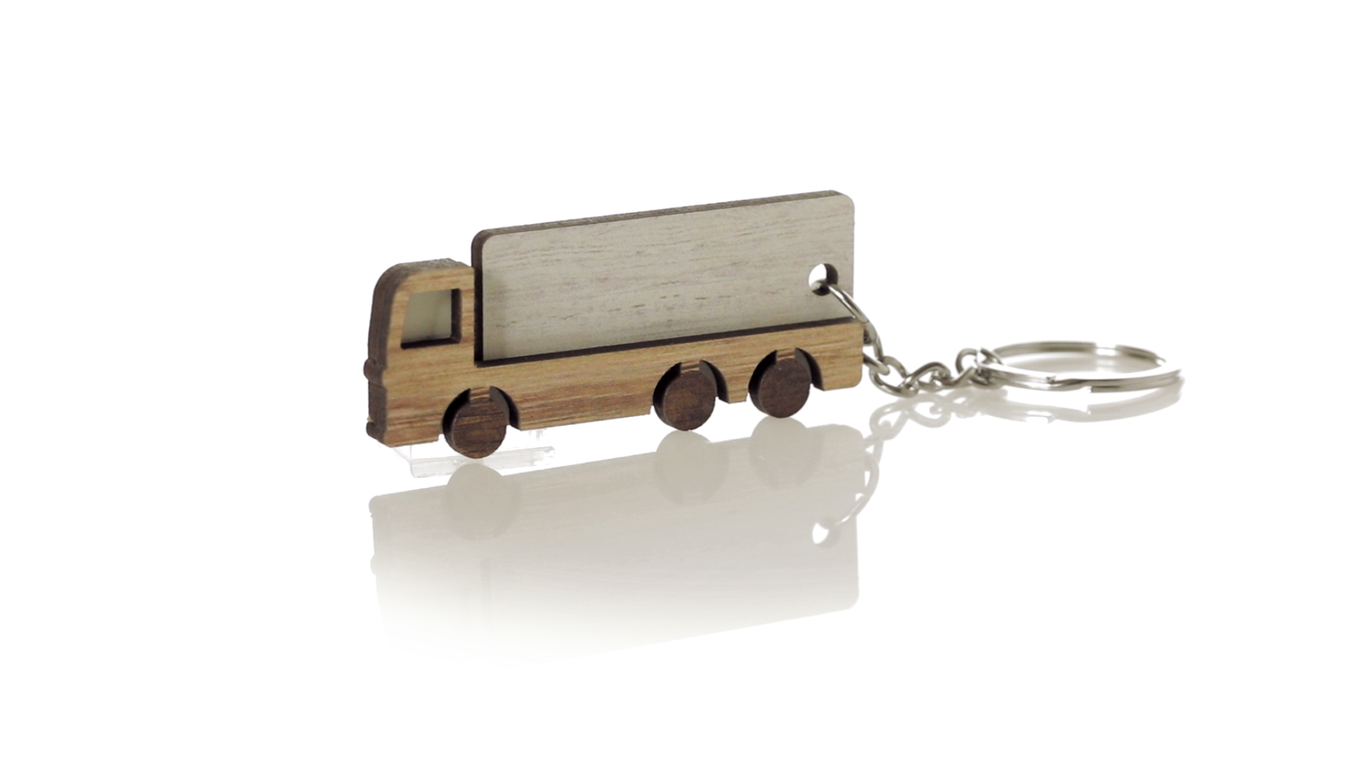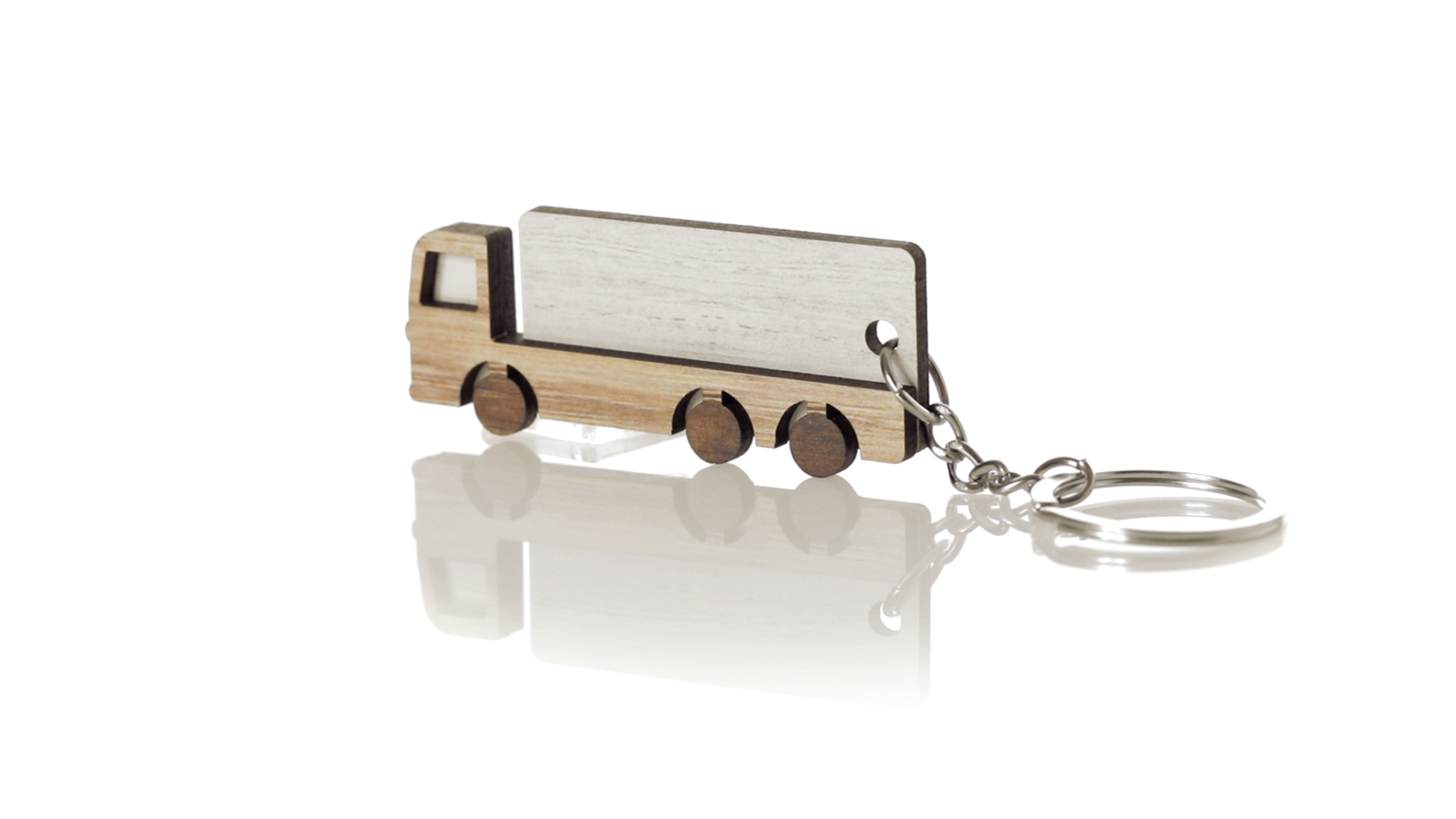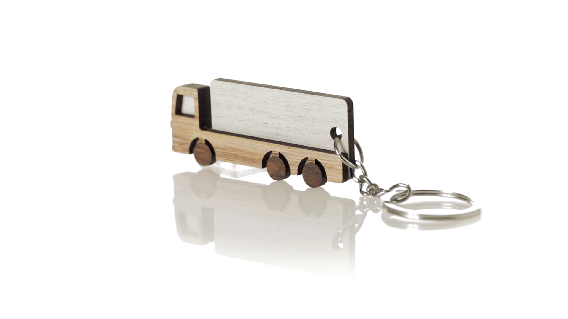 Schlüsselanhänger mit Lkw-Motiv, aus Naturholz und mit Original-Bicolor-Finish. Grosse Branding-Fläche, mit Metallring und -kette und Made in Europe-Logo.