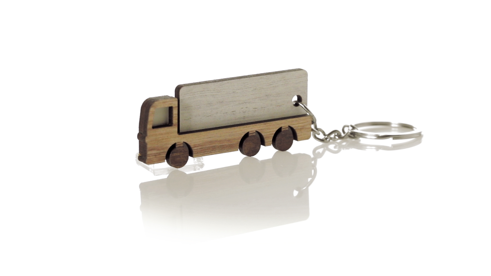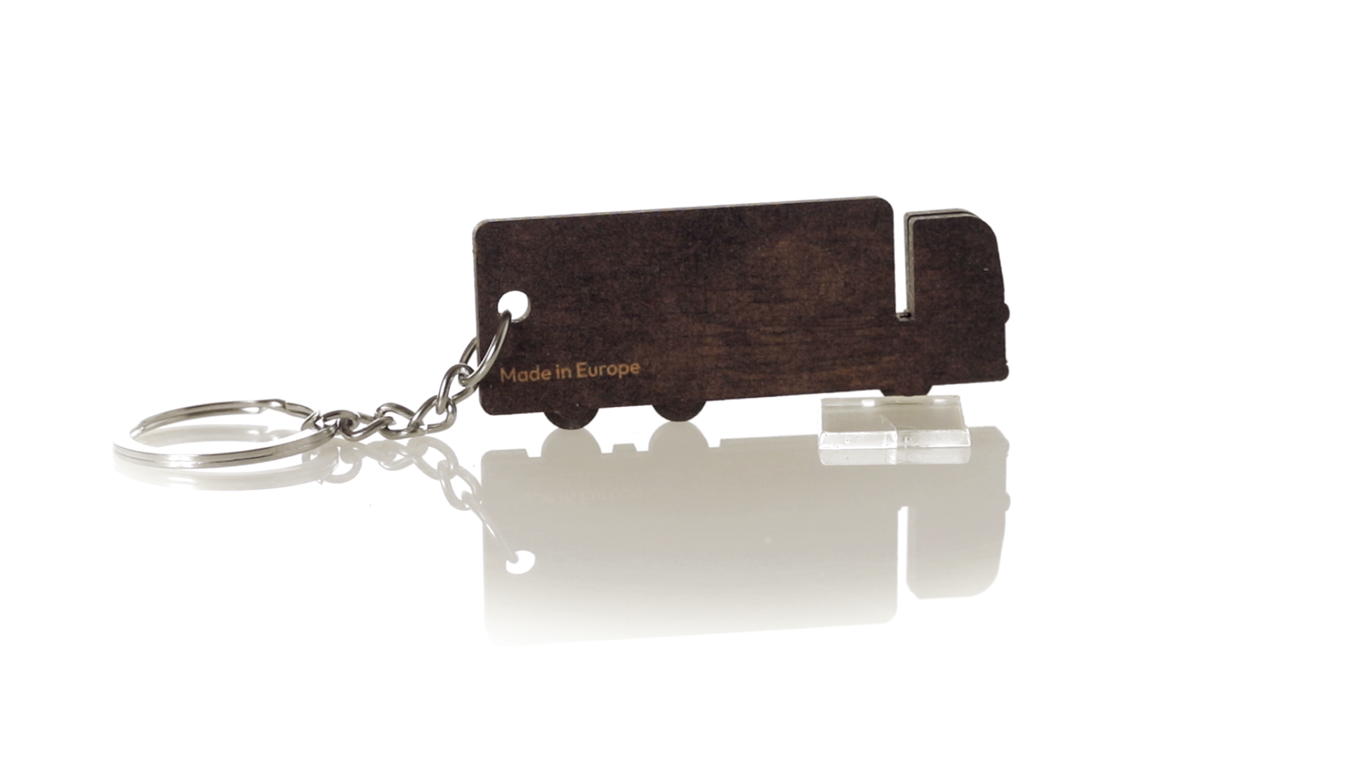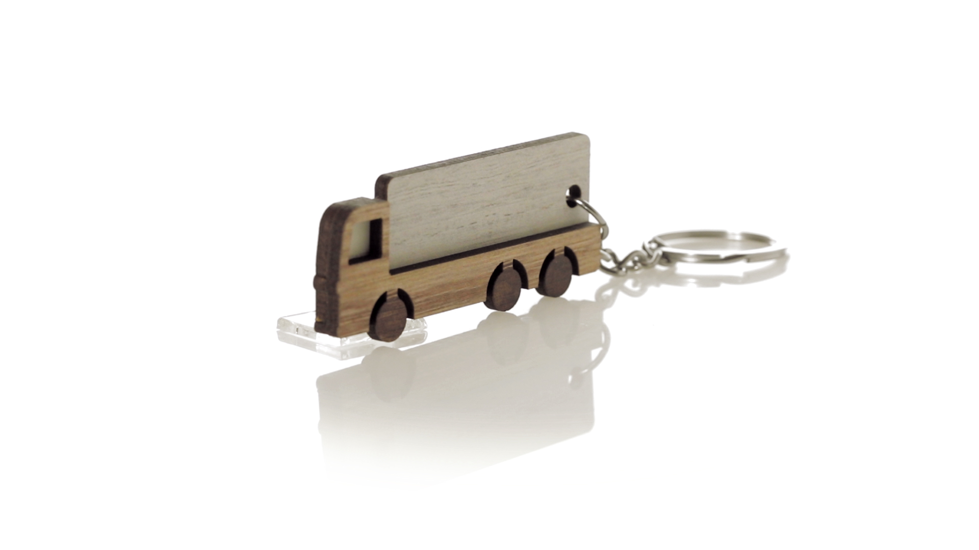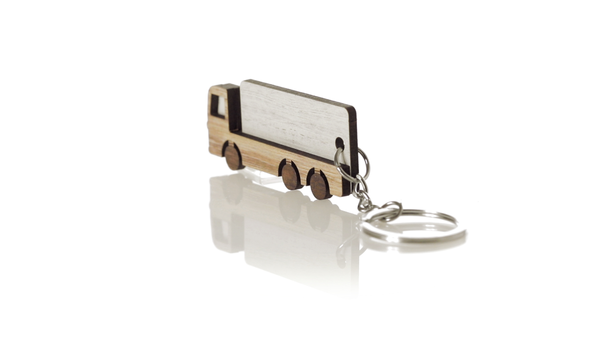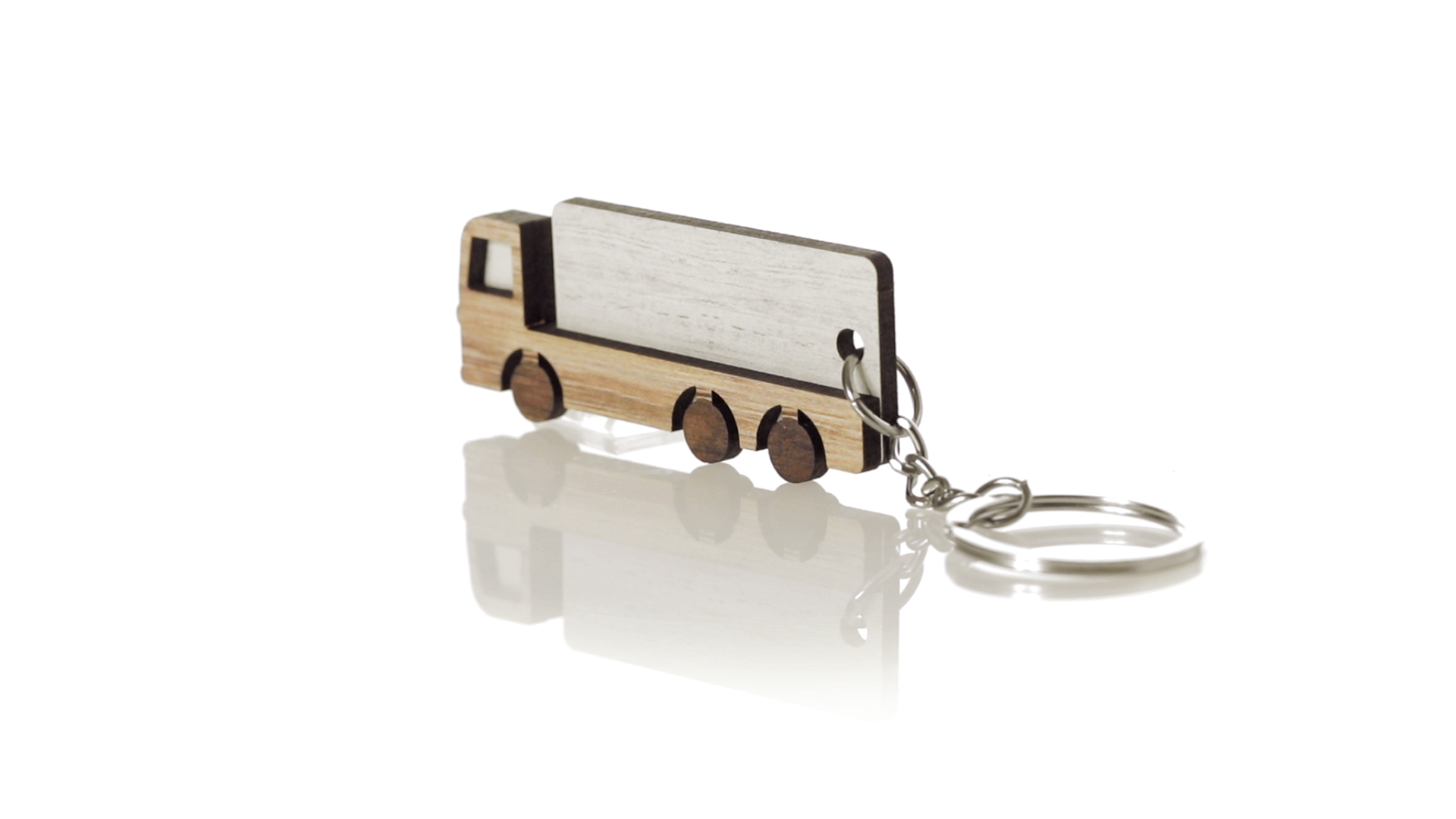 Schlüsselanhänger mit Lkw-Motiv, aus Naturholz und mit Original-Bicolor-Finish. Grosse Branding-Fläche, mit Metallring und -kette und Made in Europe-Logo.