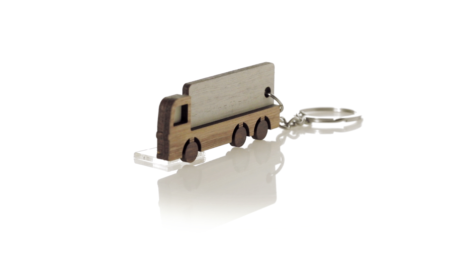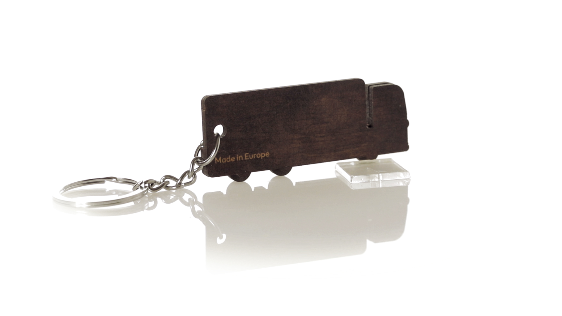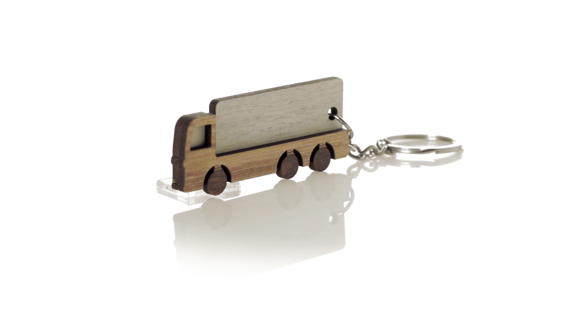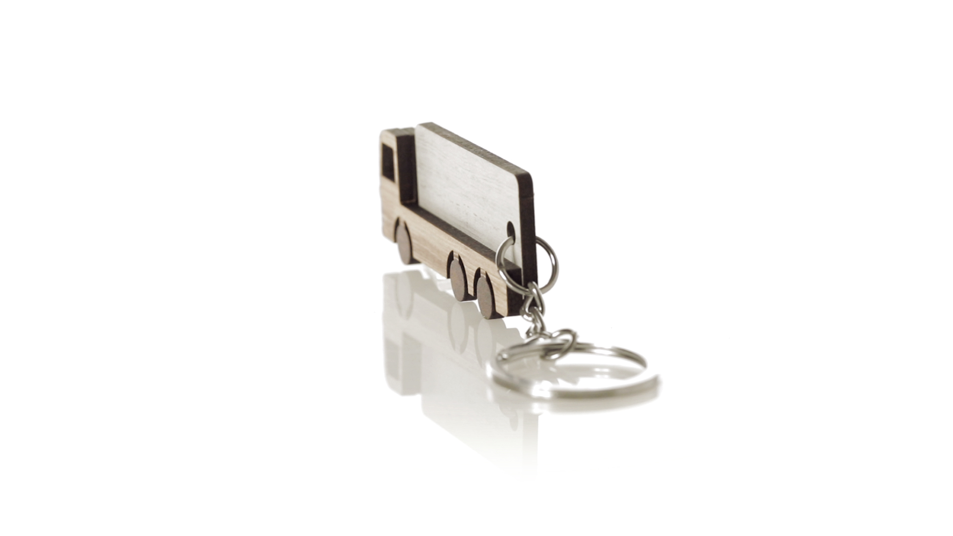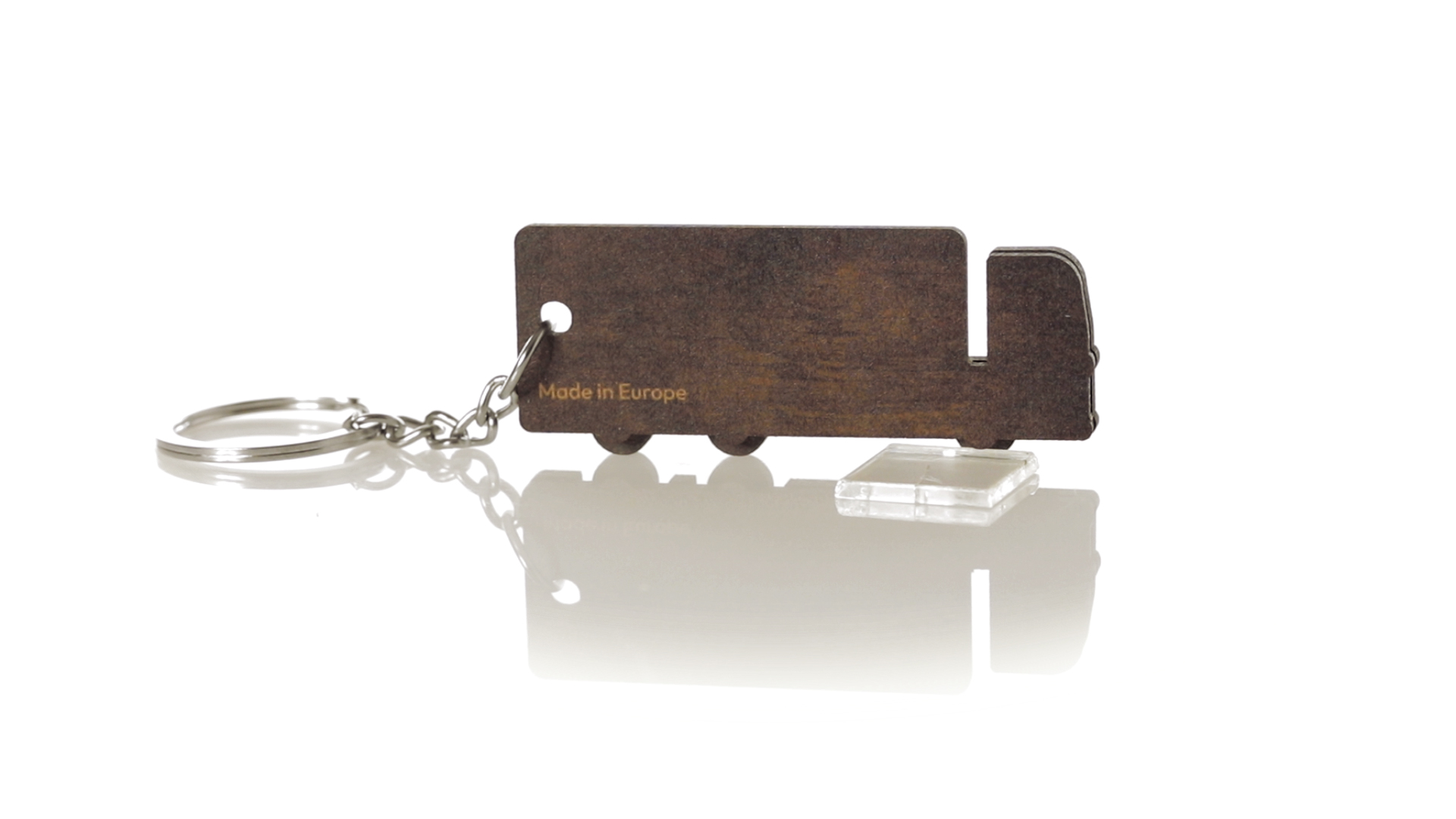 Schlüsselanhänger mit Lkw-Motiv, aus Naturholz und mit Original-Bicolor-Finish. Grosse Branding-Fläche, mit Metallring und -kette und Made in Europe-Logo.
