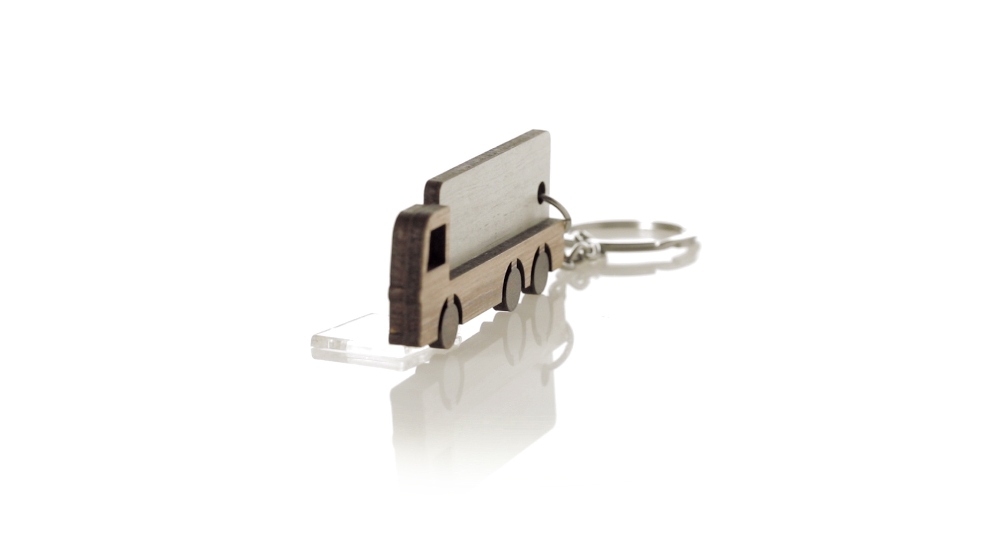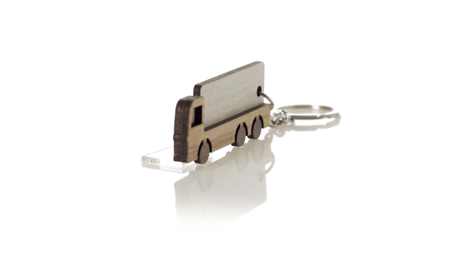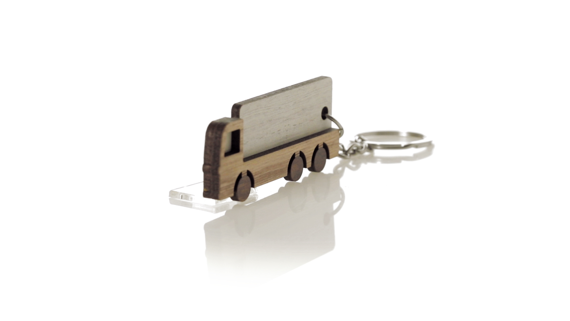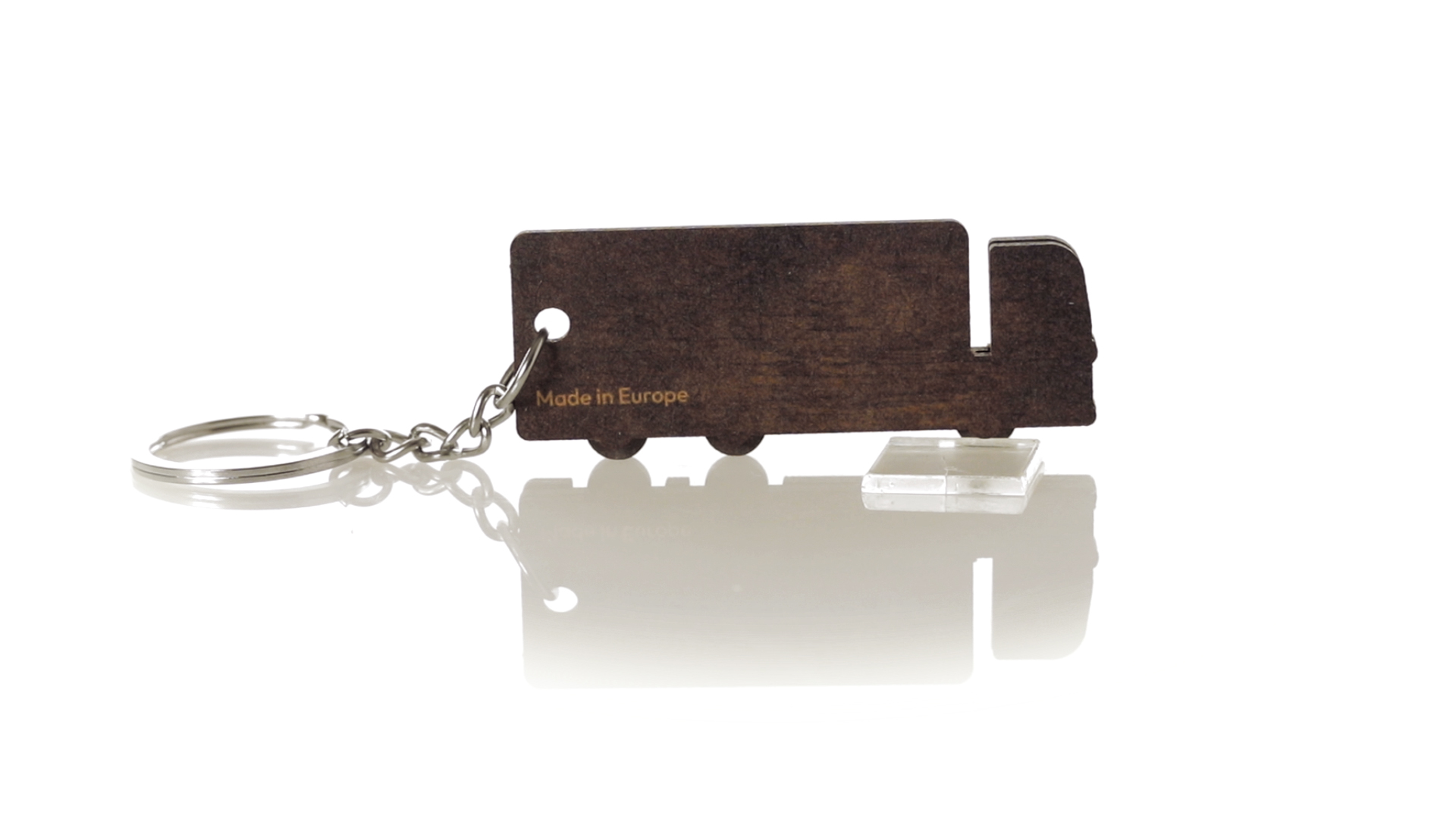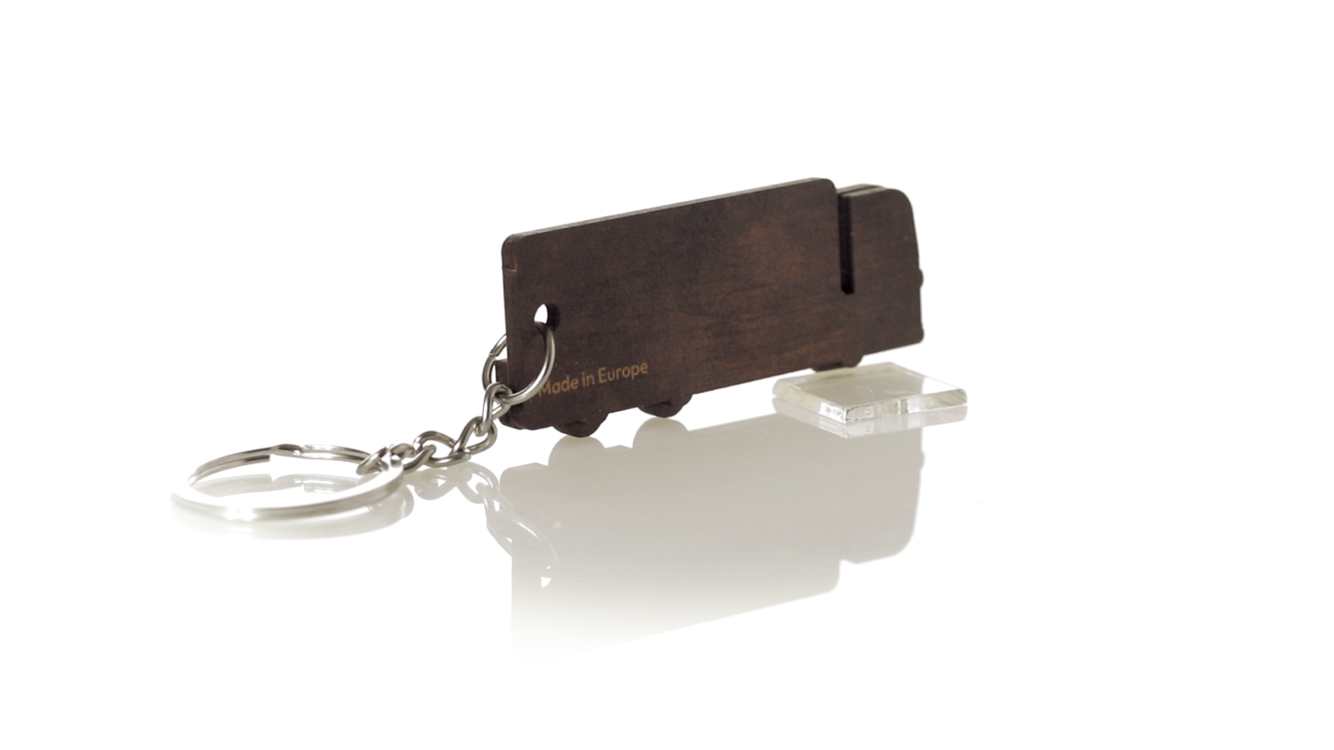 Schlüsselanhänger mit Lkw-Motiv, aus Naturholz und mit Original-Bicolor-Finish. Grosse Branding-Fläche, mit Metallring und -kette und Made in Europe-Logo.