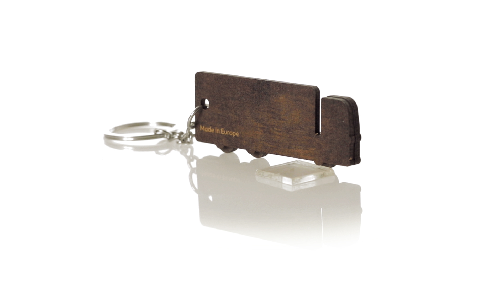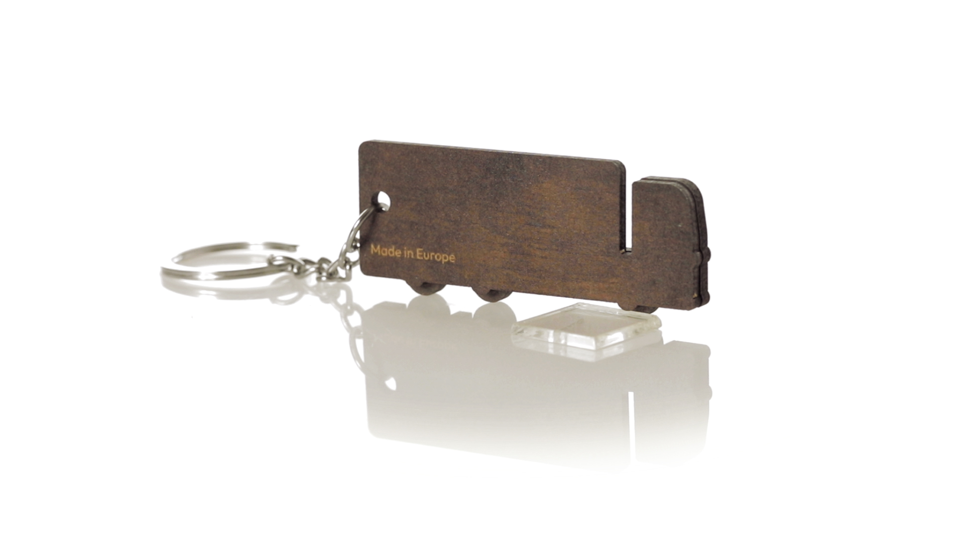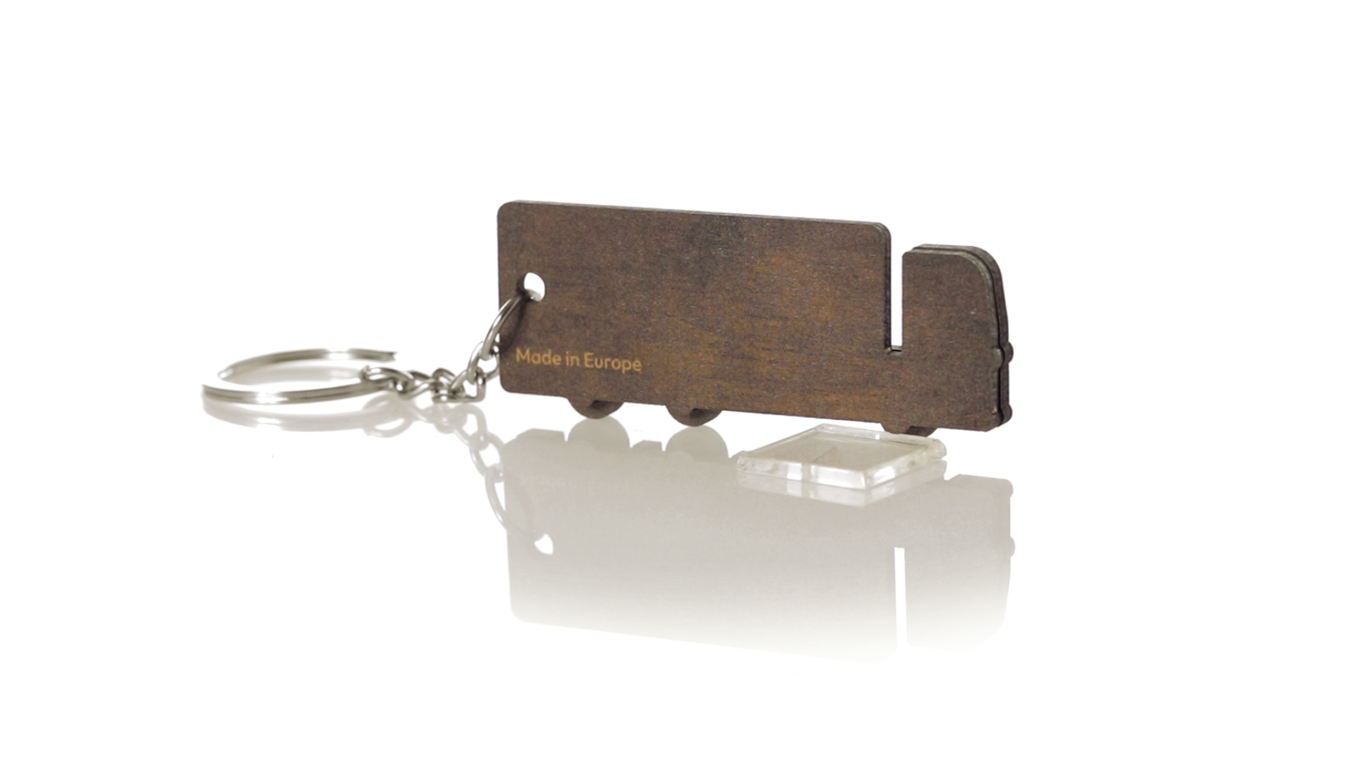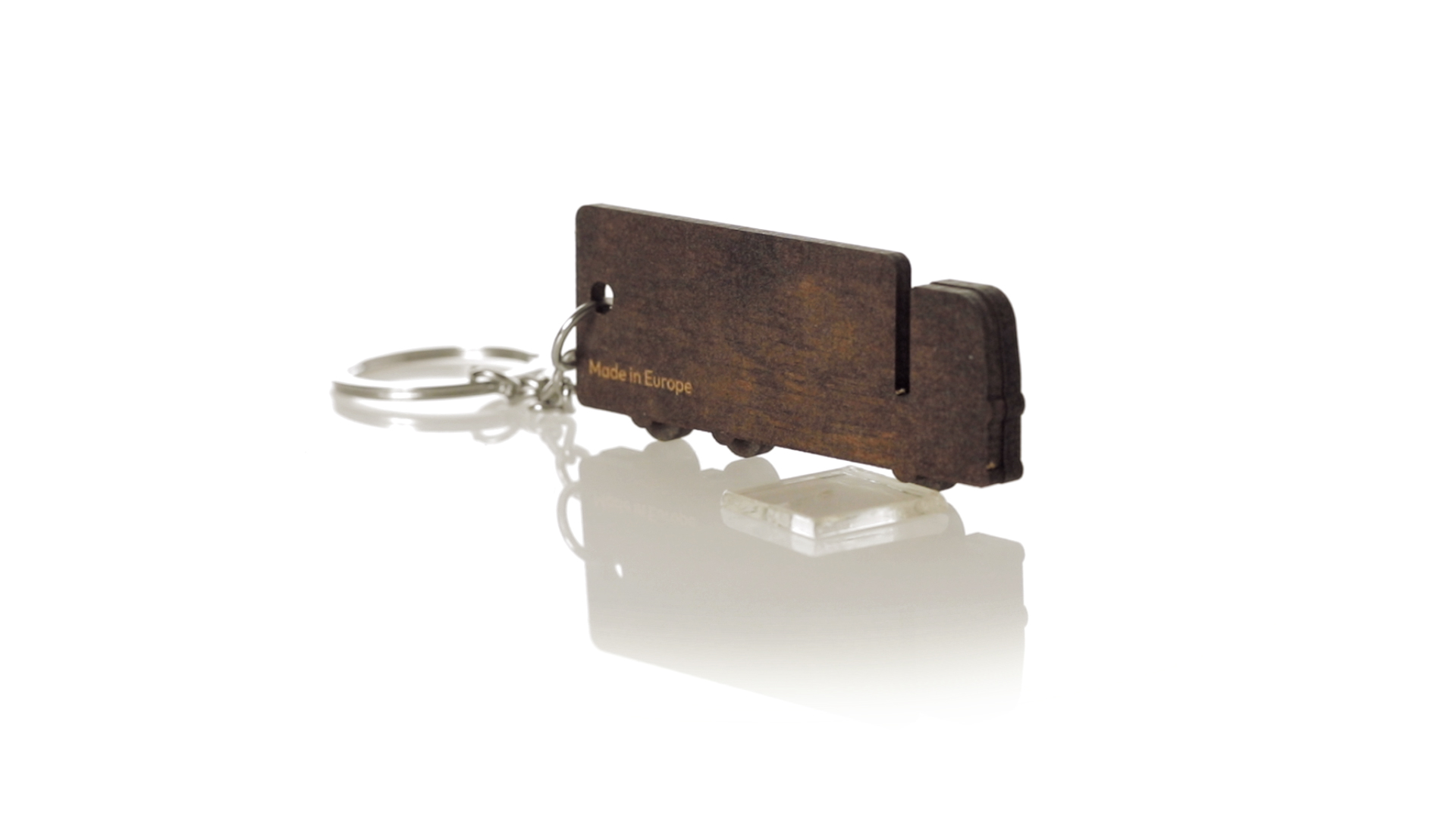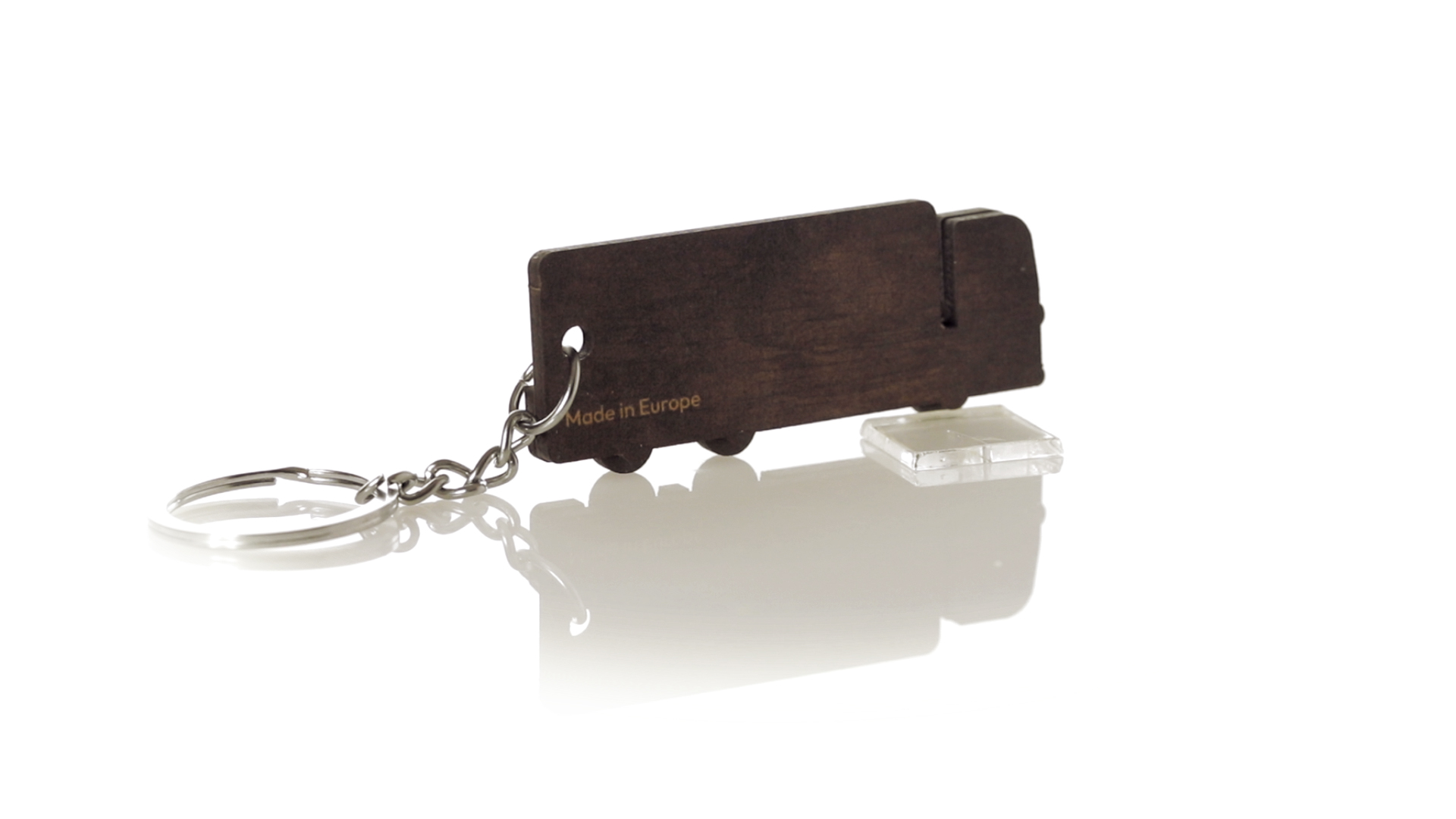 Schlüsselanhänger mit Lkw-Motiv, aus Naturholz und mit Original-Bicolor-Finish. Grosse Branding-Fläche, mit Metallring und -kette und Made in Europe-Logo.