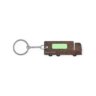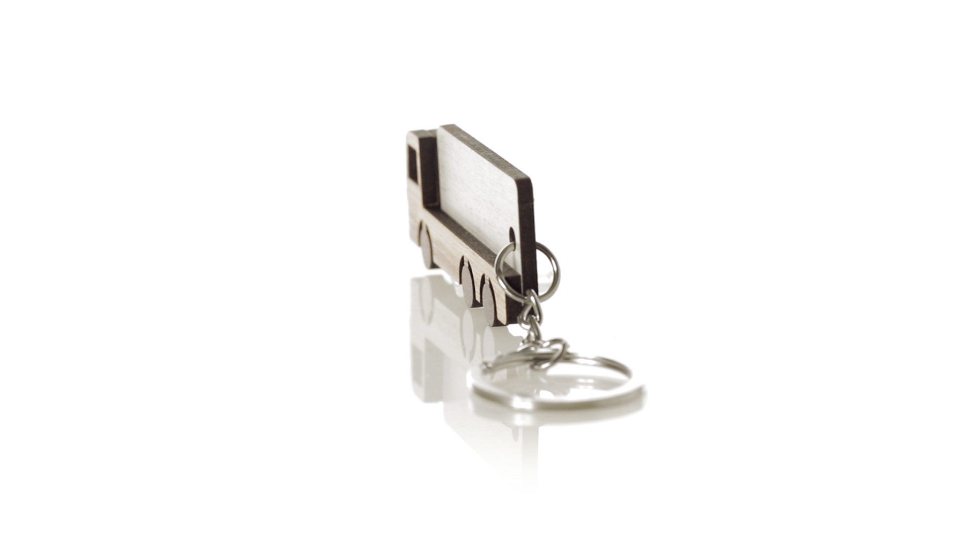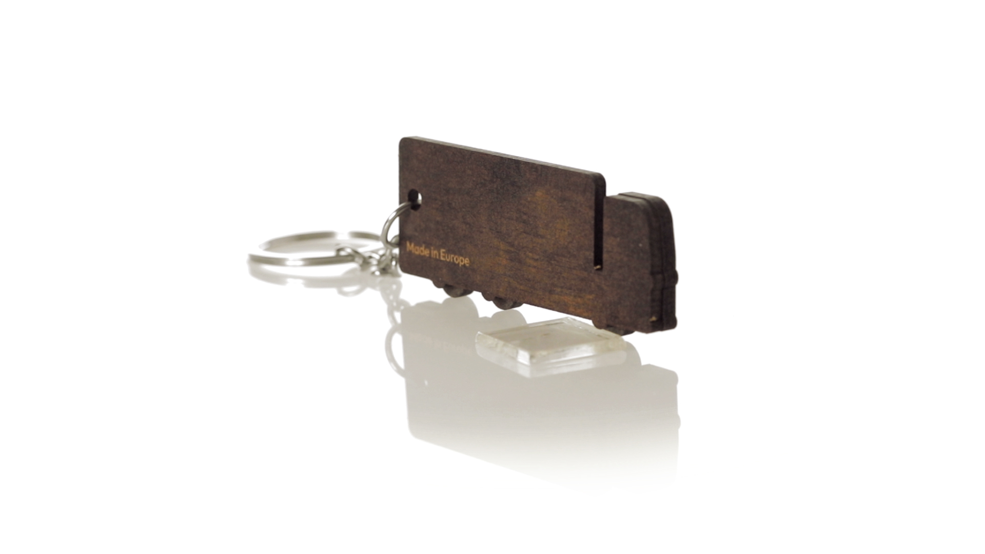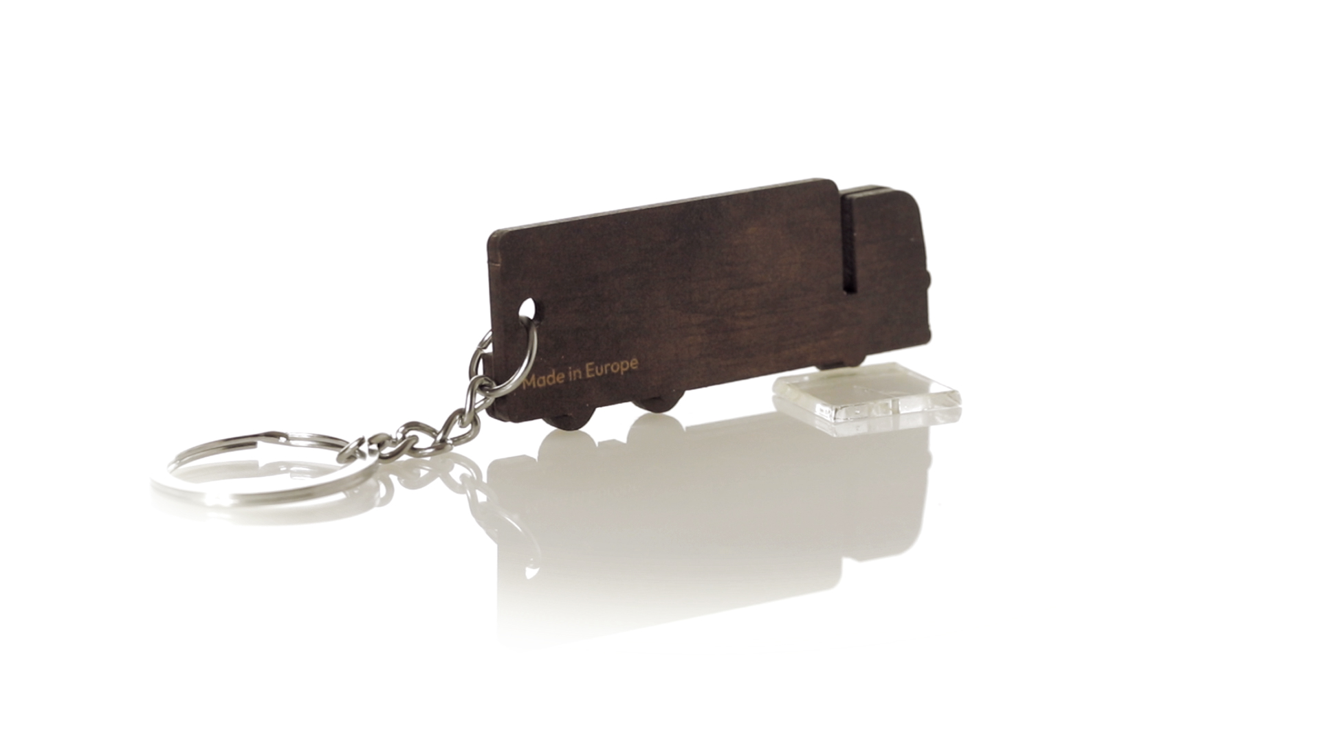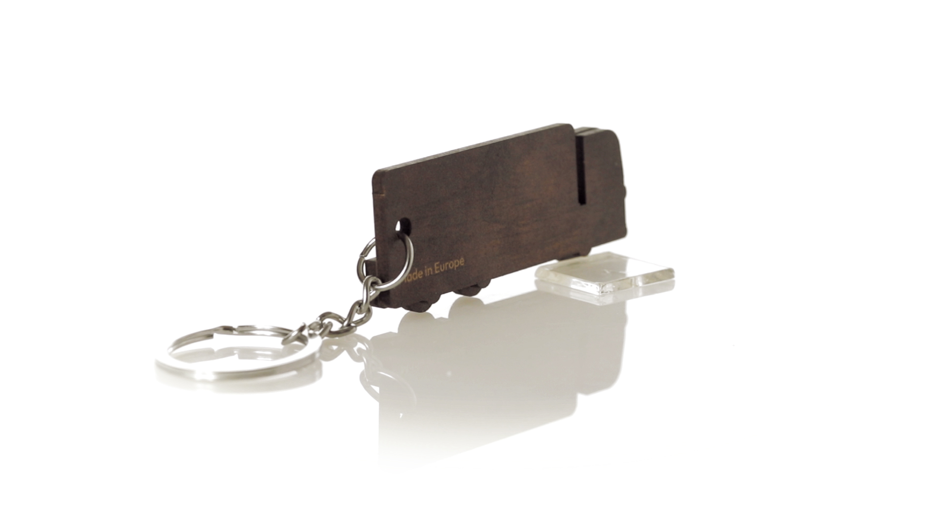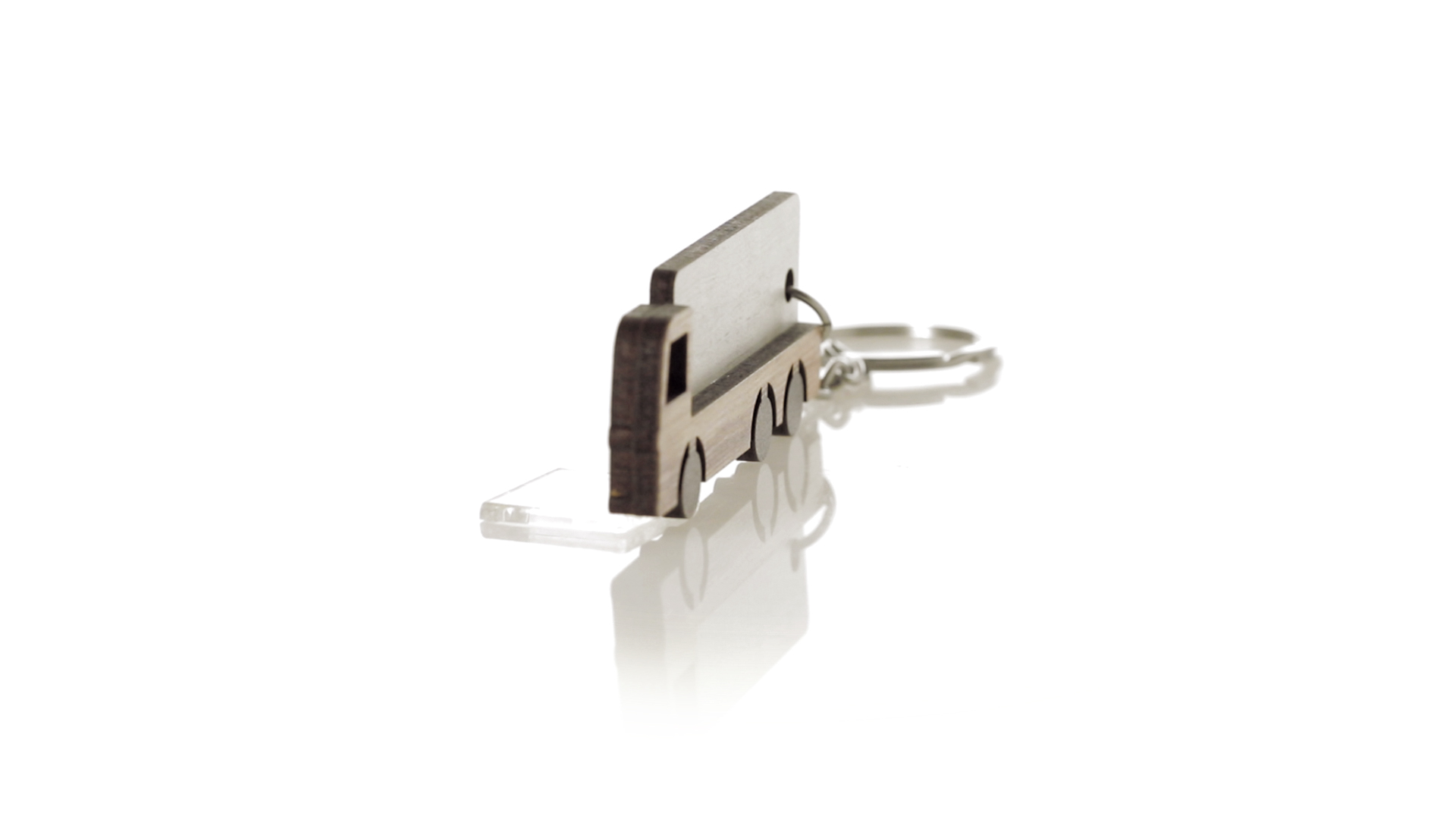 Schlüsselanhänger mit Lkw-Motiv, aus Naturholz und mit Original-Bicolor-Finish. Grosse Branding-Fläche, mit Metallring und -kette und Made in Europe-Logo.