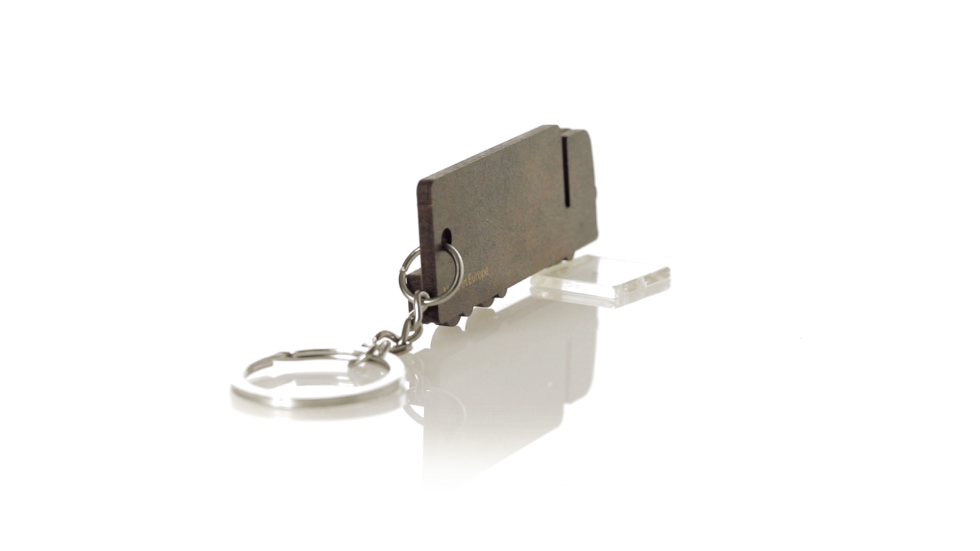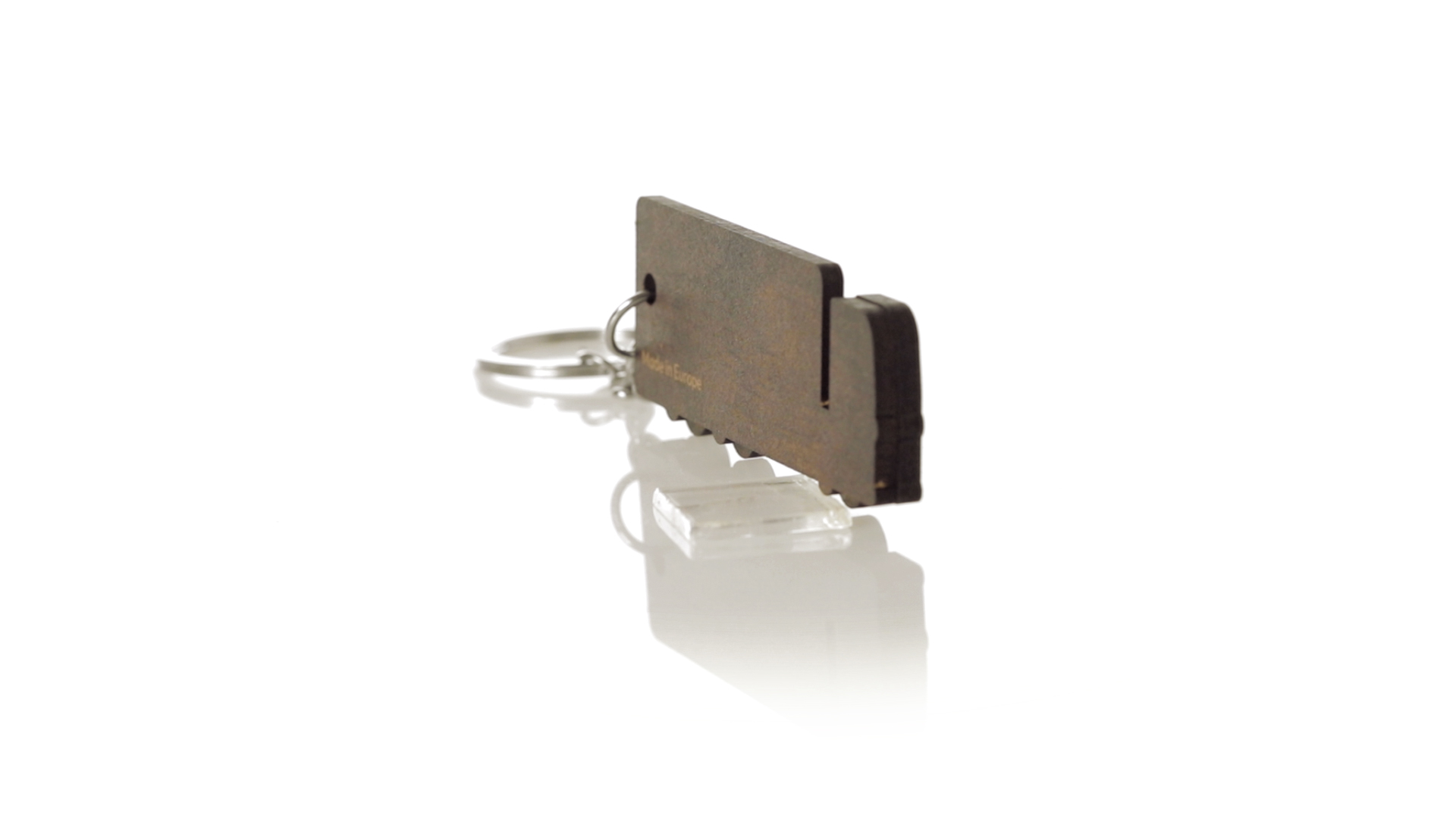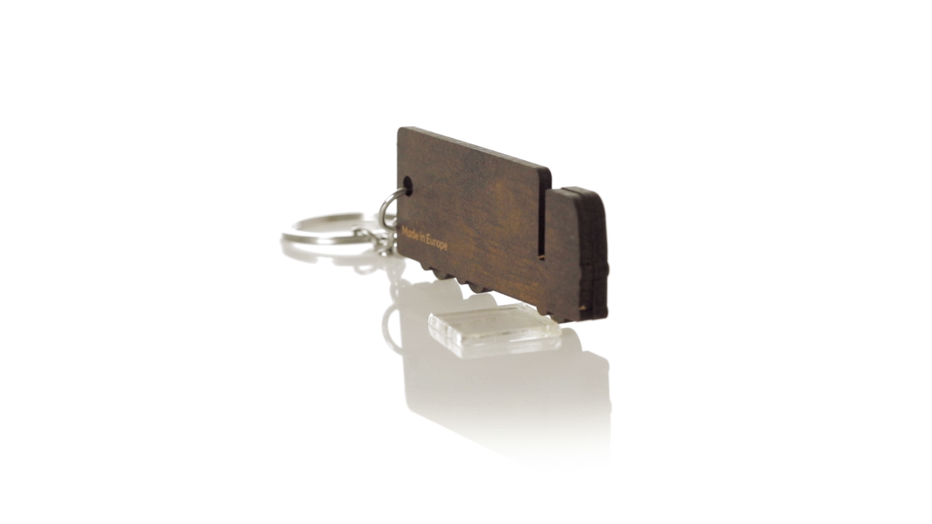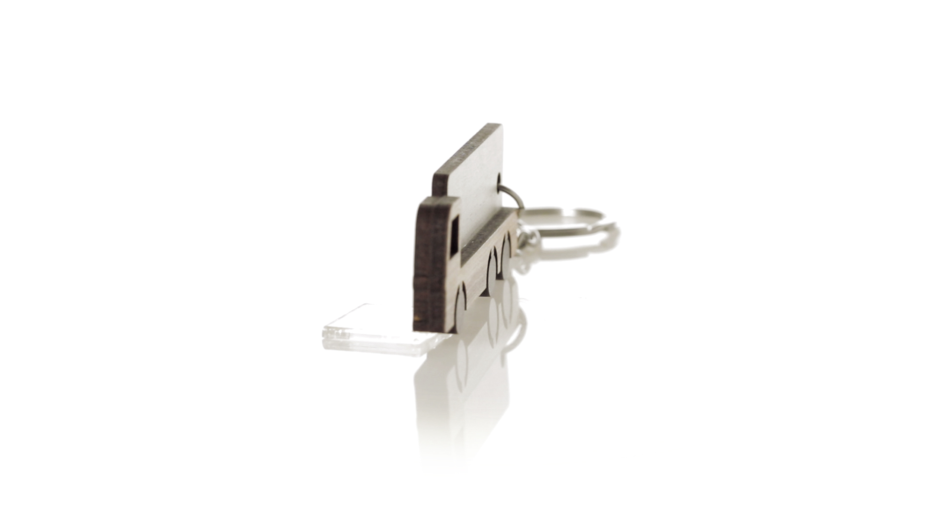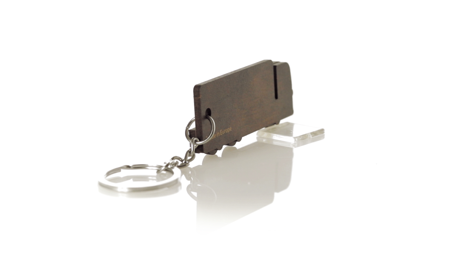 Schlüsselanhänger mit Lkw-Motiv, aus Naturholz und mit Original-Bicolor-Finish. Grosse Branding-Fläche, mit Metallring und -kette und Made in Europe-Logo.