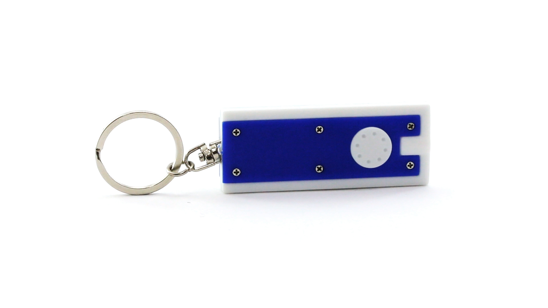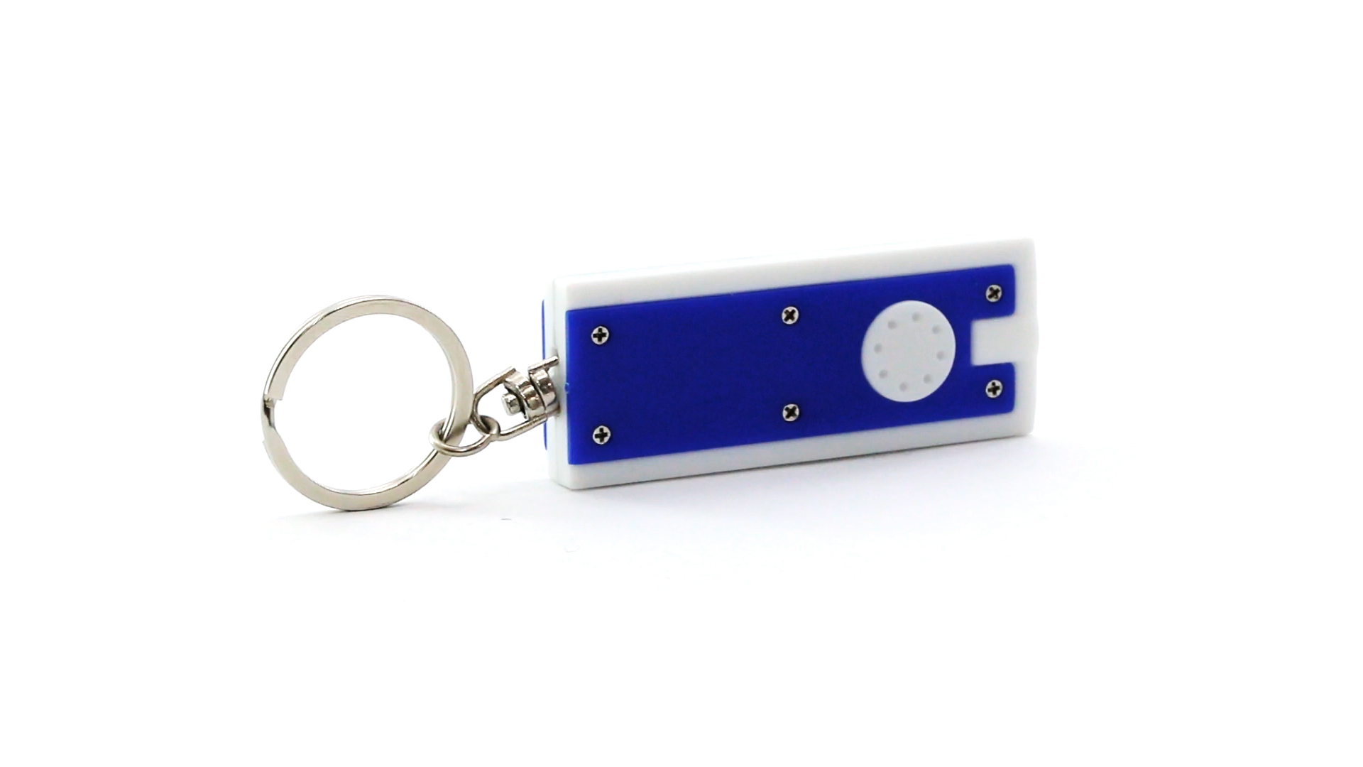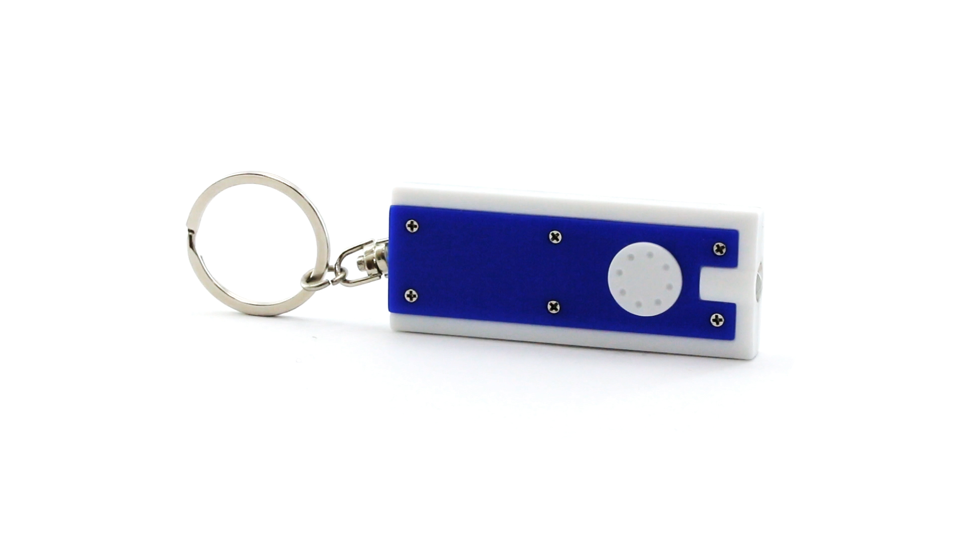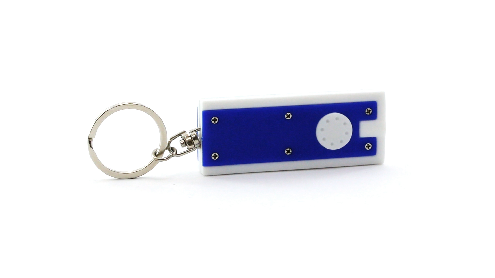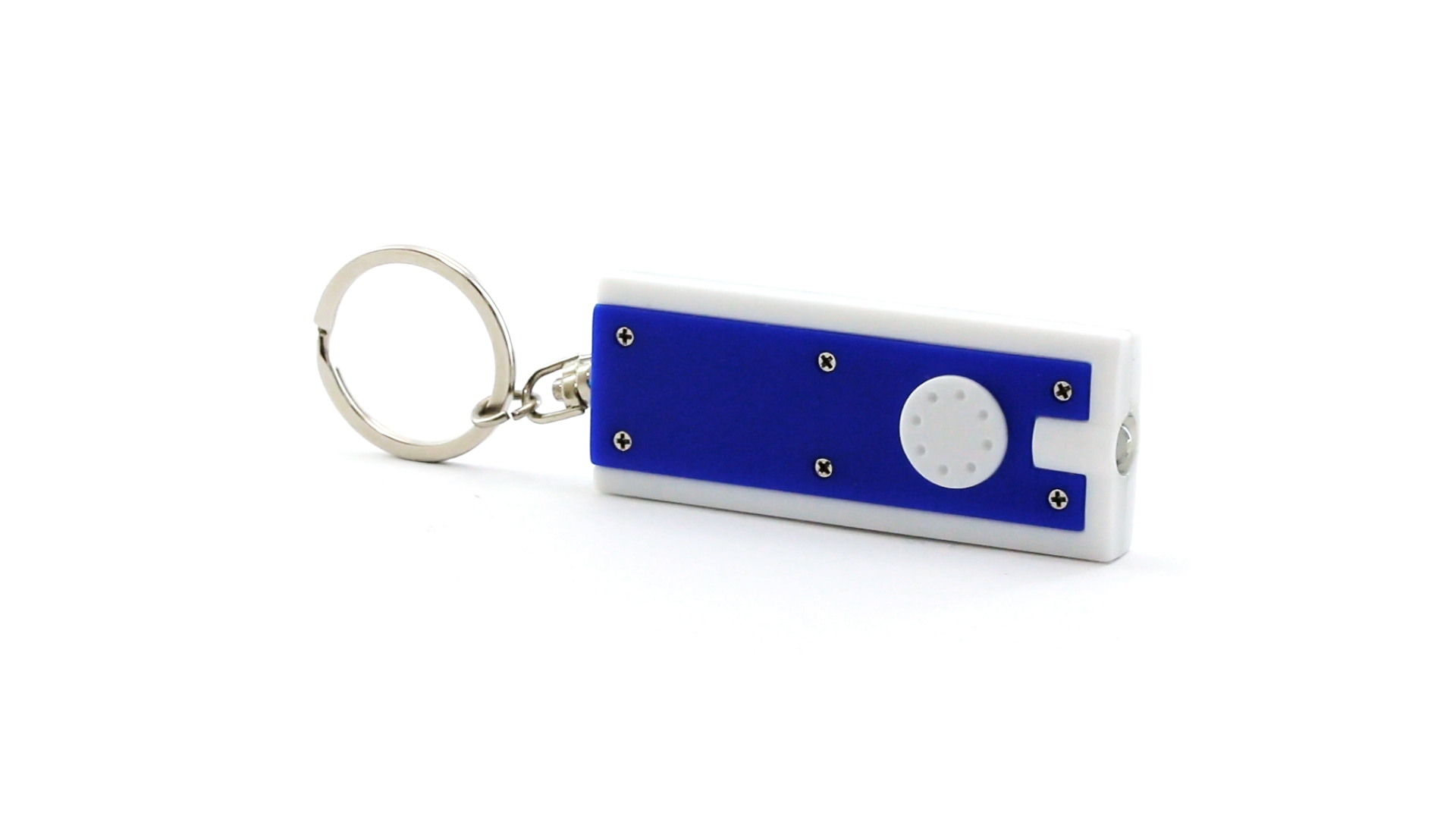LED-Taschenlampe mit Schlüsselring und extra flachem Design in glänzenden Farben. Knopfzellen inklusive.