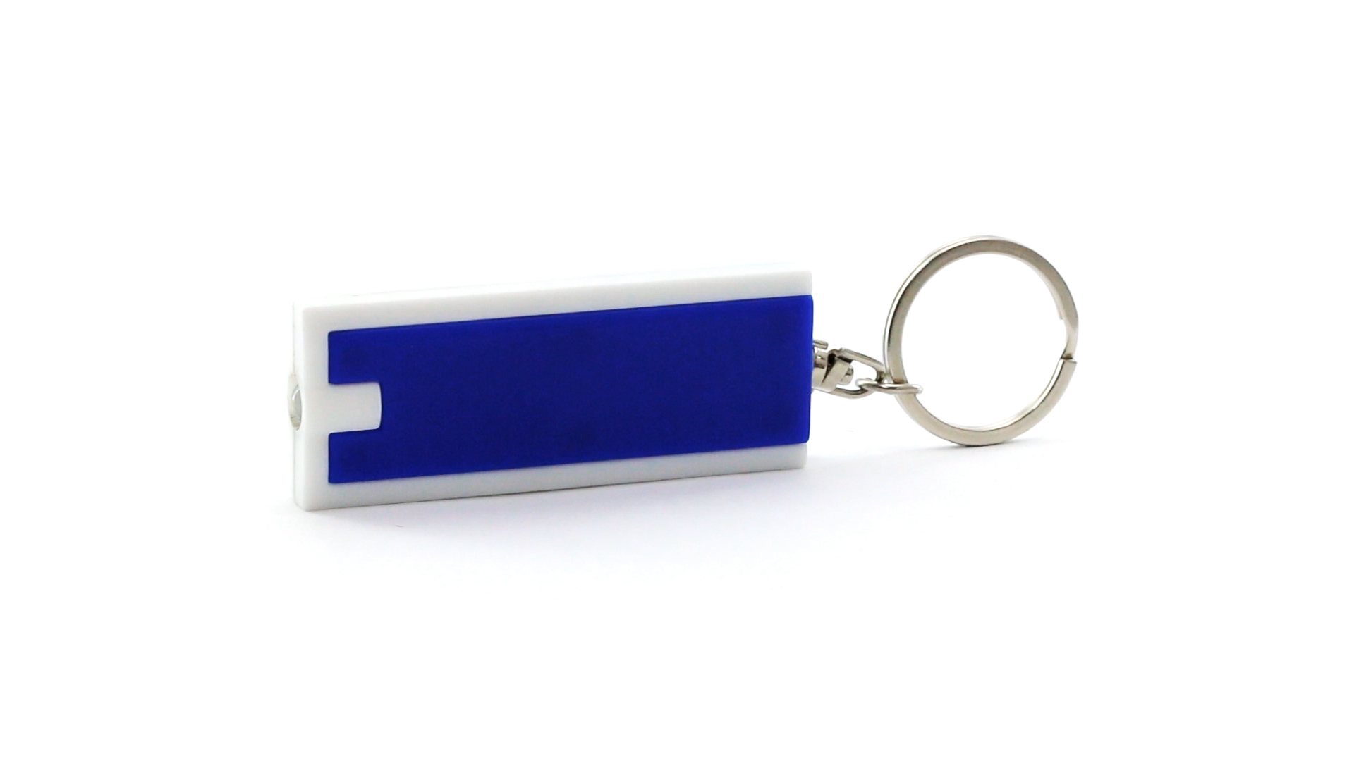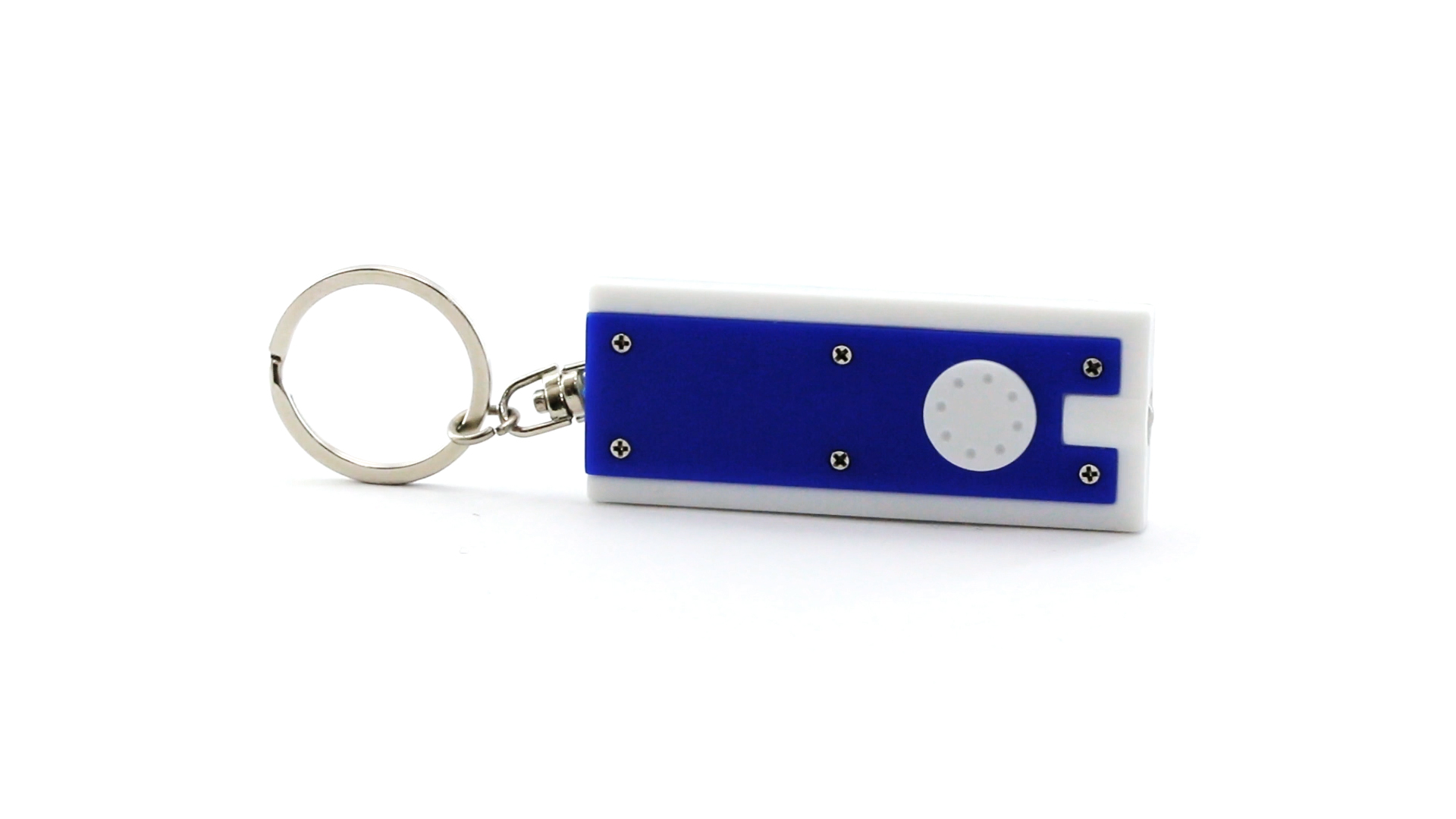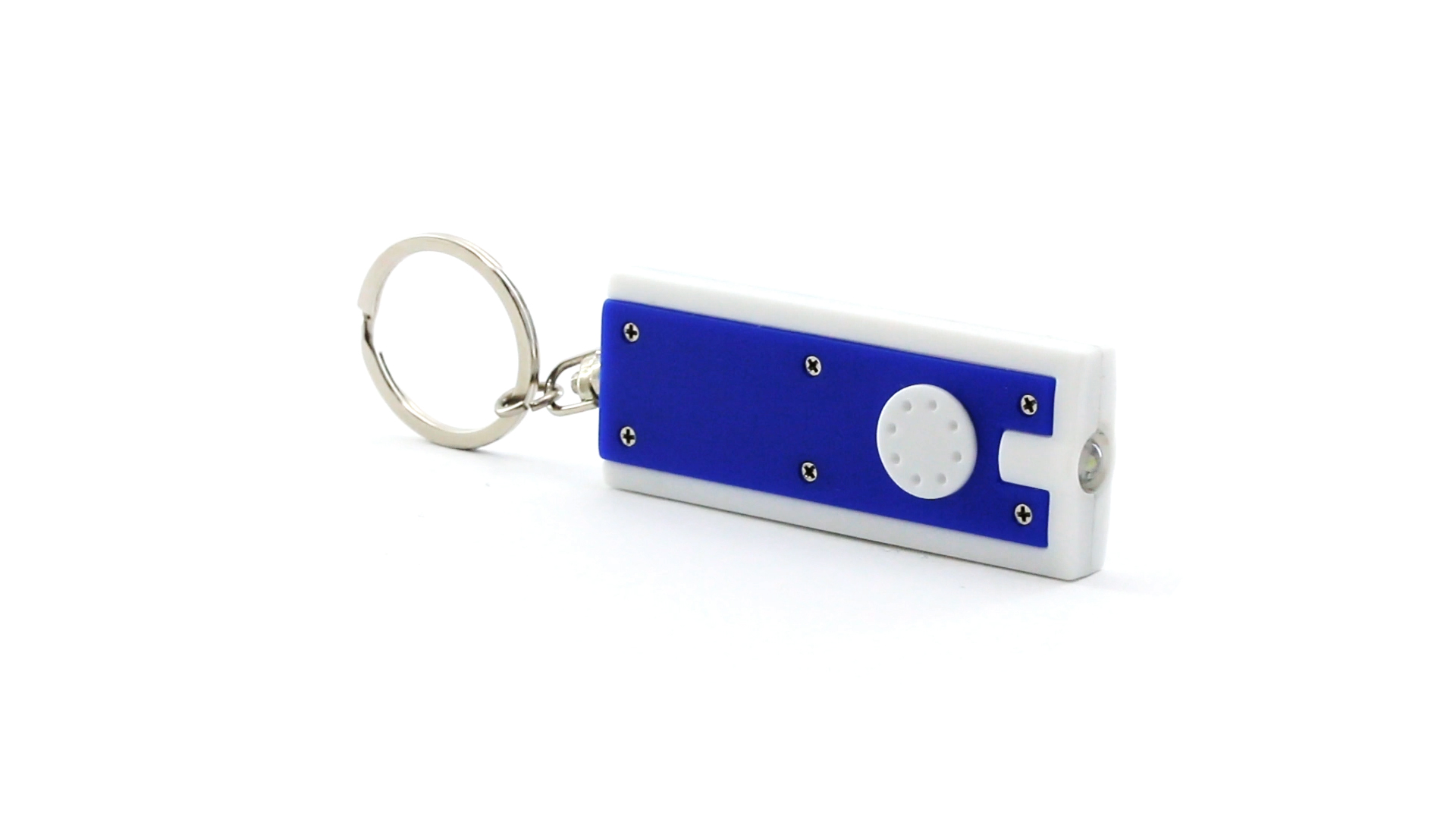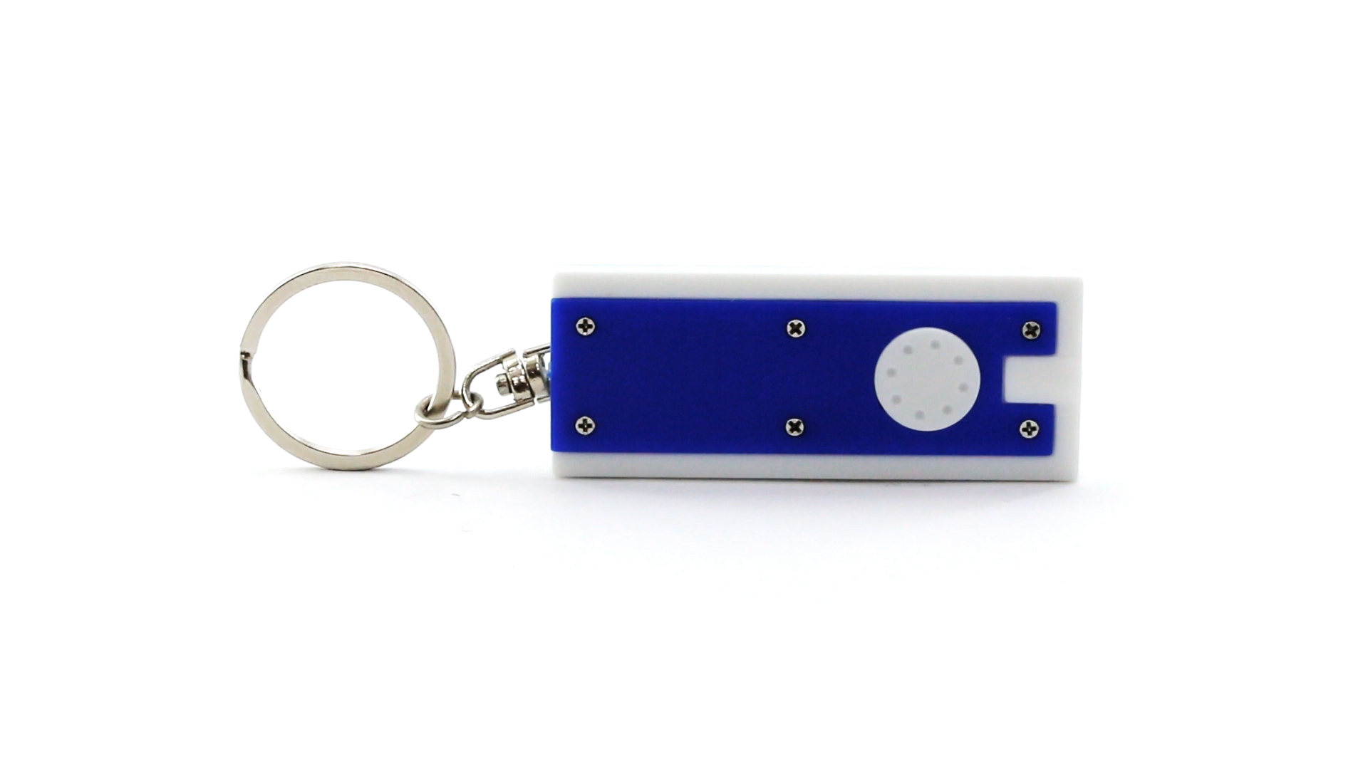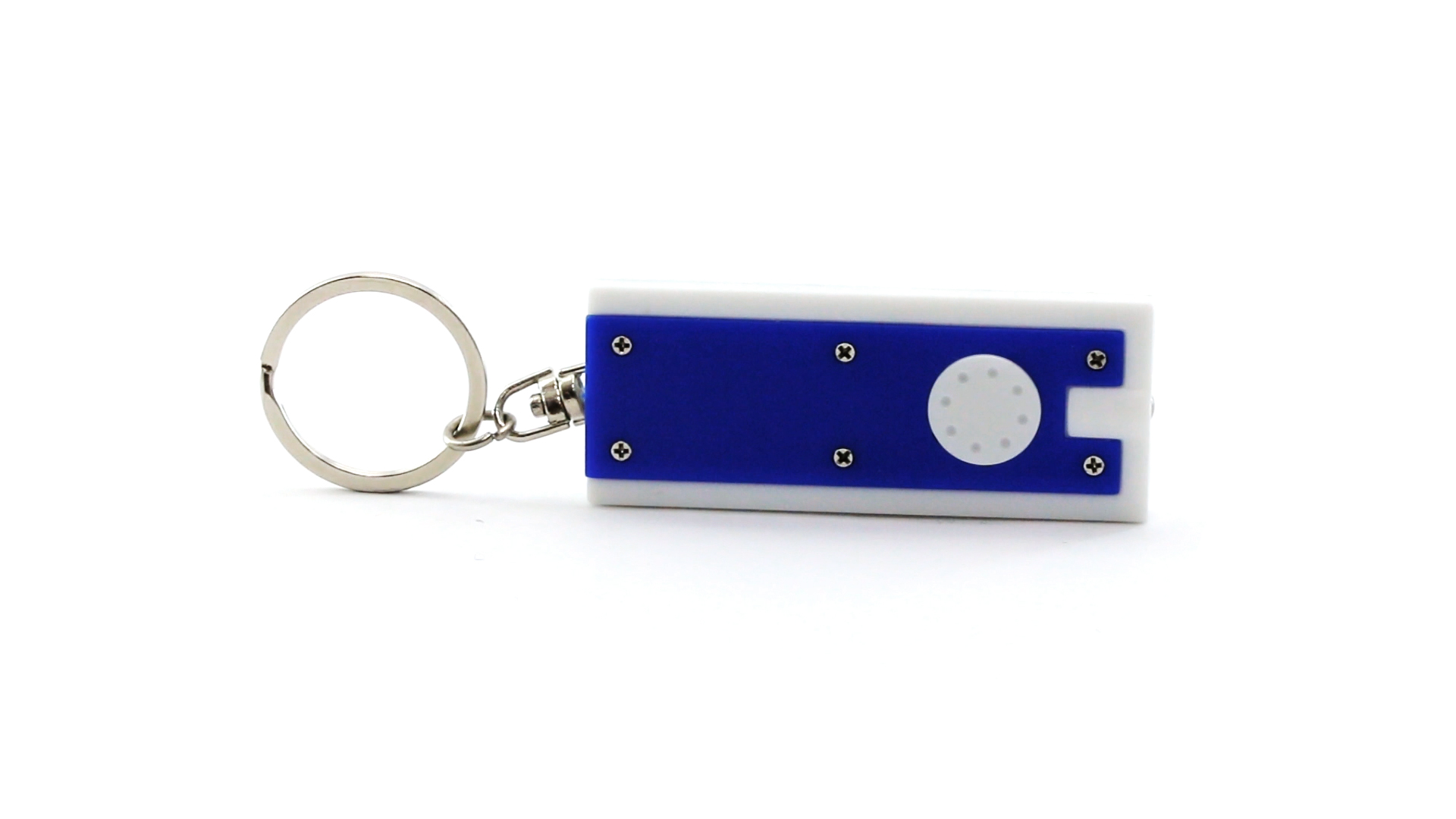 LED-Taschenlampe mit Schlüsselring und extra flachem Design in glänzenden Farben. Knopfzellen inklusive.