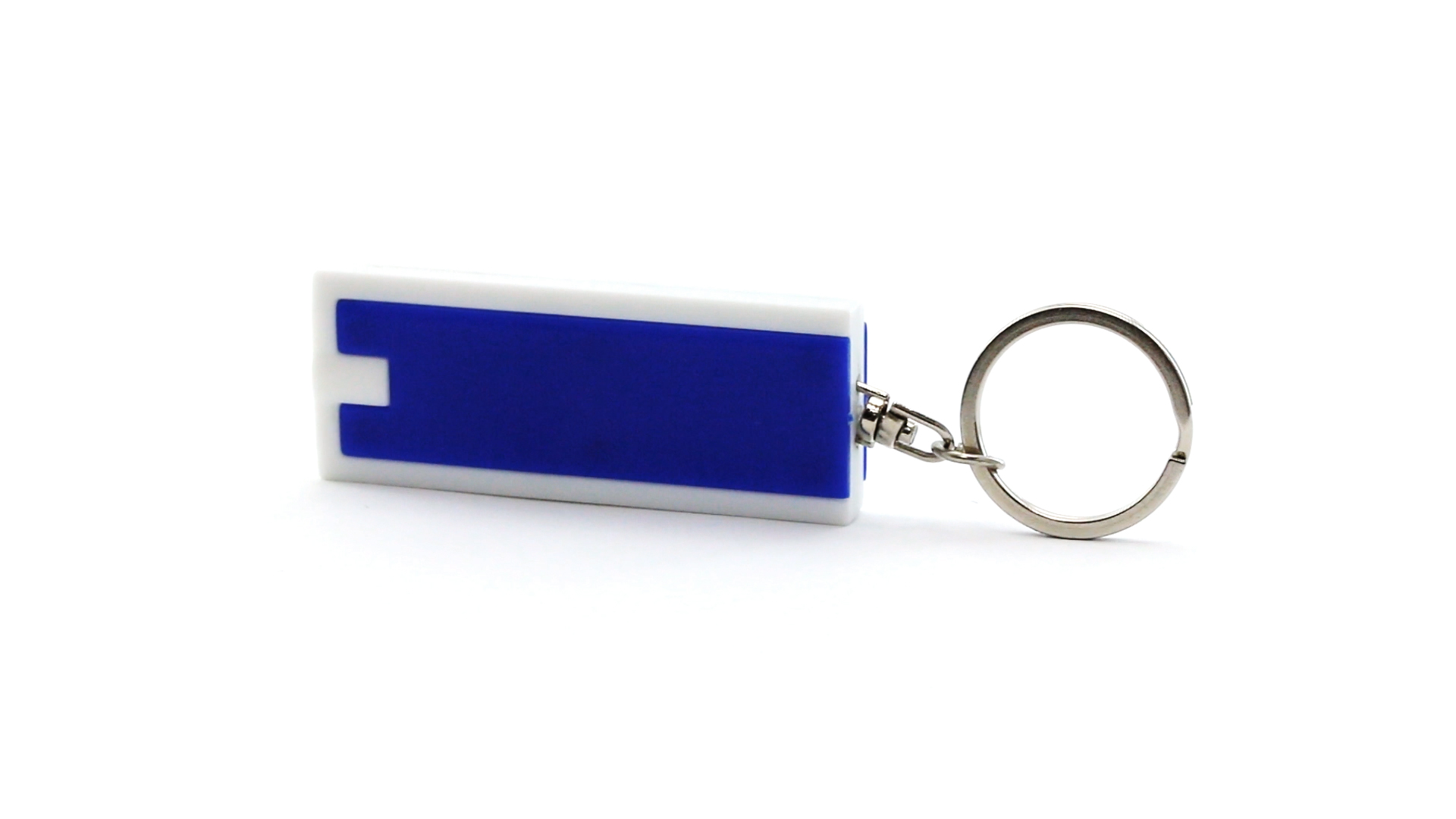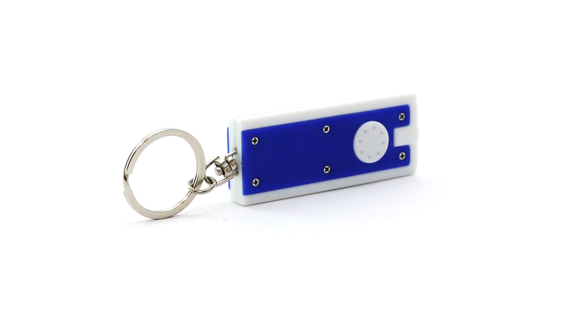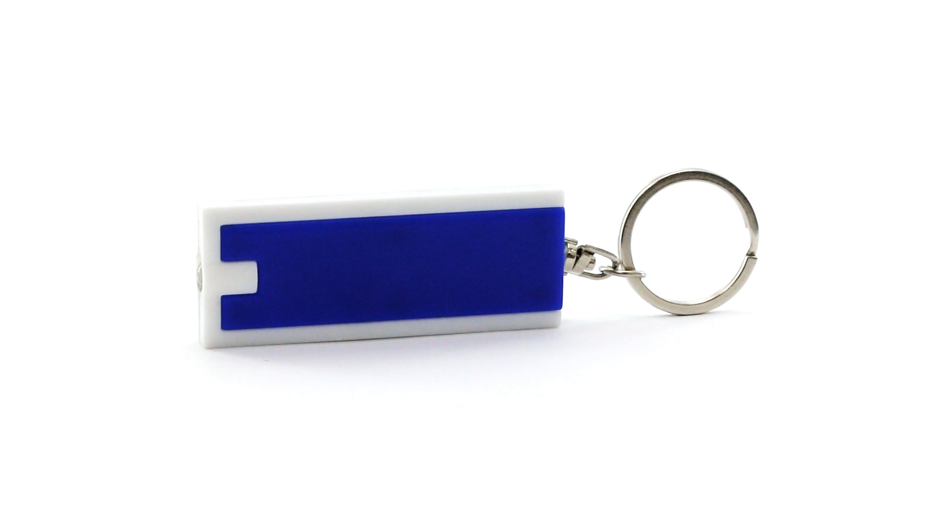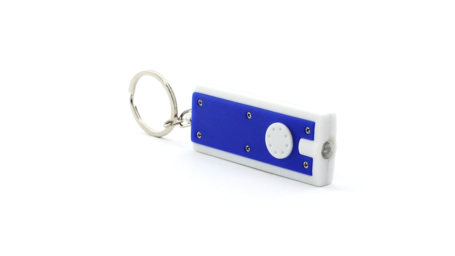 LED-Taschenlampe mit Schlüsselring und extra flachem Design in glänzenden Farben. Knopfzellen inklusive.
