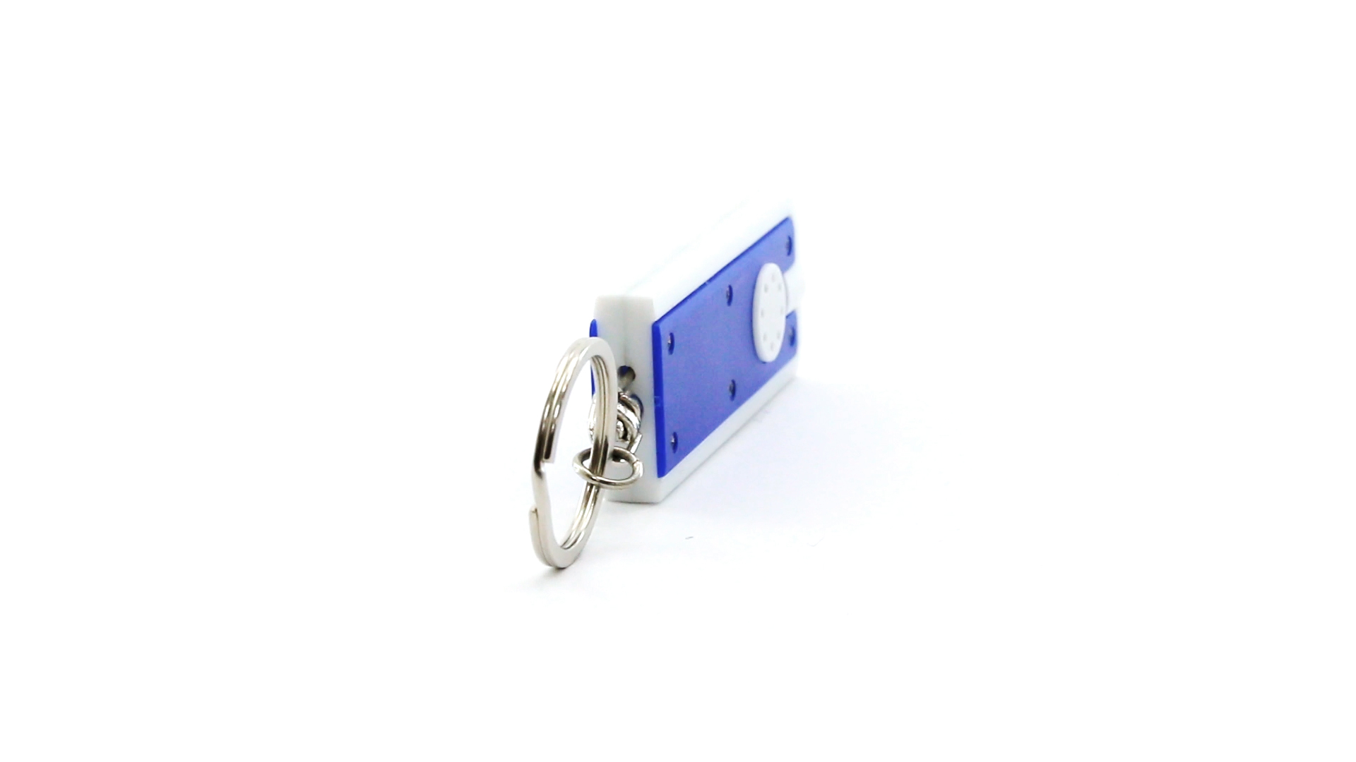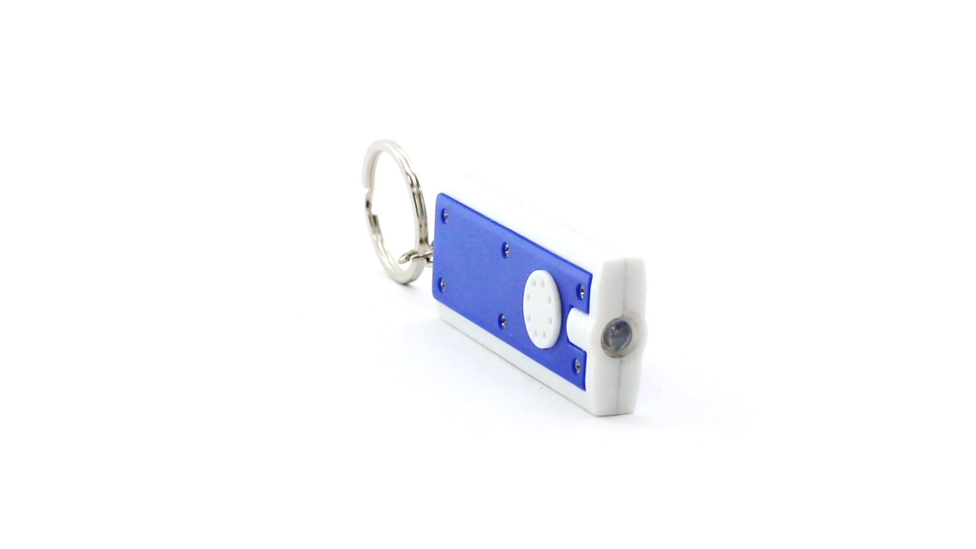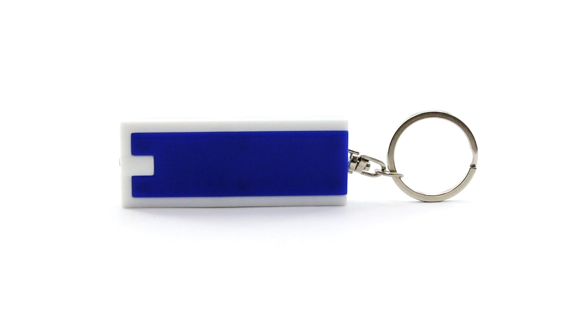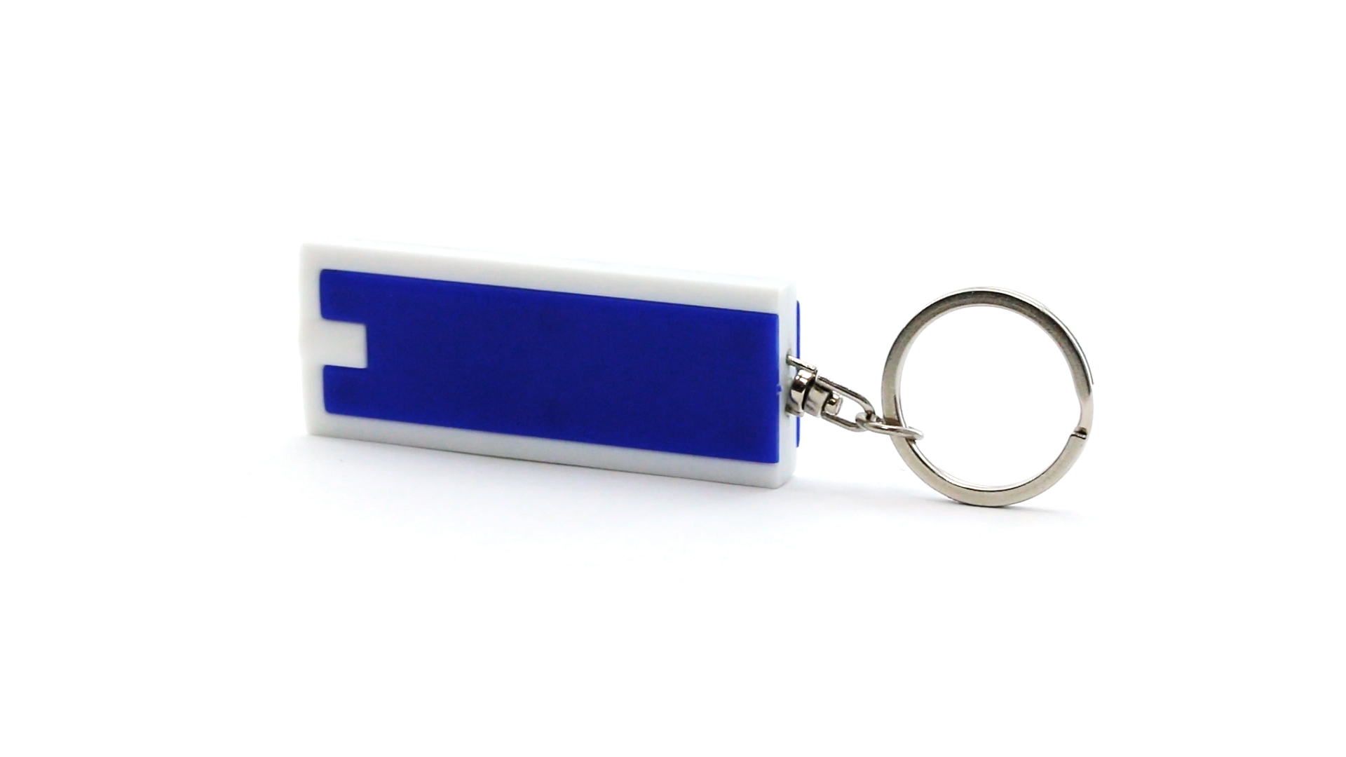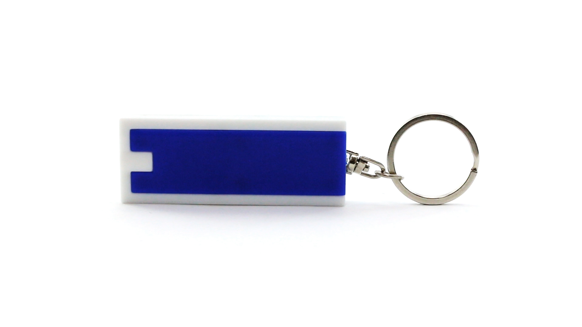 LED-Taschenlampe mit Schlüsselring und extra flachem Design in glänzenden Farben. Knopfzellen inklusive.