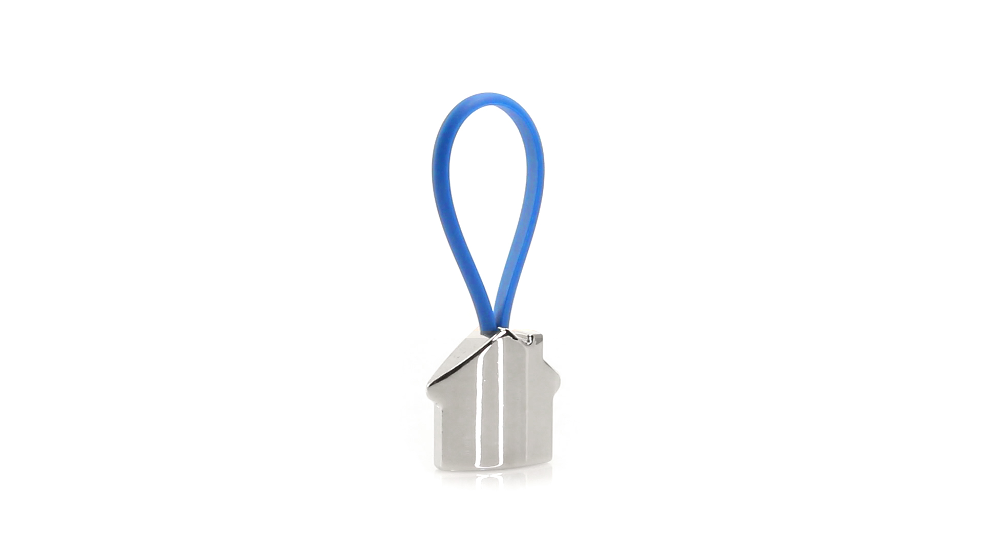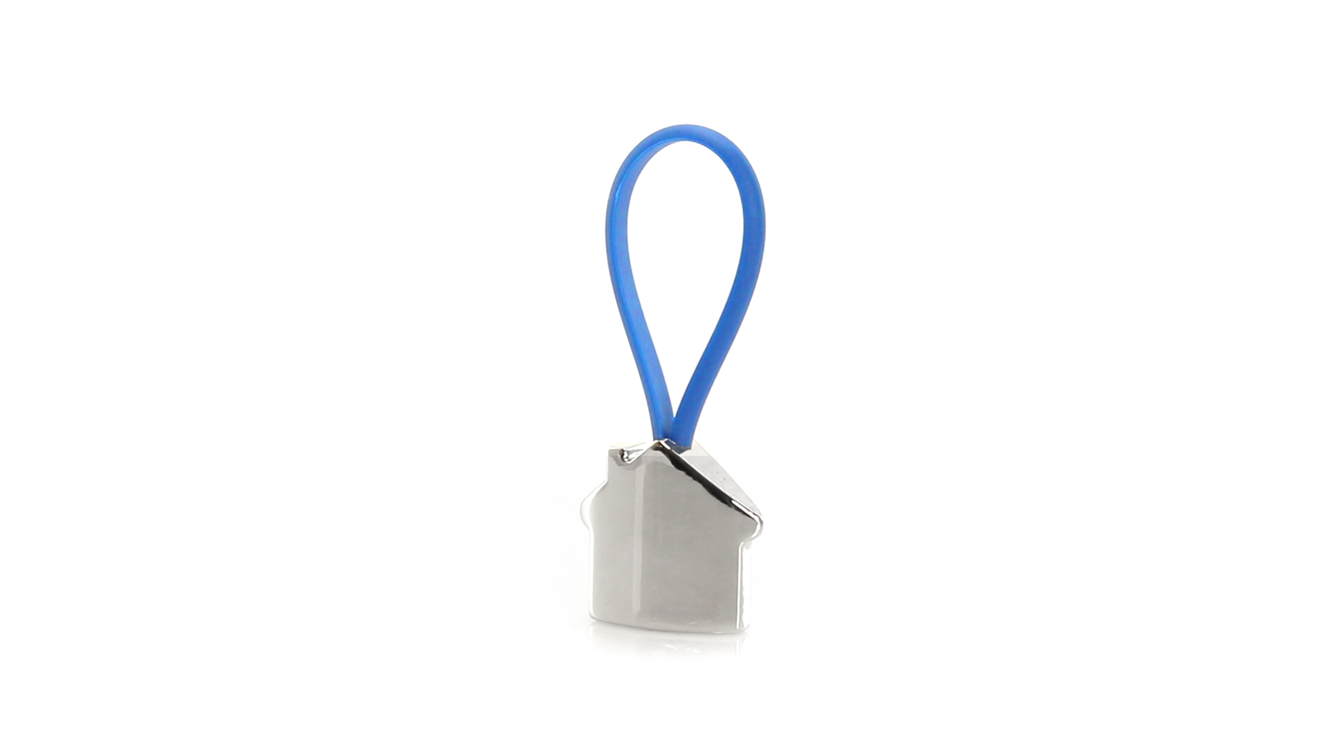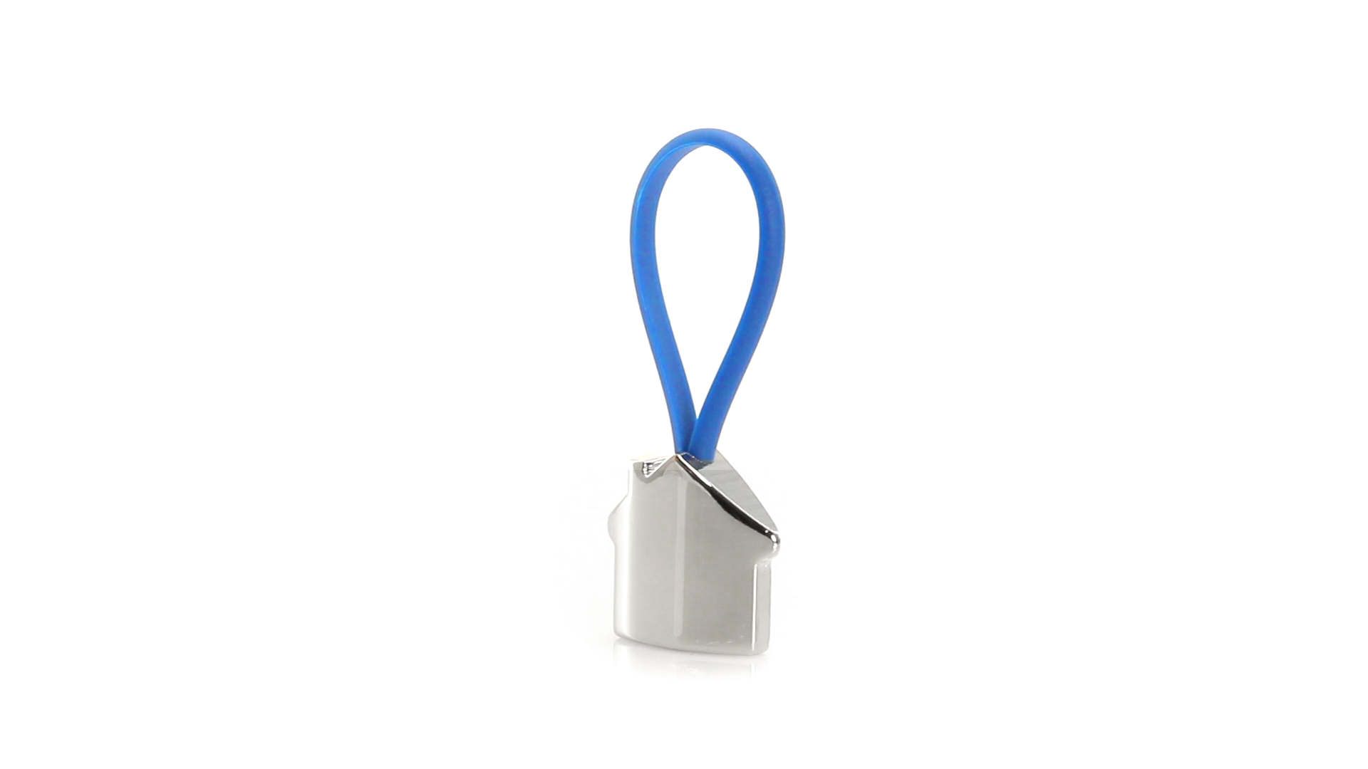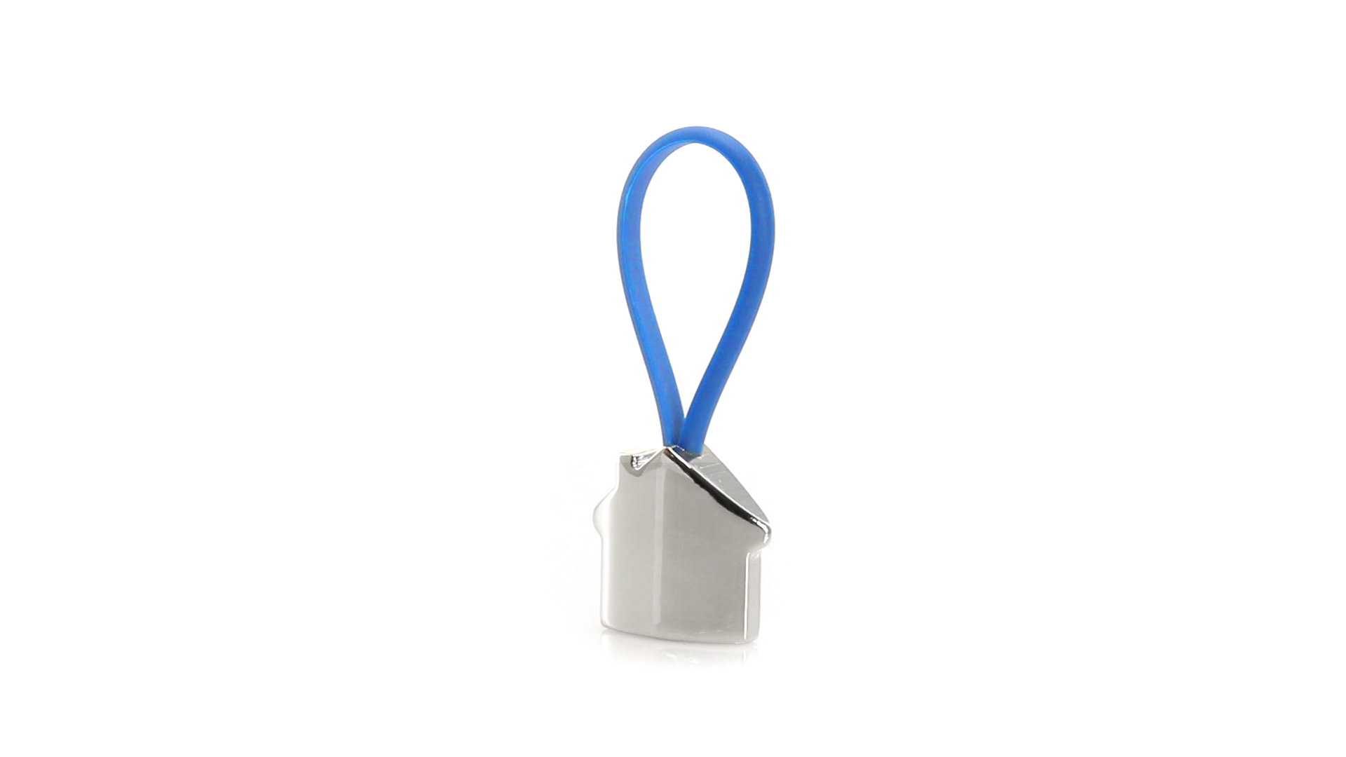 Metall-Schlüsselanhänger mit elegantem Haus-Design in 3D. Mit Gummiband in verschiedenen lebendigen Farben für die Befestigung der Schlüssel.