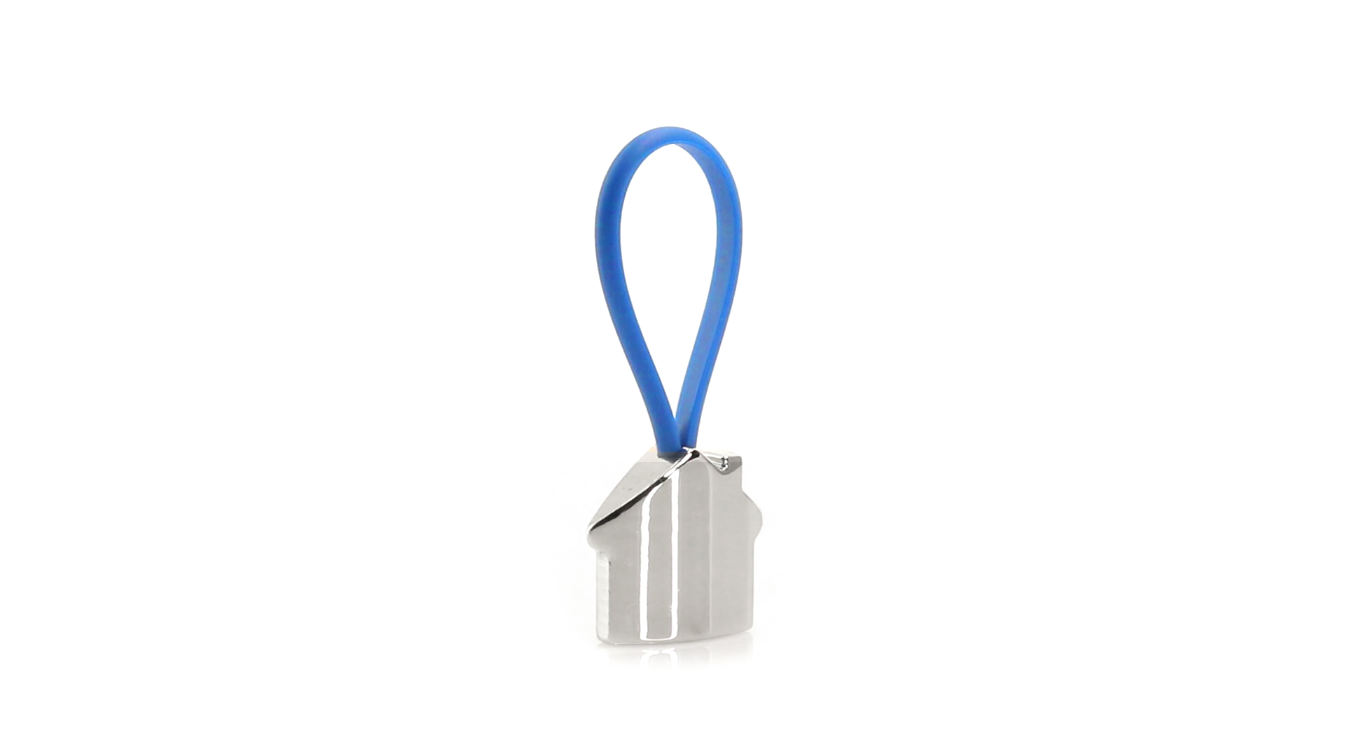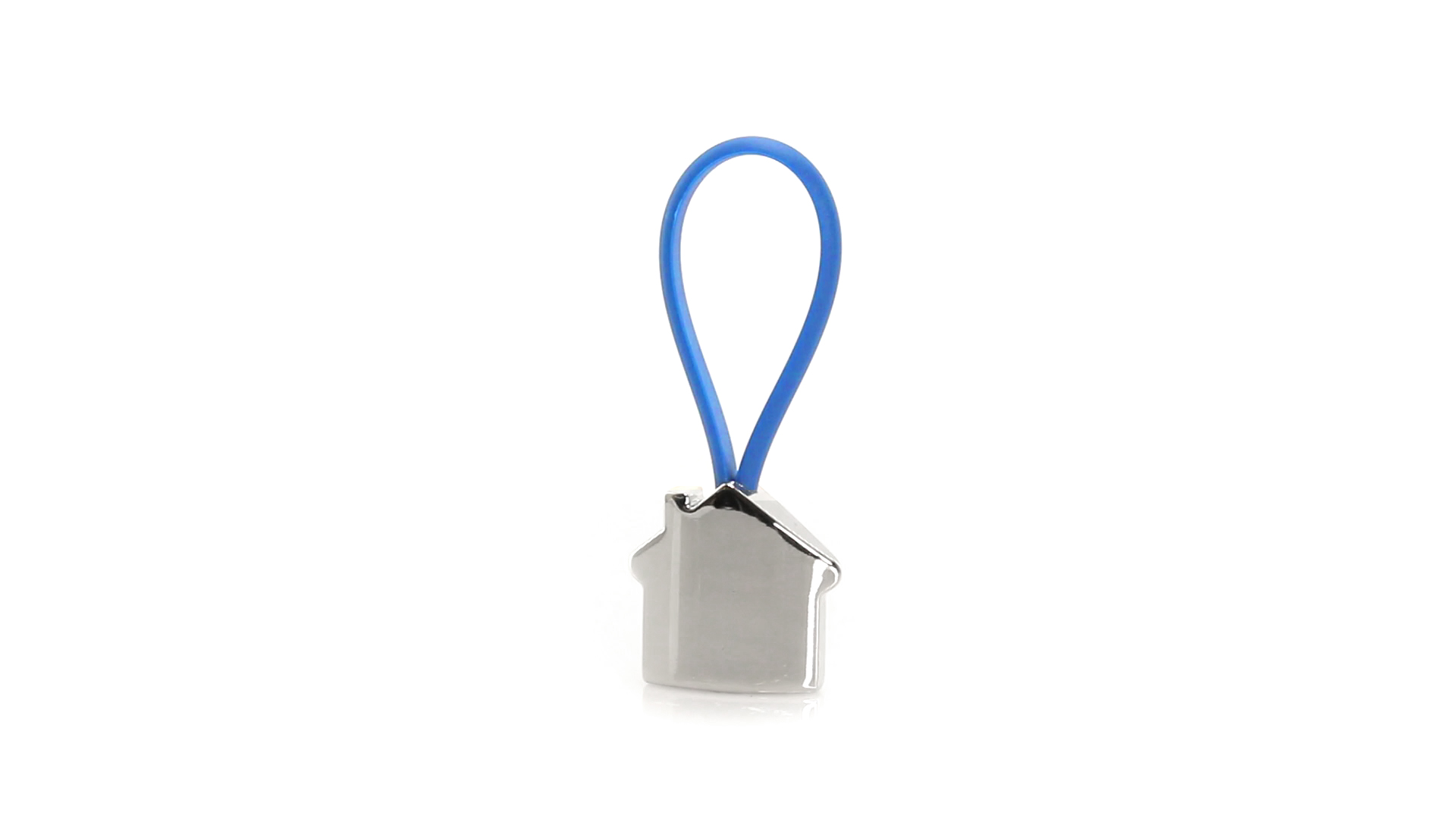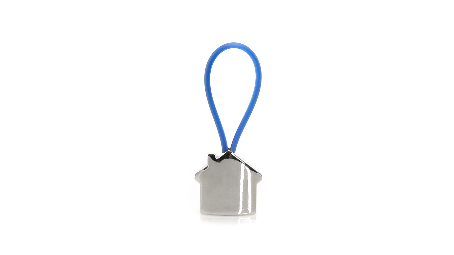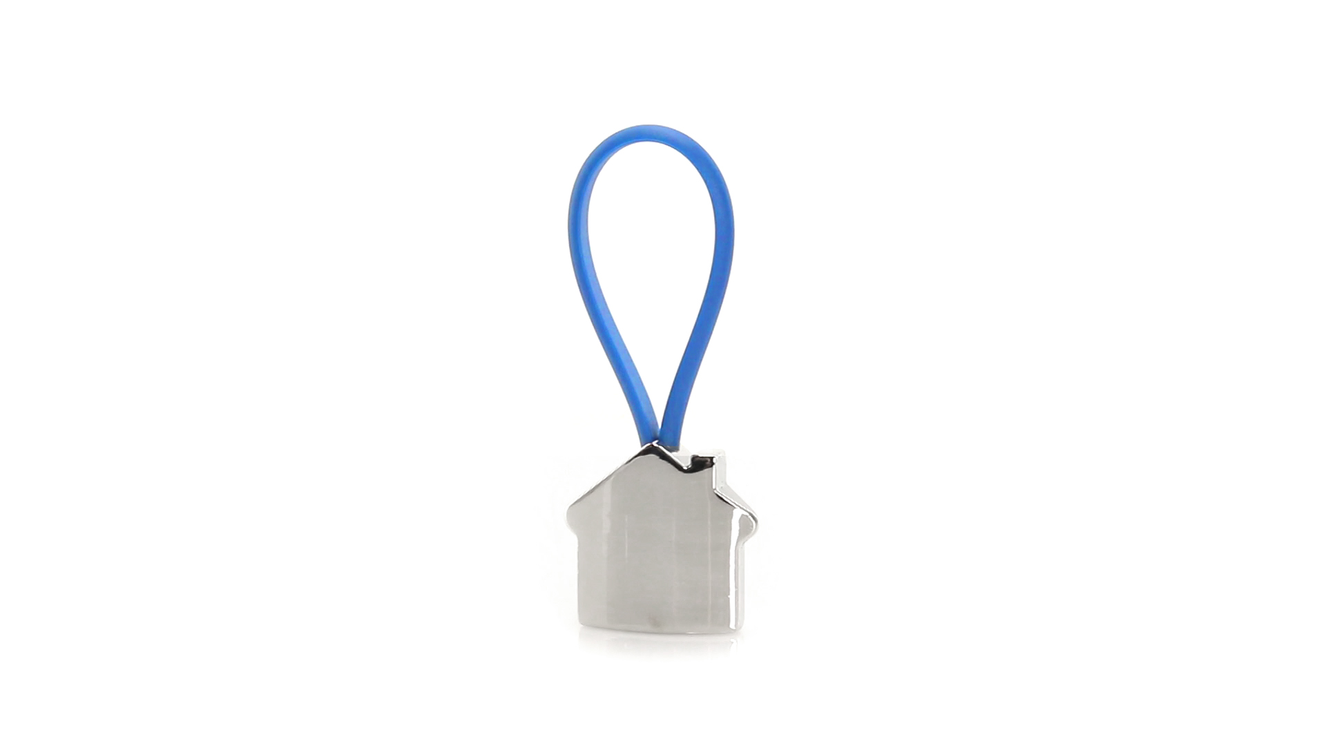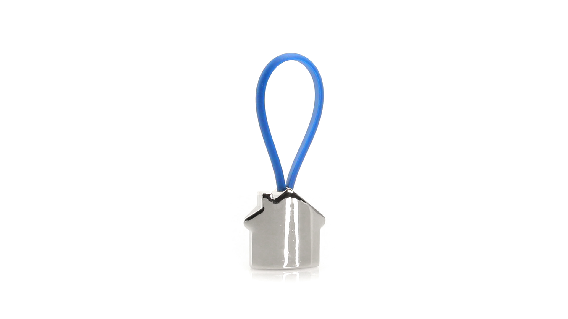 Metall-Schlüsselanhänger mit elegantem Haus-Design in 3D. Mit Gummiband in verschiedenen lebendigen Farben für die Befestigung der Schlüssel.