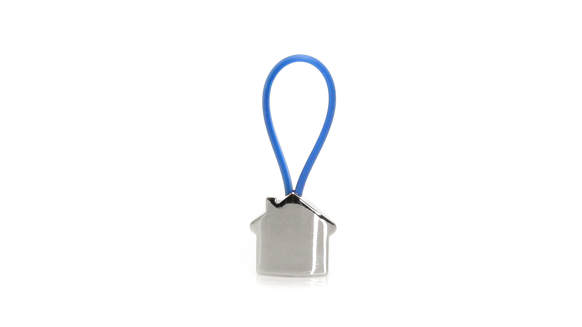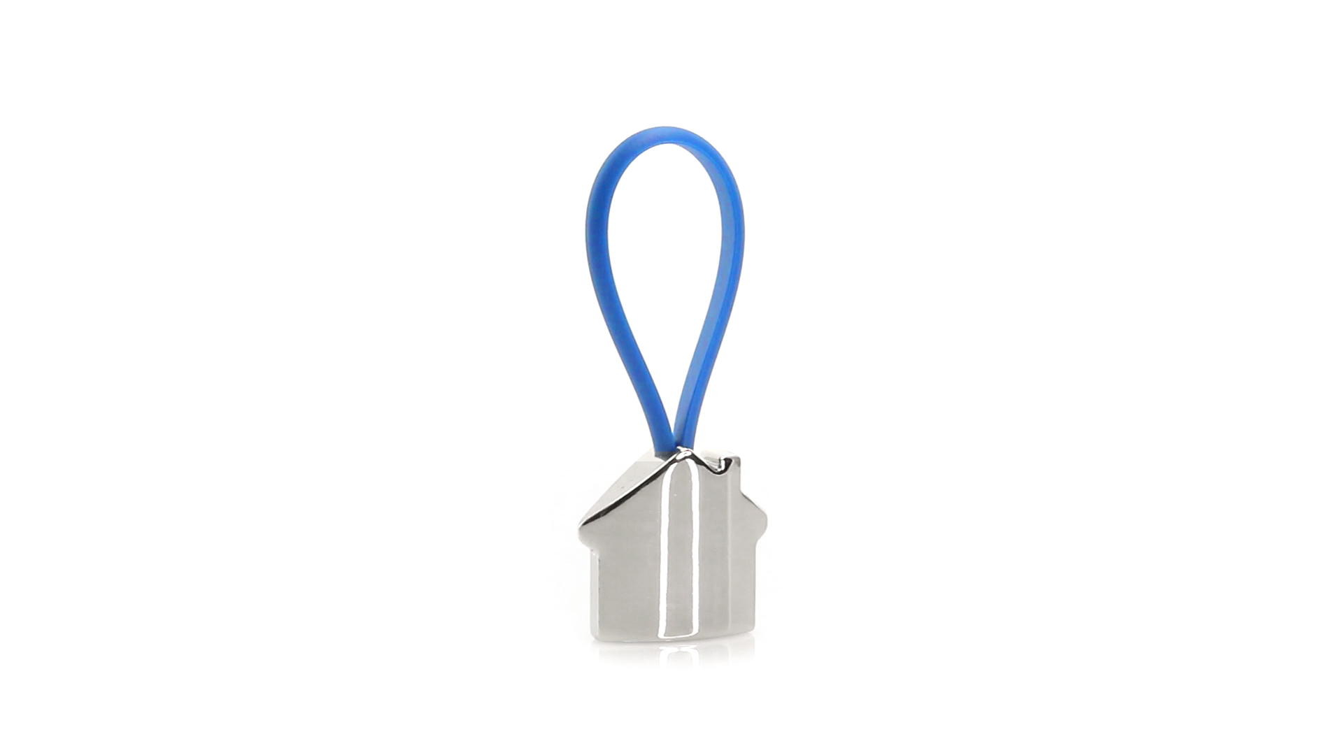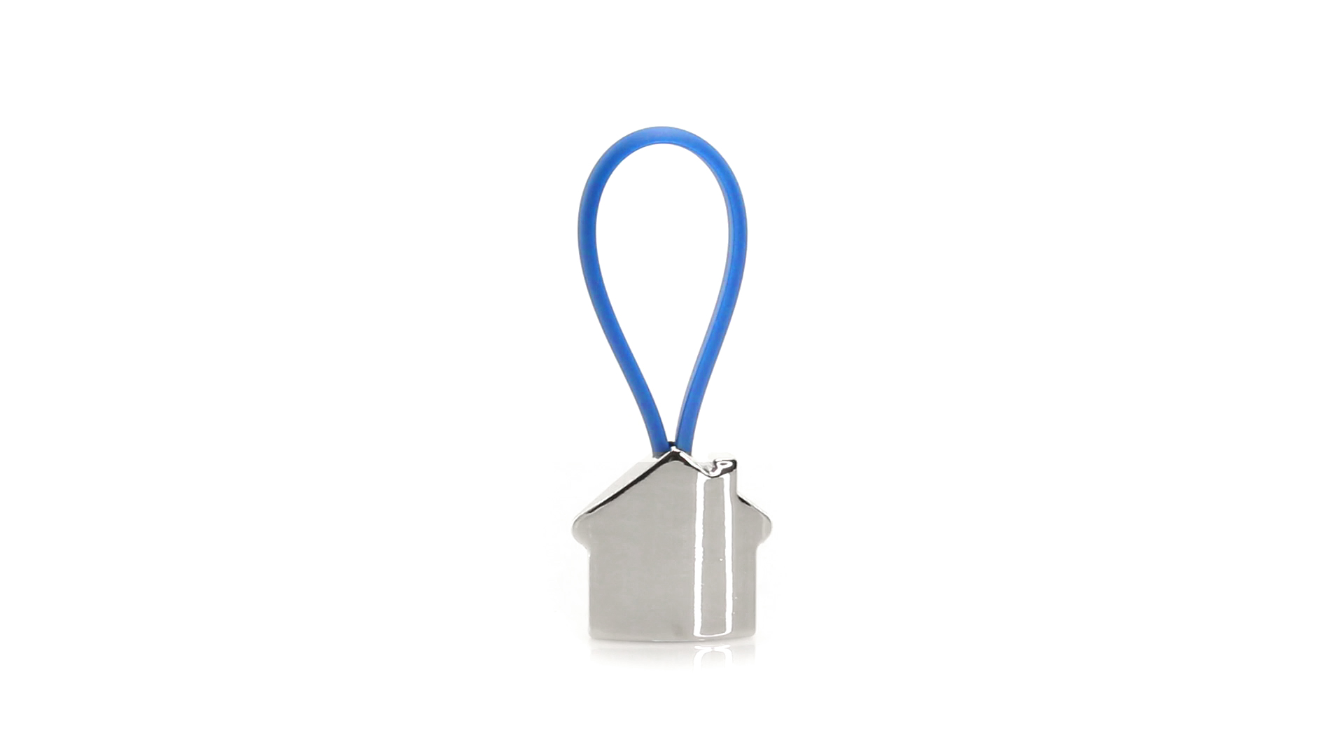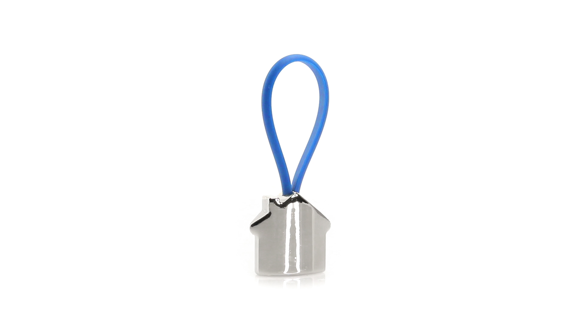 Metall-Schlüsselanhänger mit elegantem Haus-Design in 3D. Mit Gummiband in verschiedenen lebendigen Farben für die Befestigung der Schlüssel.