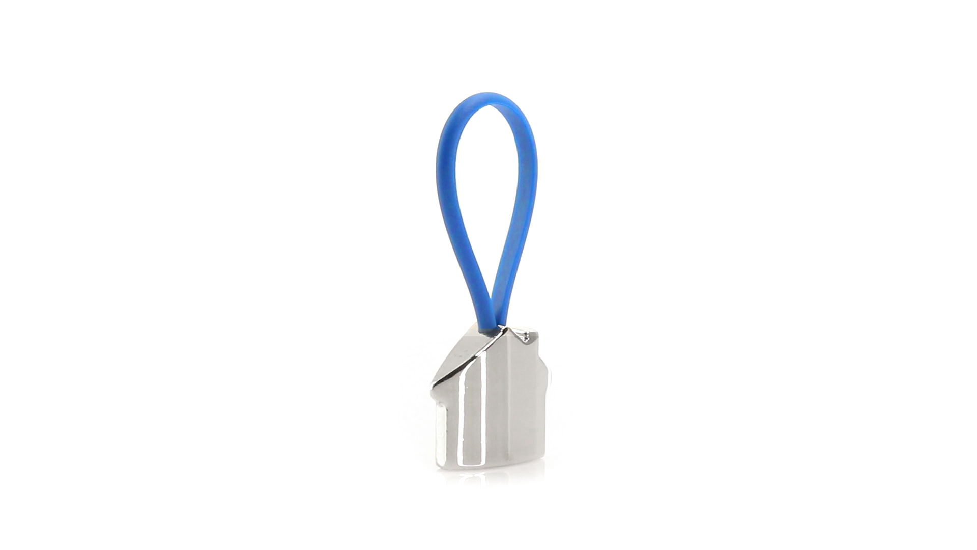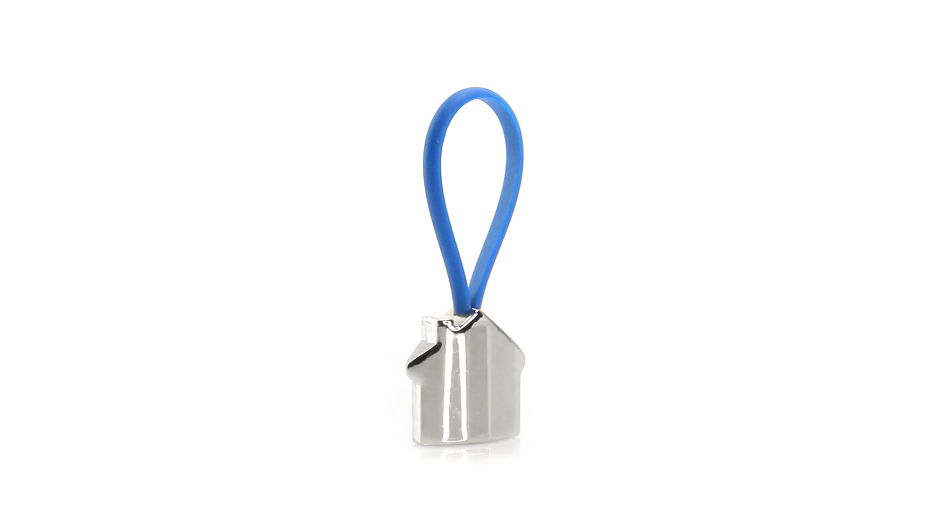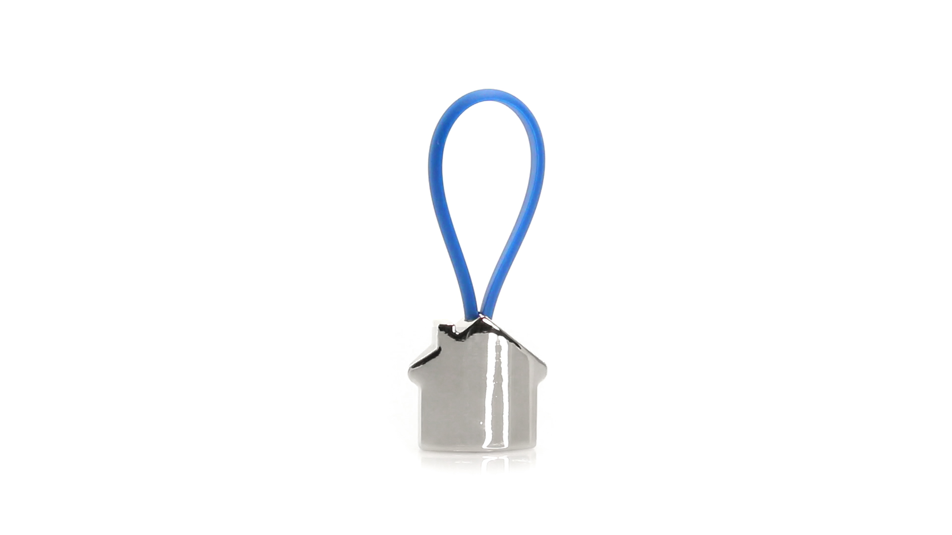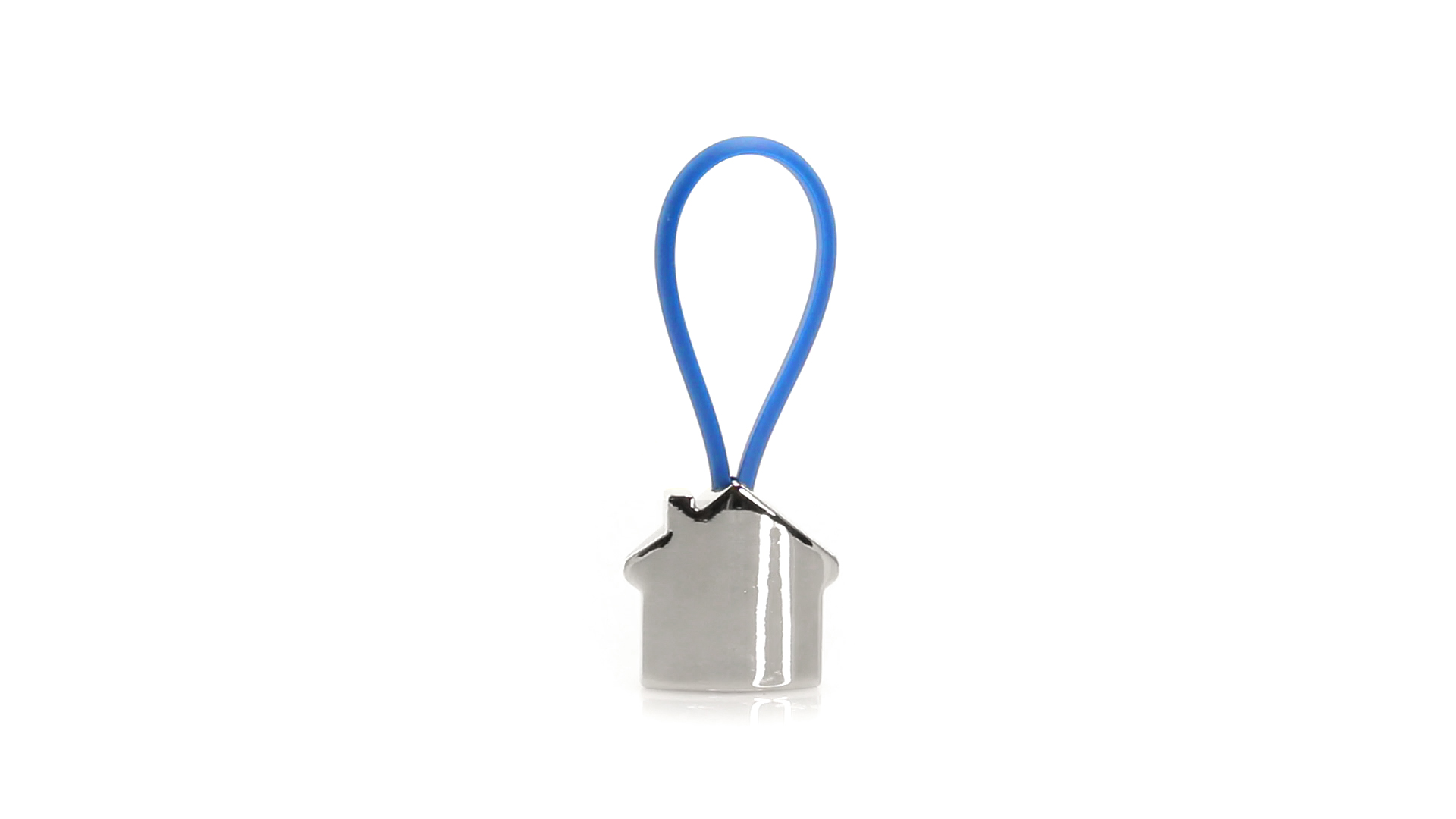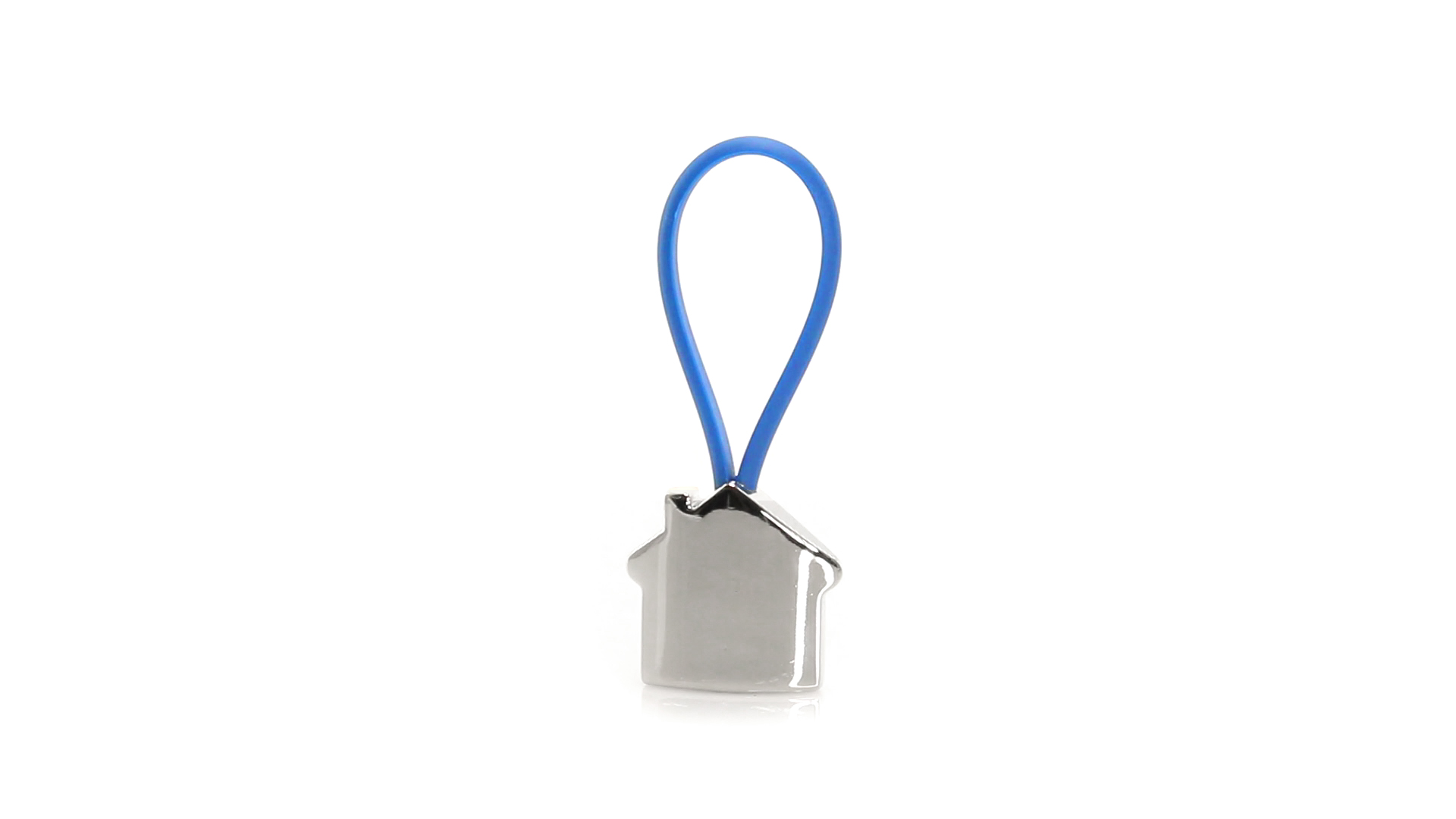 Metall-Schlüsselanhänger mit elegantem Haus-Design in 3D. Mit Gummiband in verschiedenen lebendigen Farben für die Befestigung der Schlüssel.