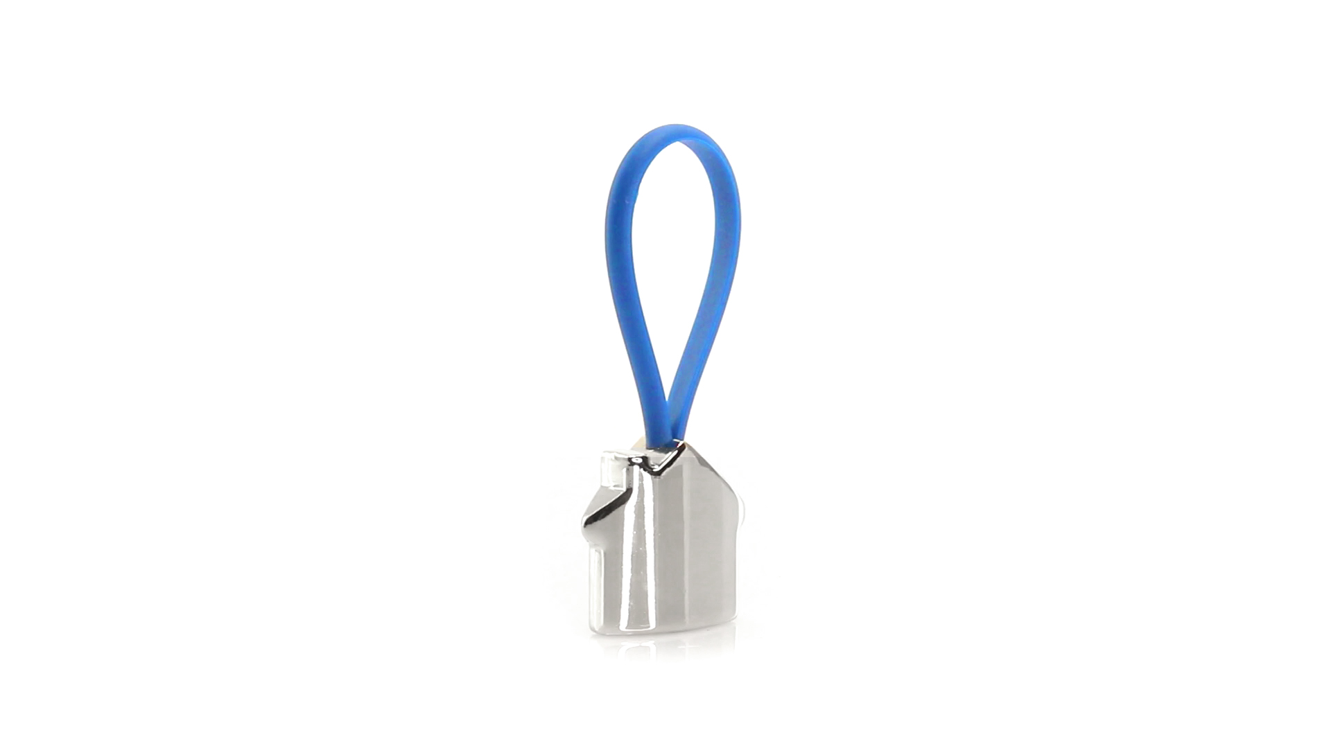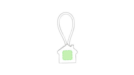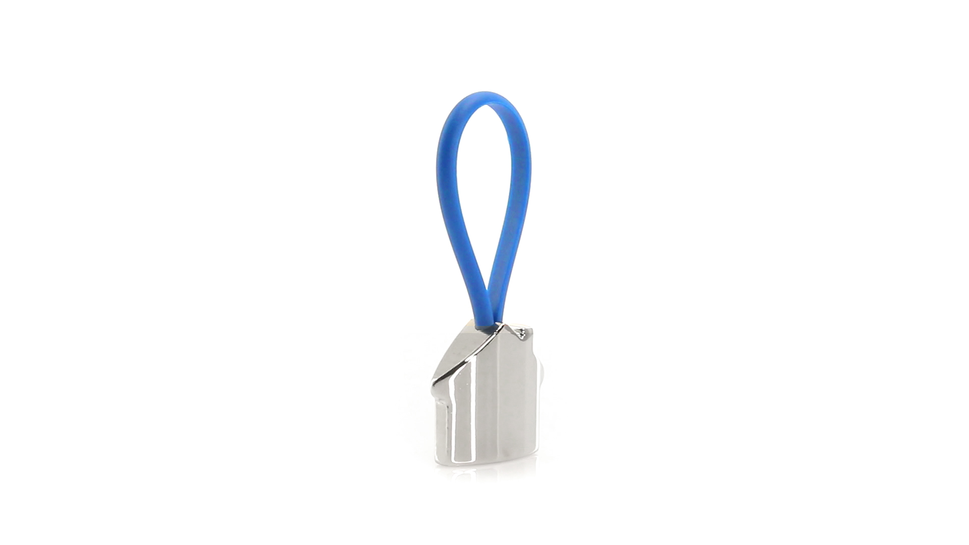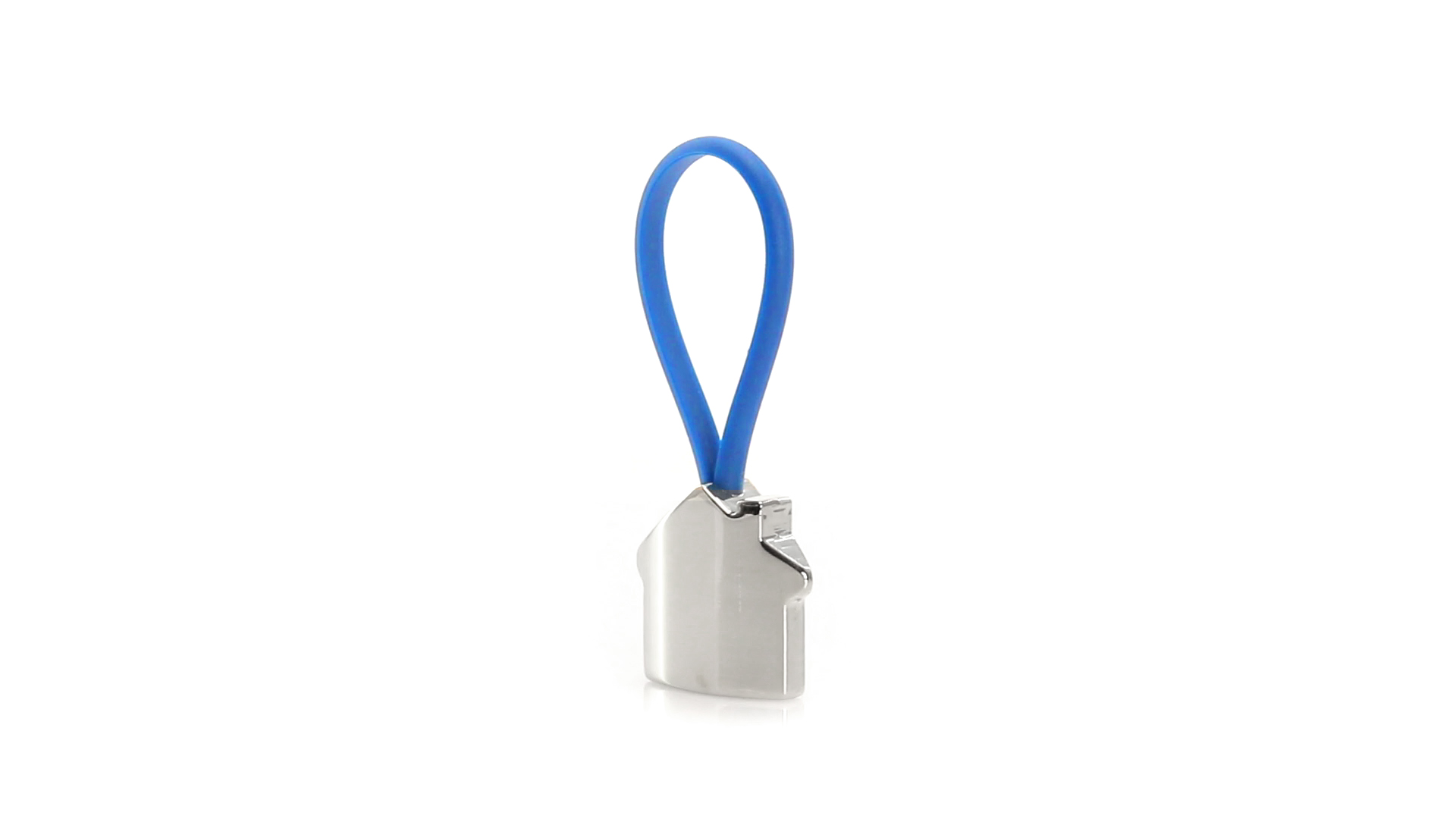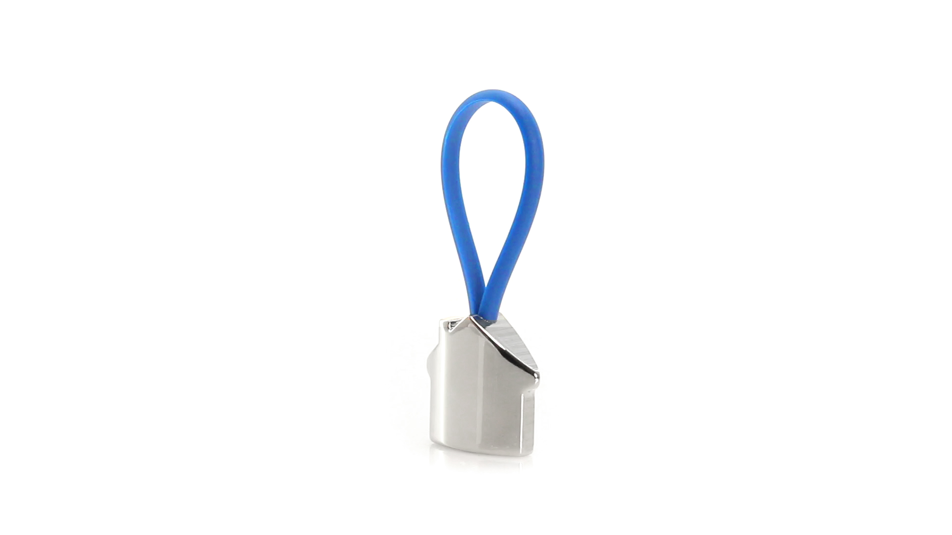 Metall-Schlüsselanhänger mit elegantem Haus-Design in 3D. Mit Gummiband in verschiedenen lebendigen Farben für die Befestigung der Schlüssel.
