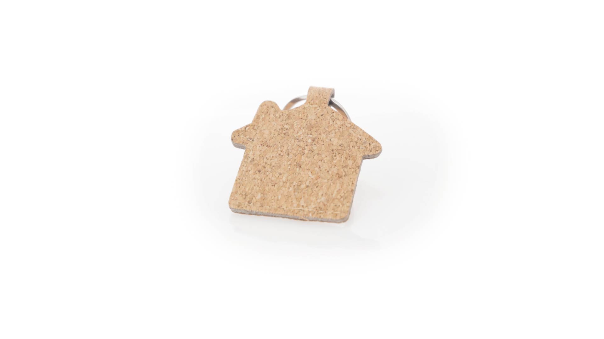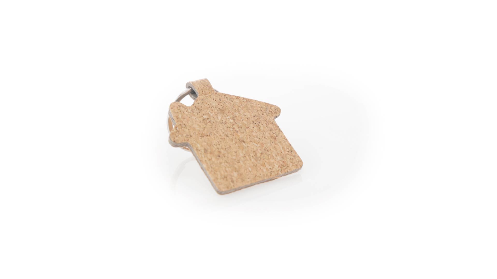 Schlüsselanhänger in Hausform aus Naturkork. Mit grossem Branding-Bereich und präsentiert in einer individuellen Recycling-Tasche.