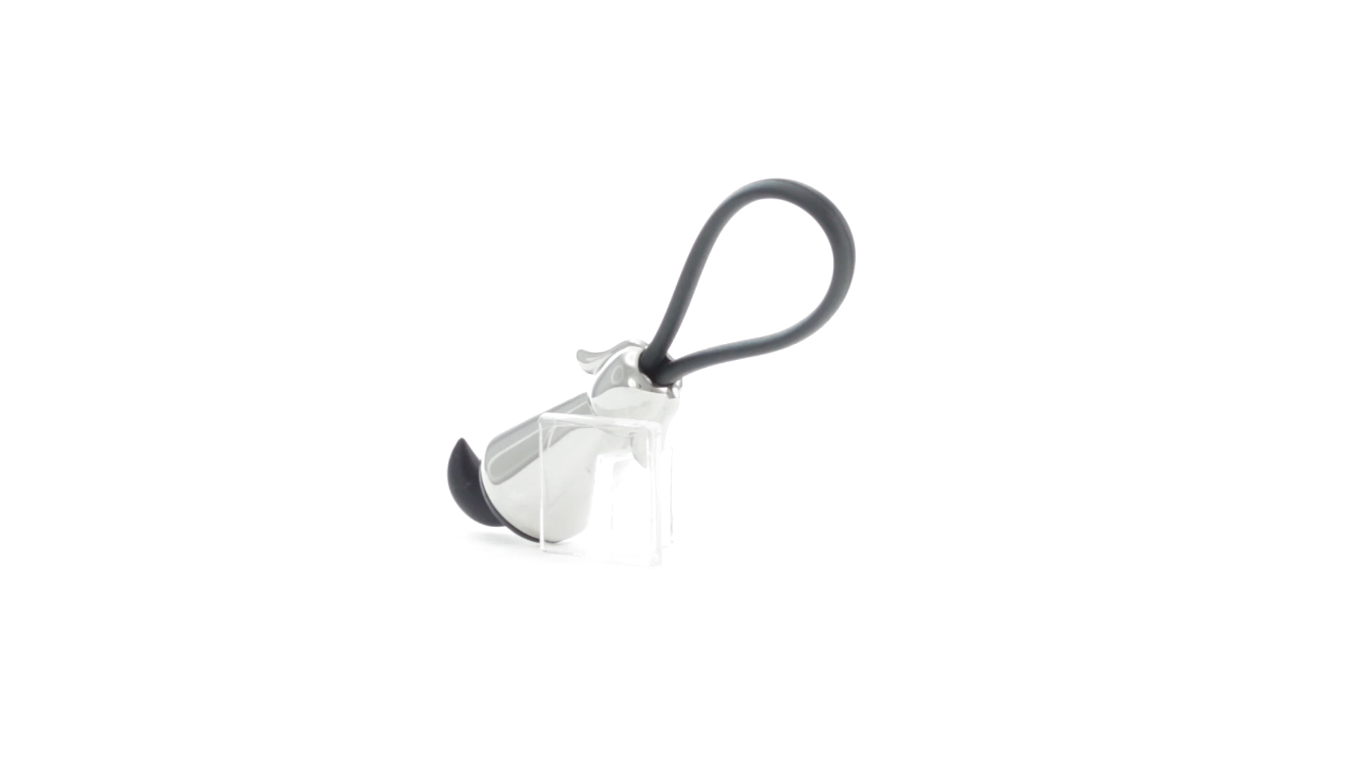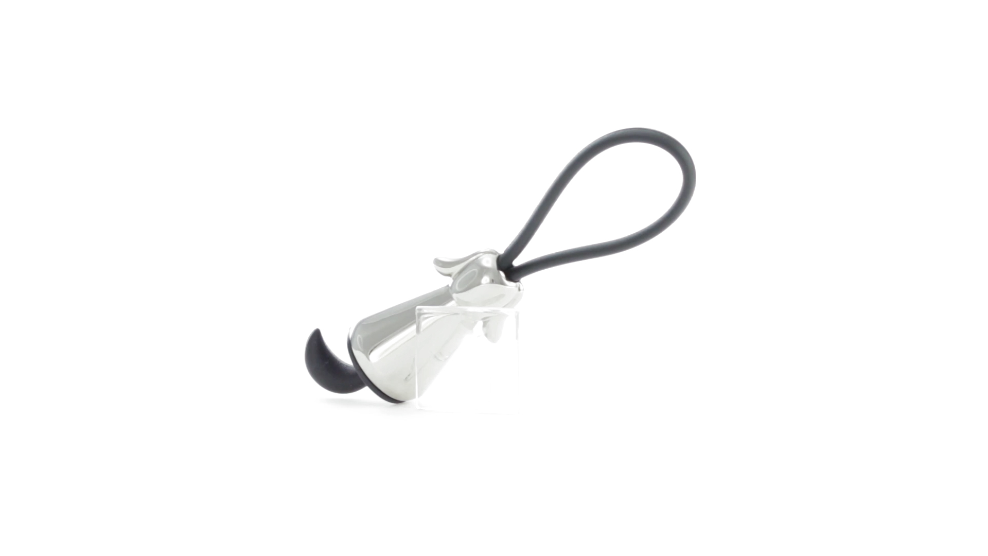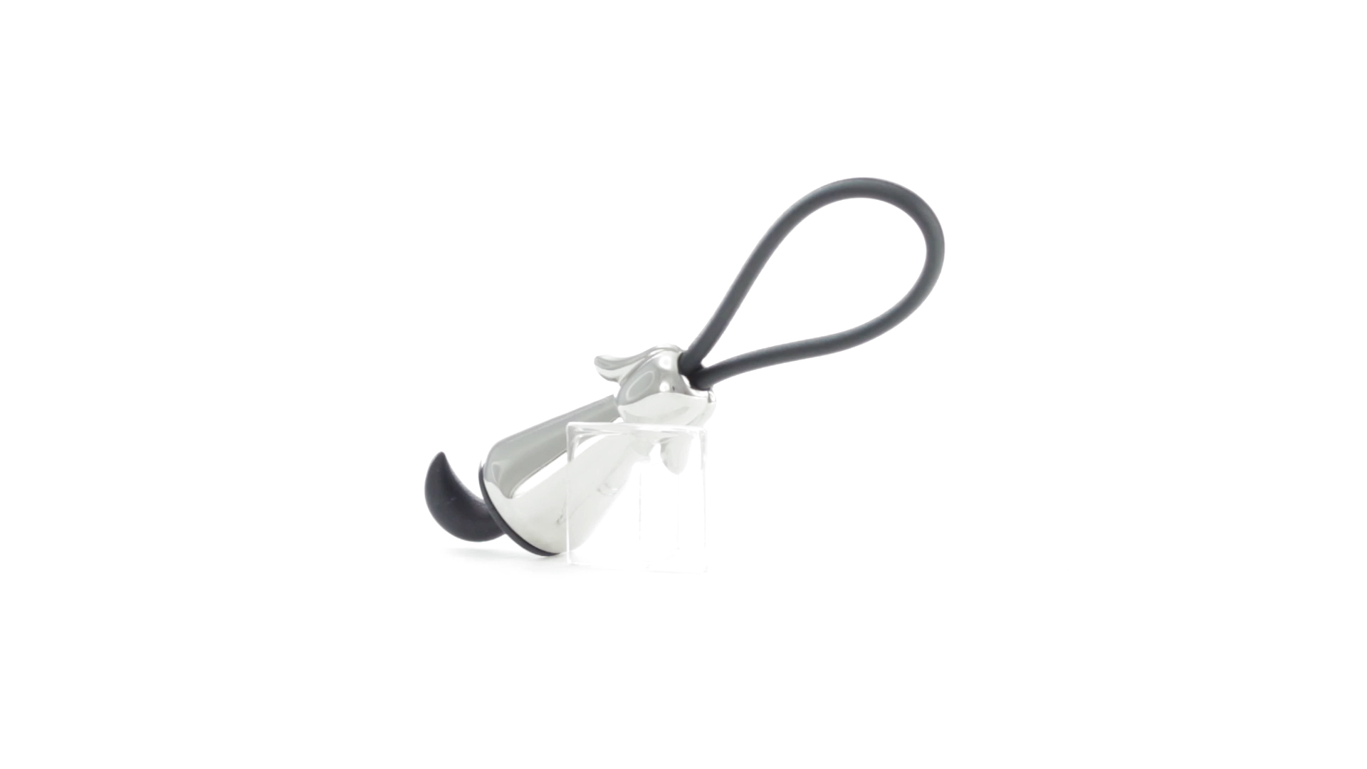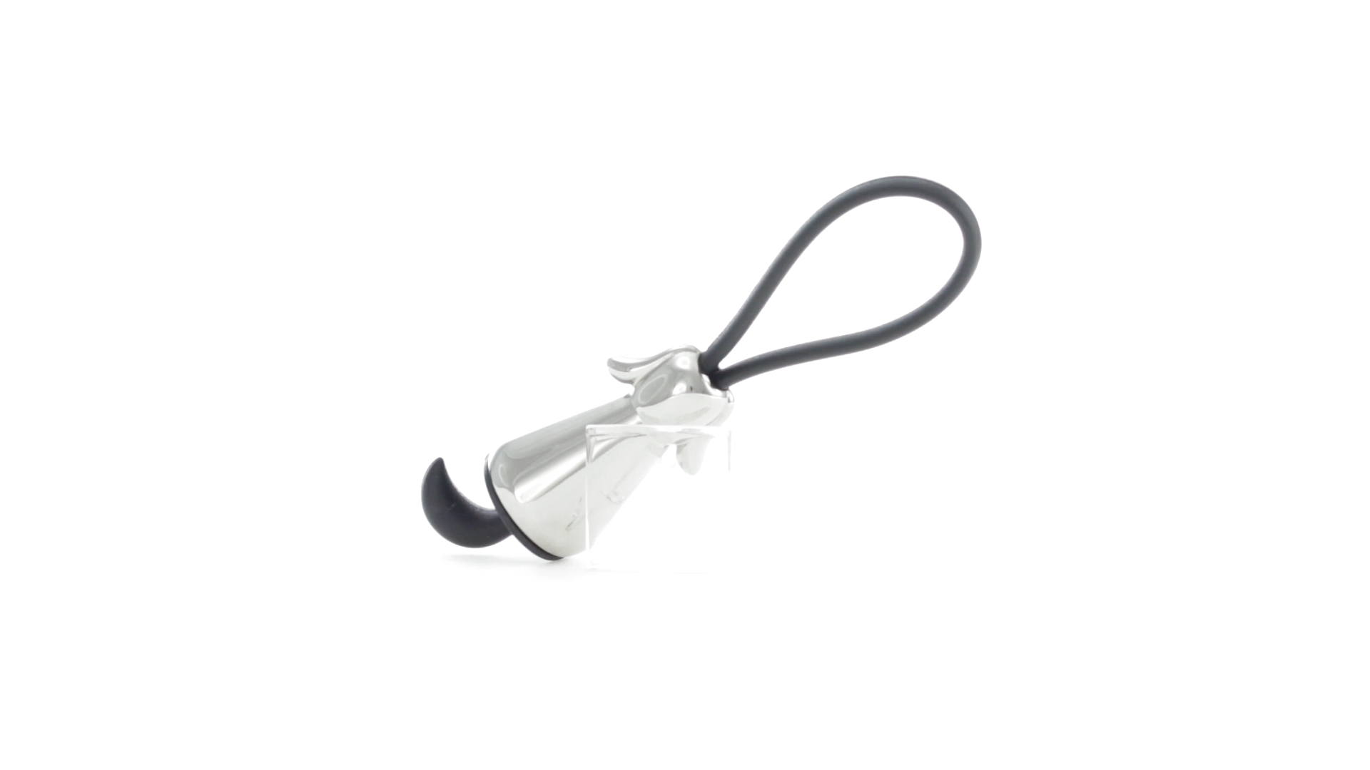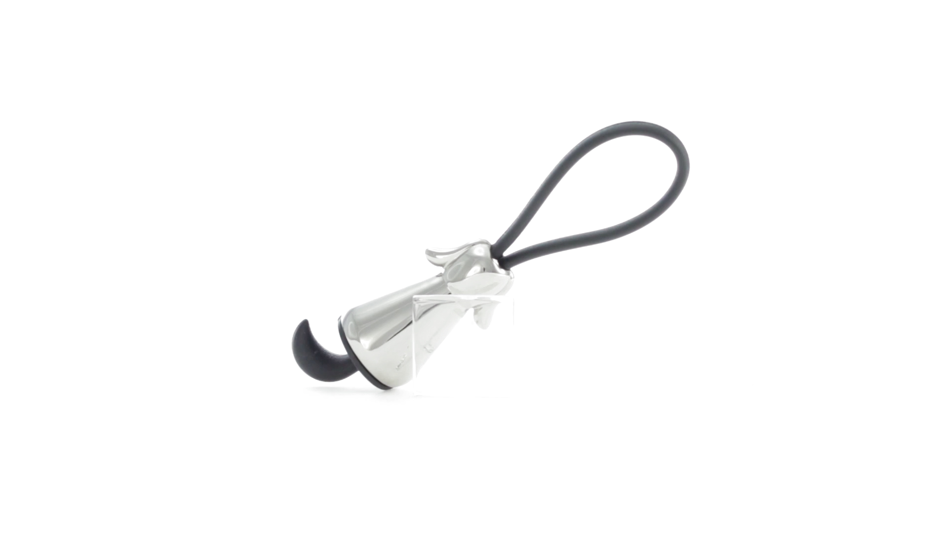 Origineller Metall-Schlüsselanhänger in glänzender Ausführung mit minimalistischem Hundedesign. Mit robustem Silikonband in Schwarz.