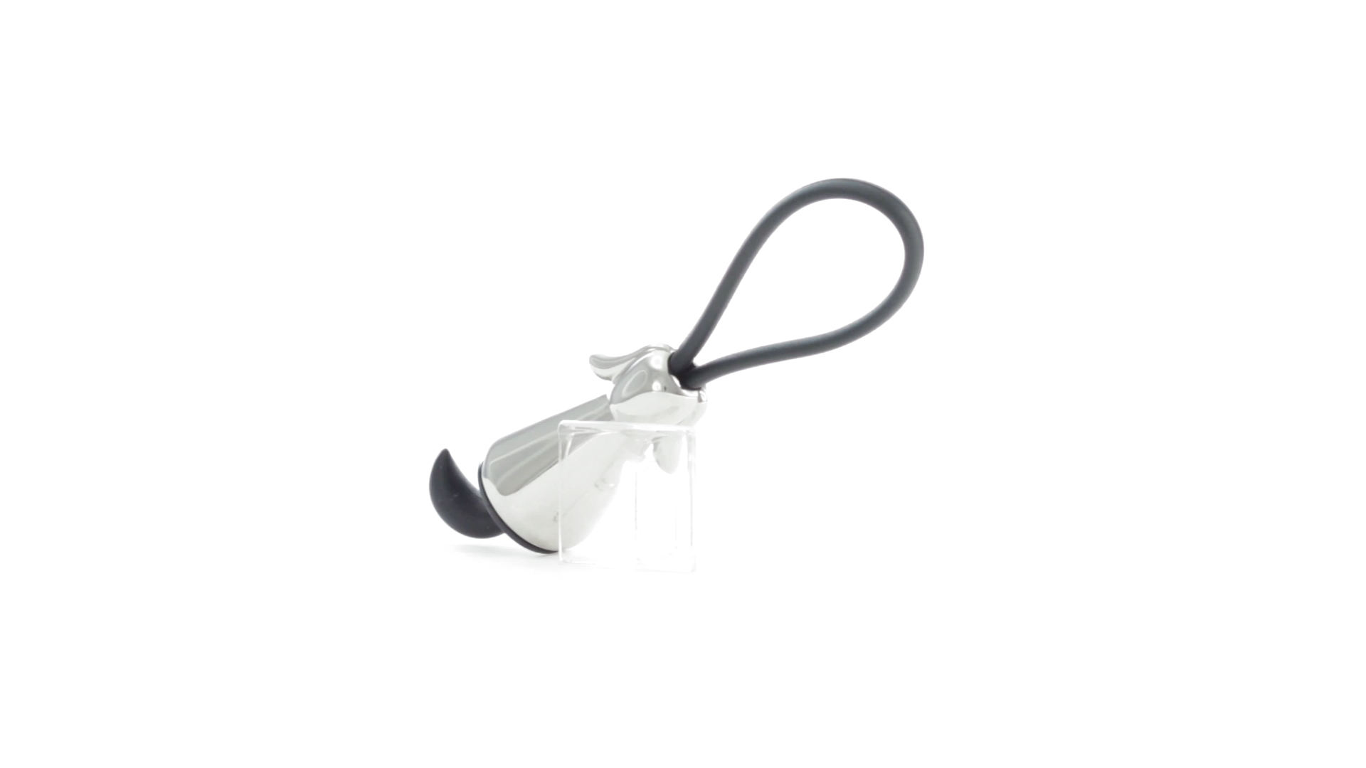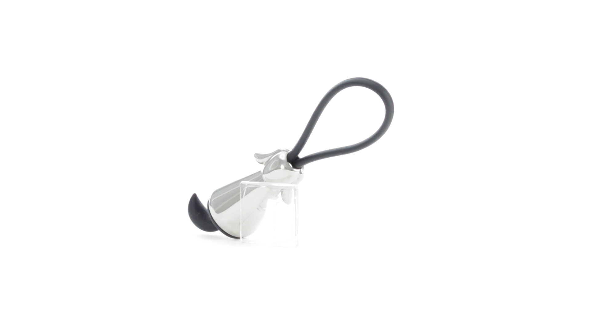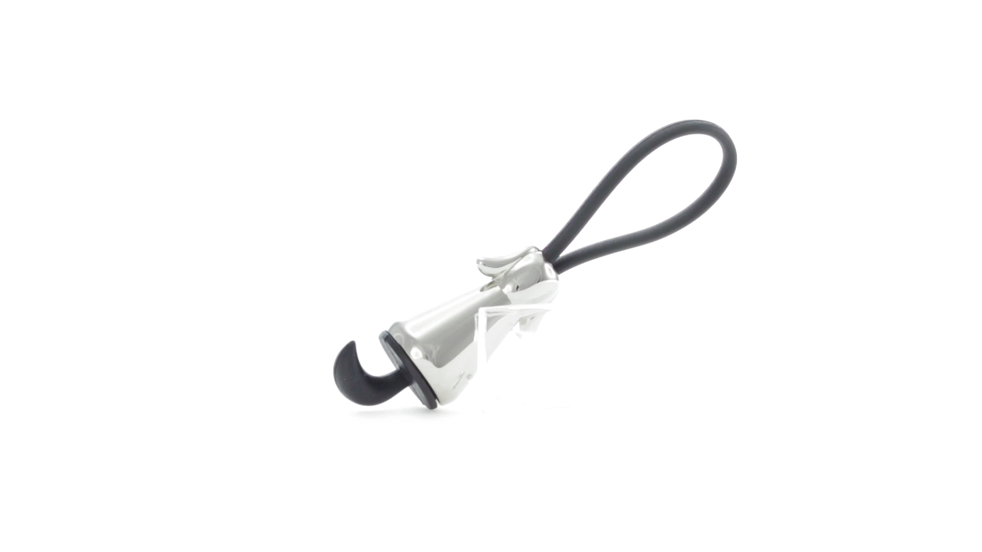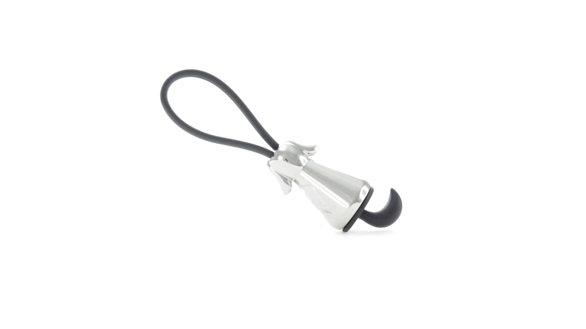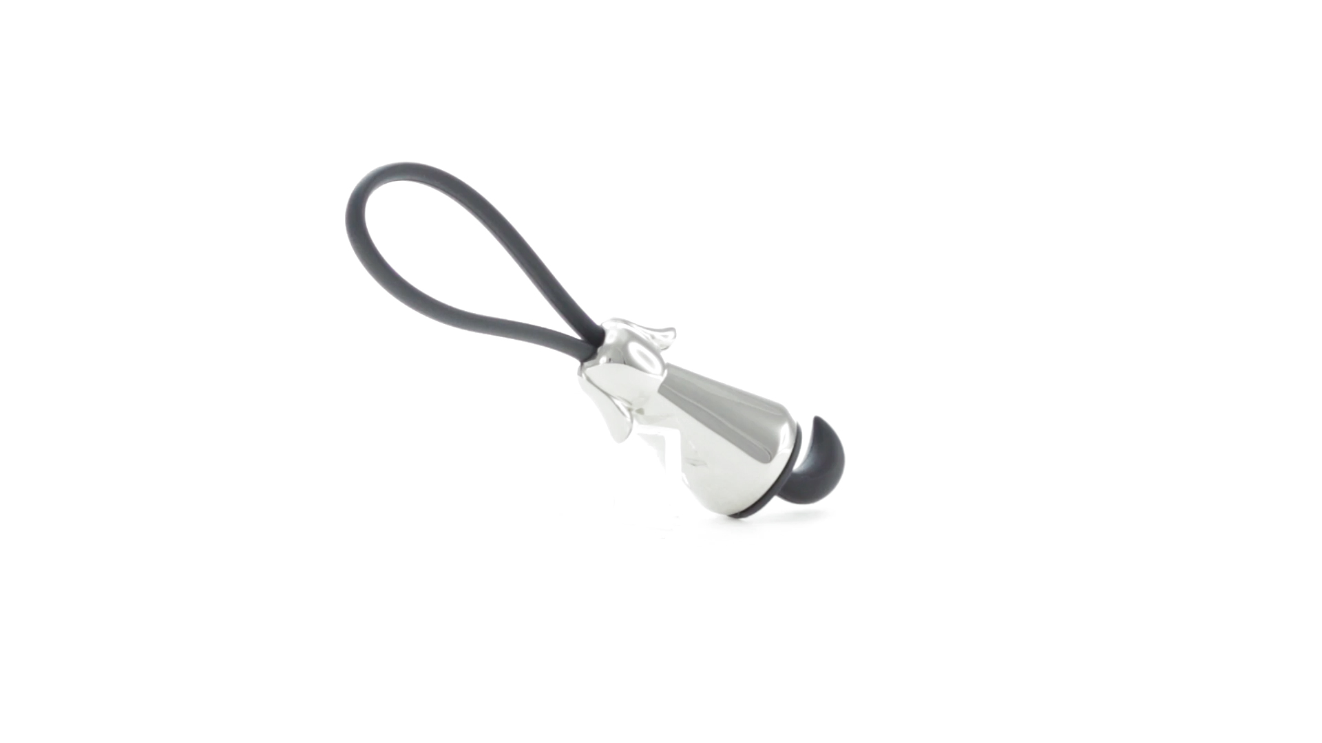 Origineller Metall-Schlüsselanhänger in glänzender Ausführung mit minimalistischem Hundedesign. Mit robustem Silikonband in Schwarz.