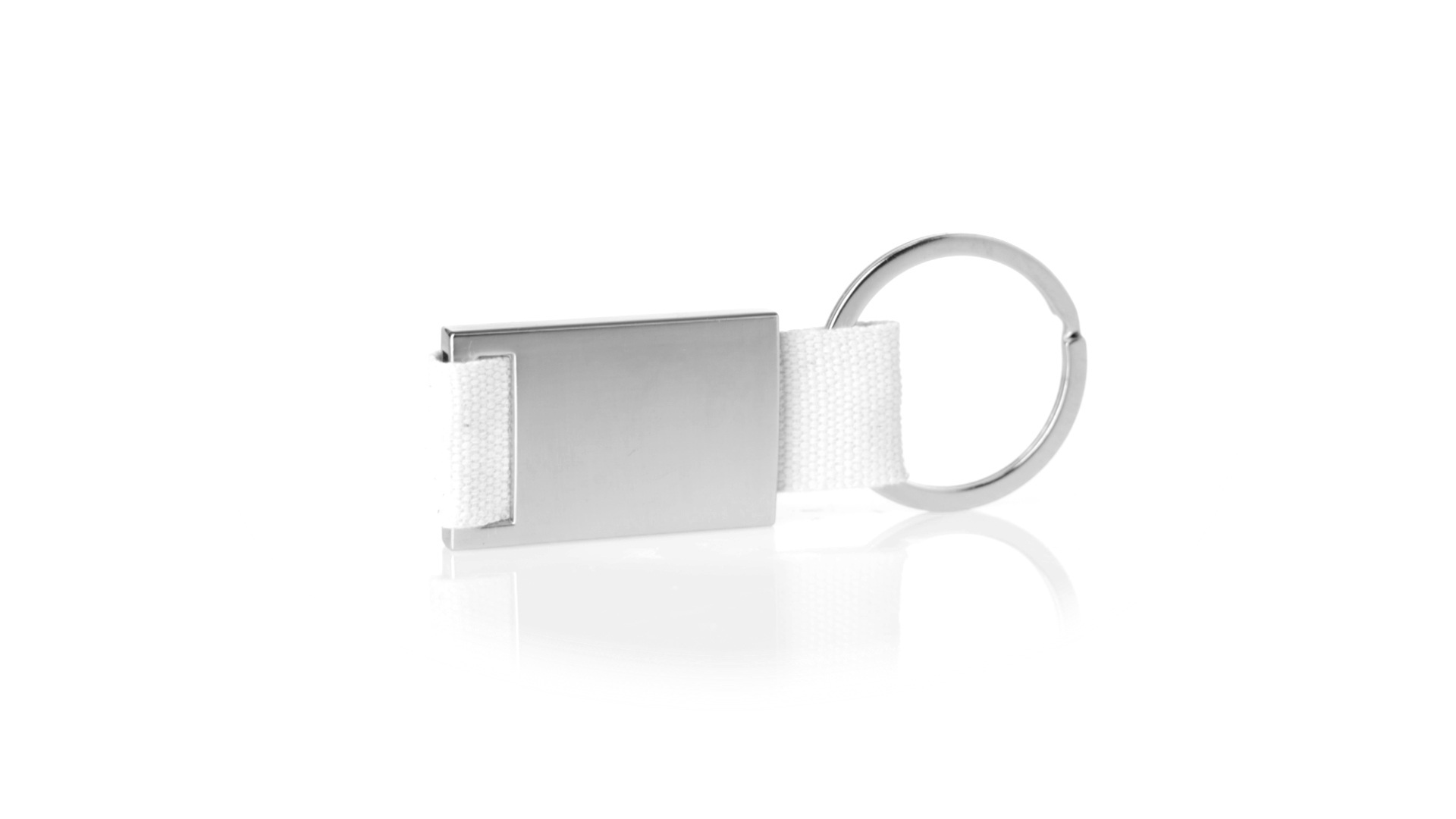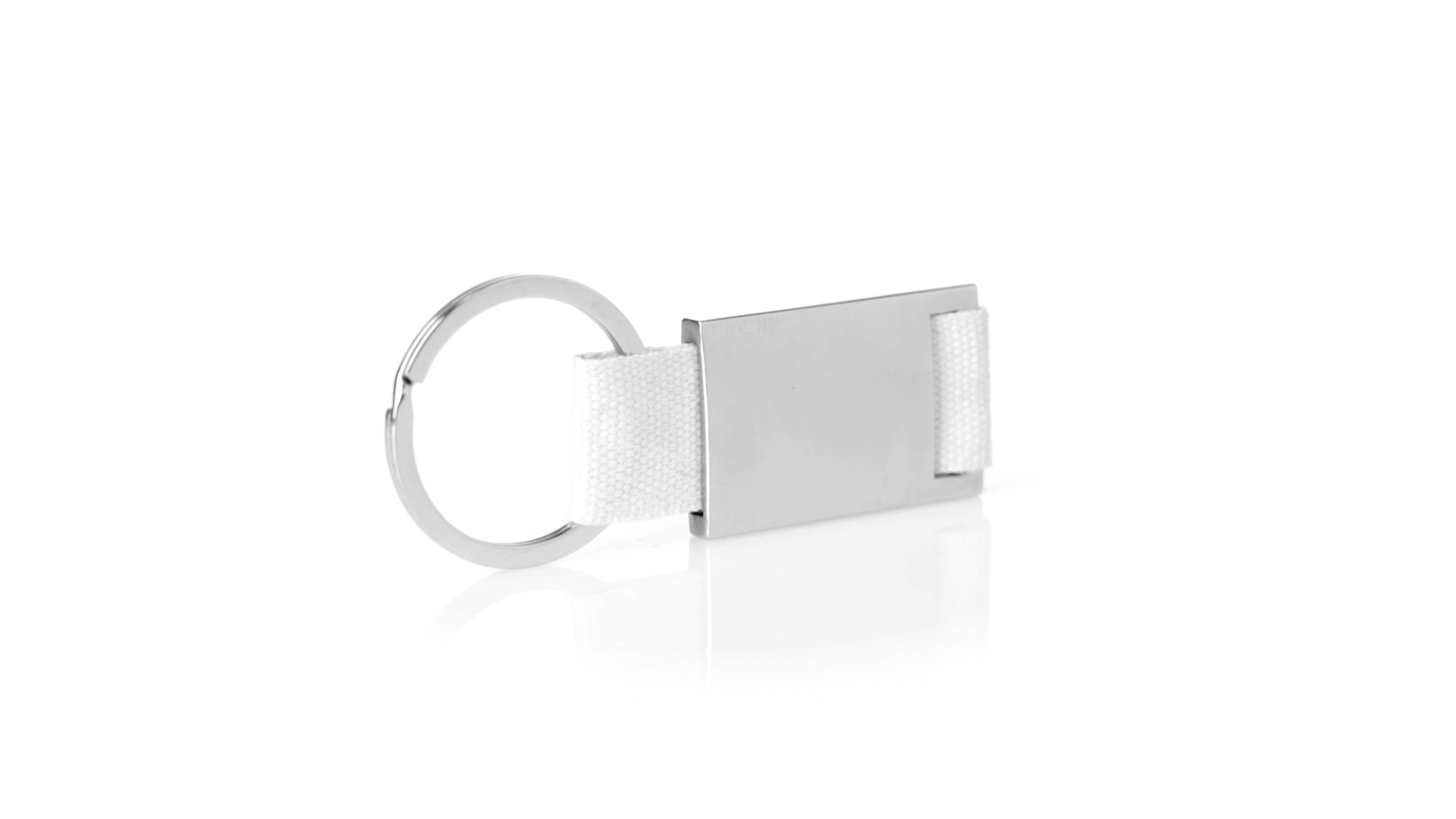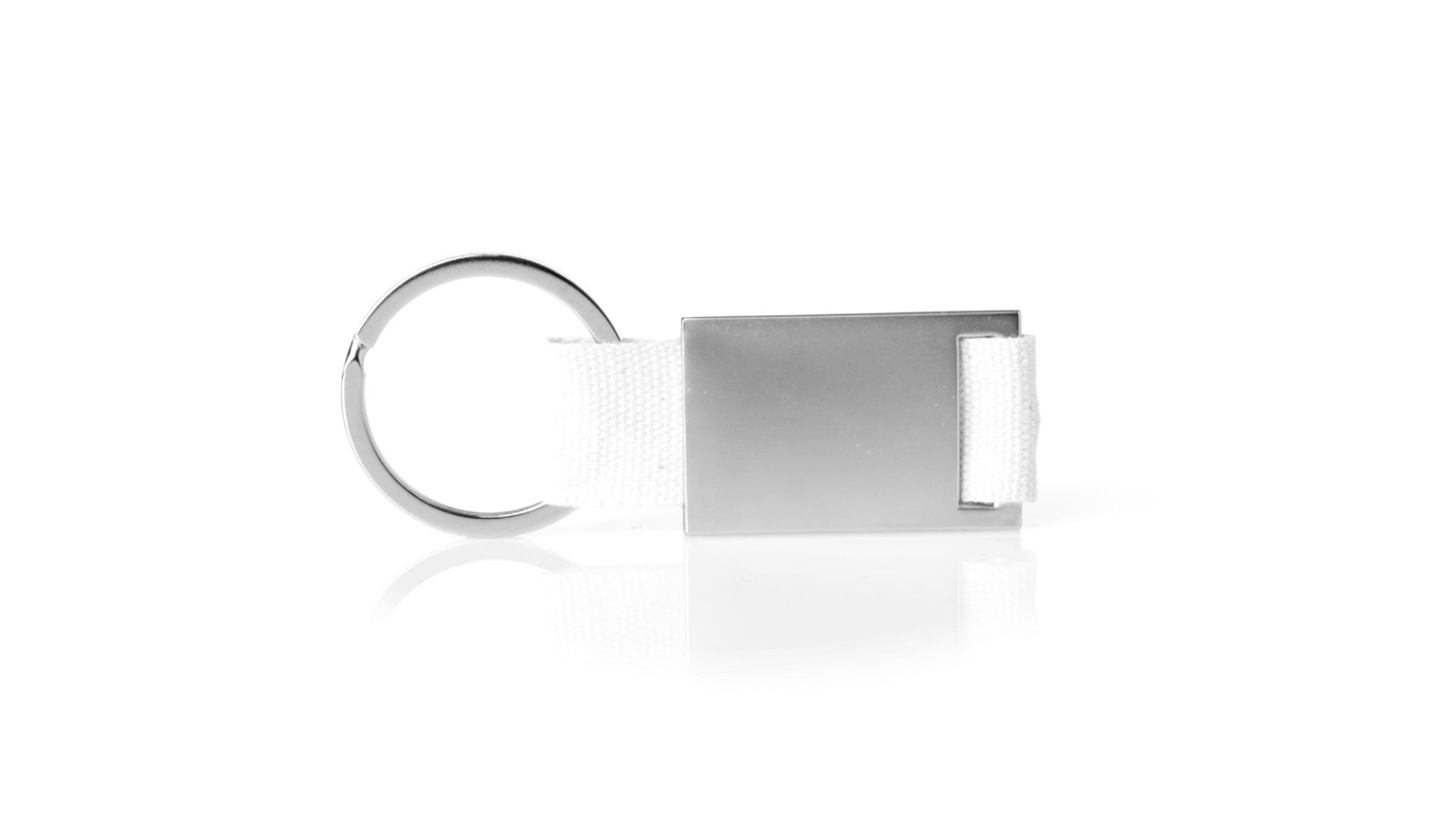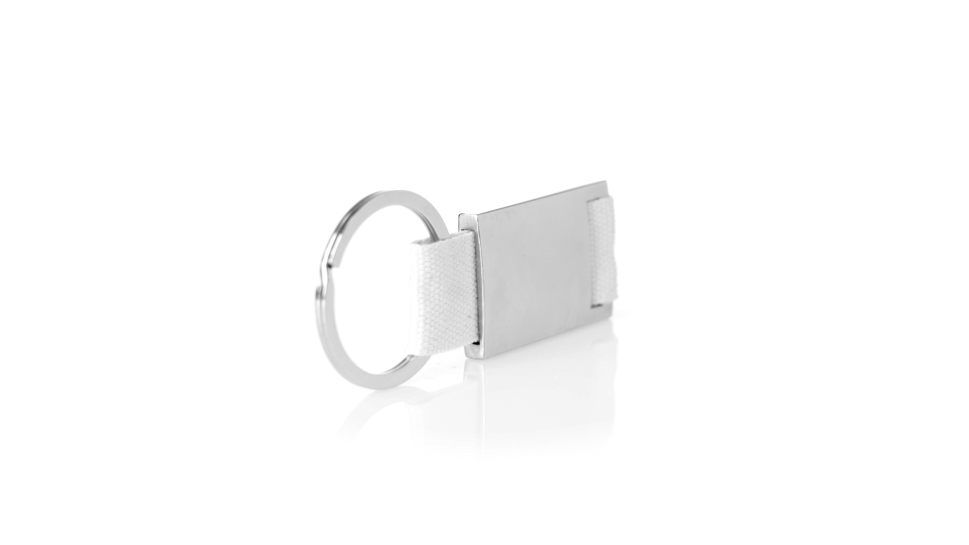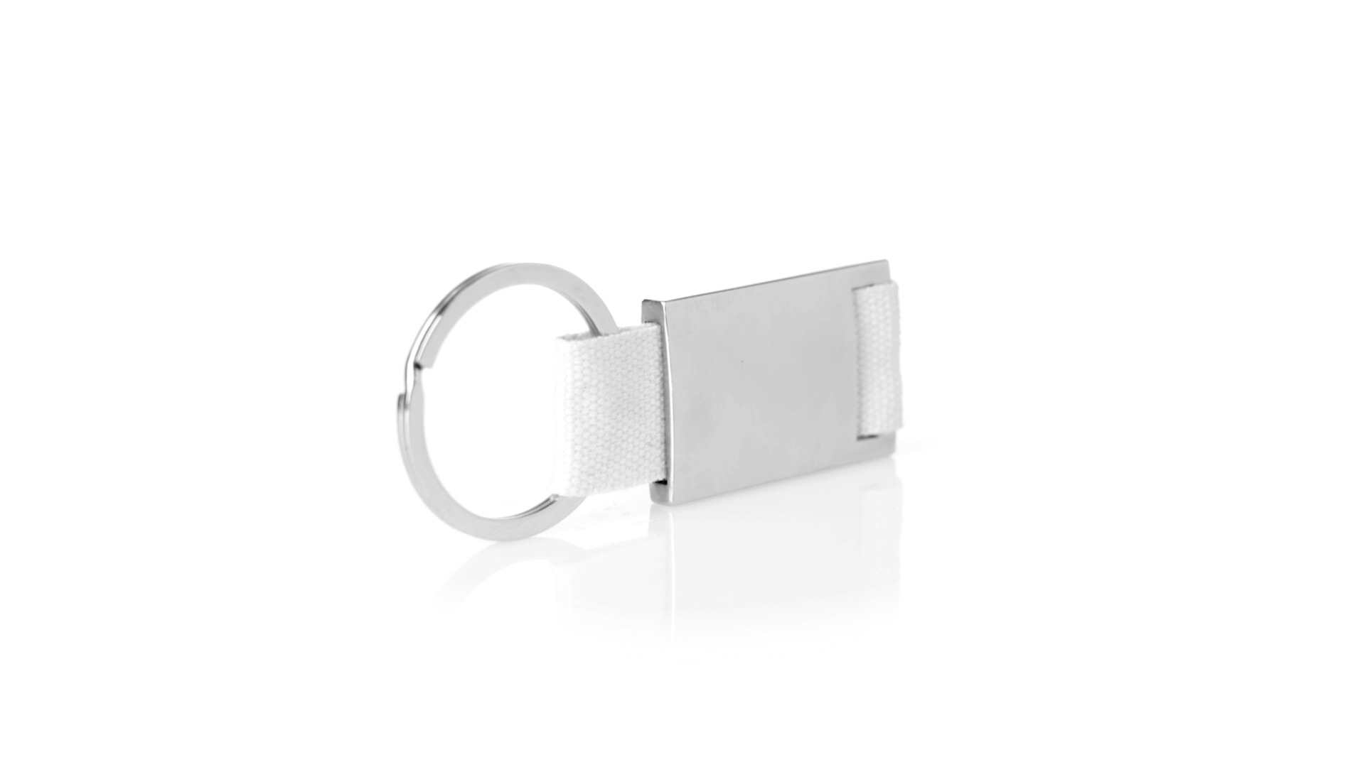 Schlüsselanhänger mit silberfarbenem Metallgehäuse. Baumwollband mit natürlichem Finish, mit breiter Brandingfläche und passendem Metallring. Präsentiert in einer individuellen Tasche mit Kraftkartoneinlage.