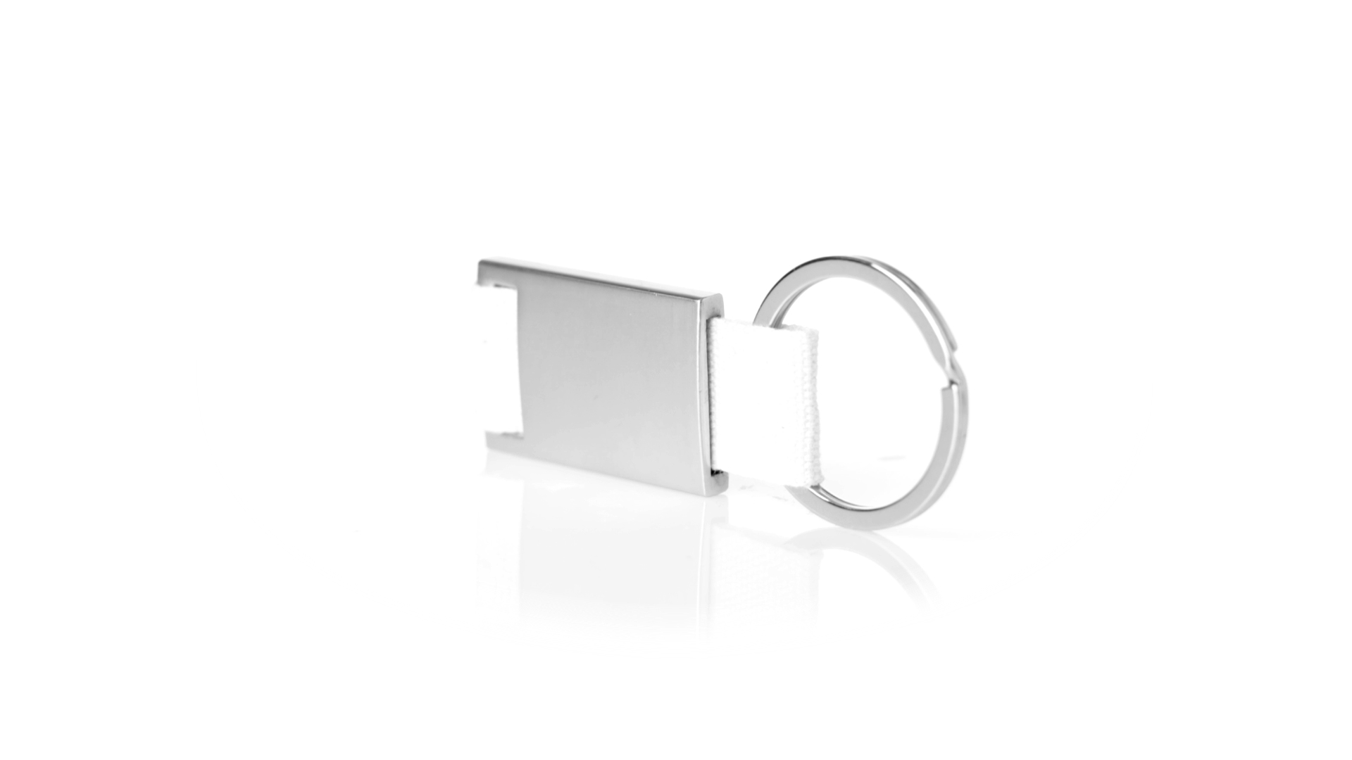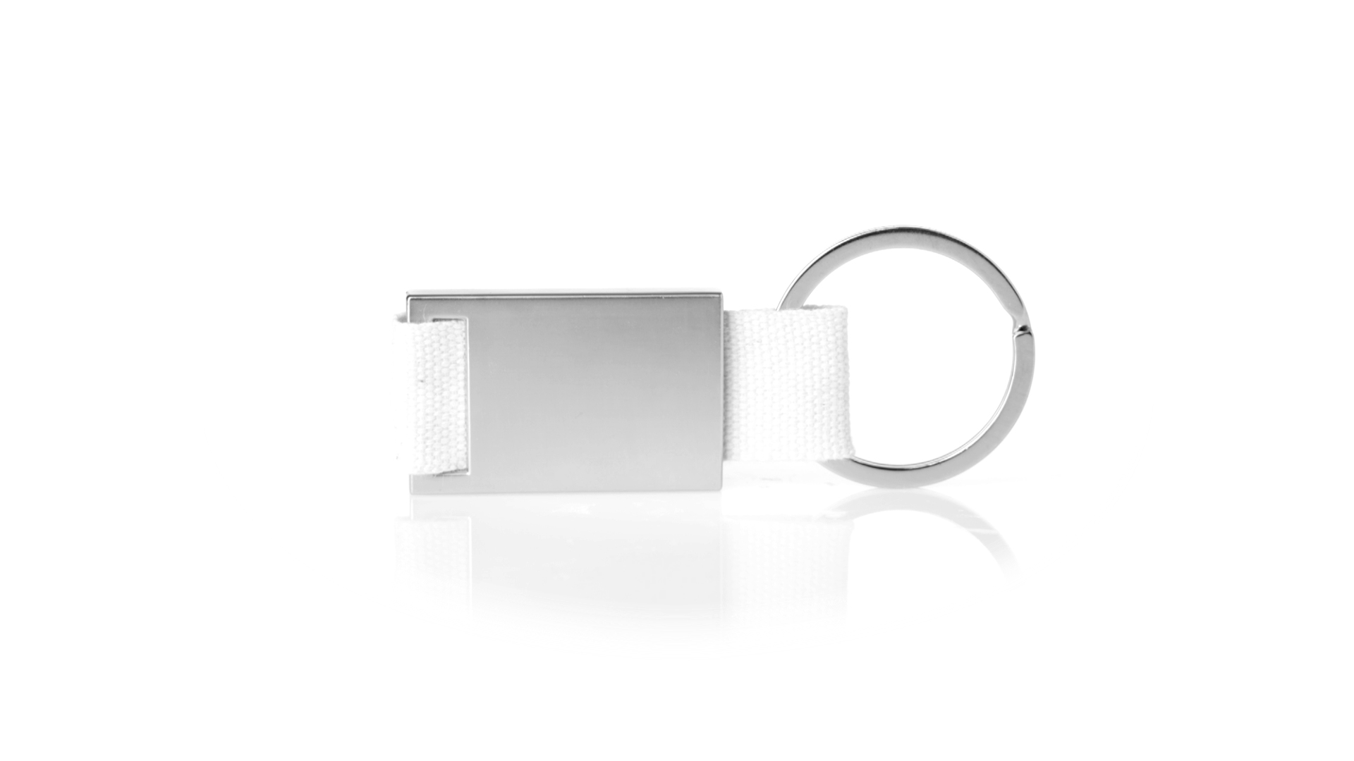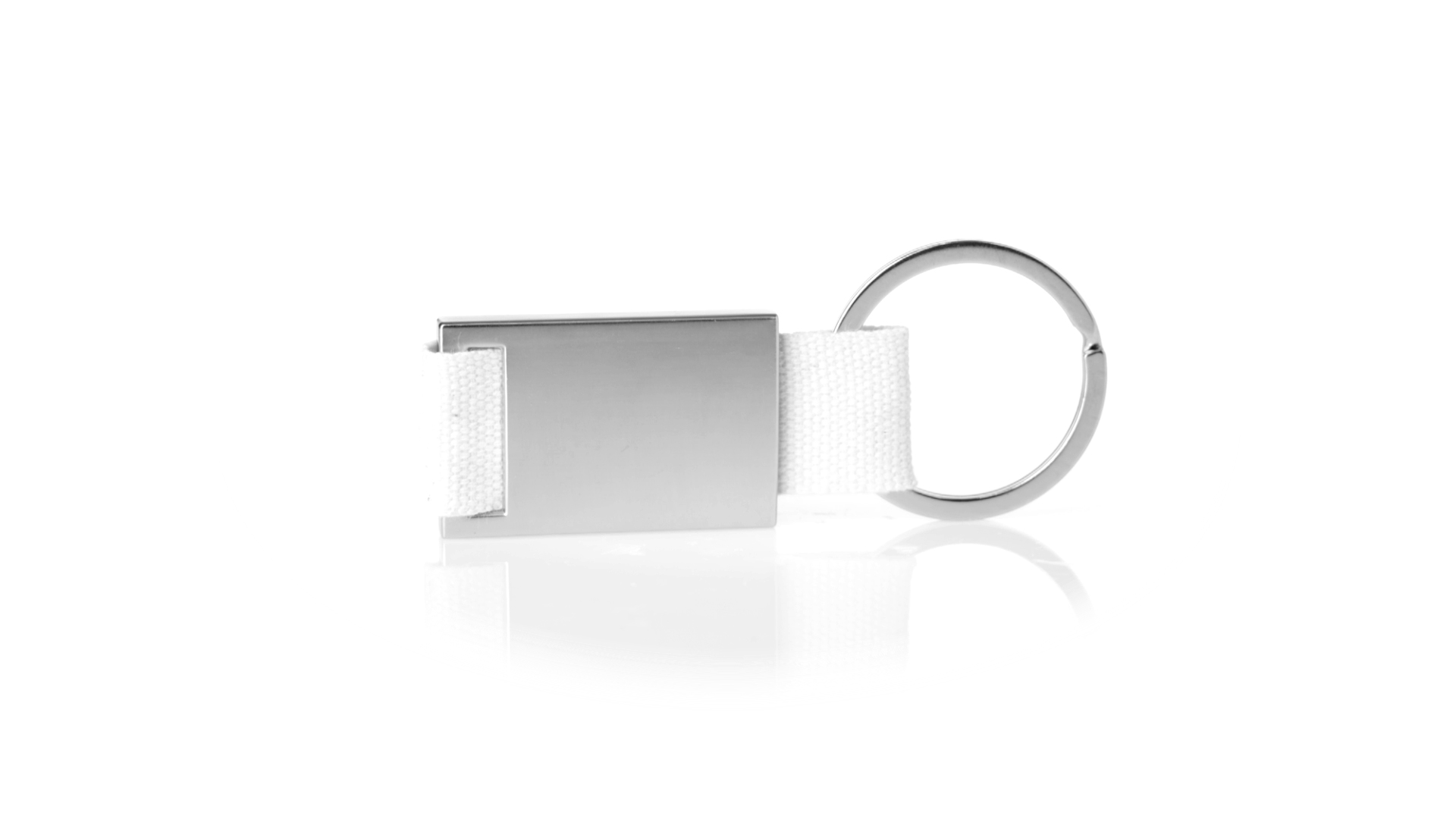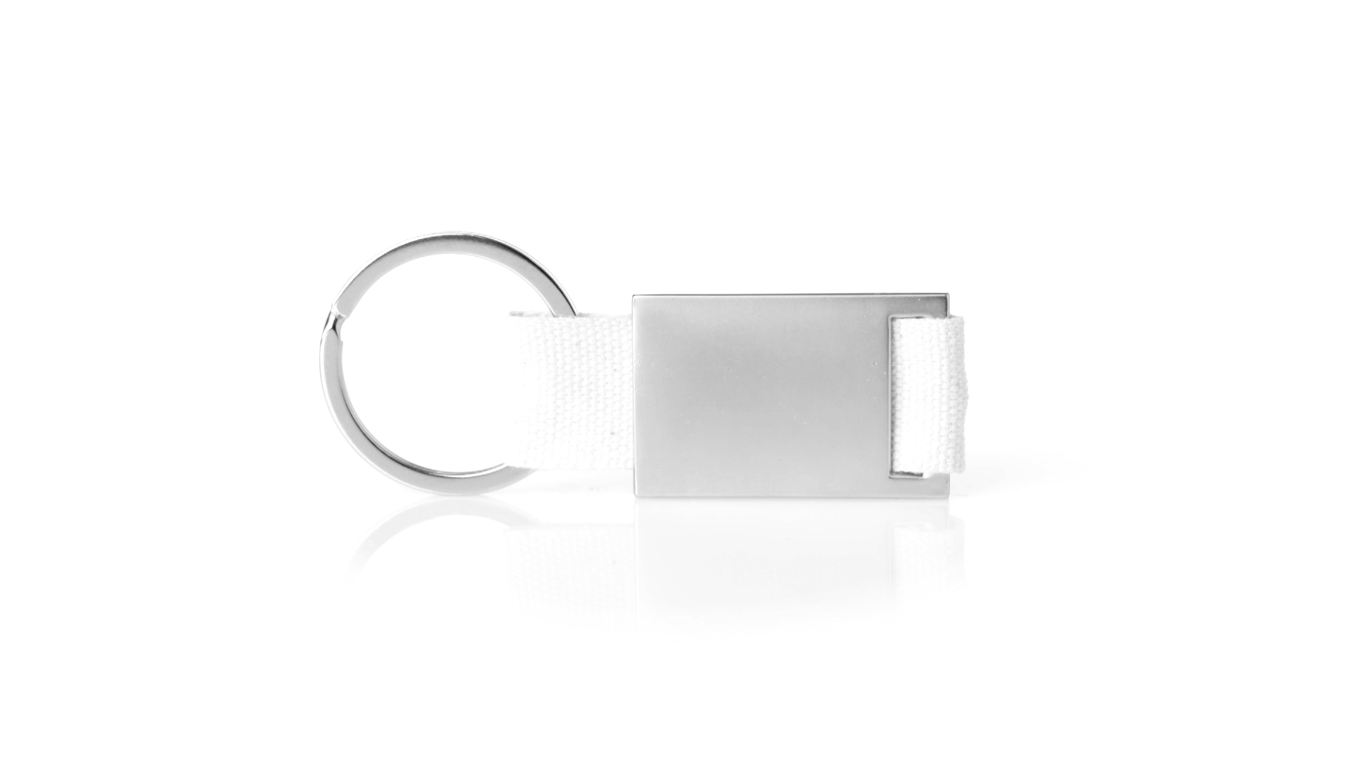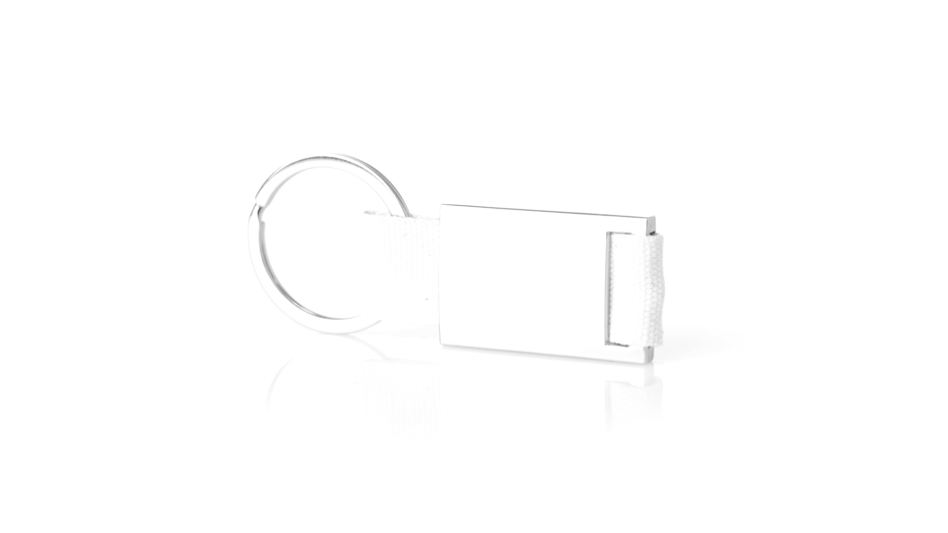Schlüsselanhänger mit silberfarbenem Metallgehäuse. Baumwollband mit natürlichem Finish, mit breiter Brandingfläche und passendem Metallring. Präsentiert in einer individuellen Tasche mit Kraftkartoneinlage.