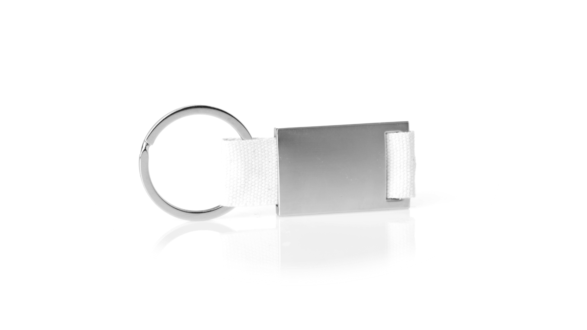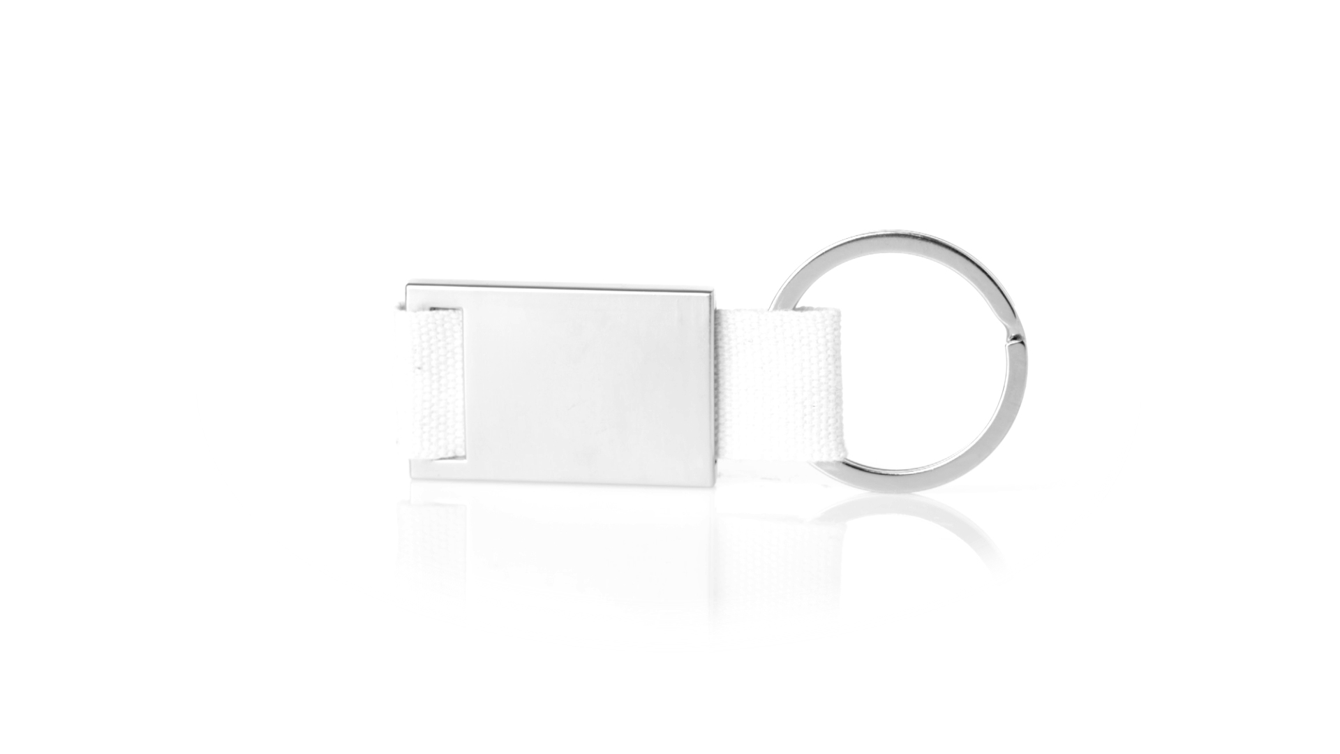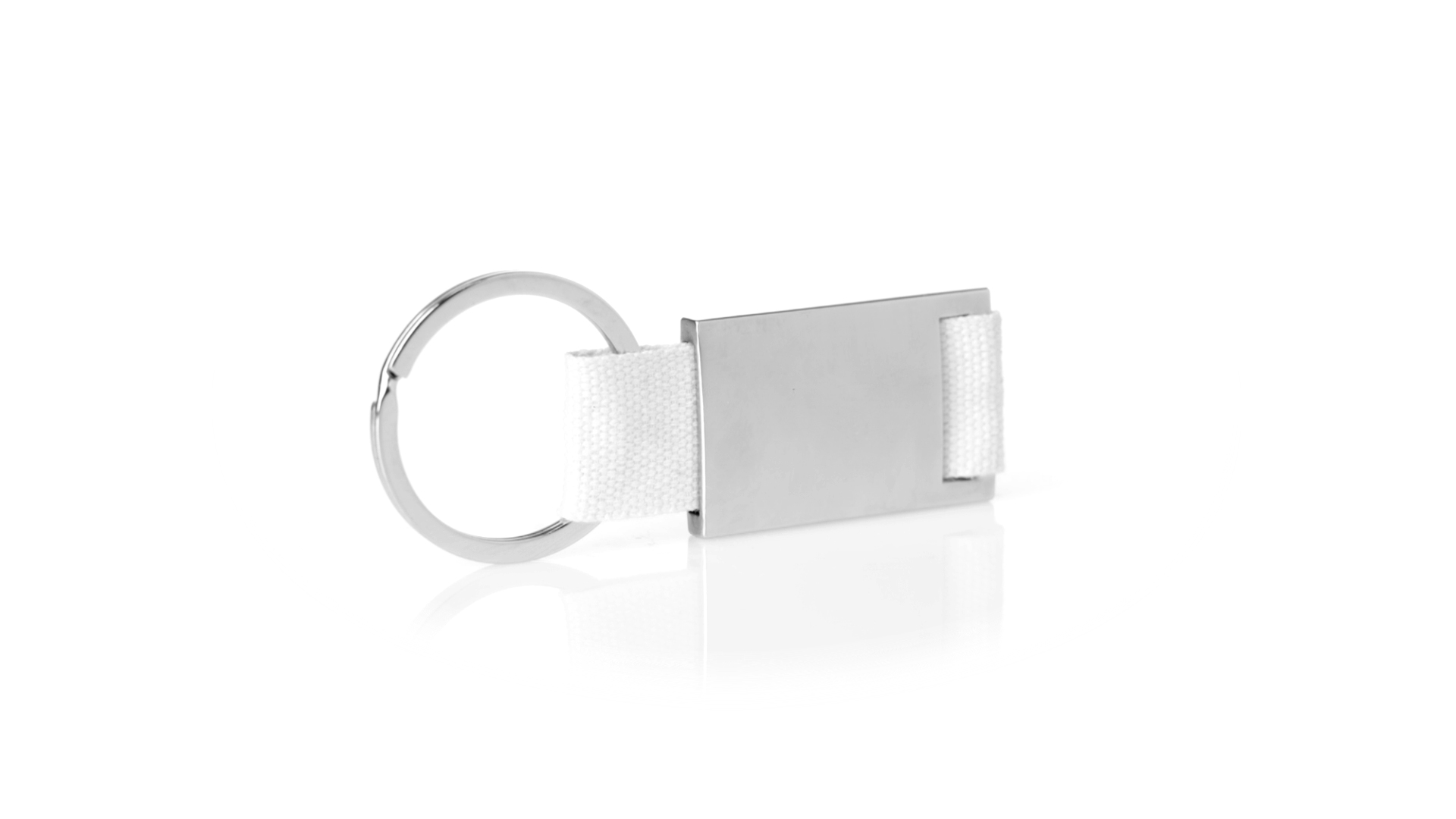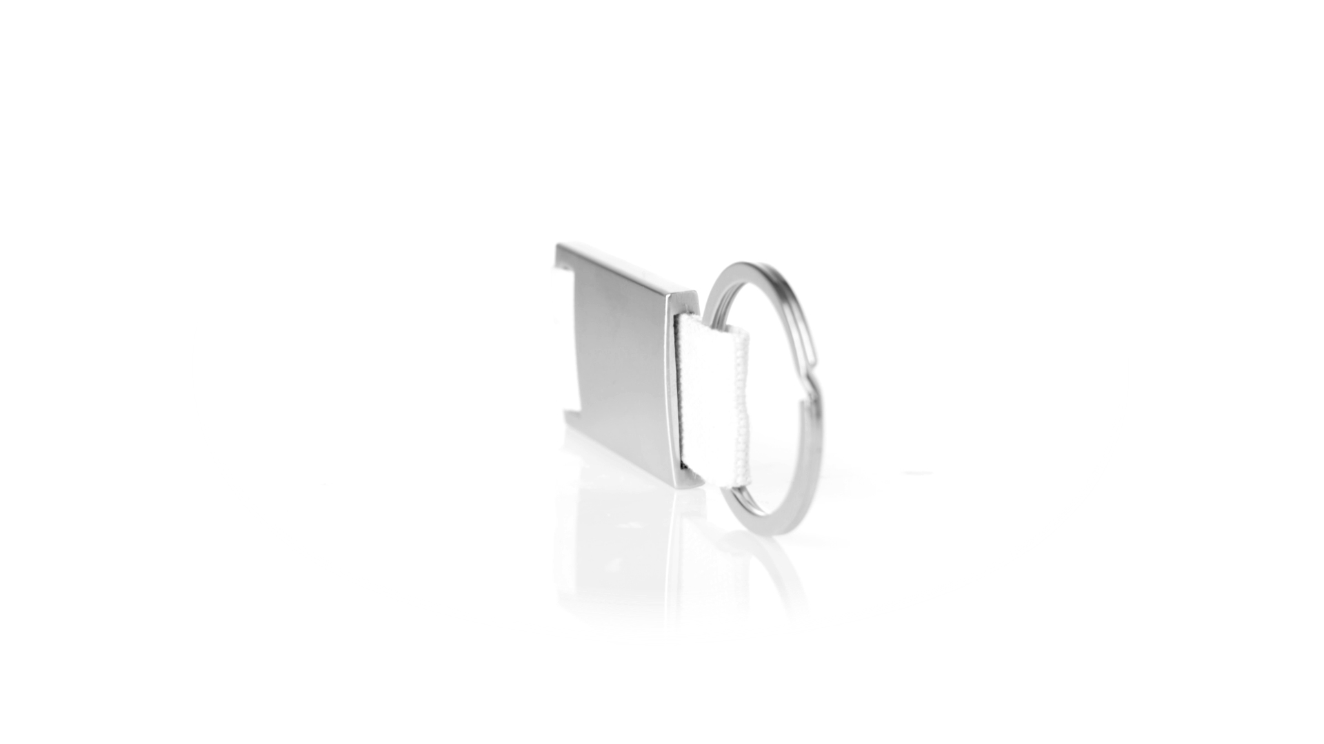 Schlüsselanhänger mit silberfarbenem Metallgehäuse. Baumwollband mit natürlichem Finish, mit breiter Brandingfläche und passendem Metallring. Präsentiert in einer individuellen Tasche mit Kraftkartoneinlage.