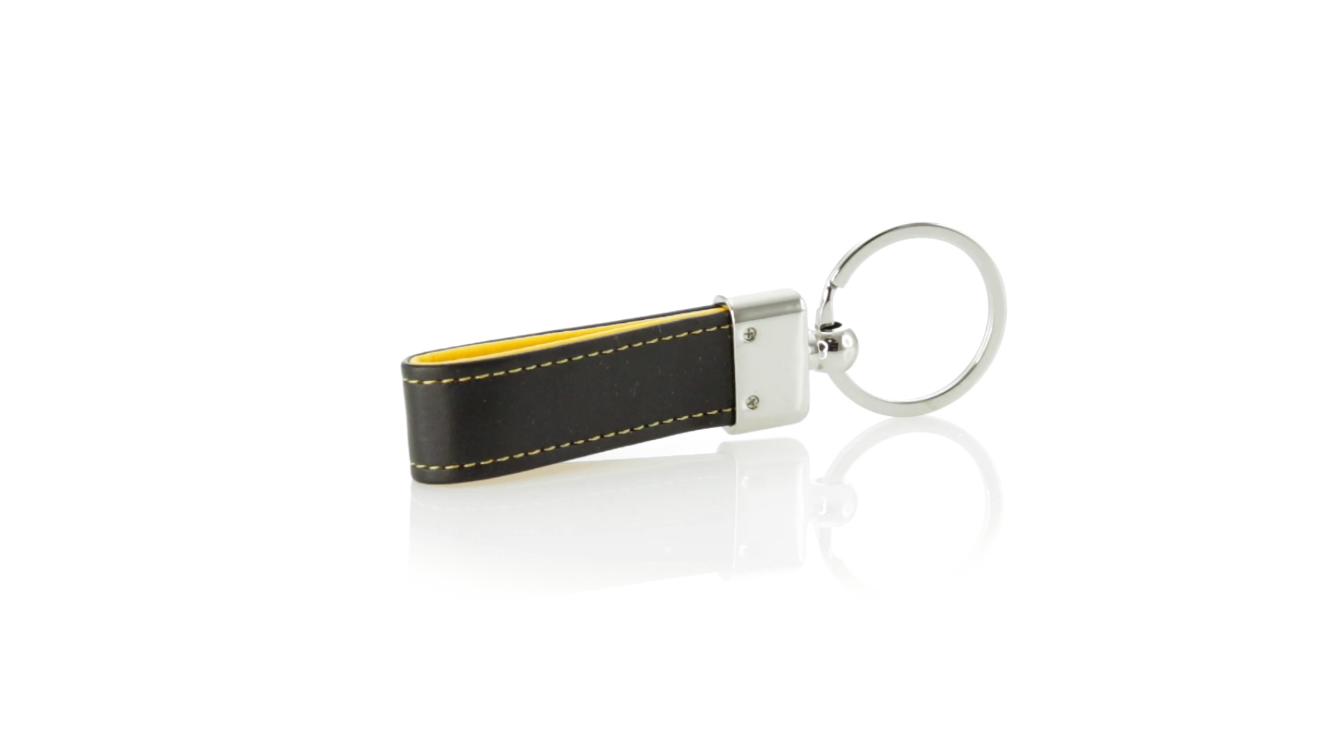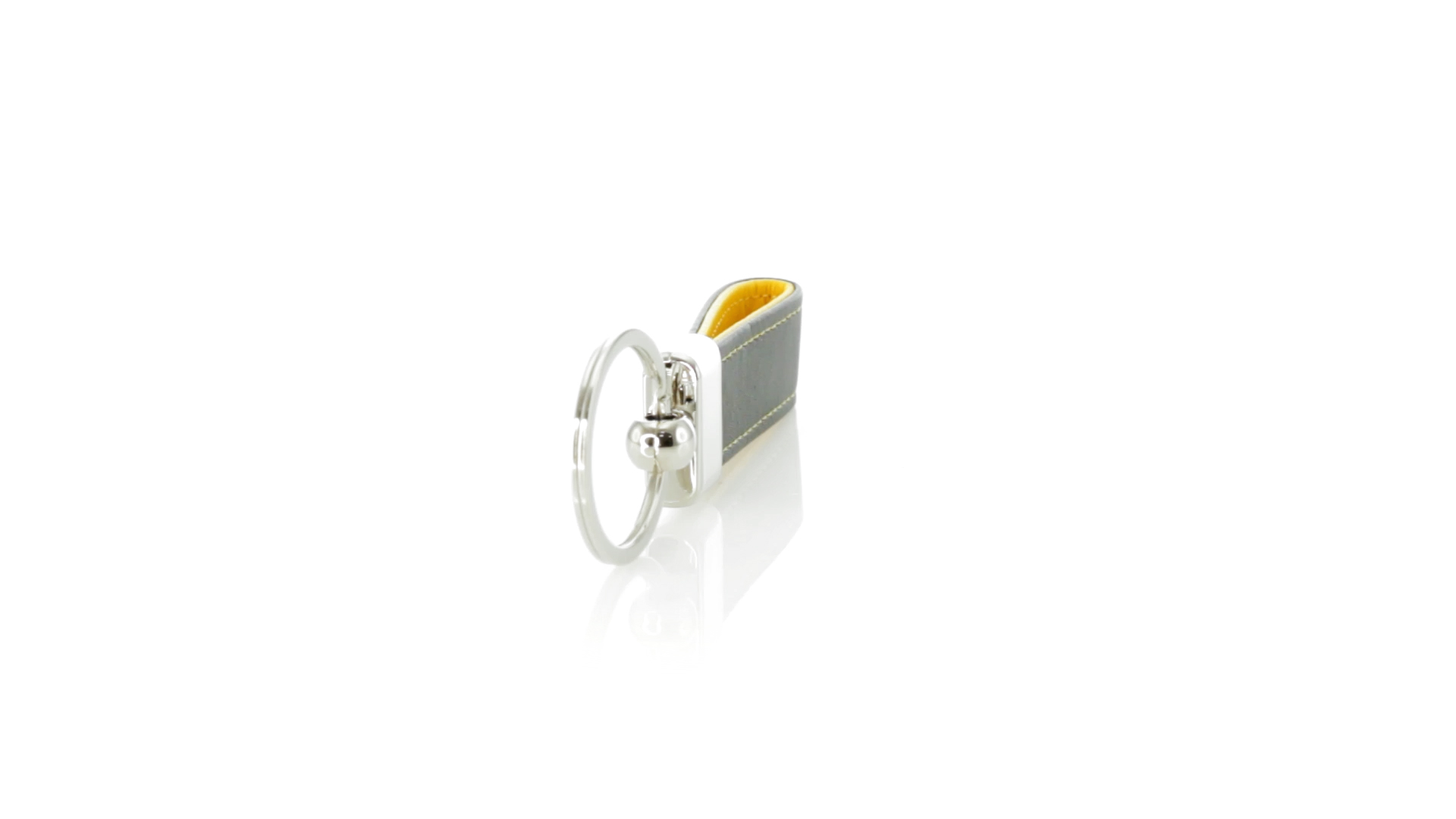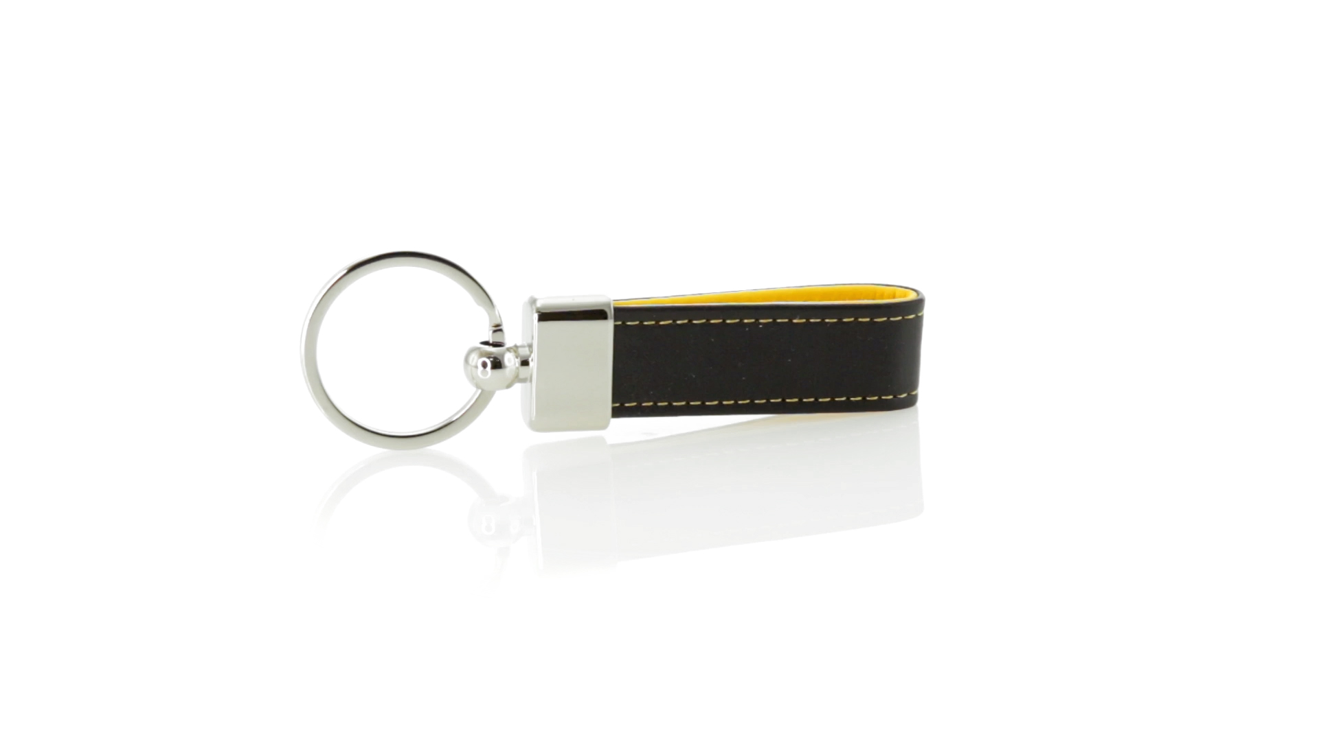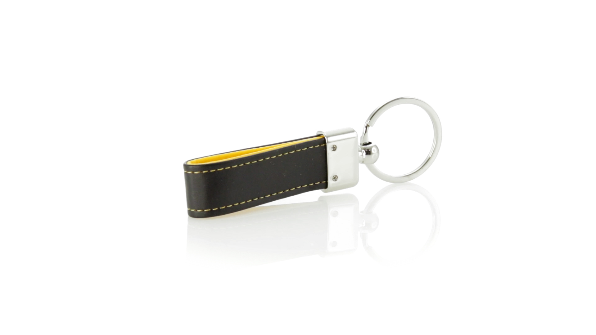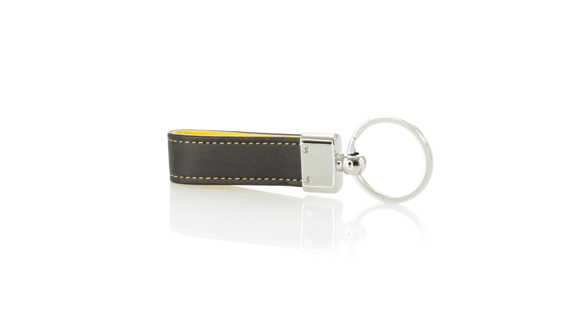 Schlüsselanhänger aus elegantem, zweifarbigem Kunstleder mit Metall-Detail. Präsentiert in einer individuellen Schachtel mit Stanzung im Inneren.