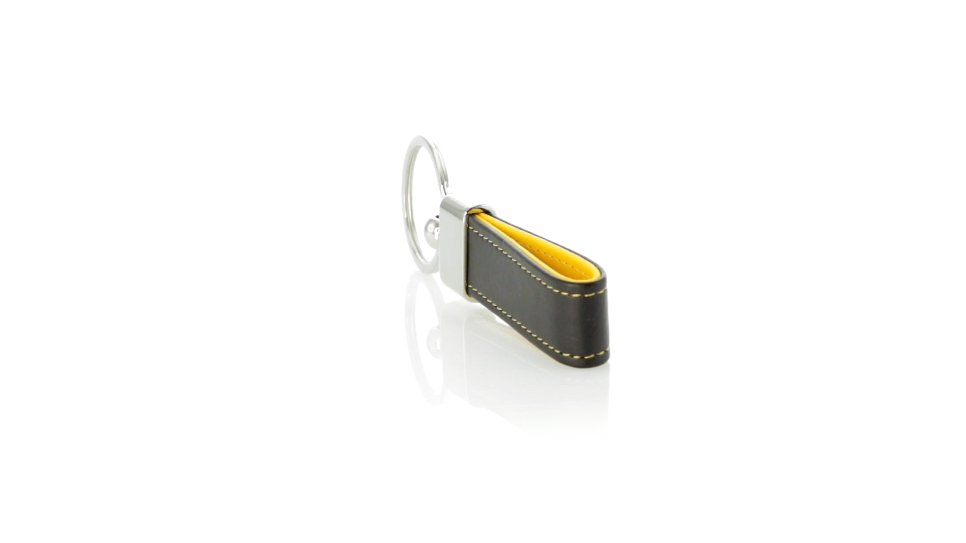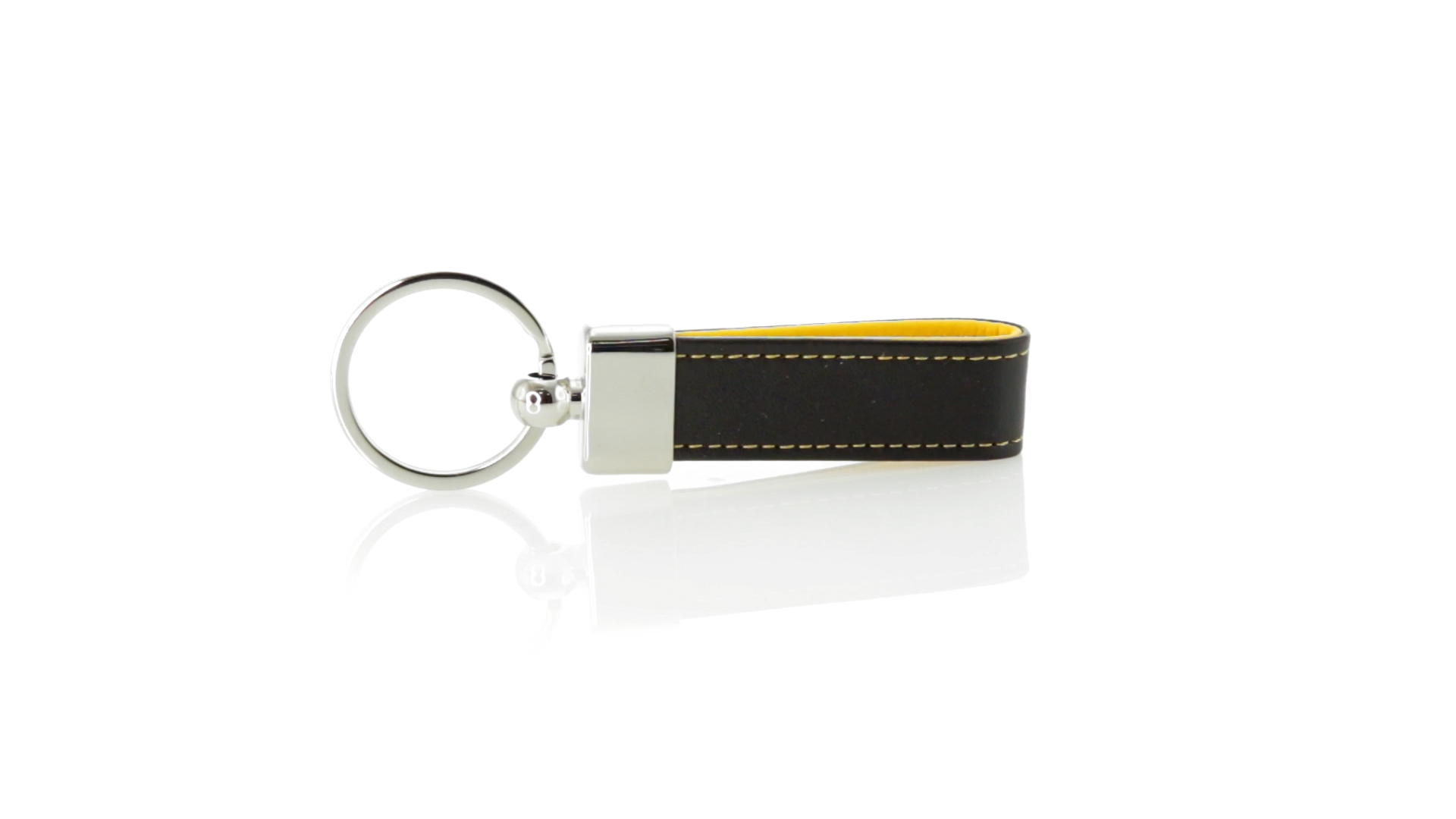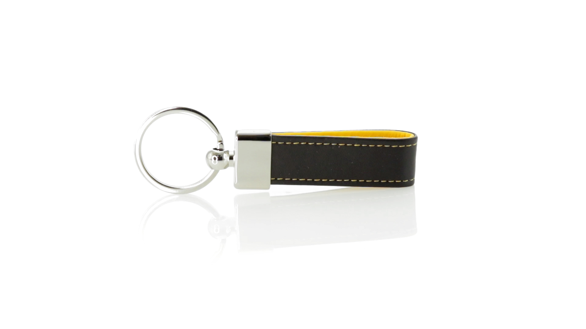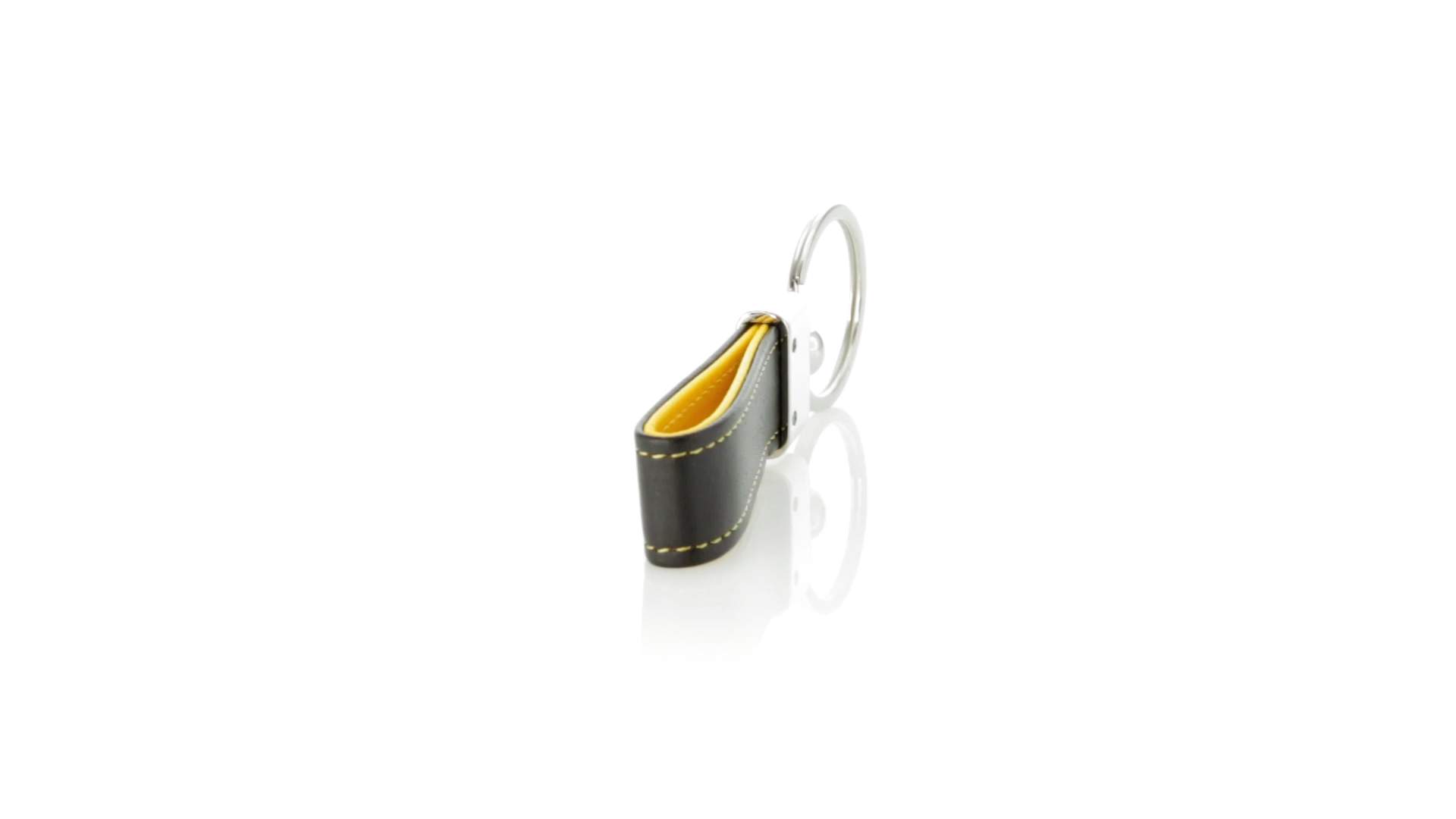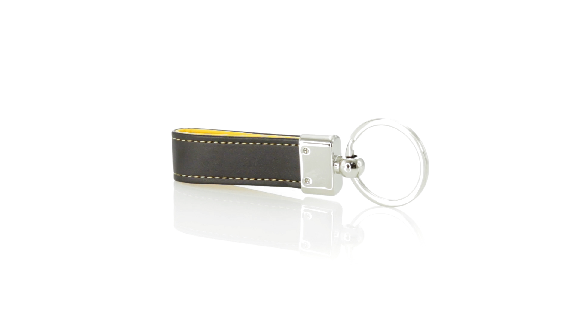 Schlüsselanhänger aus elegantem, zweifarbigem Kunstleder mit Metall-Detail. Präsentiert in einer individuellen Schachtel mit Stanzung im Inneren.